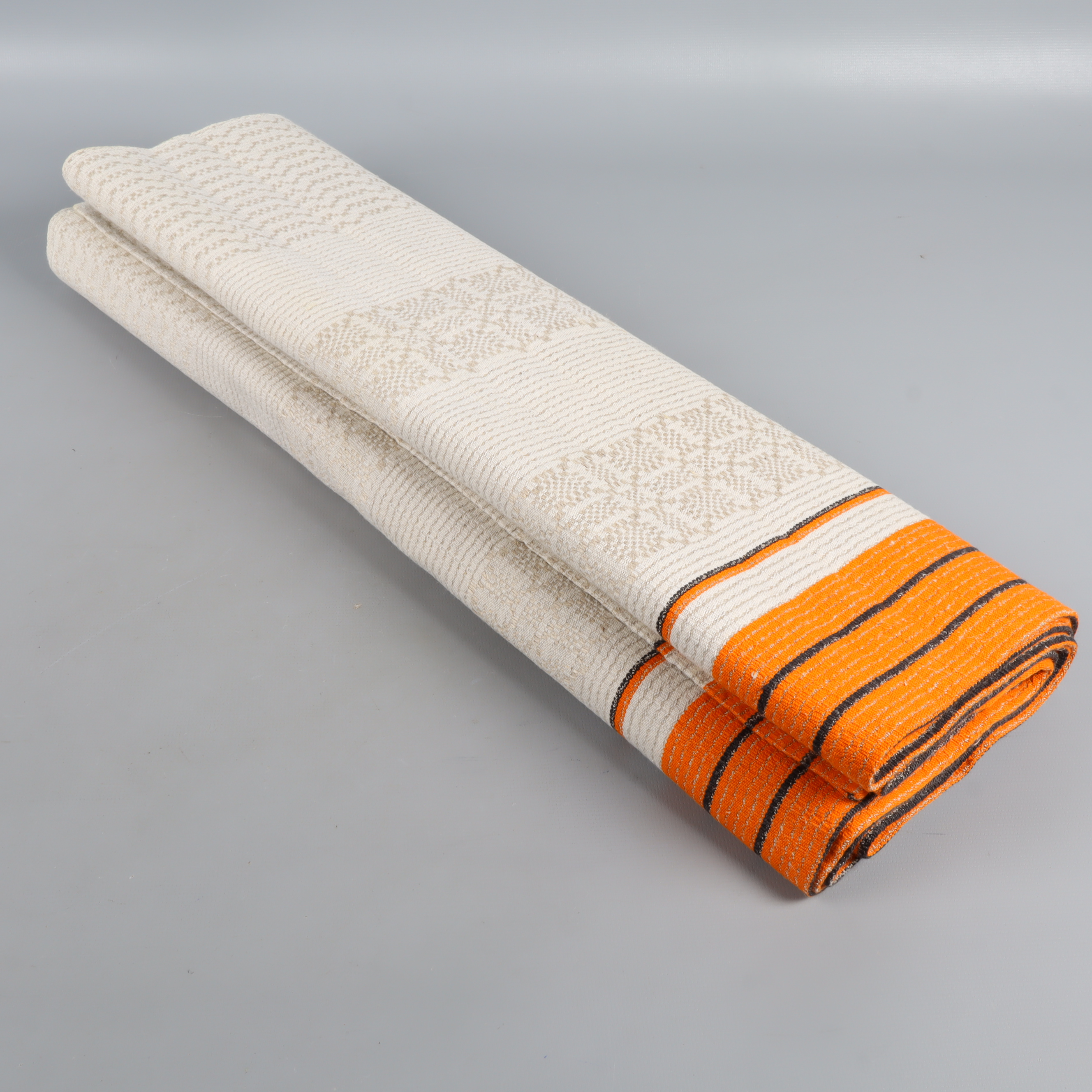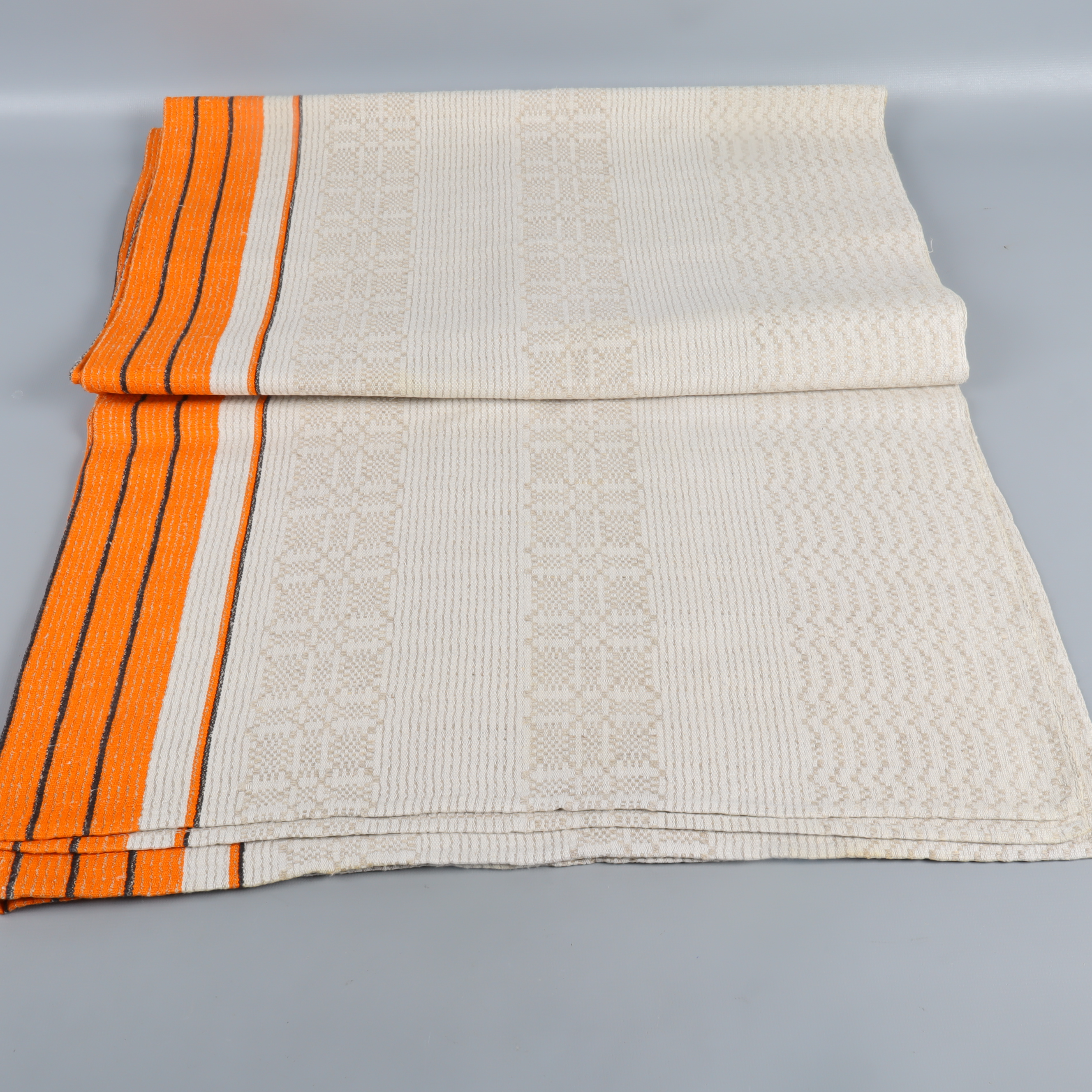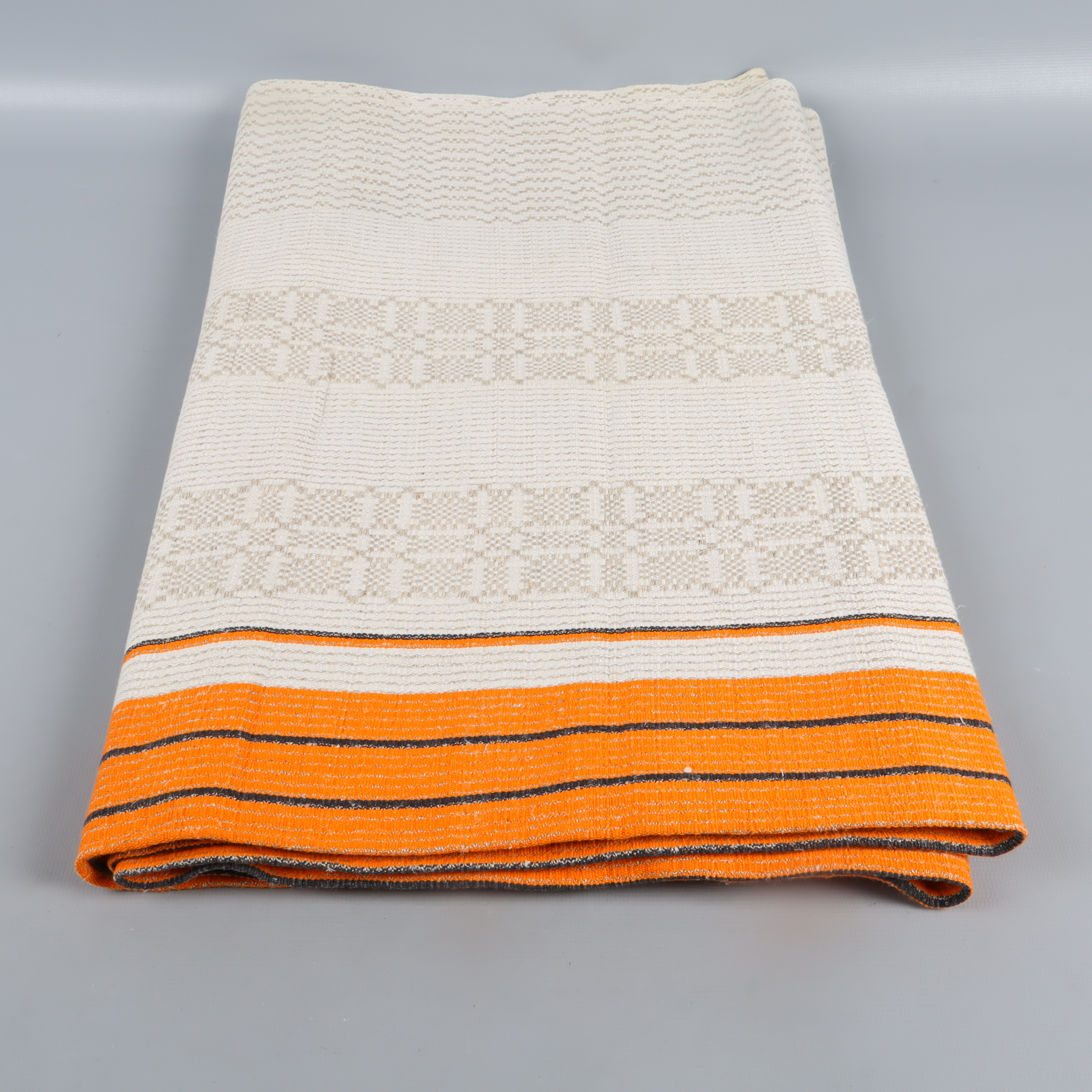En klassisk löpare i ljus ton med dekorativa orangea och svarta ränder samt diskret mönstrad struktur. Tyget är kraftigt vävt vilket ger en gedigen känsla och gör den perfekt för att skapa en inbjudande look på vilket bord som helst.