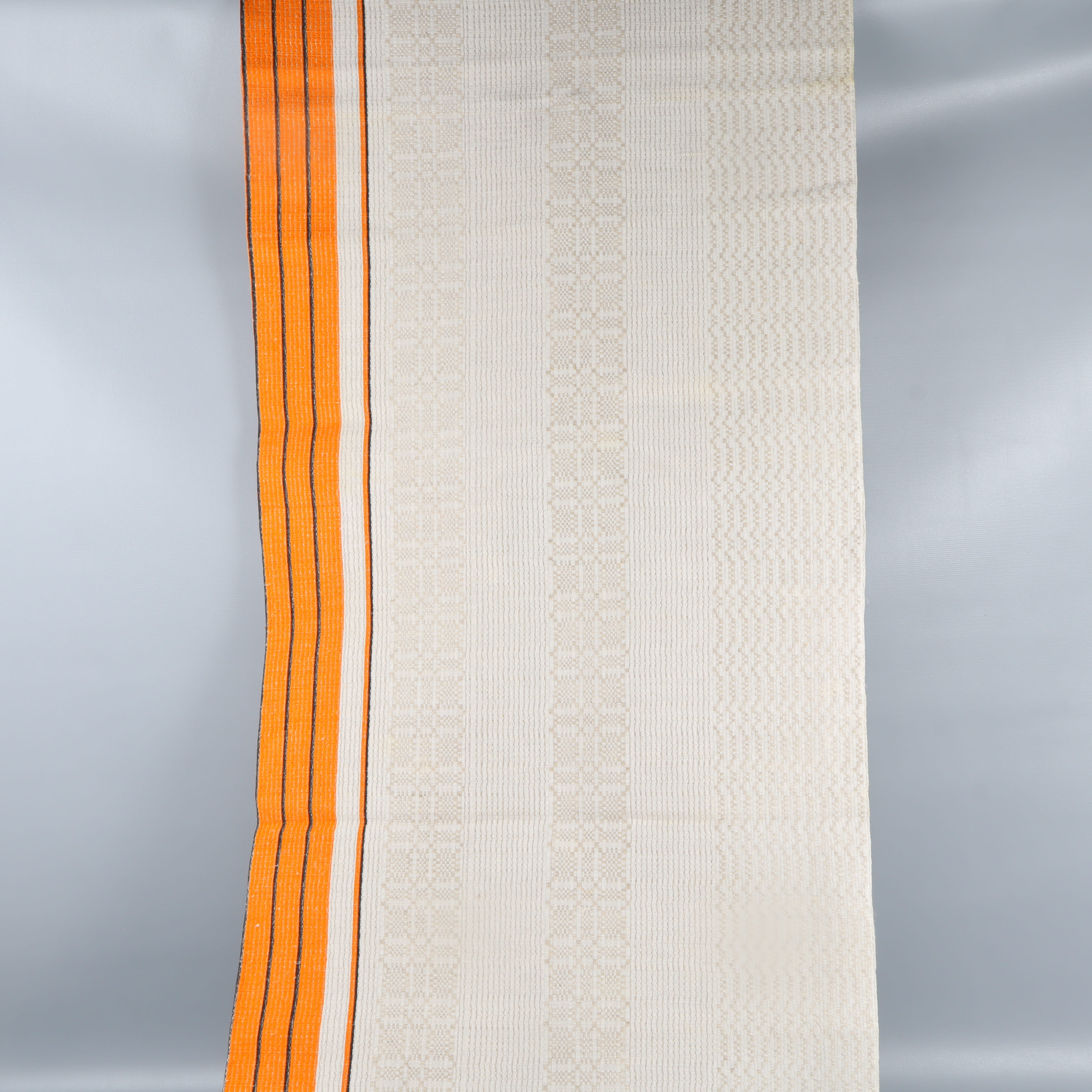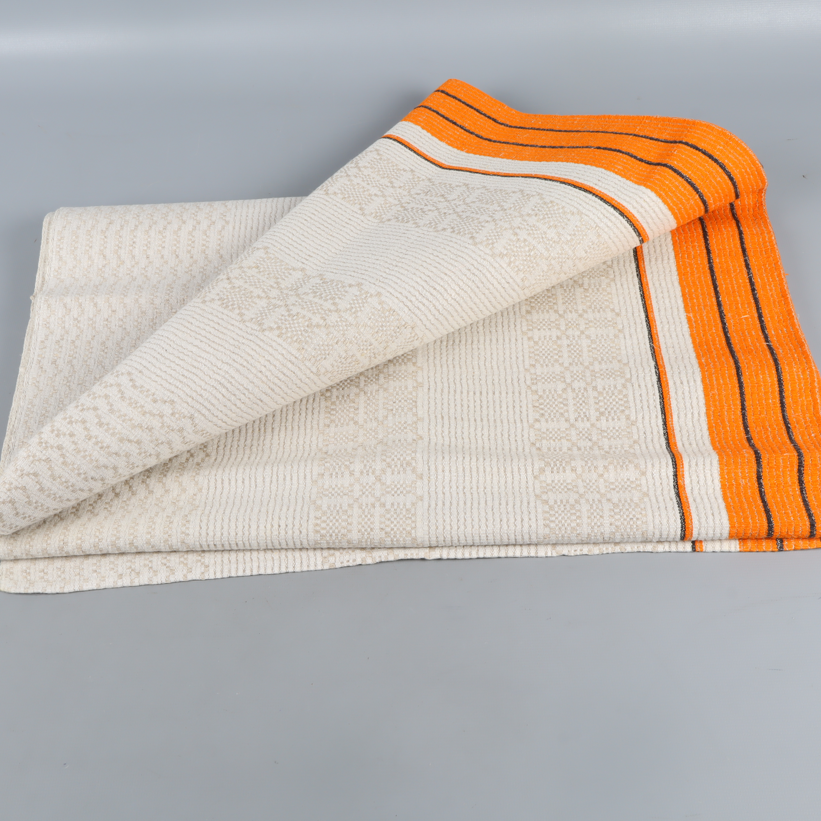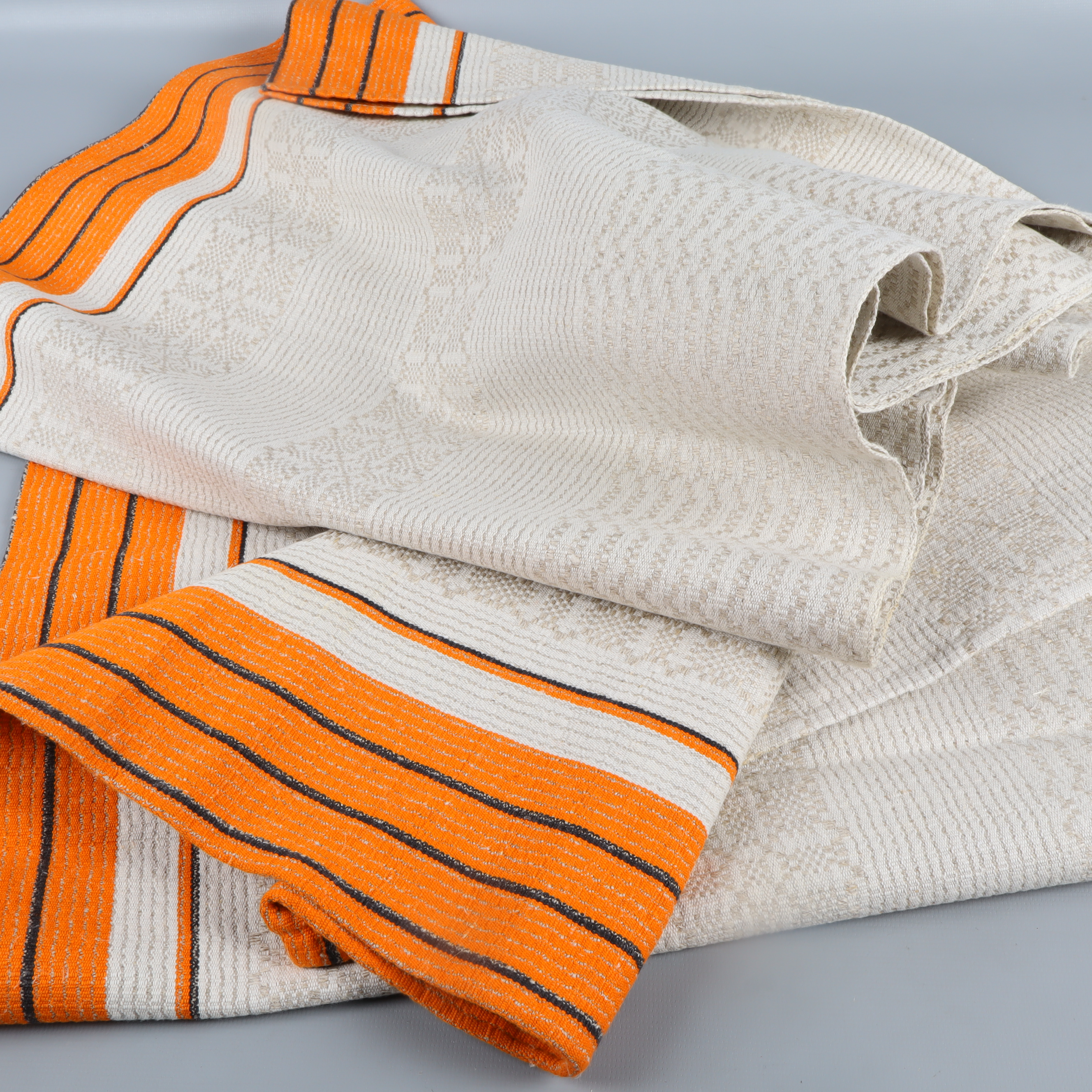 En klassisk löpare i ljus ton med dekorativa orangea och svarta ränder samt diskret mönstrad struktur. Tyget är kraftigt vävt vilket ger en gedigen känsla och gör den perfekt för att skapa en inbjudande look på vilket bord som helst.