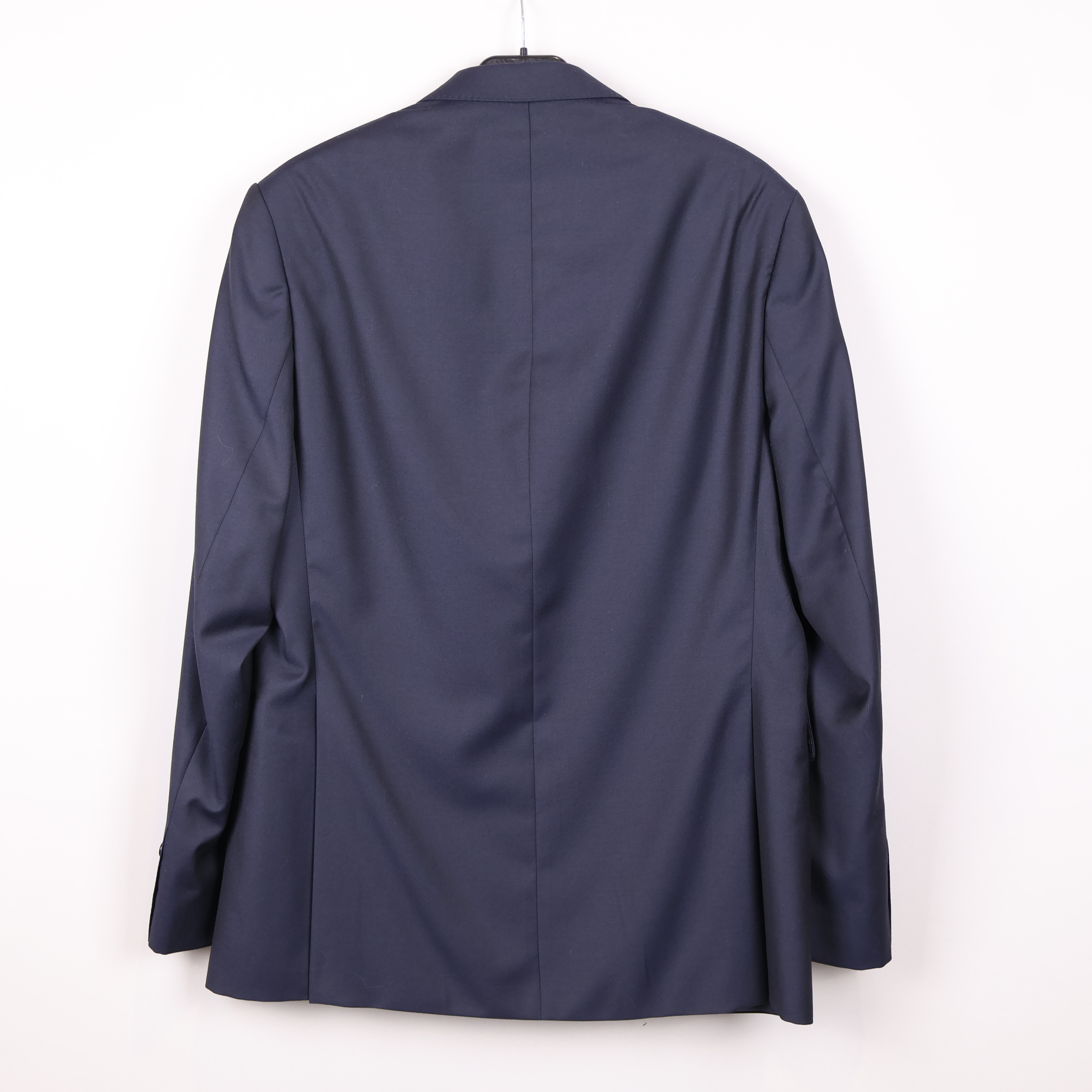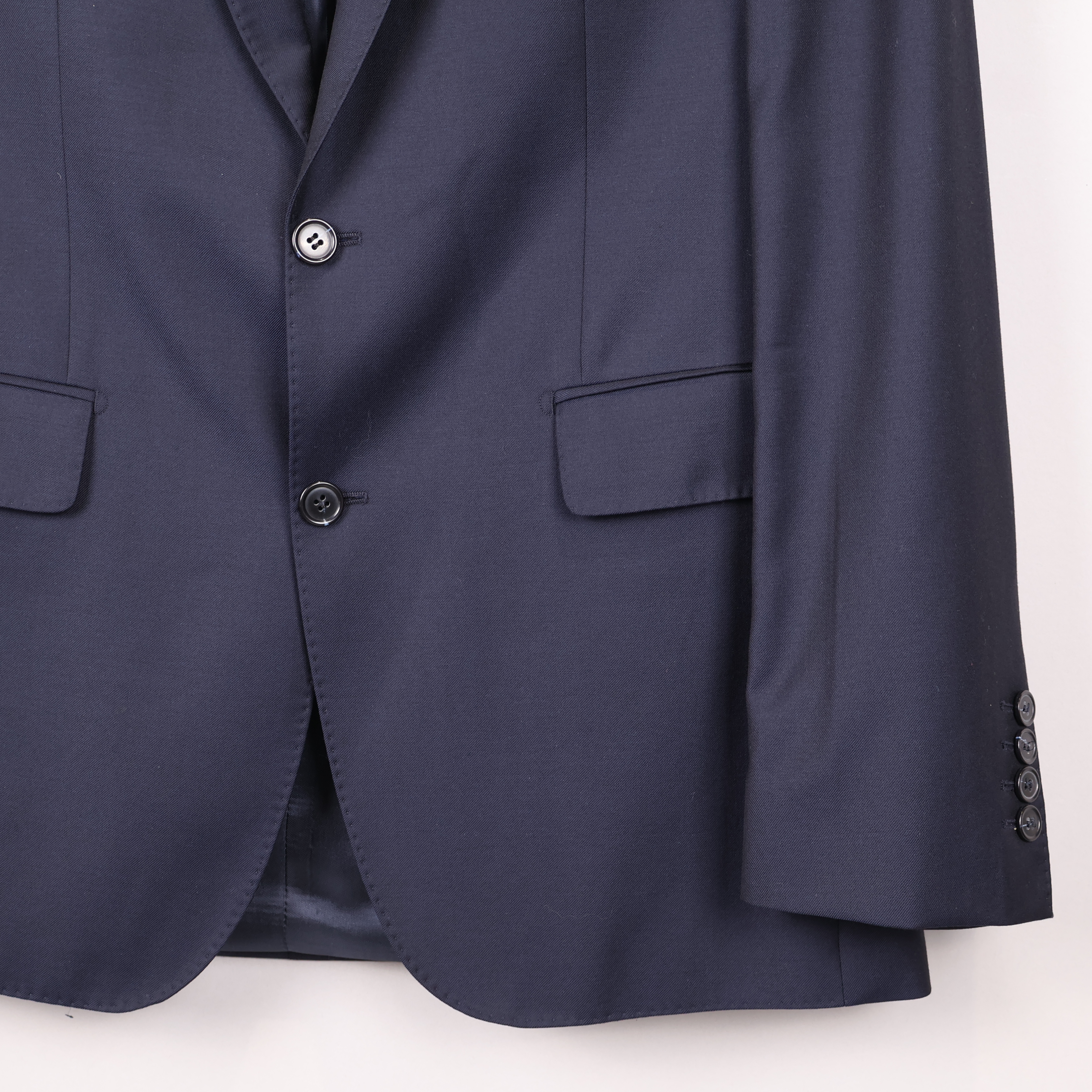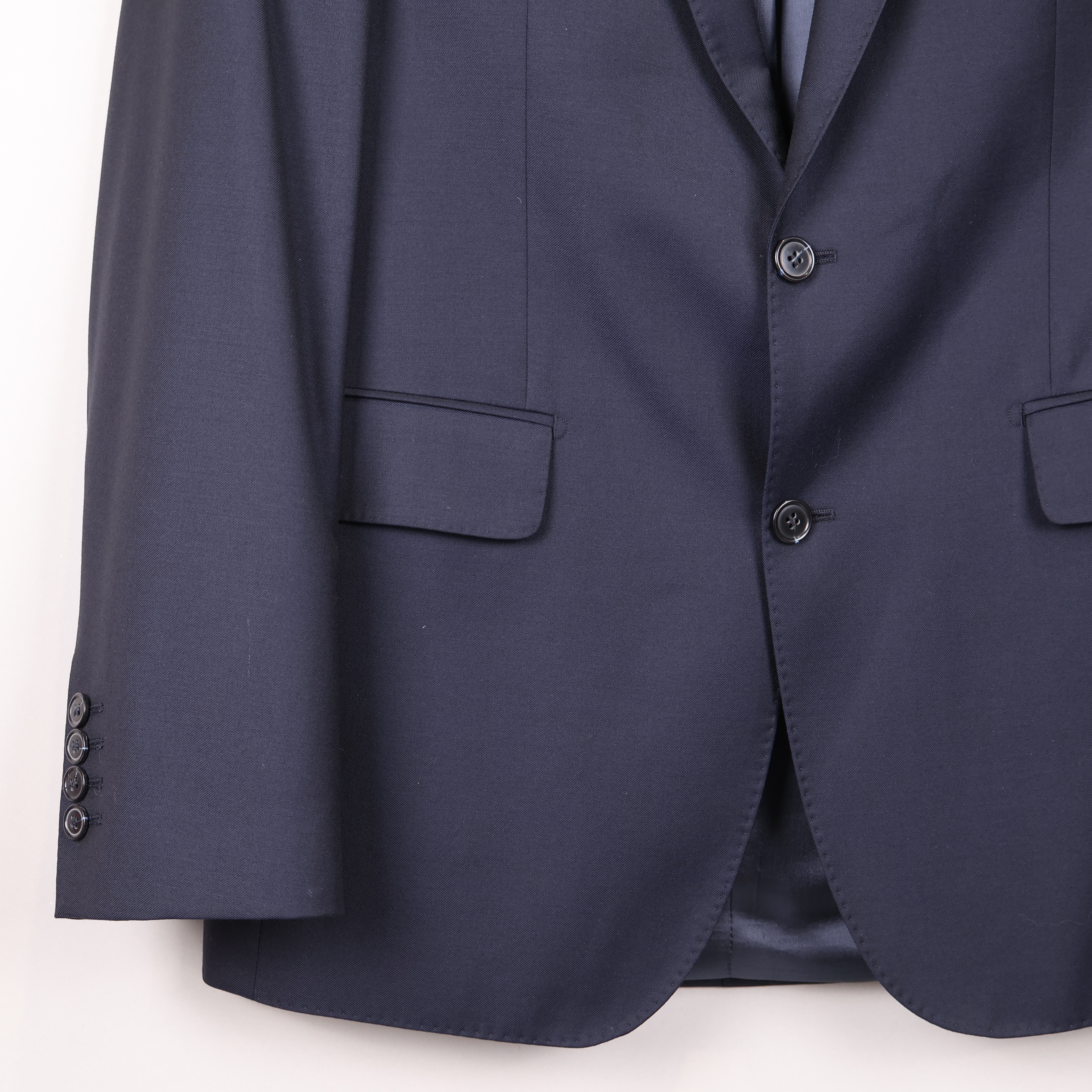 Den här kostymkavajen har en stilren, djupblå nyans och klassisk passform med två knappar framtill och fyra knappar vid ärmslutet. Fodret är matchande blått med diskreta innerfickor och prydliga sömmar.