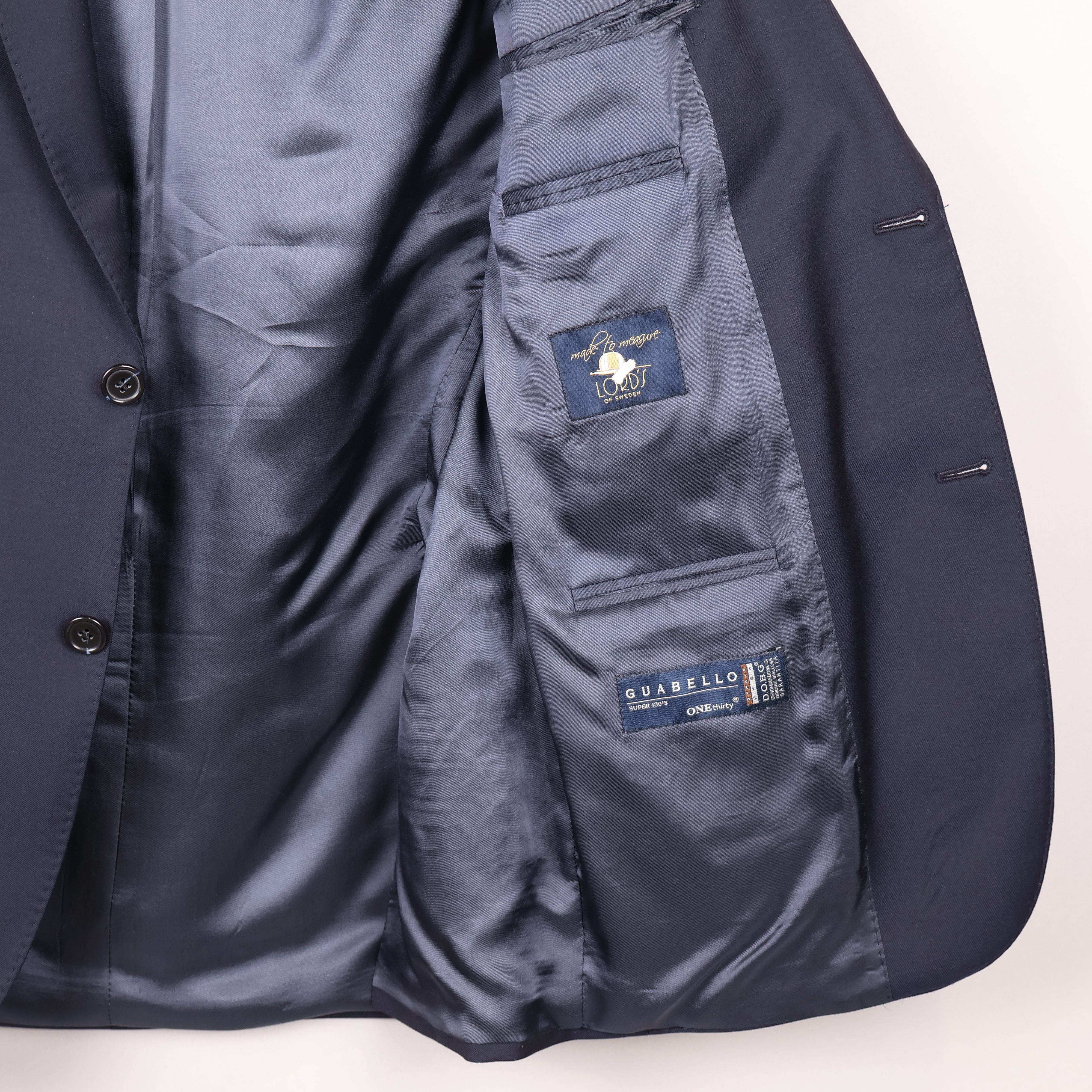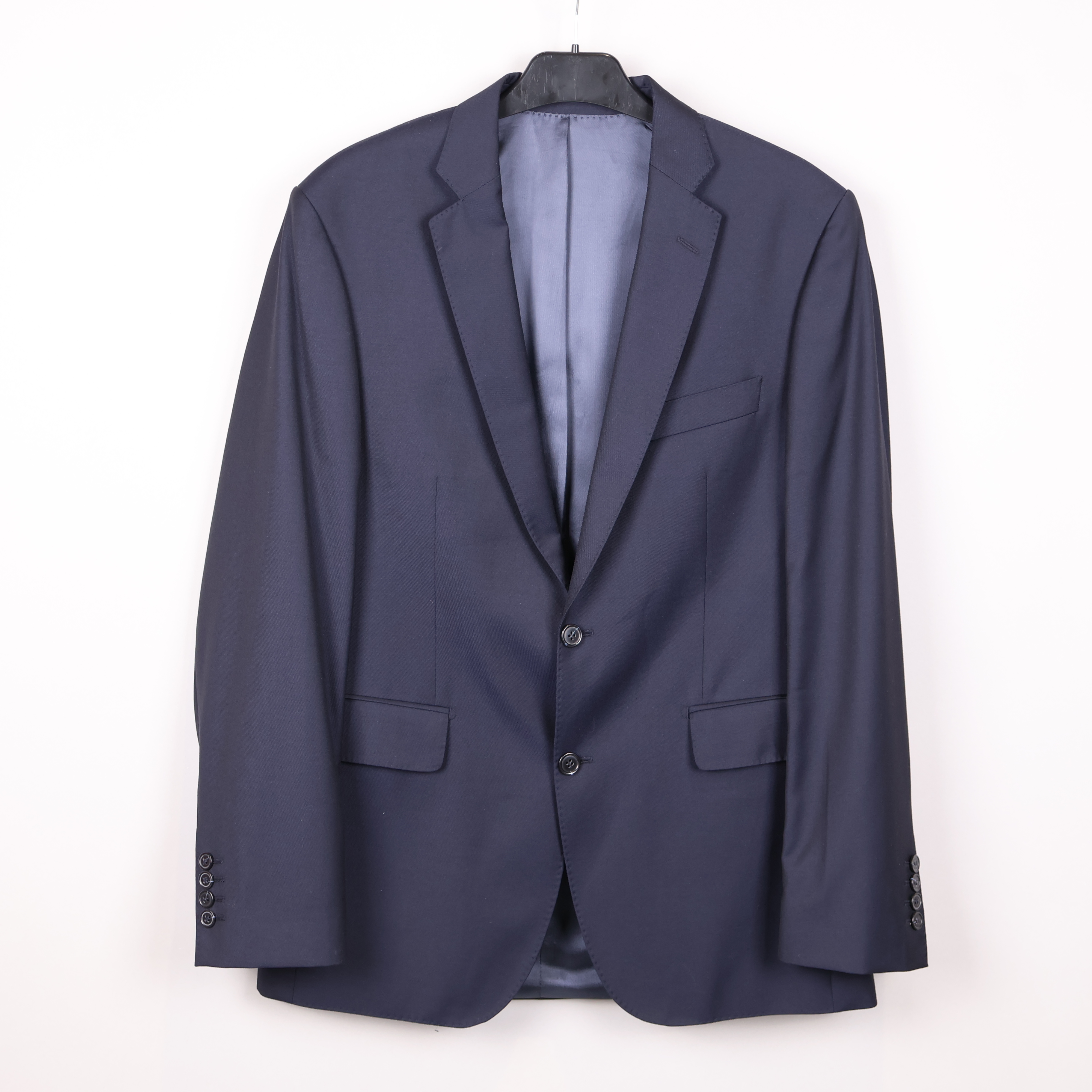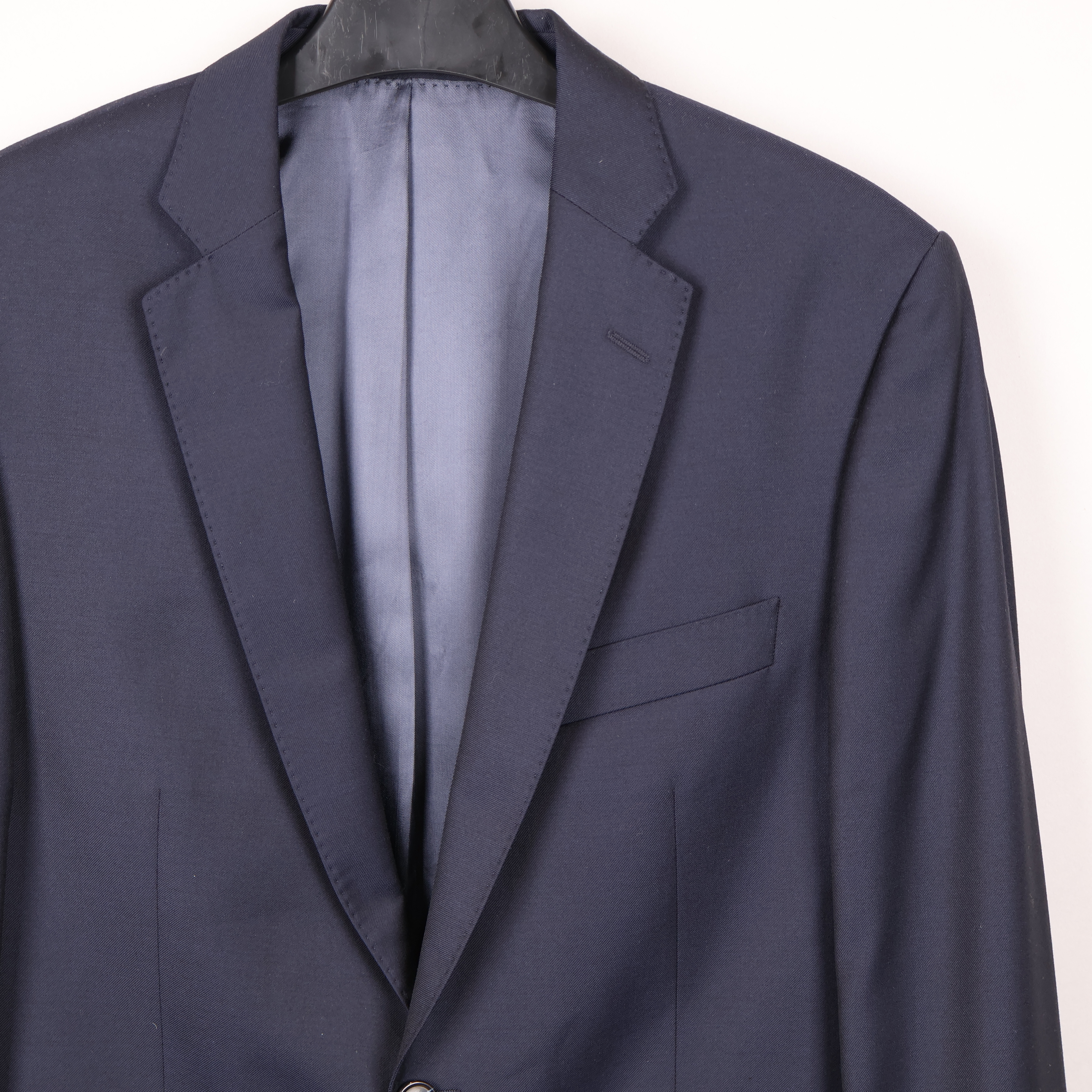 Den här kostymkavajen har en stilren, djupblå nyans och klassisk passform med två knappar framtill och fyra knappar vid ärmslutet. Fodret är matchande blått med diskreta innerfickor och prydliga sömmar.