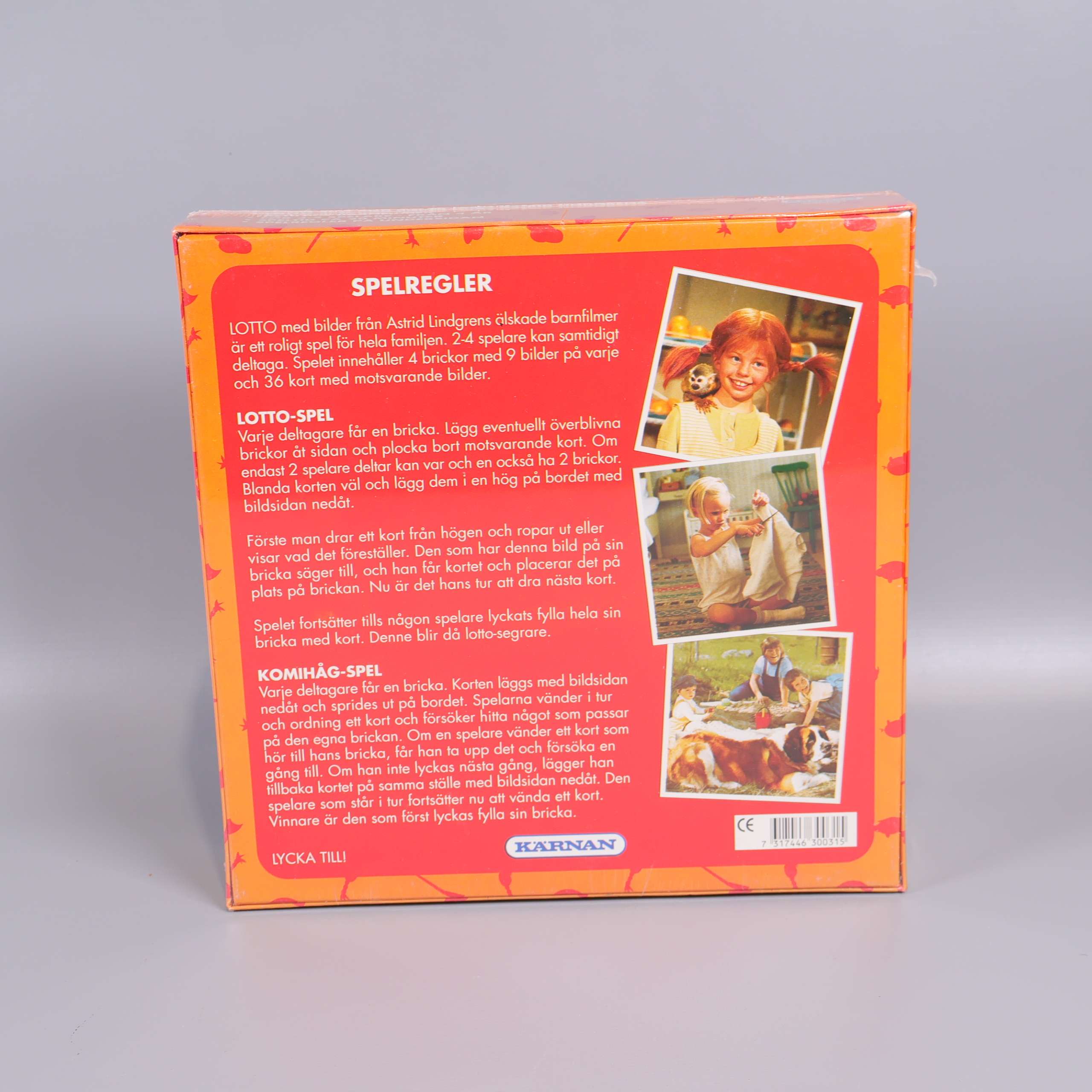 Kärnan Lotto med Astrid Lindgren-motiv 149 kr Product variation Antal st Beskrivning Upptäck ett charmigt Lotto-spel med färgstarka bilder från Astrid Lindgrens älskade barnfilmer. Visa all beskrivning Skick Nytt skick Produkten är som ny. Kan till och med ha orginalprislapp kvar eller ligga i originalförpackning. Läs mer om hur vi bedömer Number of players 2-4 Age limit 4 Varumärke Kärnan Produkten är unik och finns enbart som 1 st i lager. Fri frakt på alla köp över 990 kr. 14 dagars ångerrät.