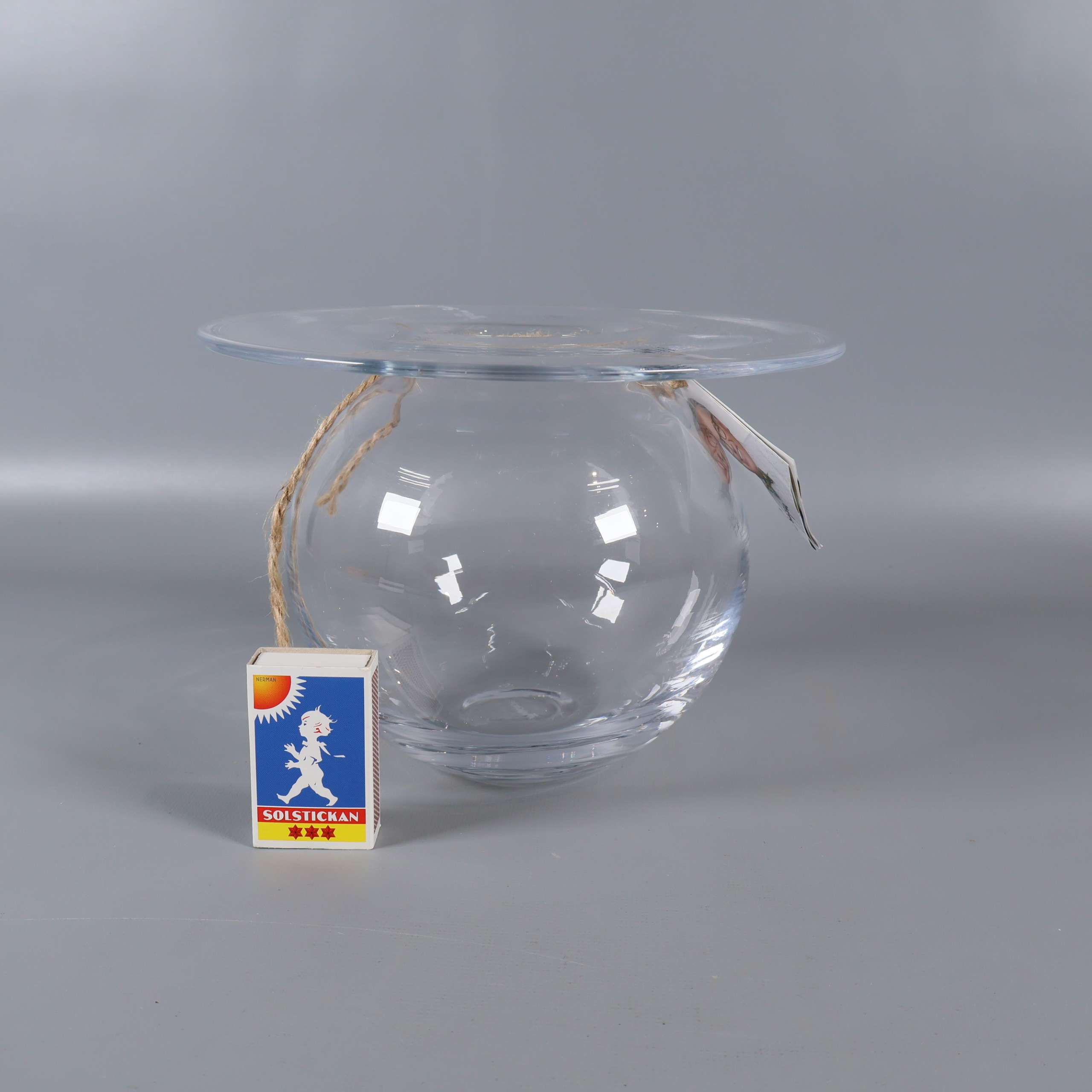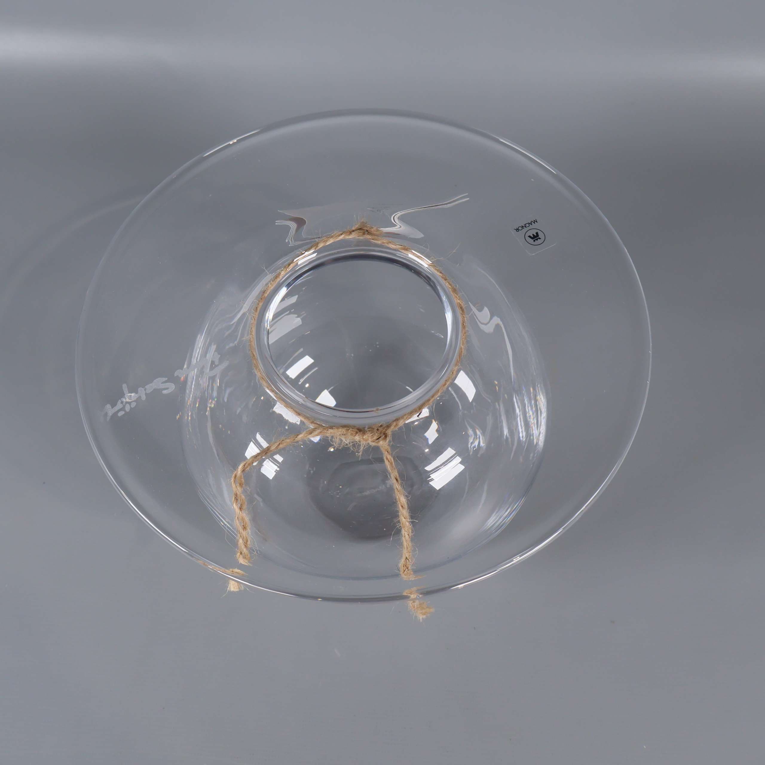 Modern glasvas med rundad form och extra bred, platt öppning upptill som ger en elegant och stilren känsla. Transparent finish lyfter fram blommor och dekorationer på ett subtilt sätt. Signerad och har en snygg detalj med snöre runt halsen.