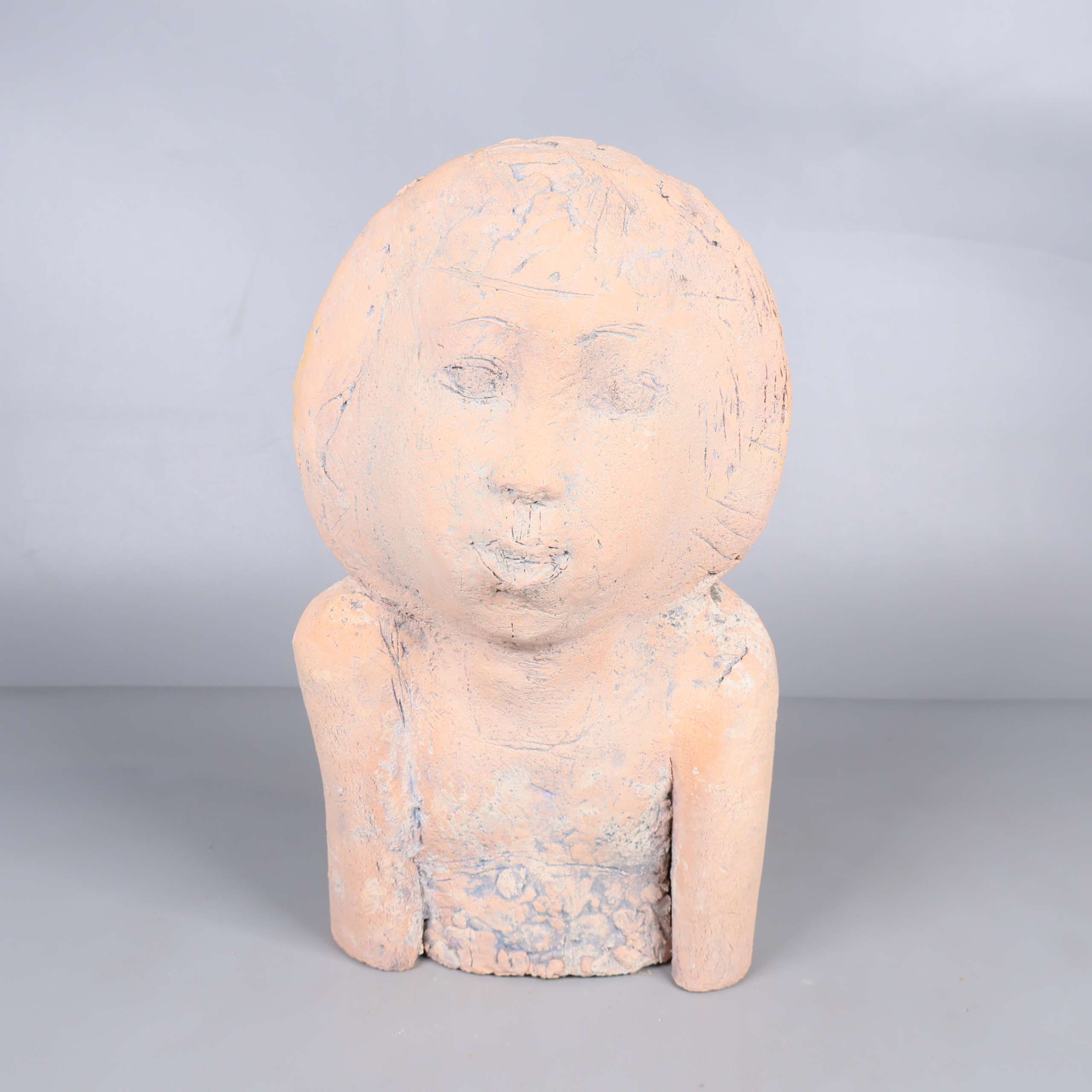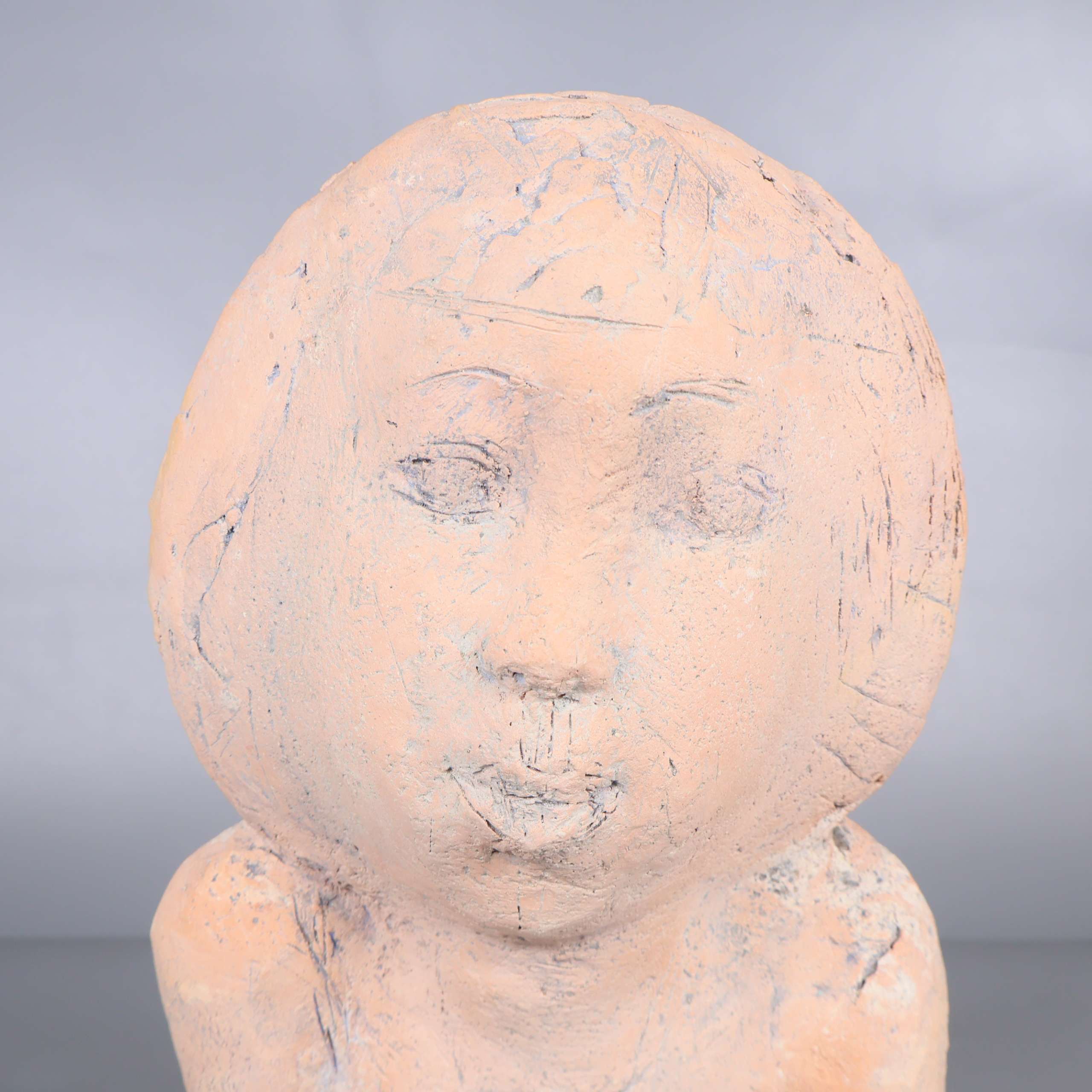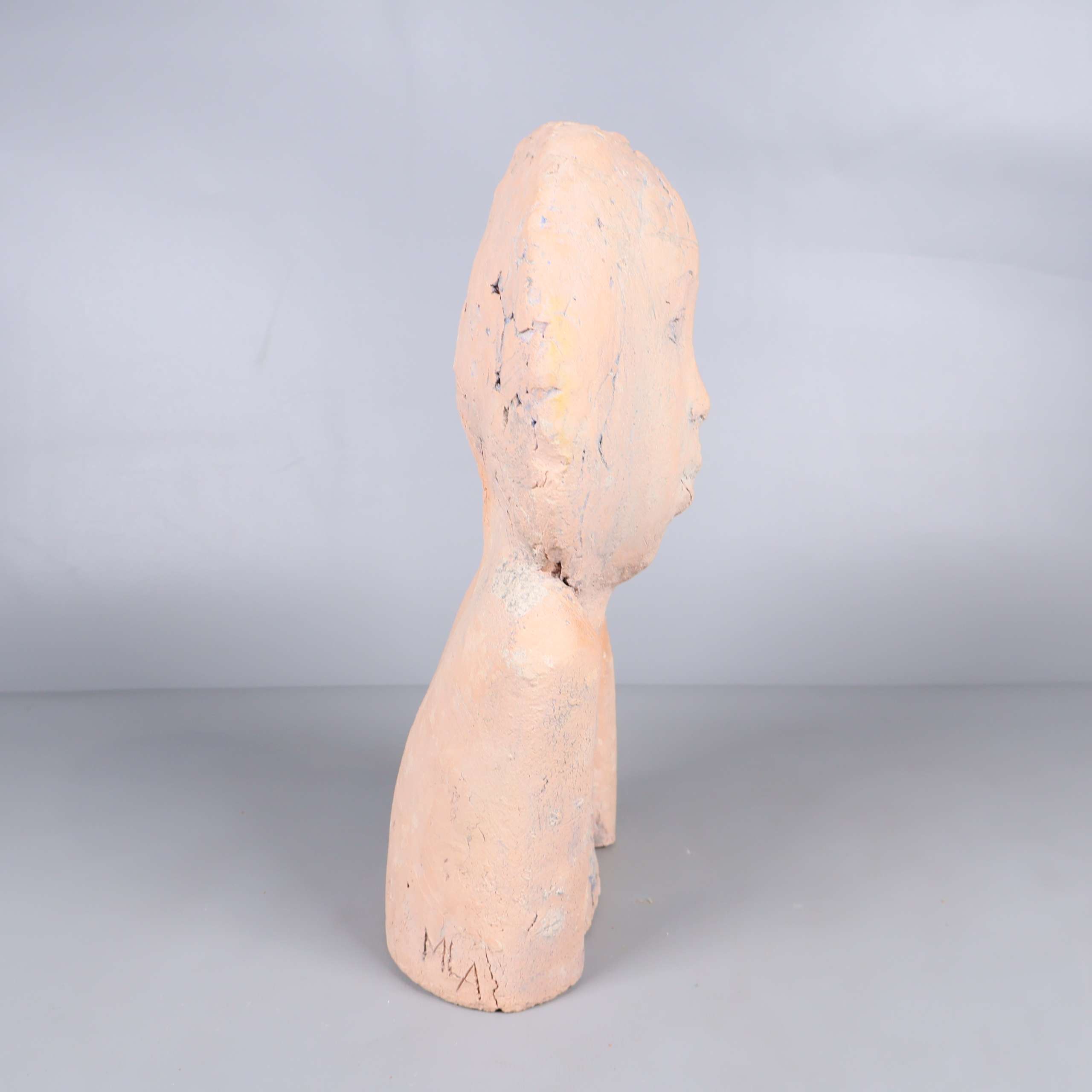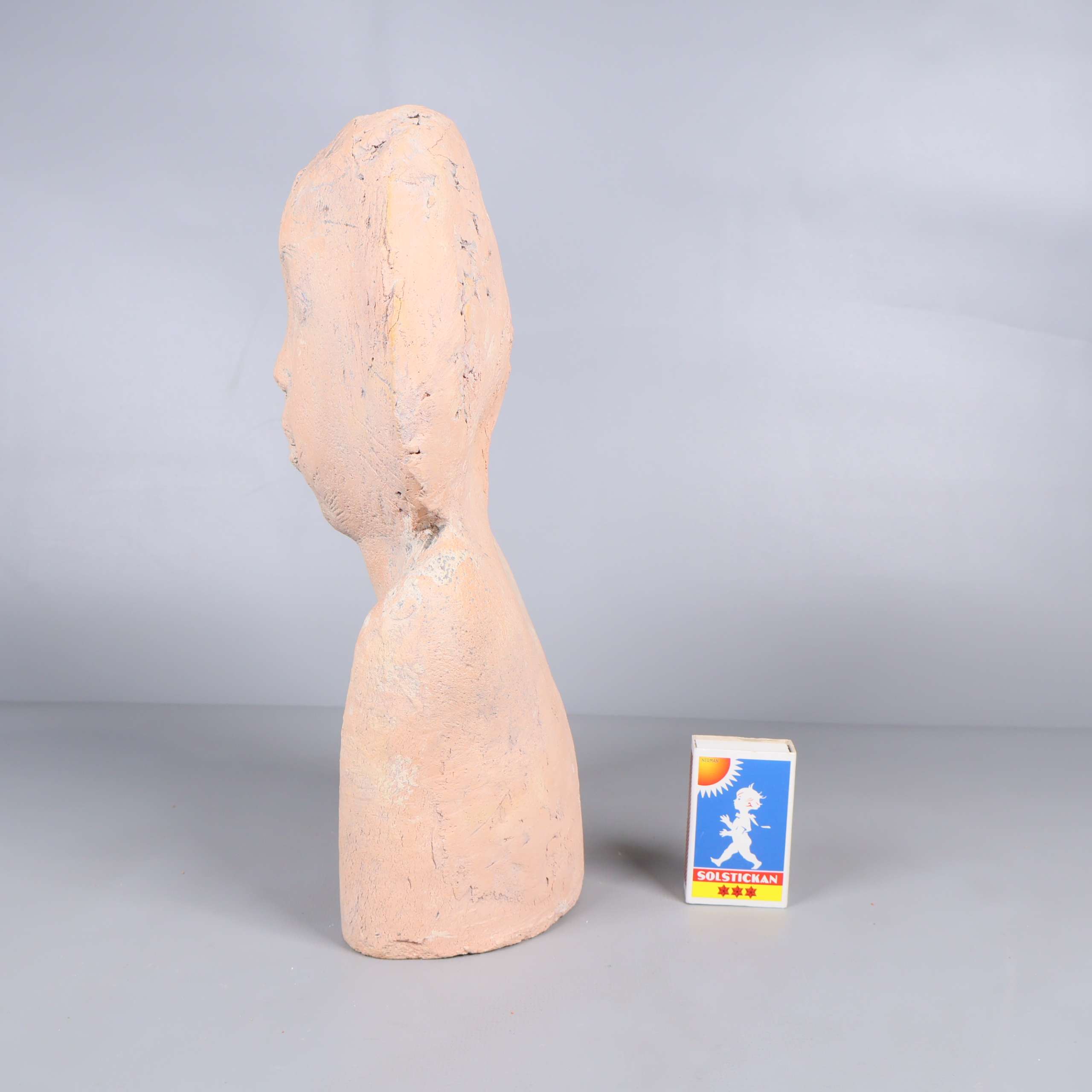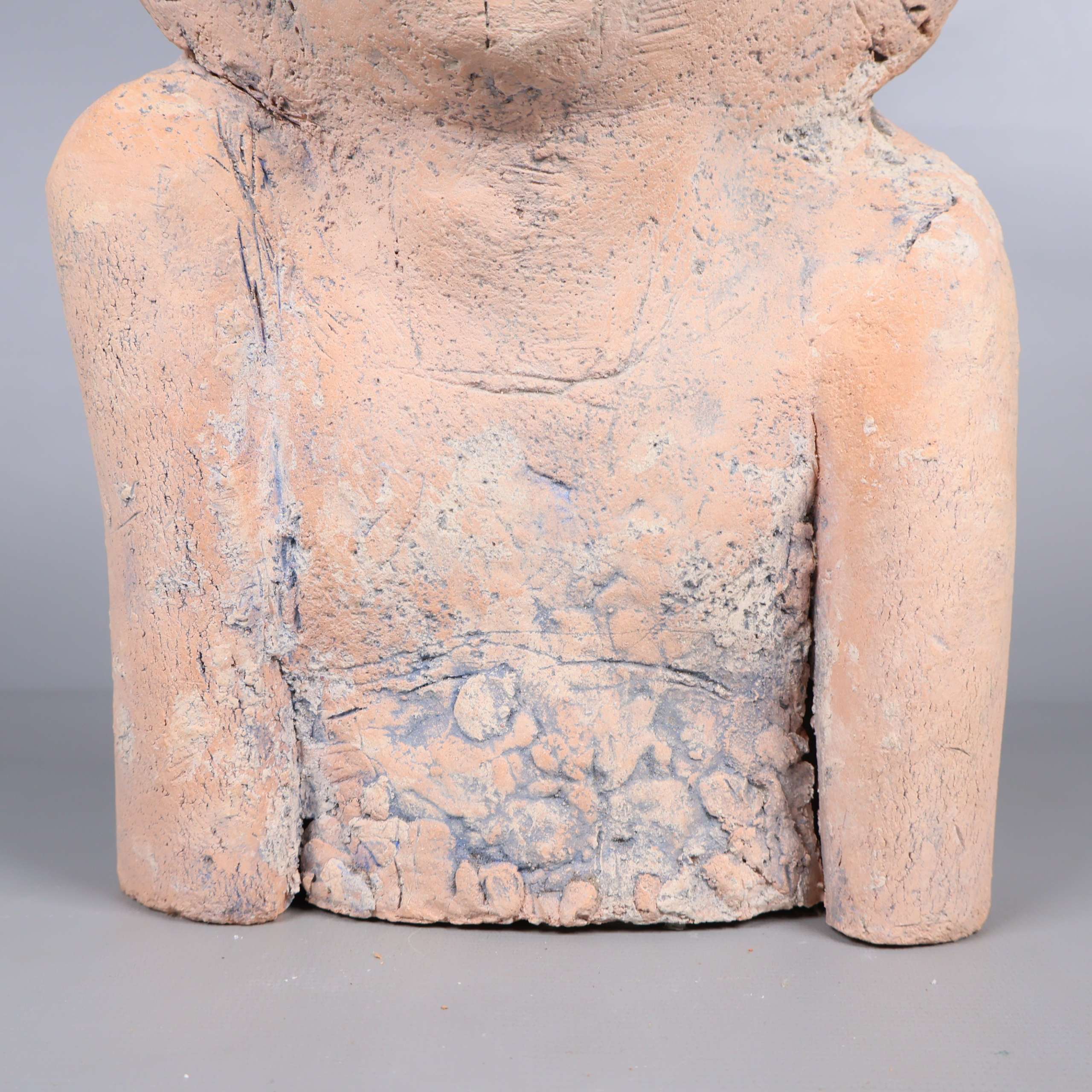 Unik skulptur med ett uttrycksfullt ansikte och markerade armar. Ytan känns rå och handgjord med fina strukturer och lätta färgskiftningar i en varm ton. En dekorativ detalj som ger konstnärlig känsla till ditt hem.