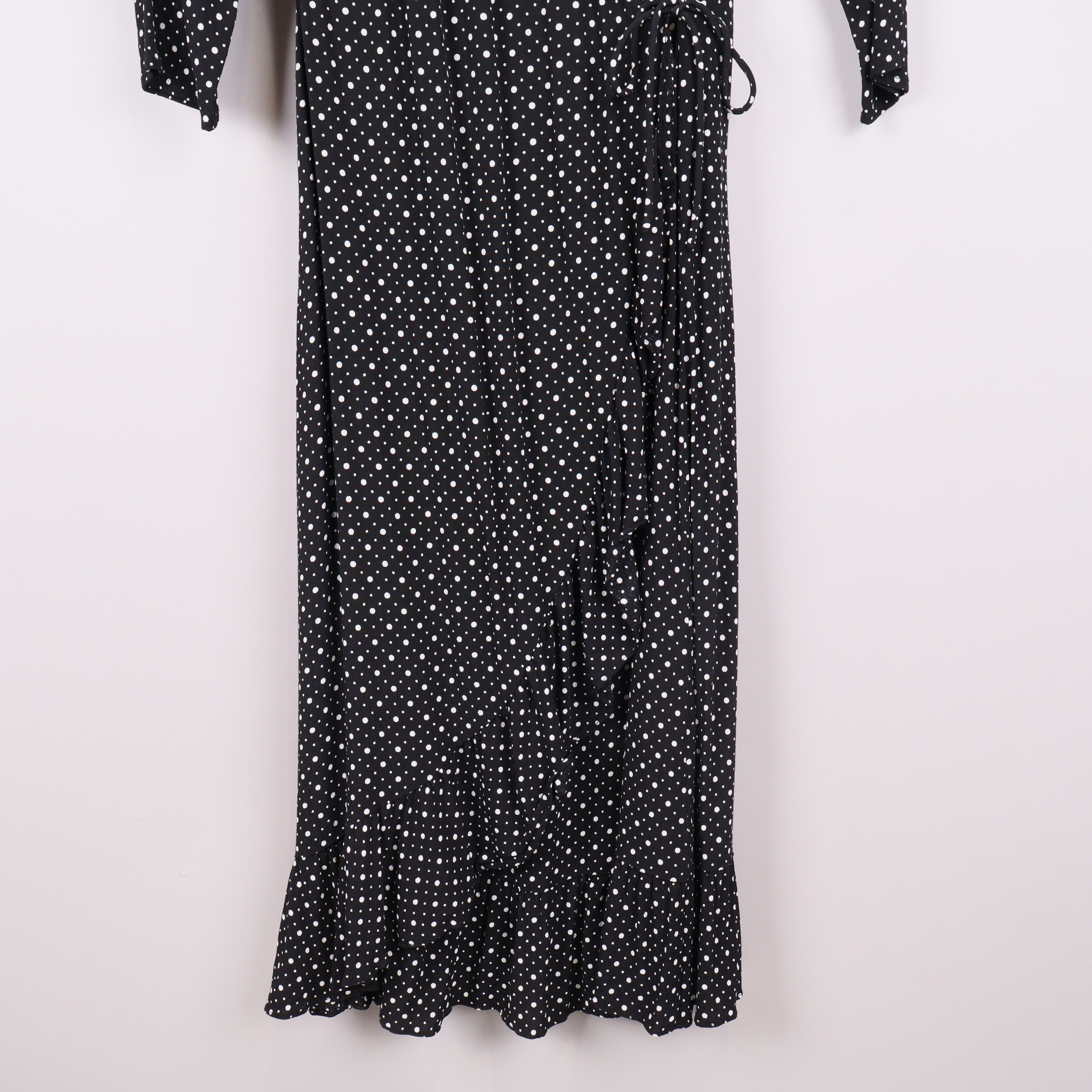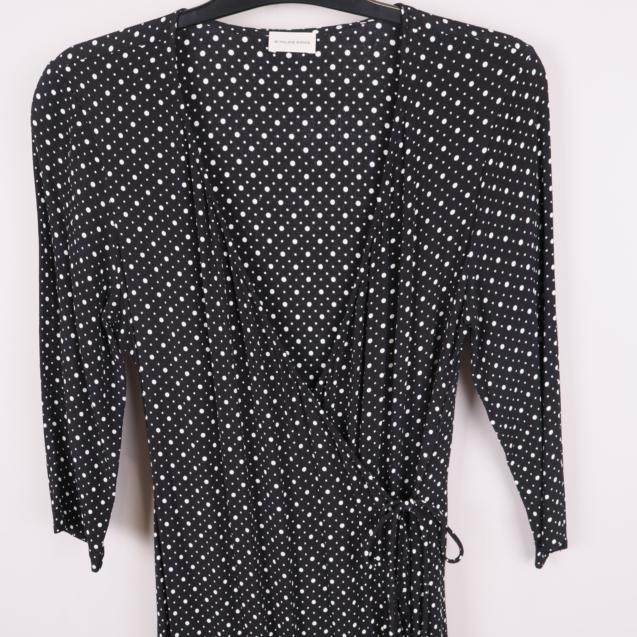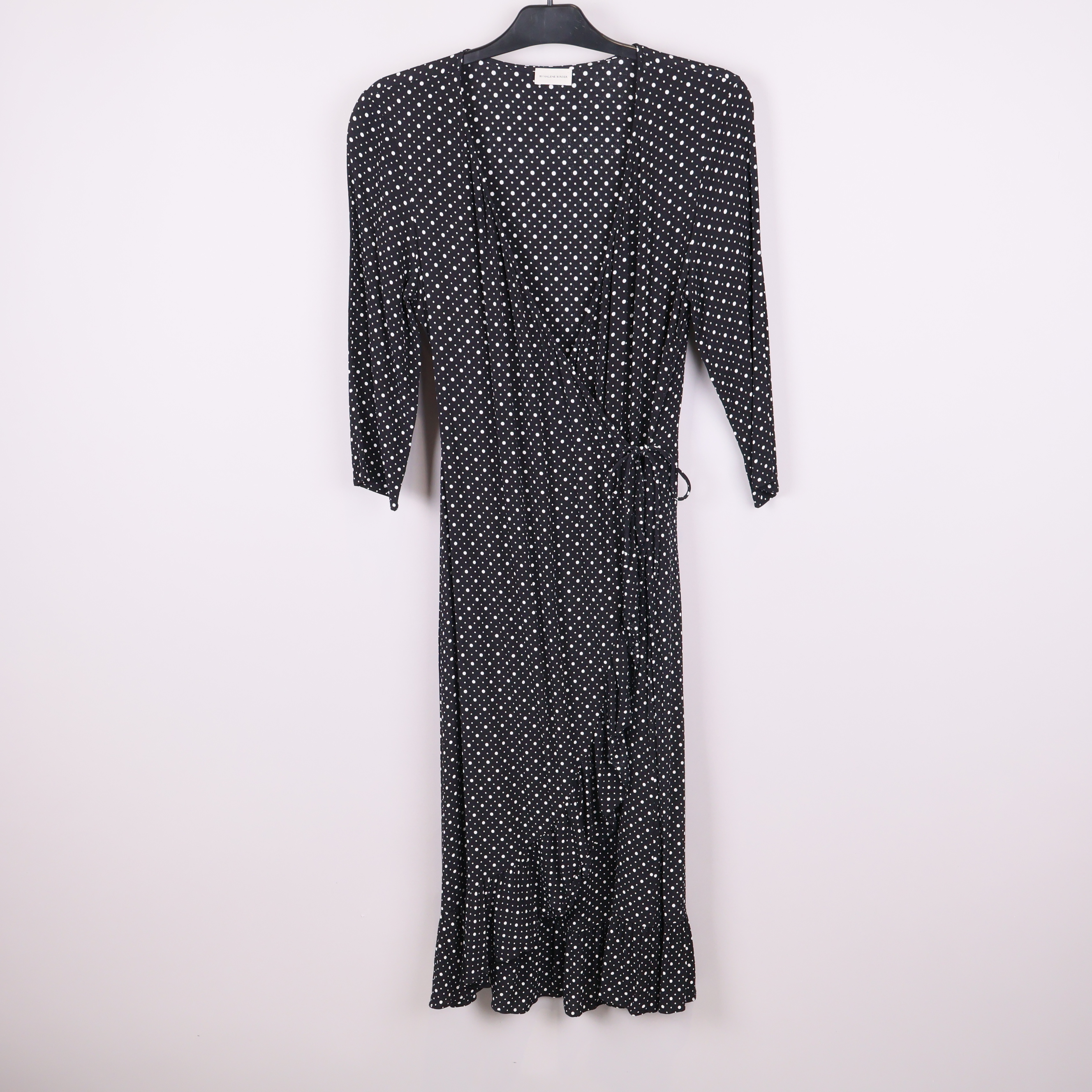 Stilren omlottklänning från By Malene Birger med klassiskt prickigt mönster och mjuka volangdetaljer längs nederkanten. Lätt figurnära modell med trekvartsärm och knytning i midjan för en flexibel och bekväm passform.