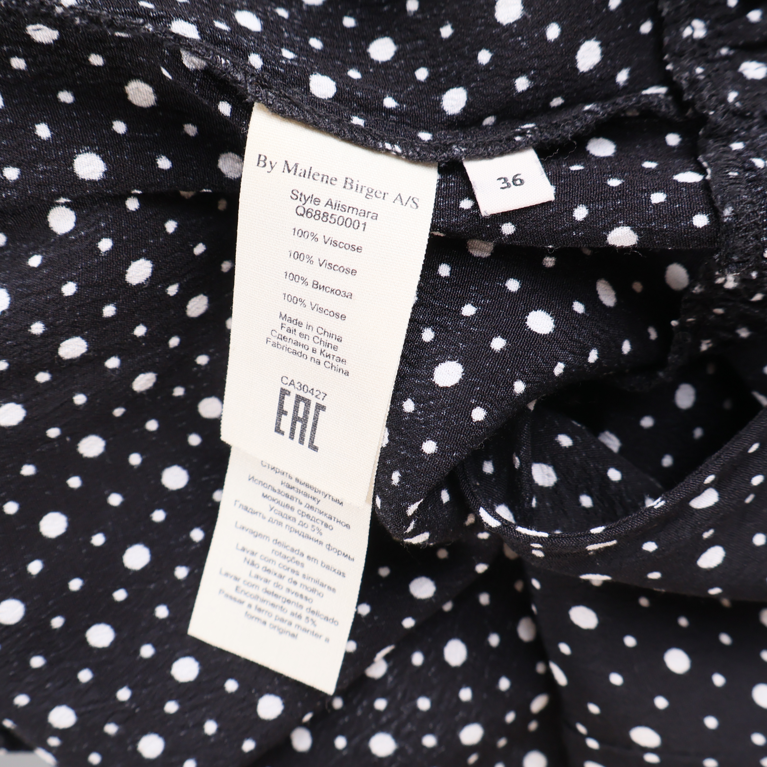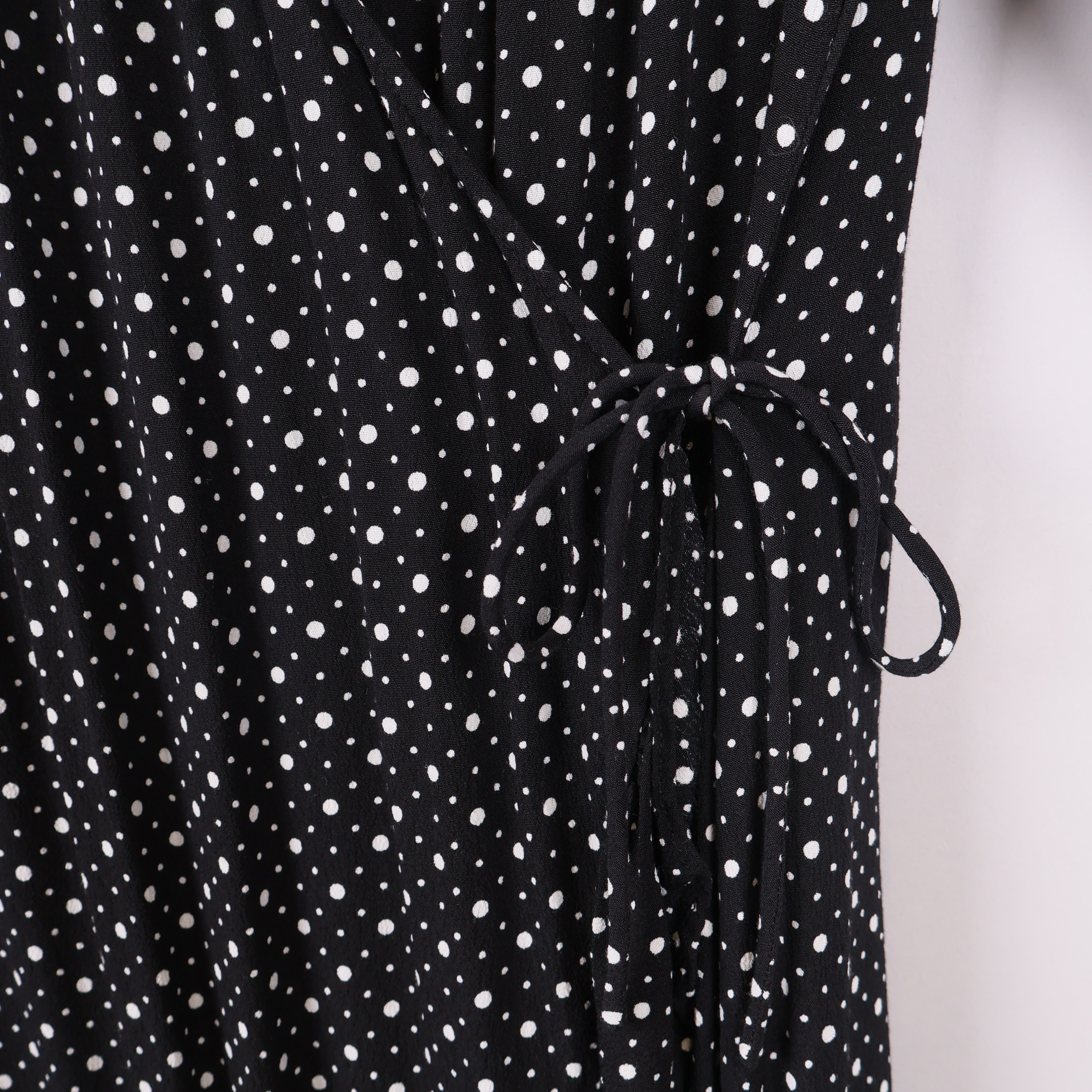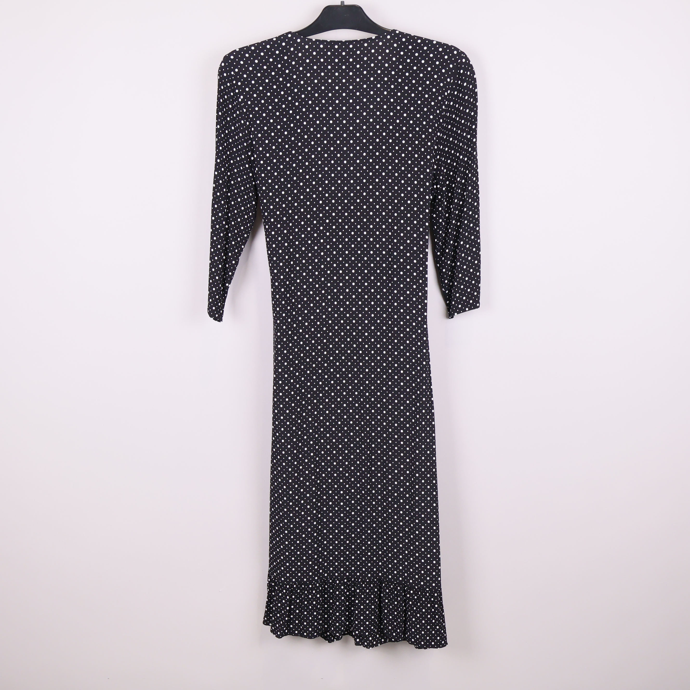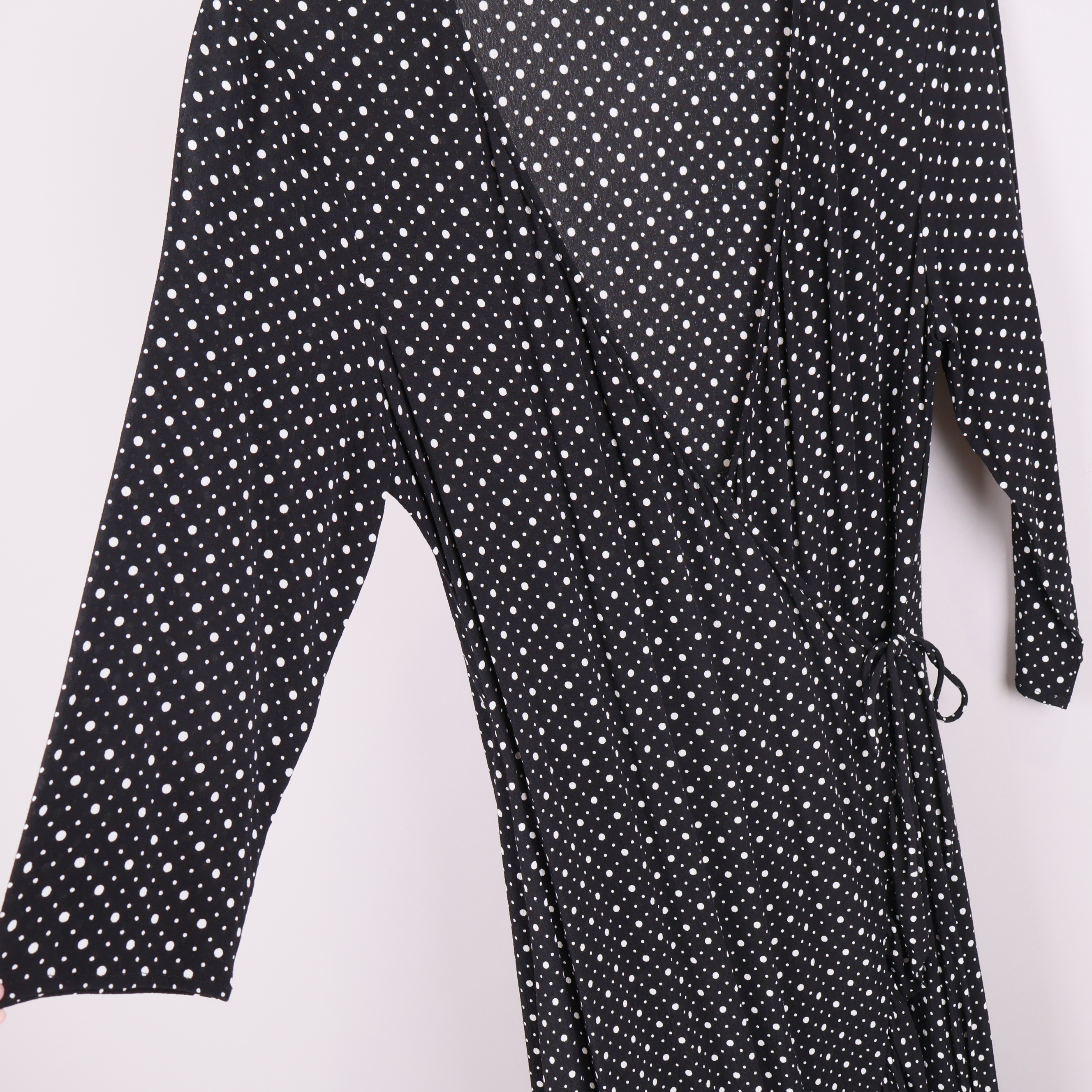 Stilren omlottklänning från By Malene Birger med klassiskt prickigt mönster och mjuka volangdetaljer längs nederkanten. Lätt figurnära modell med trekvartsärm och knytning i midjan för en flexibel och bekväm passform.