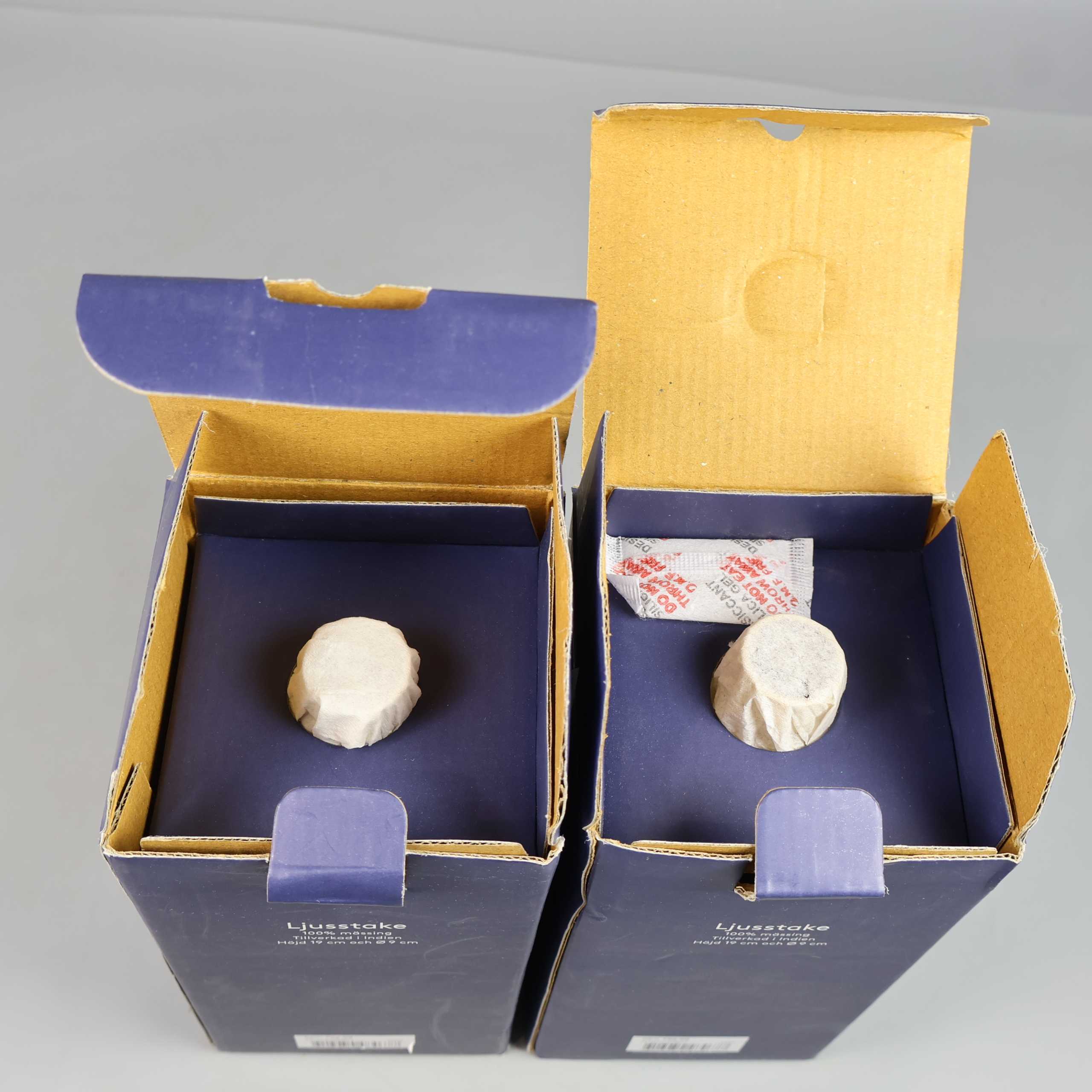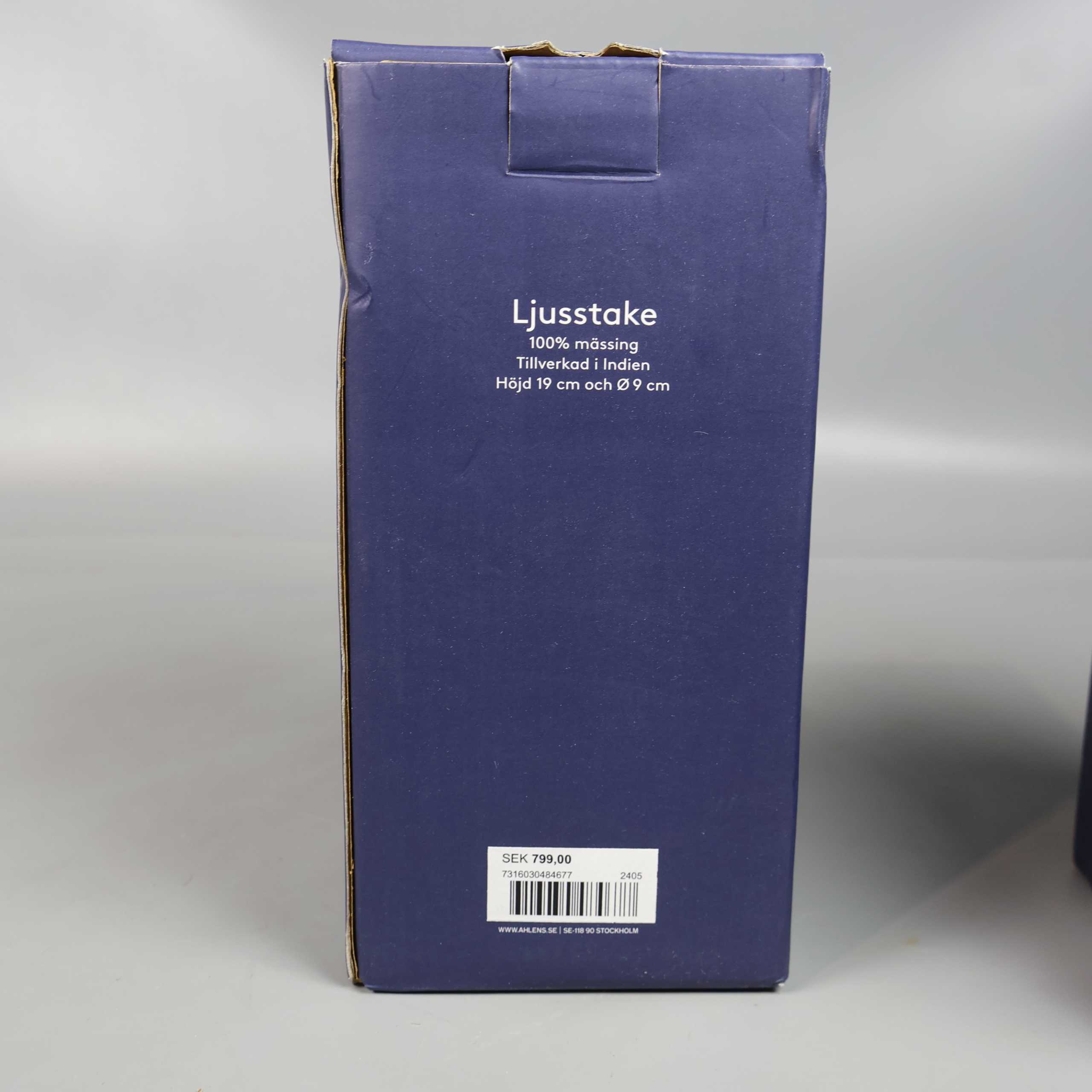 Mano Atelier Mano Atelier - 2 ljusstakar i mässing - H: 19cm 699 kr Product variation Antal st Beskrivning Ett par eleganta ljusstakar i blank mässing med grafisk design och sfäriska detaljer som ger en modern touch. Båda ljusstakarna levereras i originalförpackning.Skick: Missfärgning på en ljusstake, se bild 3. Visa all beskrivning Detaljer Höjd: 21 cm Skick Gott skick Produkten har använts men är av fin kvalitet, det kan förekomma mindre förslitningar. Läs mer om hur vi bedömer Dimensions Ca Höjd: 19cm Diameter: 9cm Färg Guld Material Mässing Varumärke Mano Atelier Produkten är unik och finns enbart som 1 st i lager. Fri frakt på alla köp över 990 kr. 14 dagars ångerrät.