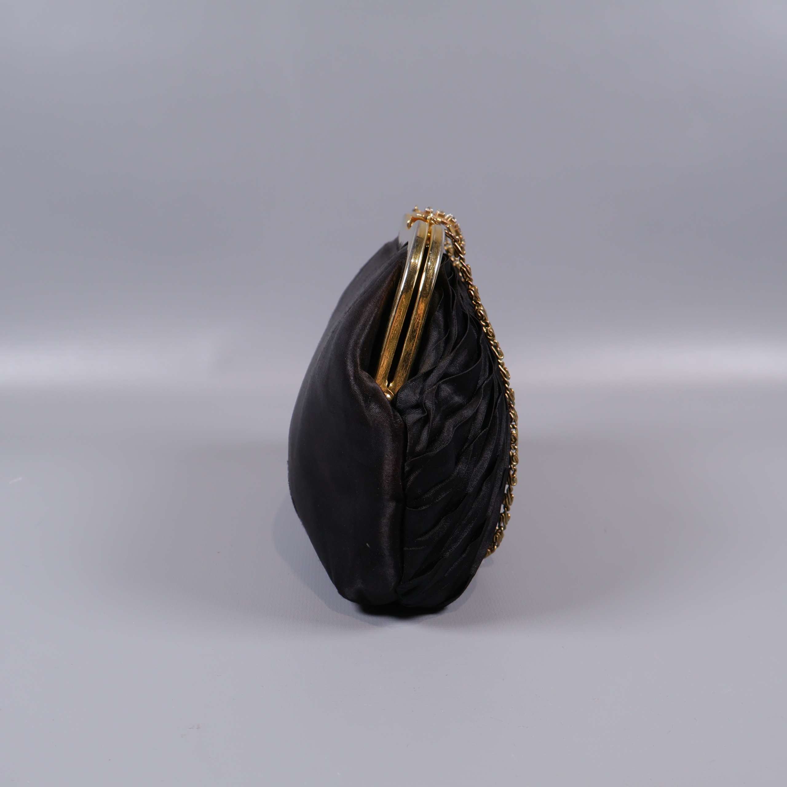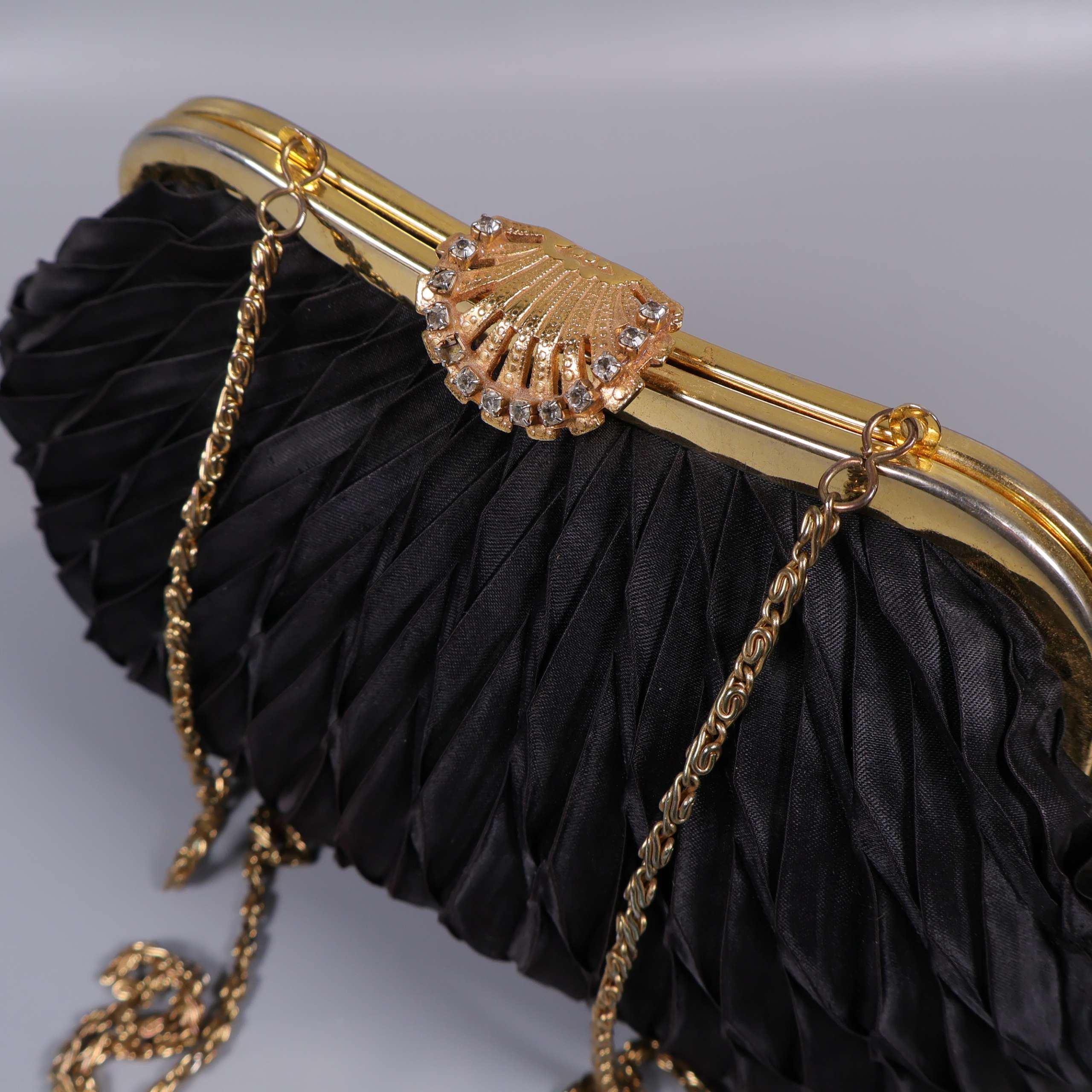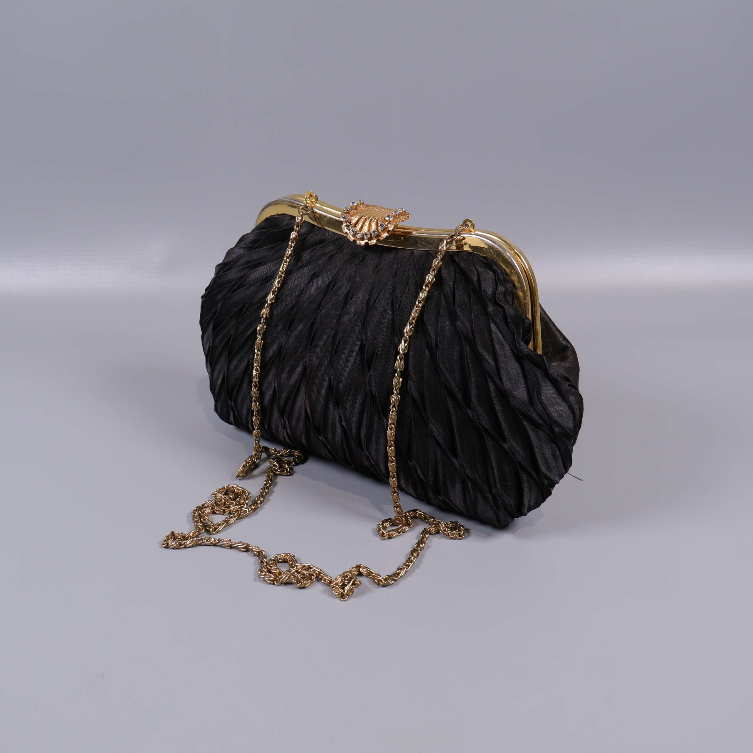 Elegant axelremsväska med svart veckad utsida och detaljer i guld, inklusive dekorativt snäckspänne med glittrande stenar. Väskan har kedjerem i metall och bygel öppning.