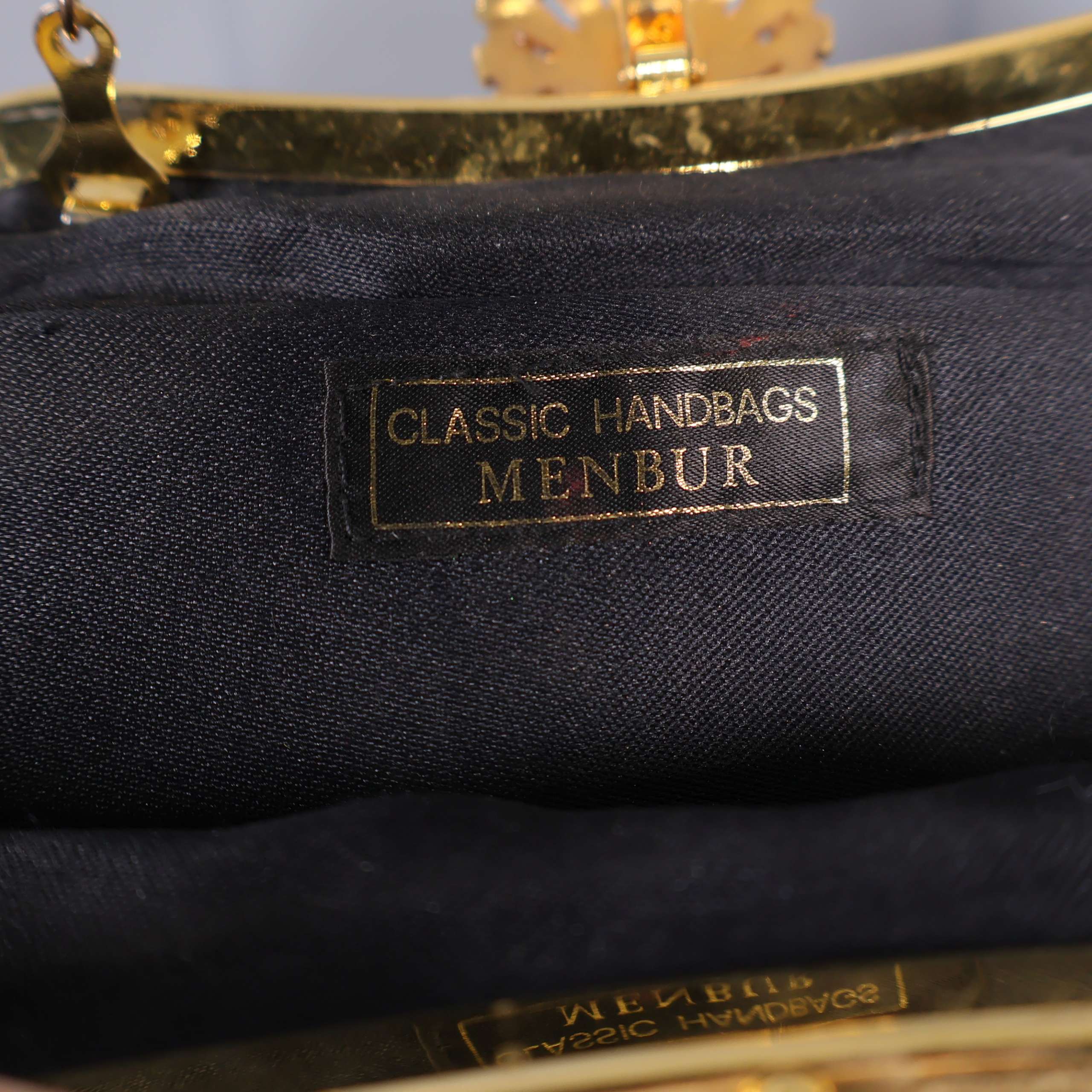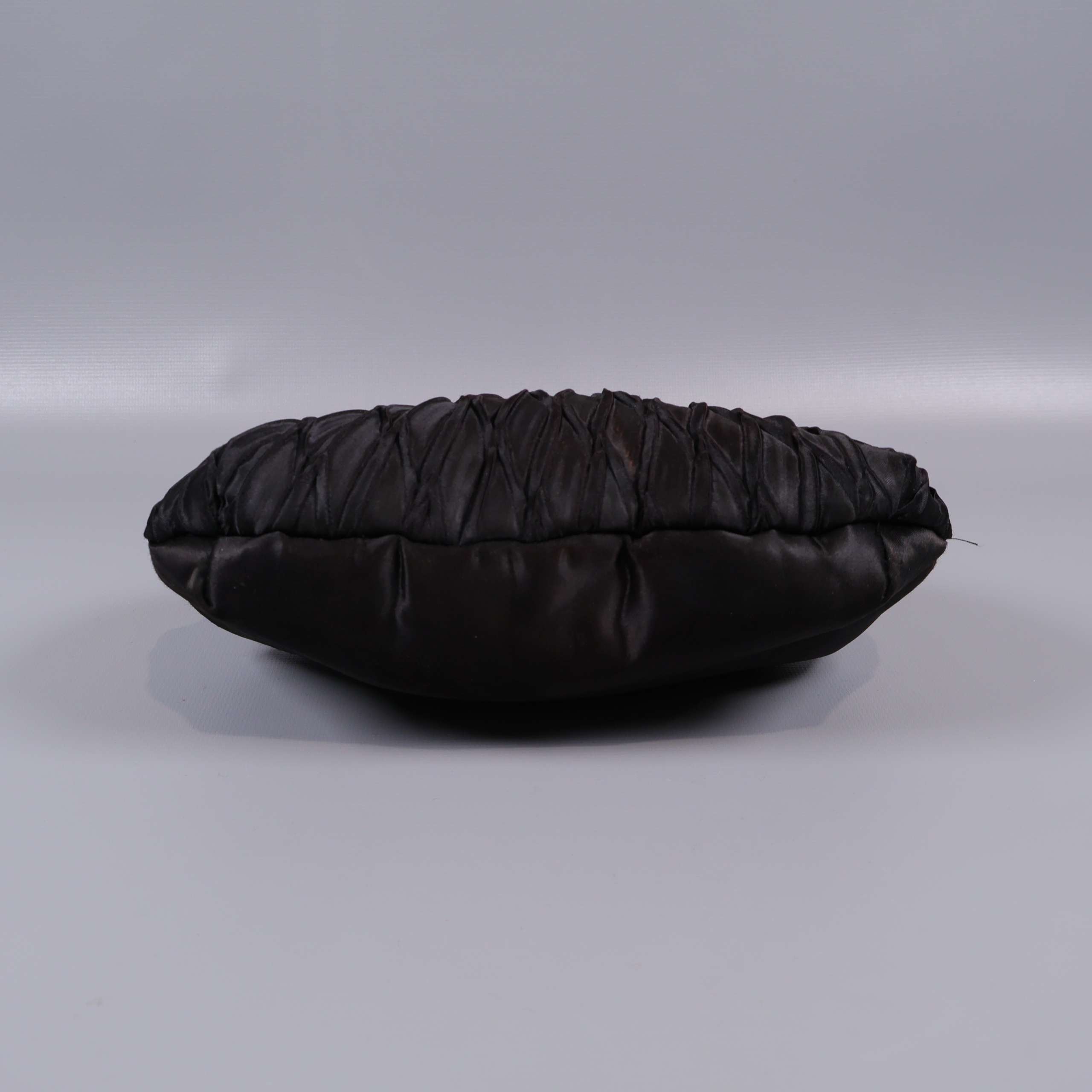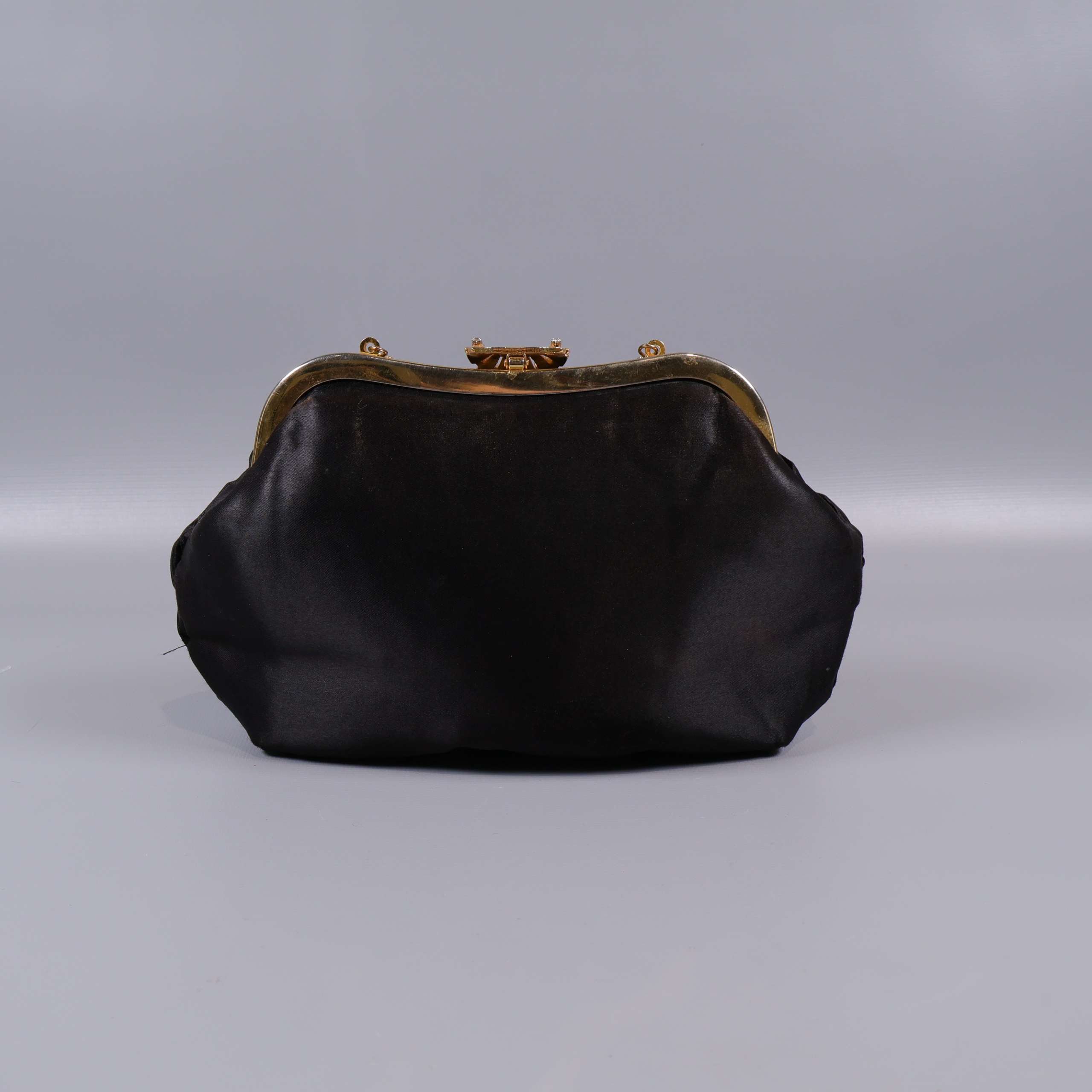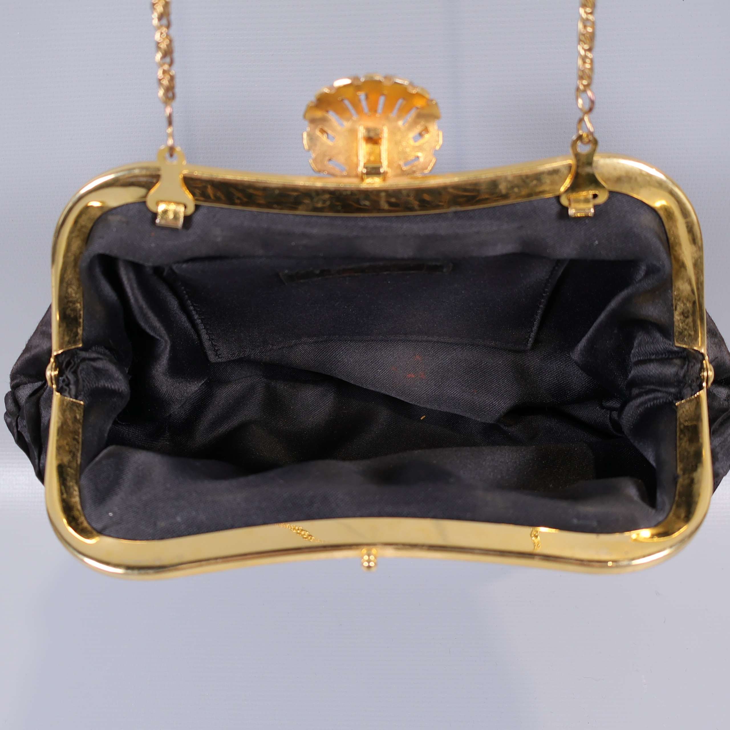 Elegant axelremsväska med svart veckad utsida och detaljer i guld, inklusive dekorativt snäckspänne med glittrande stenar. Väskan har kedjerem i metall och bygel öppning.