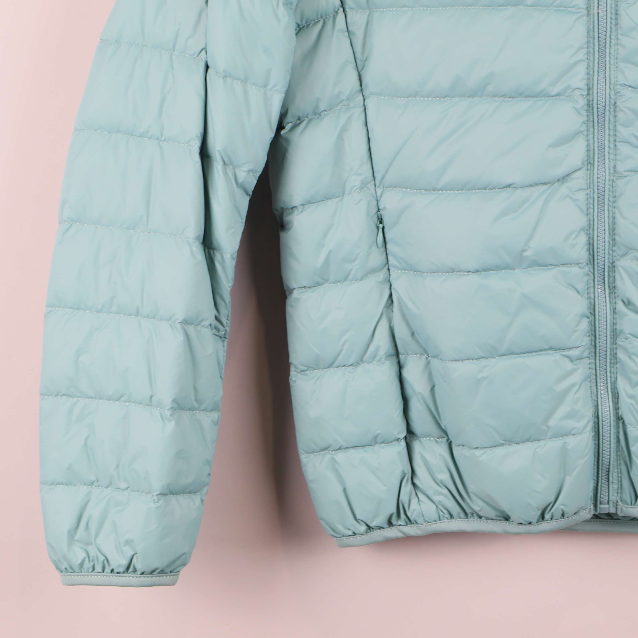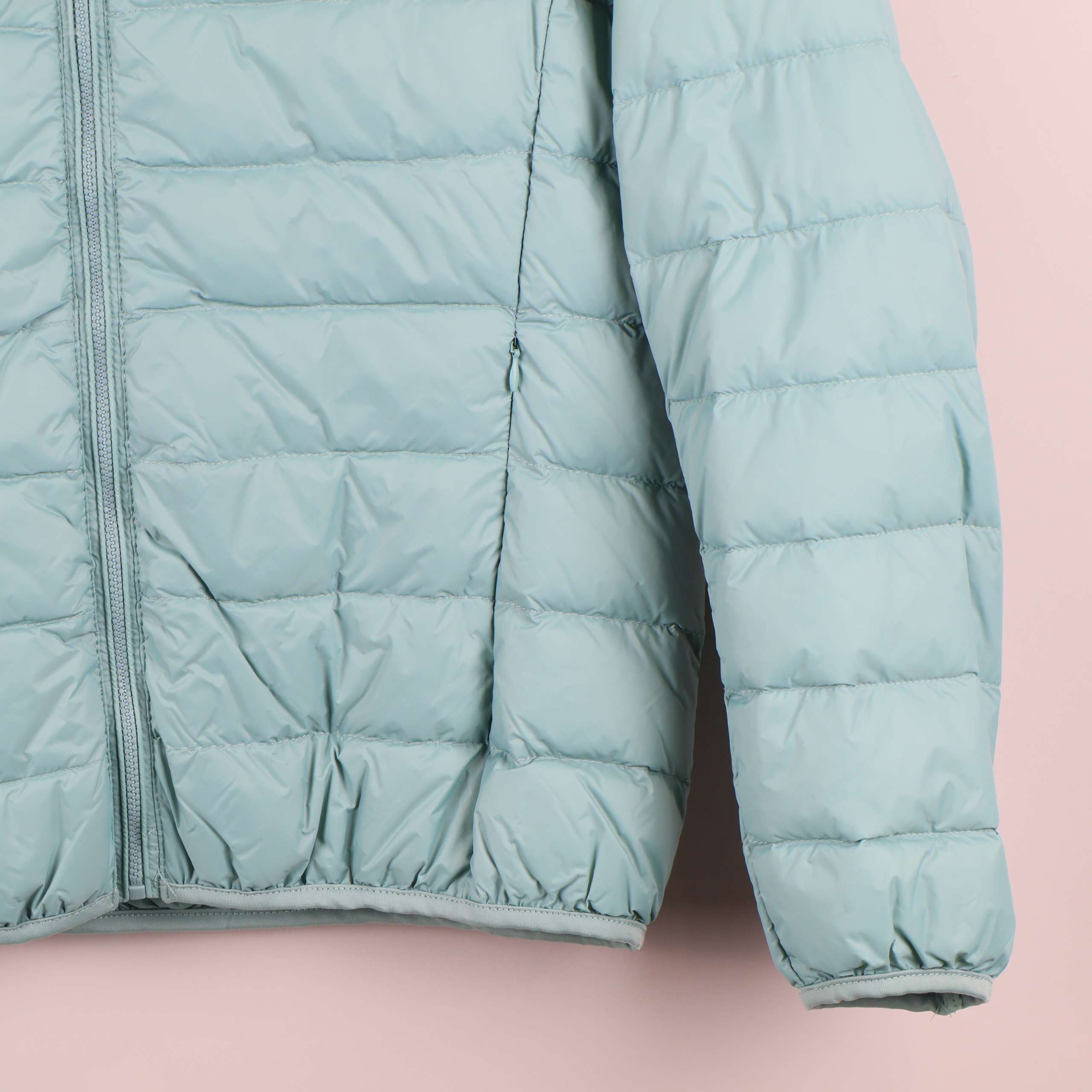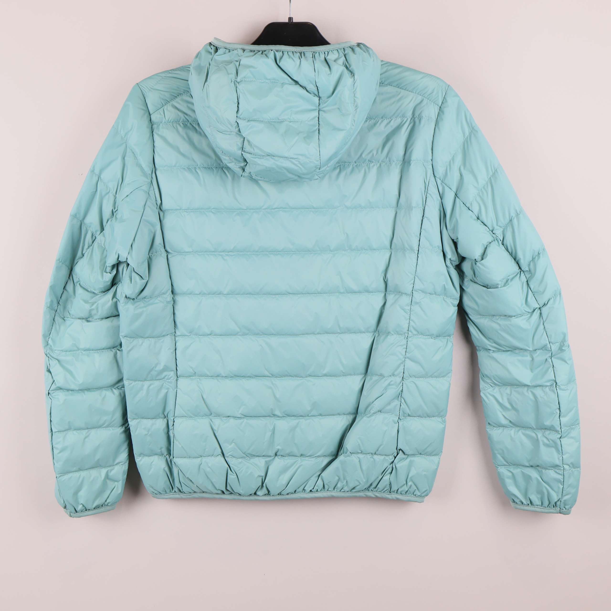Lätt vadderad jacka i en fräsch ljusblå nyans med quiltad design och praktisk huva. Dragkedja fram, elastiska muddar och två sidofickor ger en sportig och enkel känsla. Säljs med tillhörande förvaringspåse.