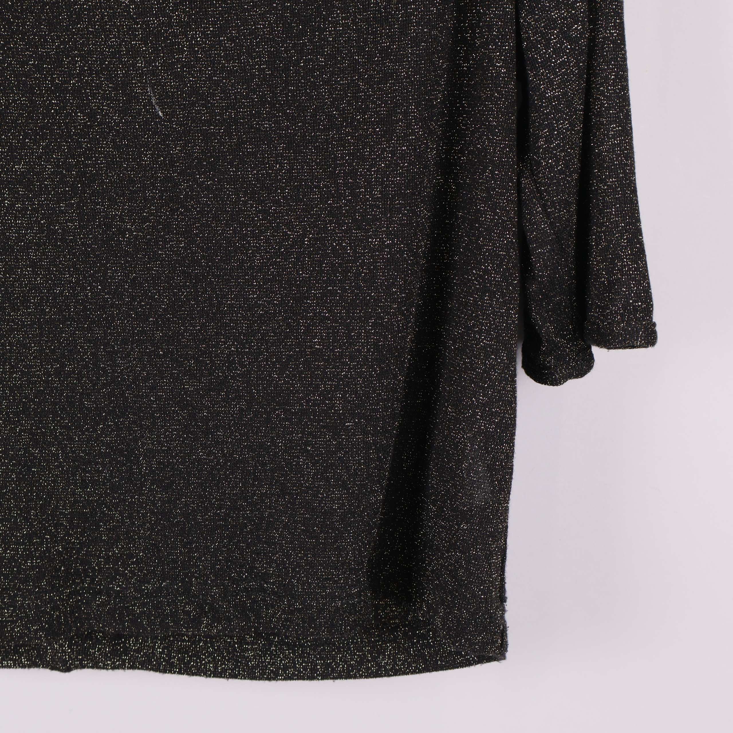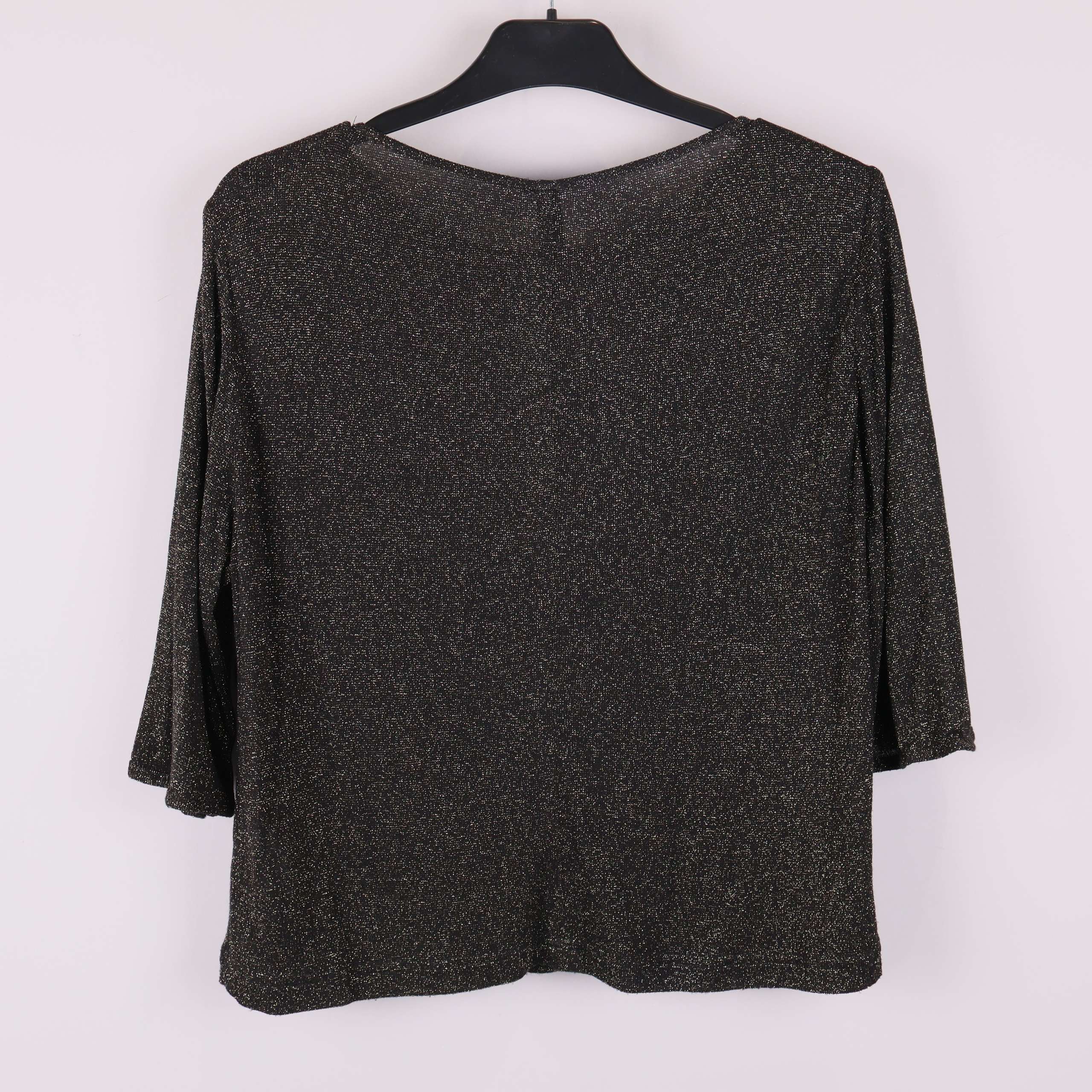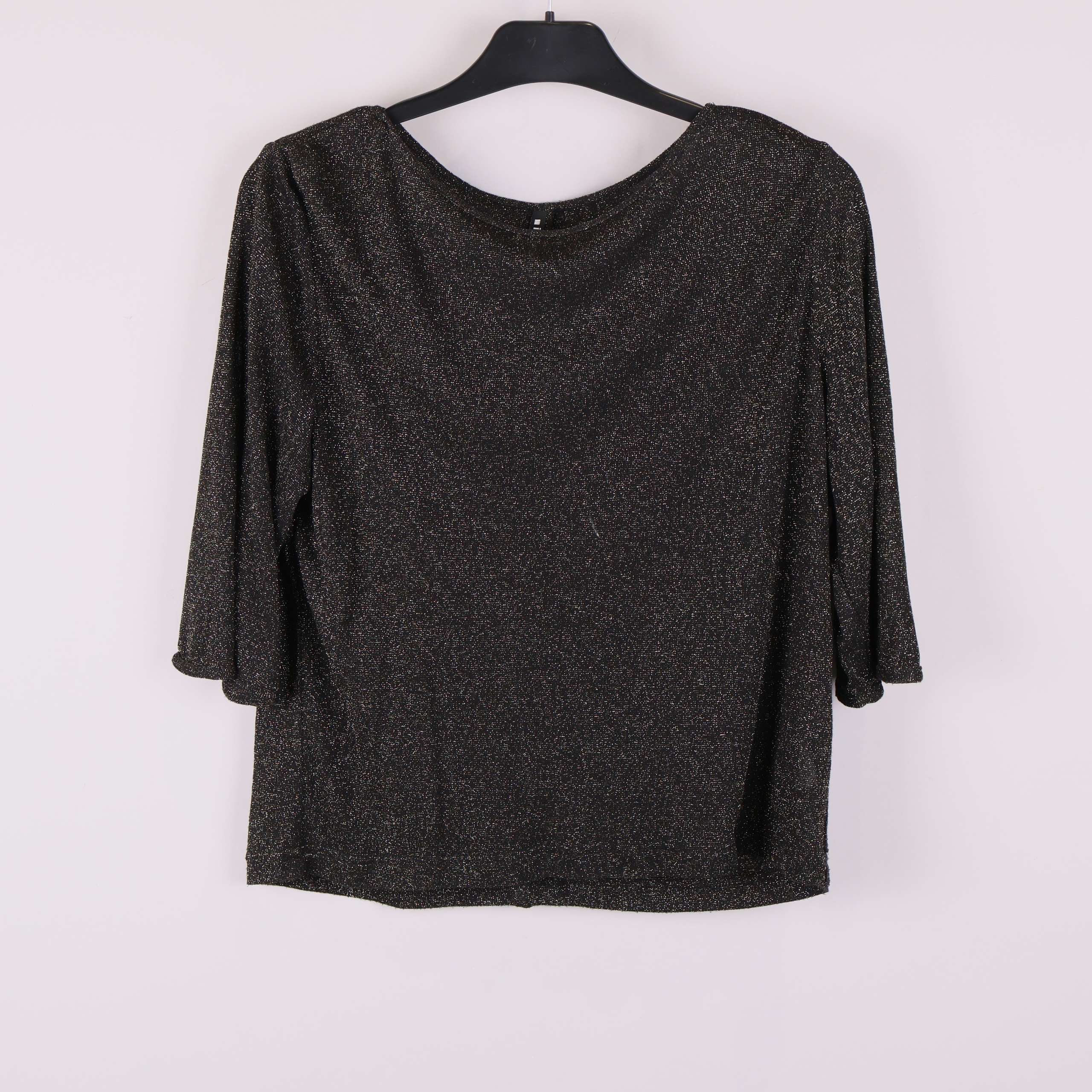 Svart topp med glittriga guld detaljer och trekvartsärmar som ger en ledig men festlig look. Tyget har en mjuk känsla tack vare viskosblandningen, medan polyester tillför lätt struktur och skimrande effekt.