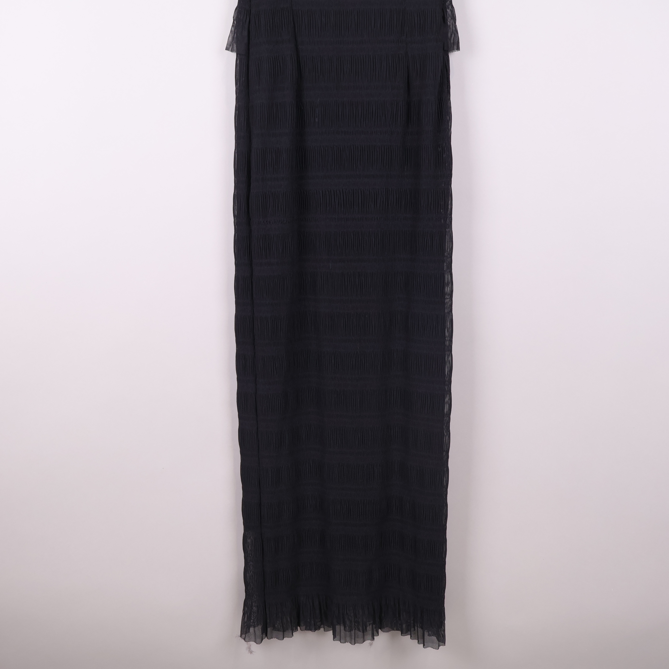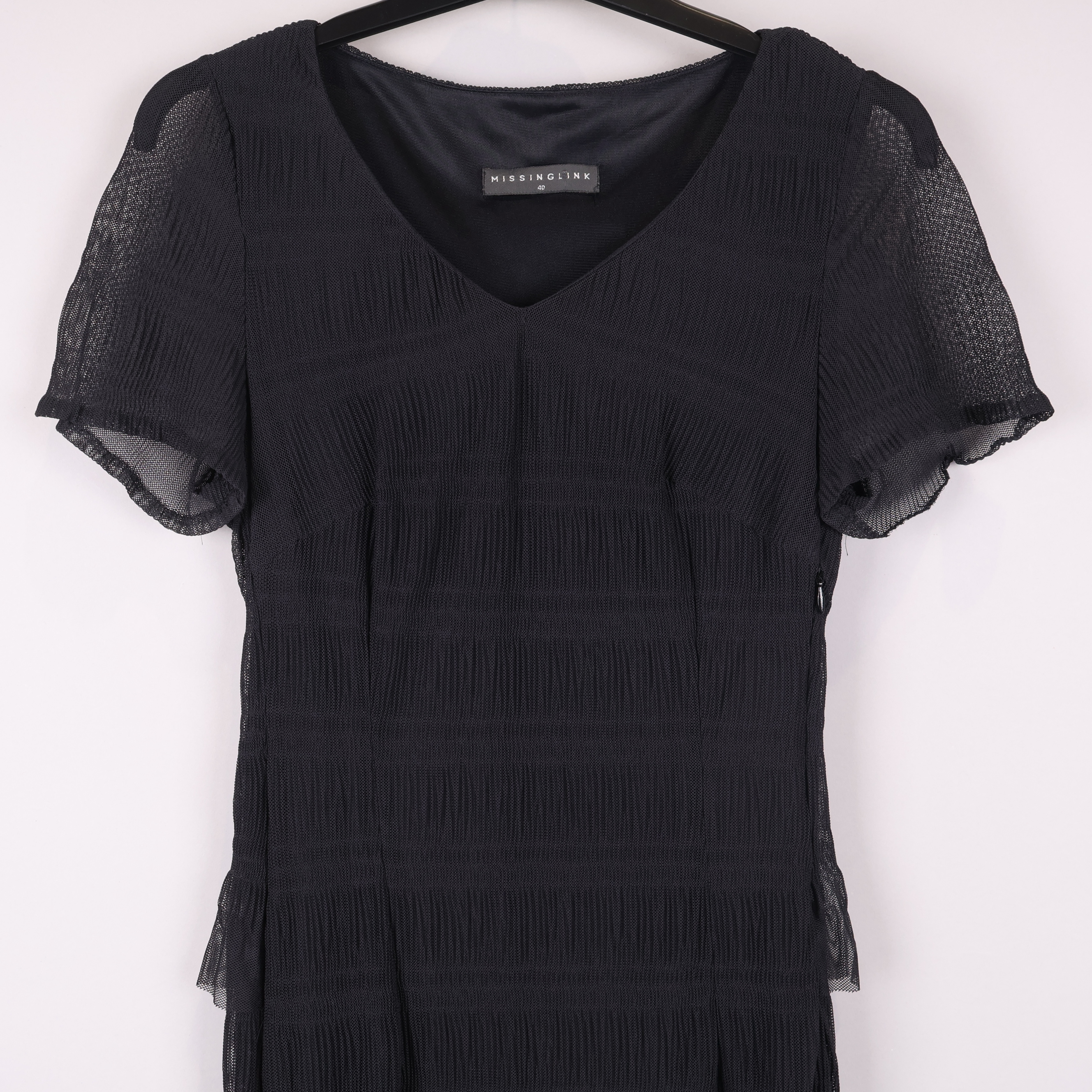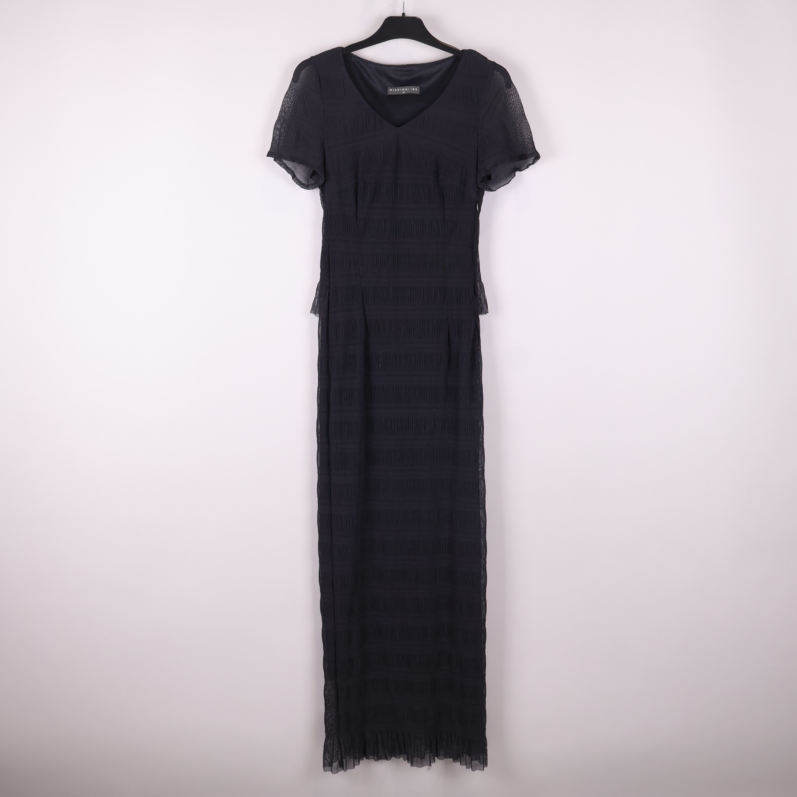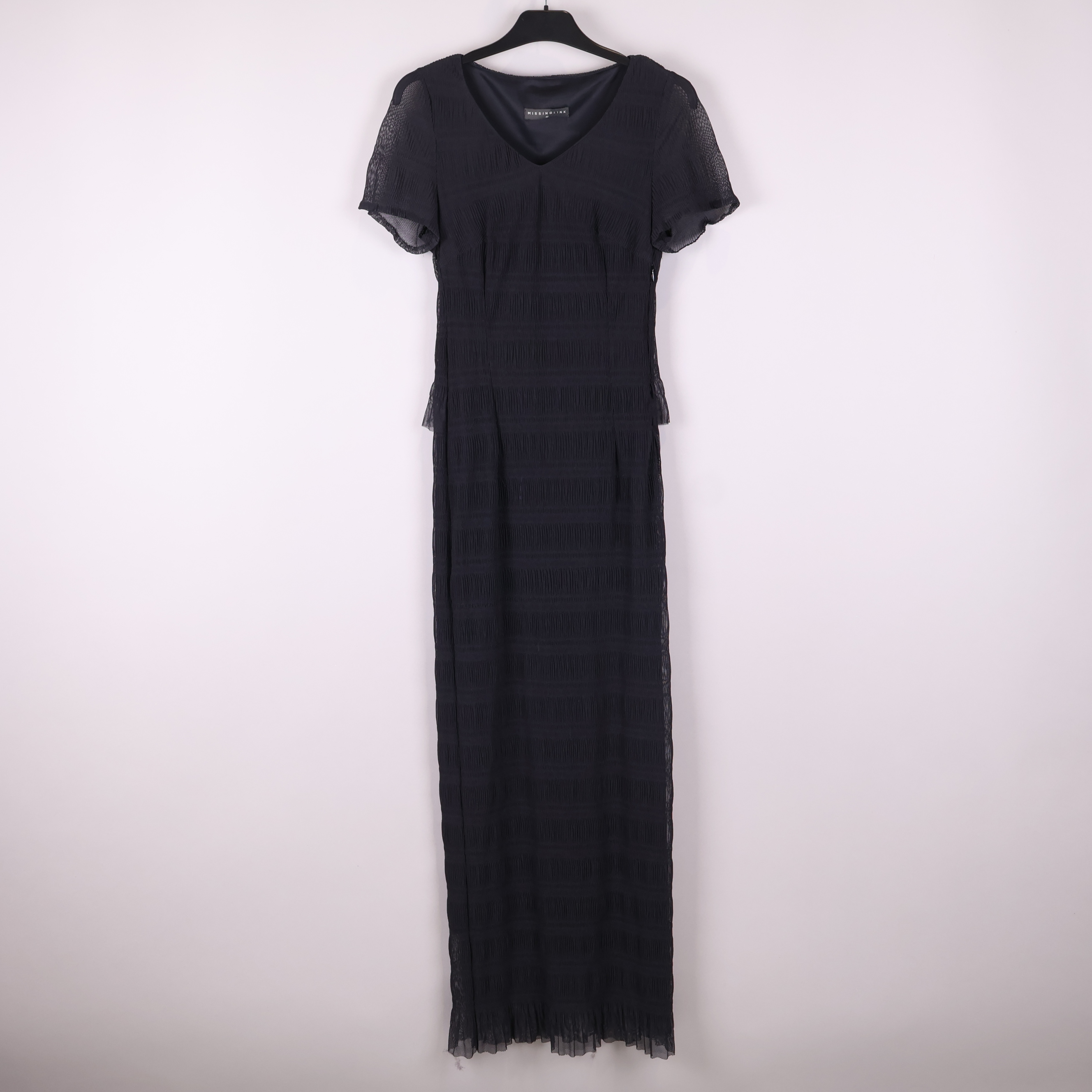Lång och elegant klänning med vackert strukturerat tyg och transparenta, korta ärmar. Djup v-ringning framtill och ett lätt genombrutet material som skapar en modern, luftig look.