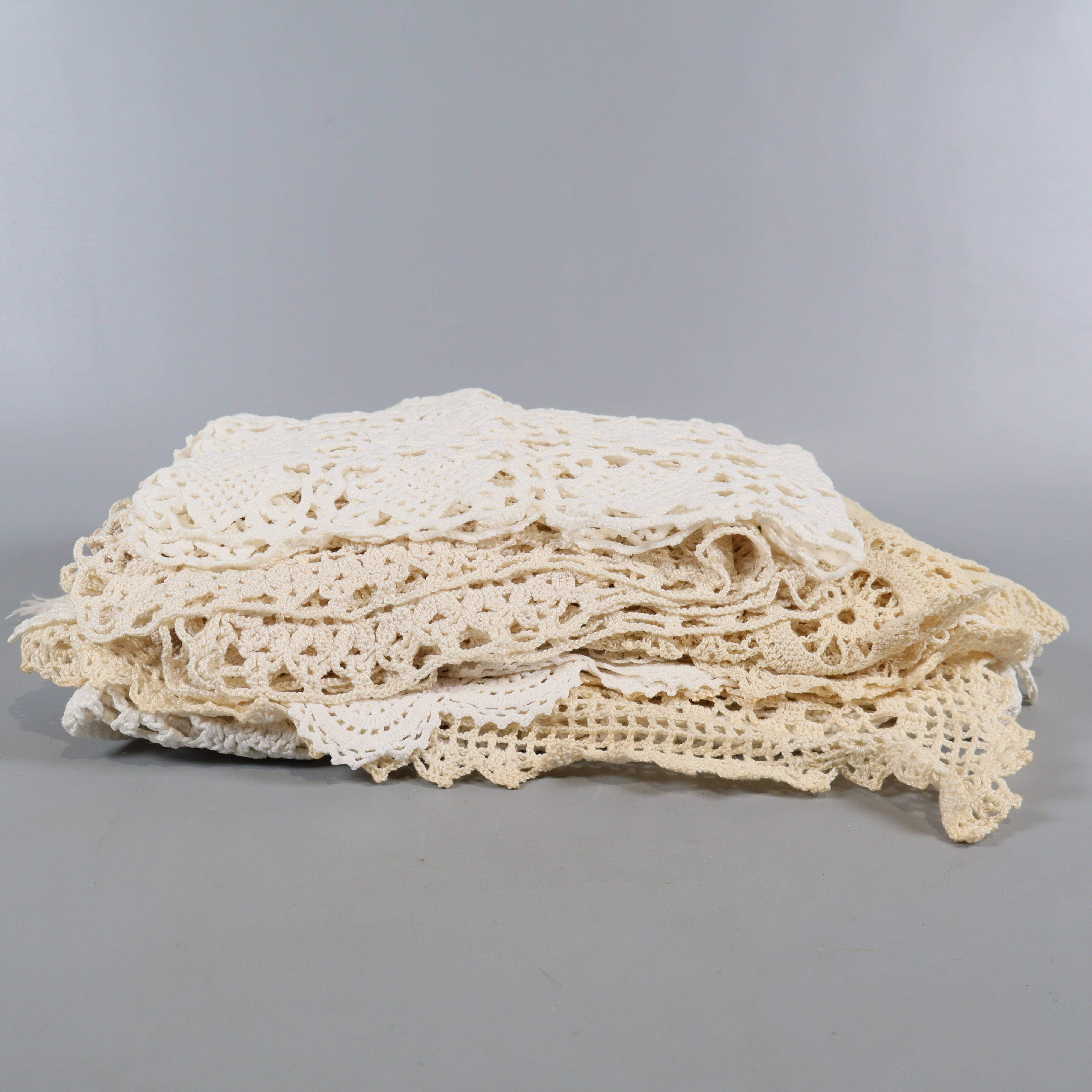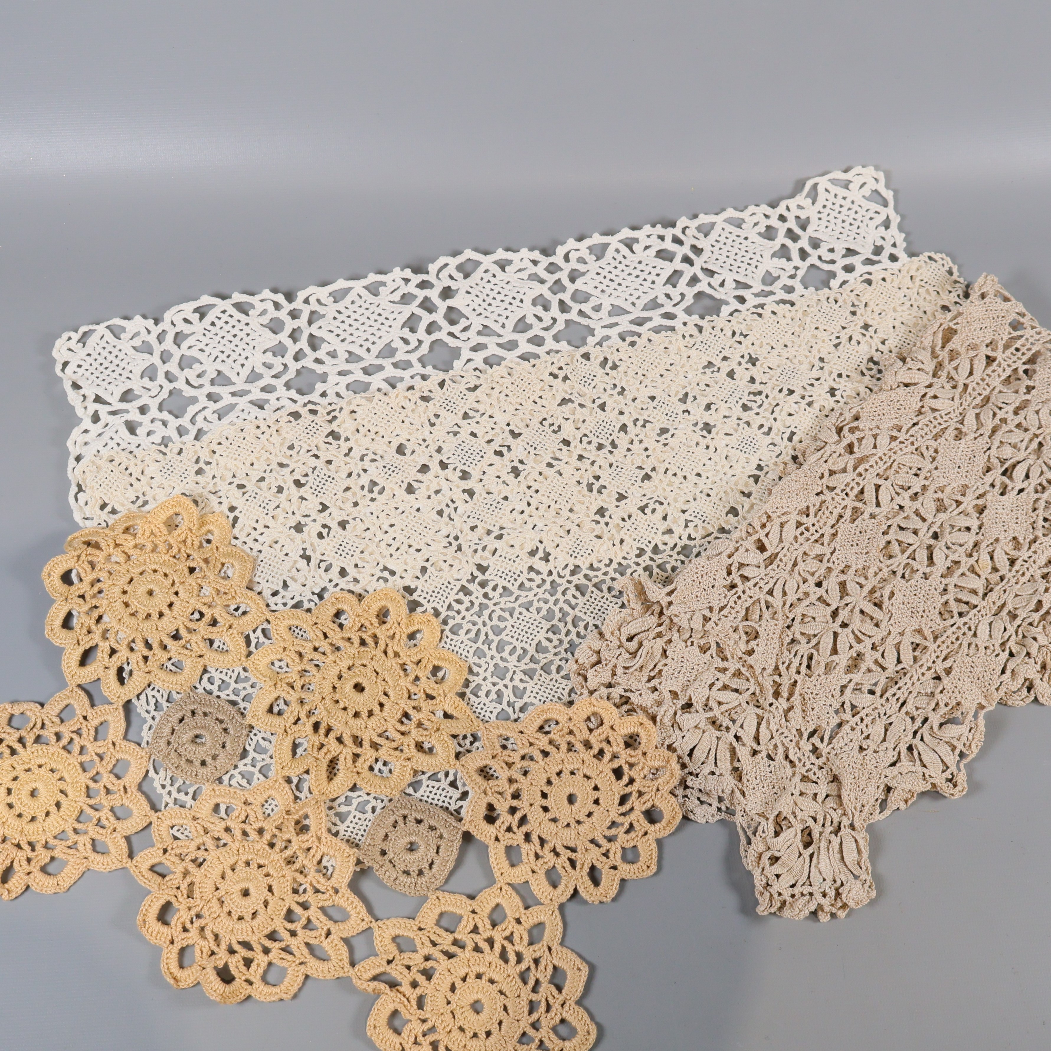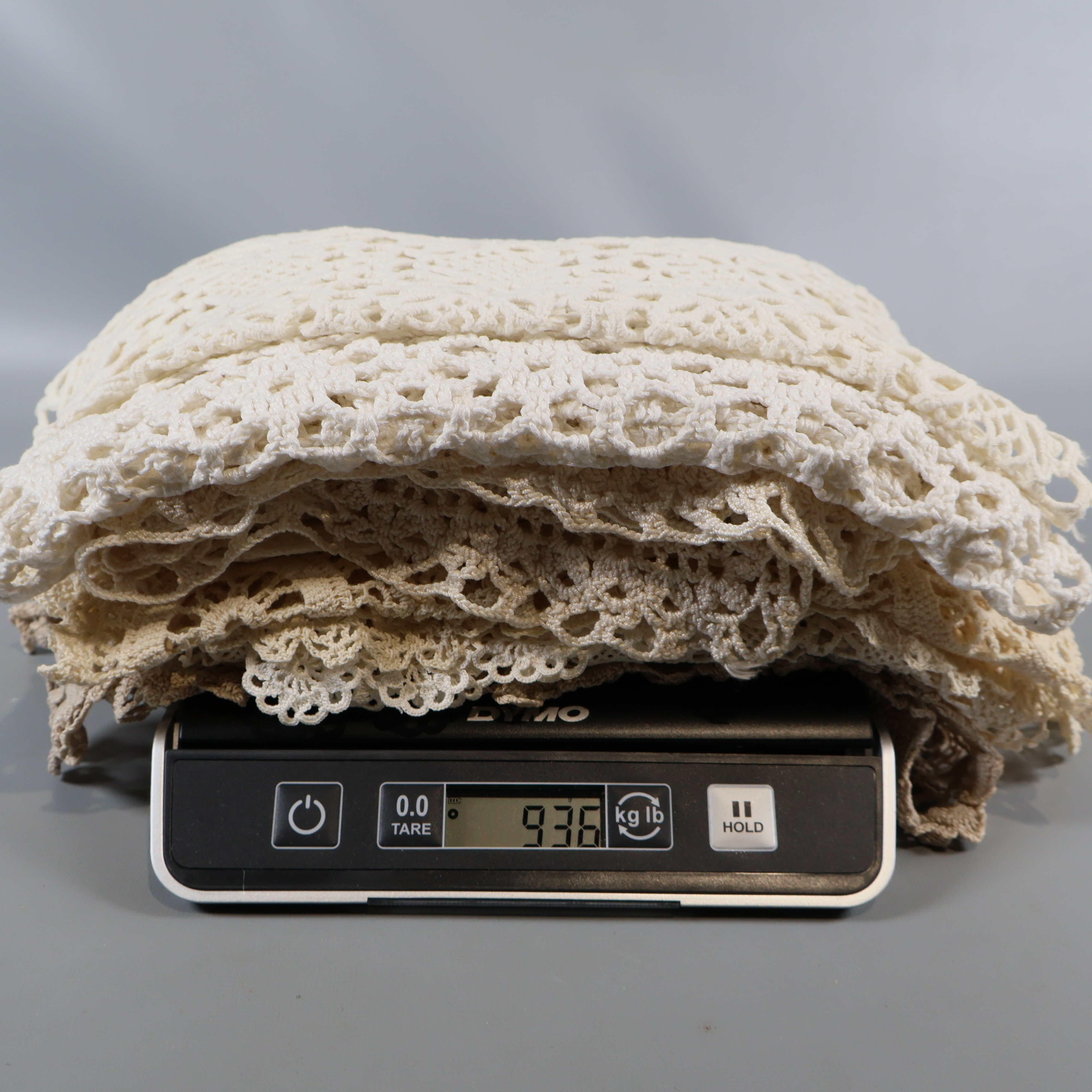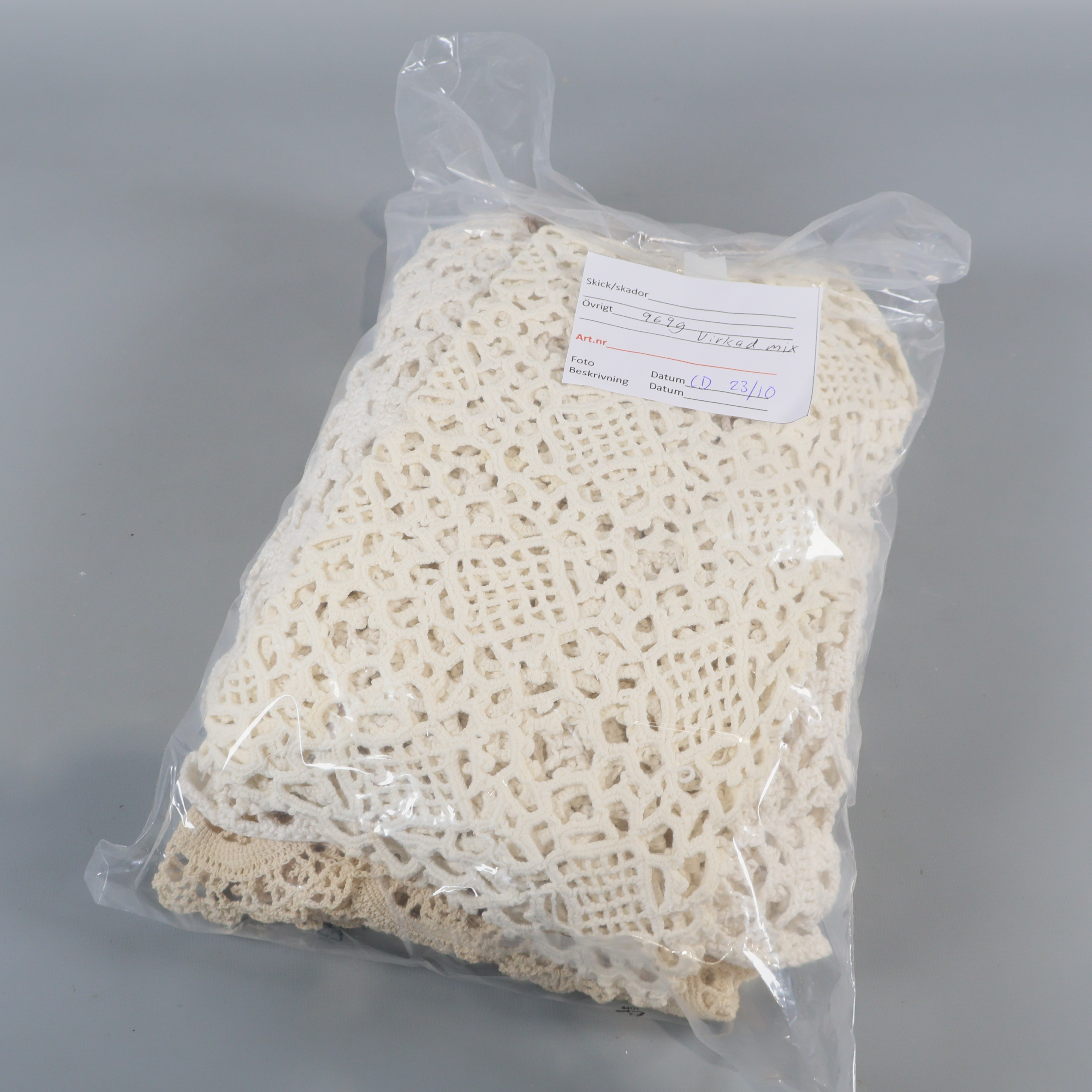 En blandning av virkade dukar i olika mönster och former. Färgskalan går i klassiskt beige och naturvitt. Varje duk har vackra, handgjorda detaljer med olika strukturer och kanter, perfekt för dig som älskar vintage och personlig inredning. Passar lika bra på bordet som dekorativ accent i hemmet.