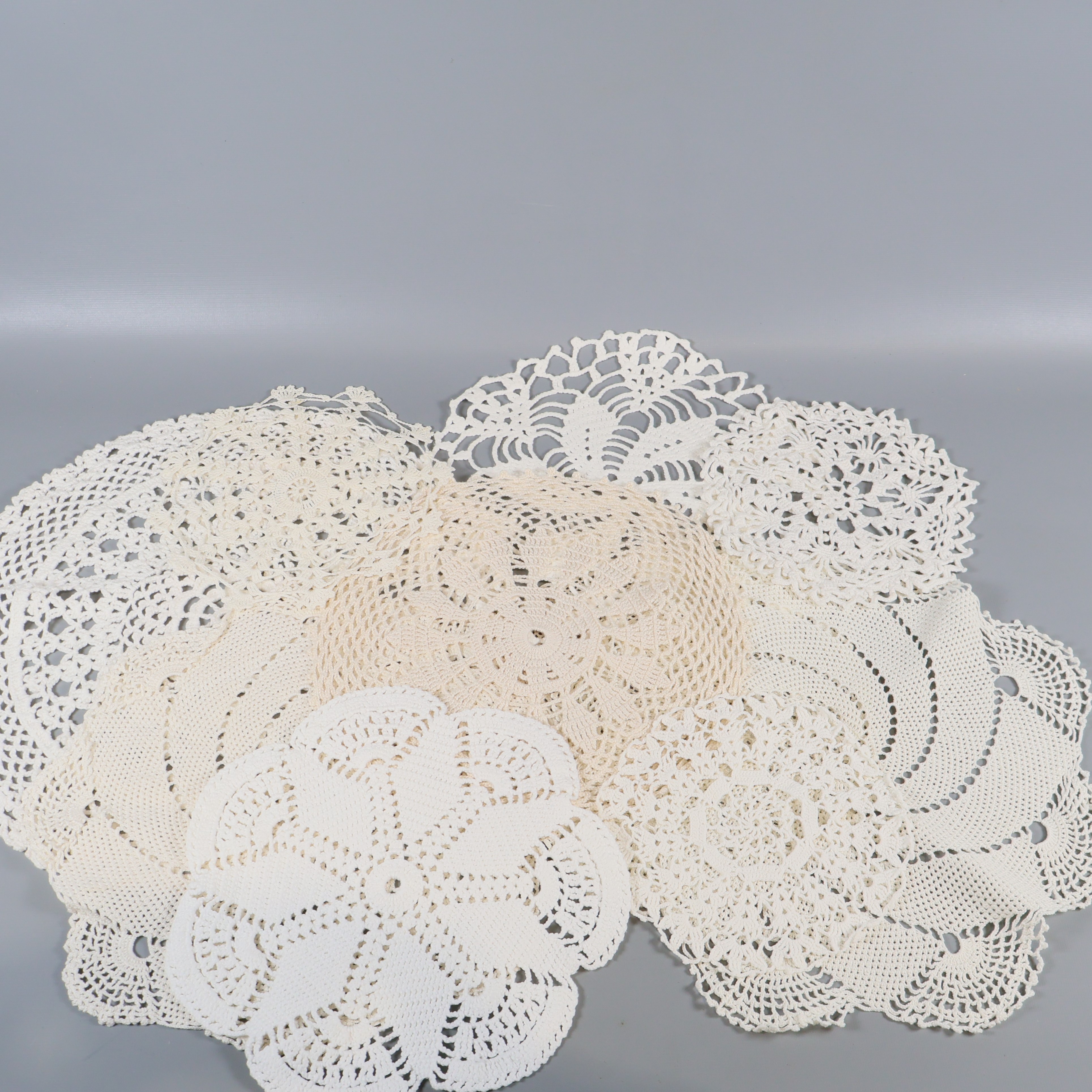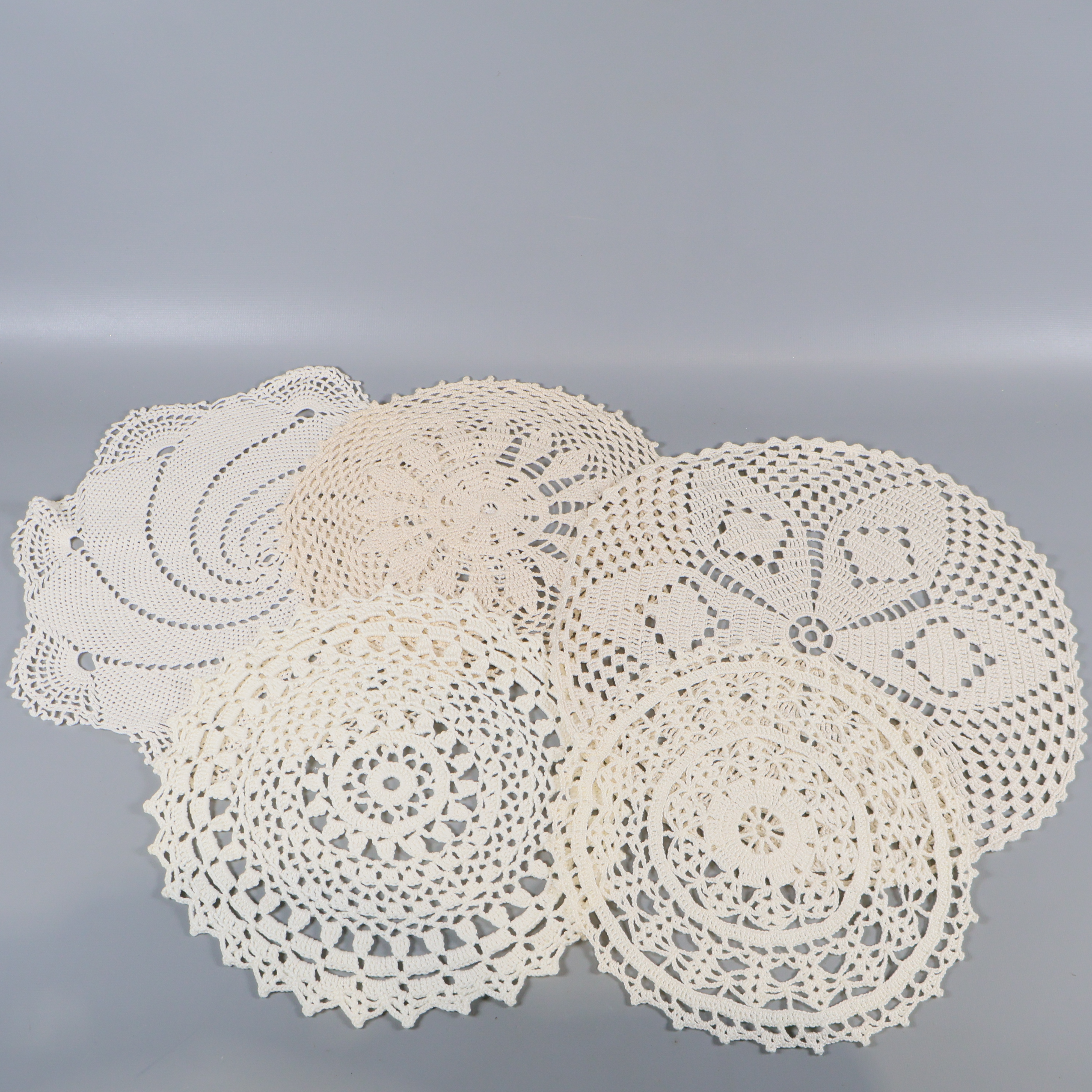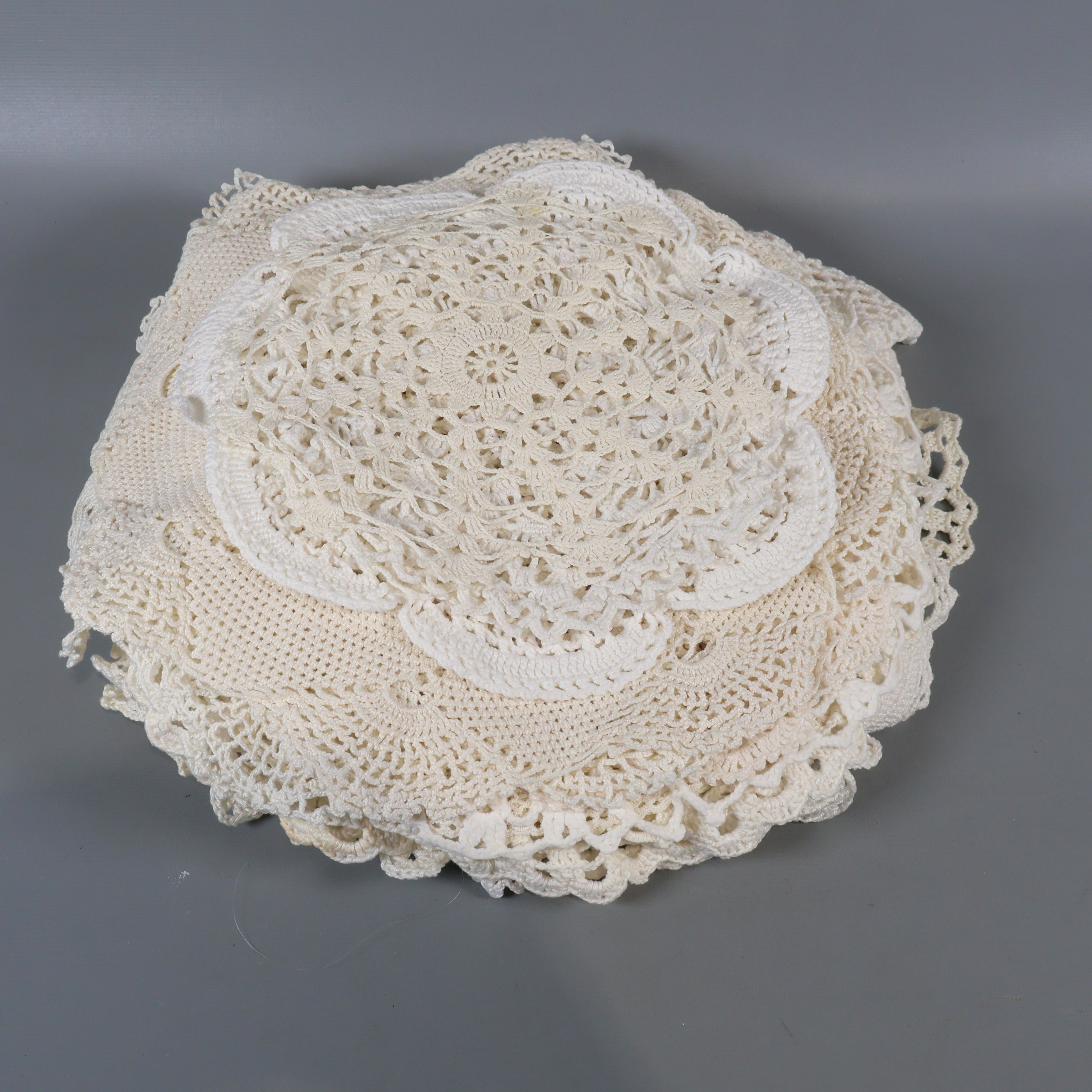 En samling virkade dukar i olika storlekar och mönster, alla i en ljus cremevit ton. Den handgjorda känslan ger ett personligt uttryck och en soft vintage vibe till inredningen.