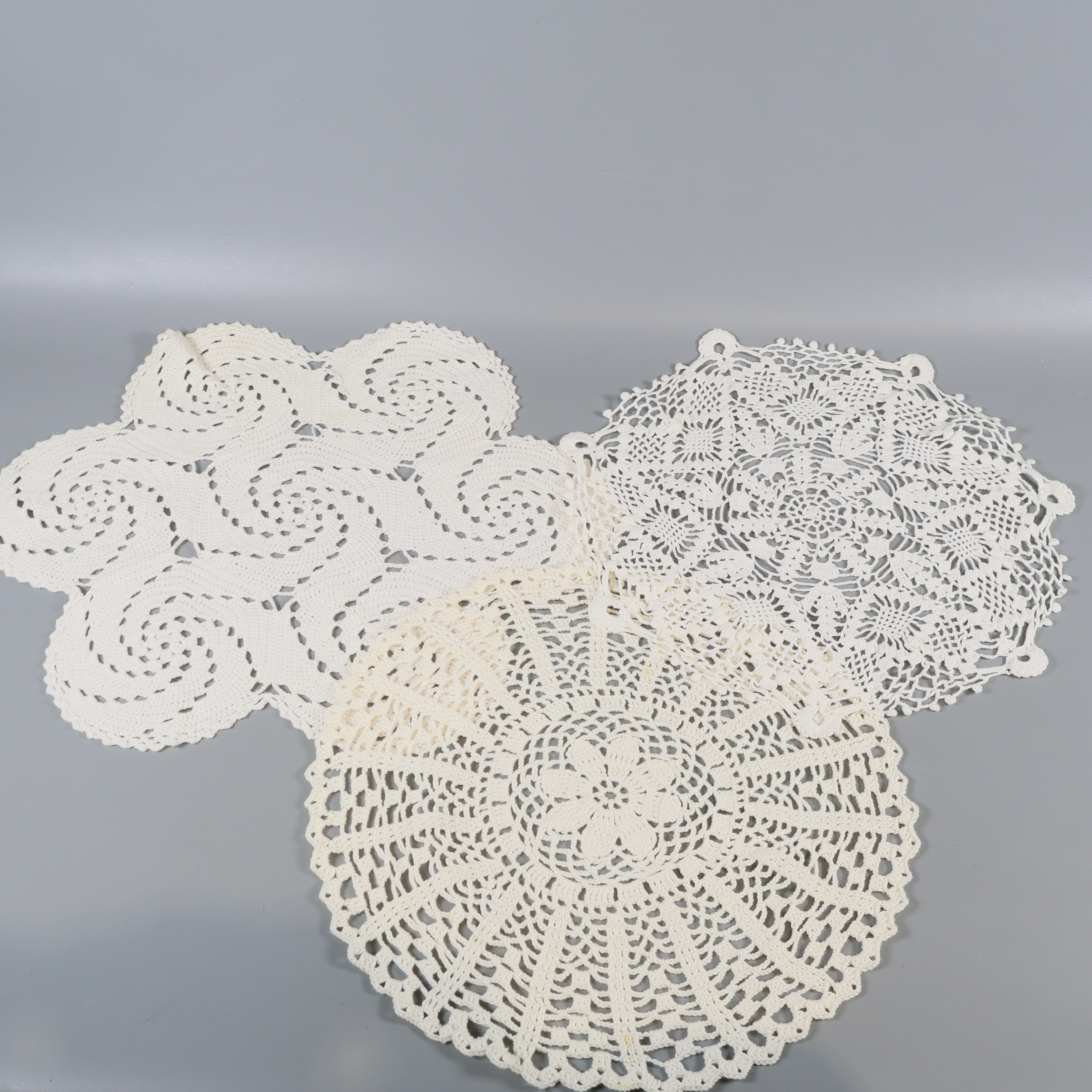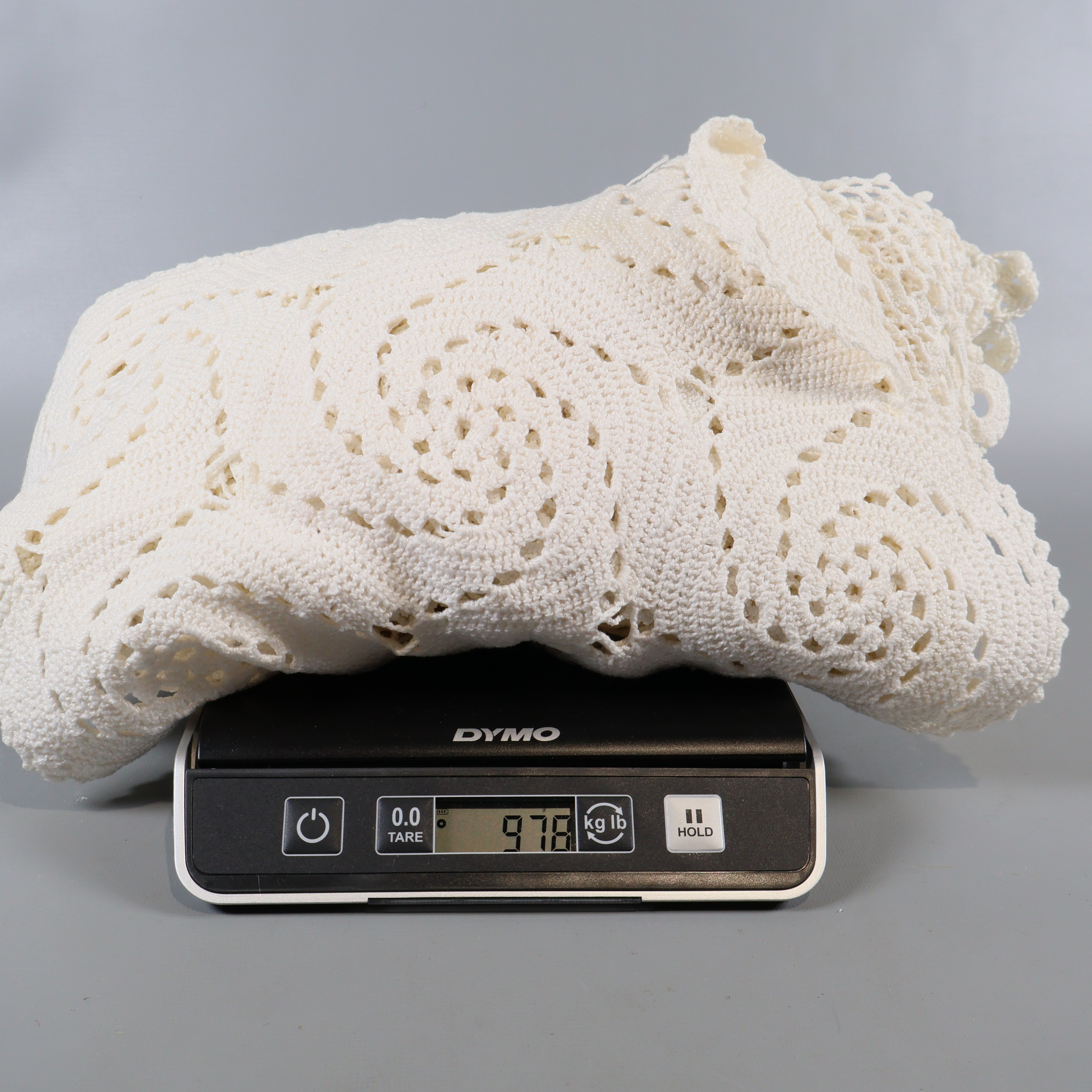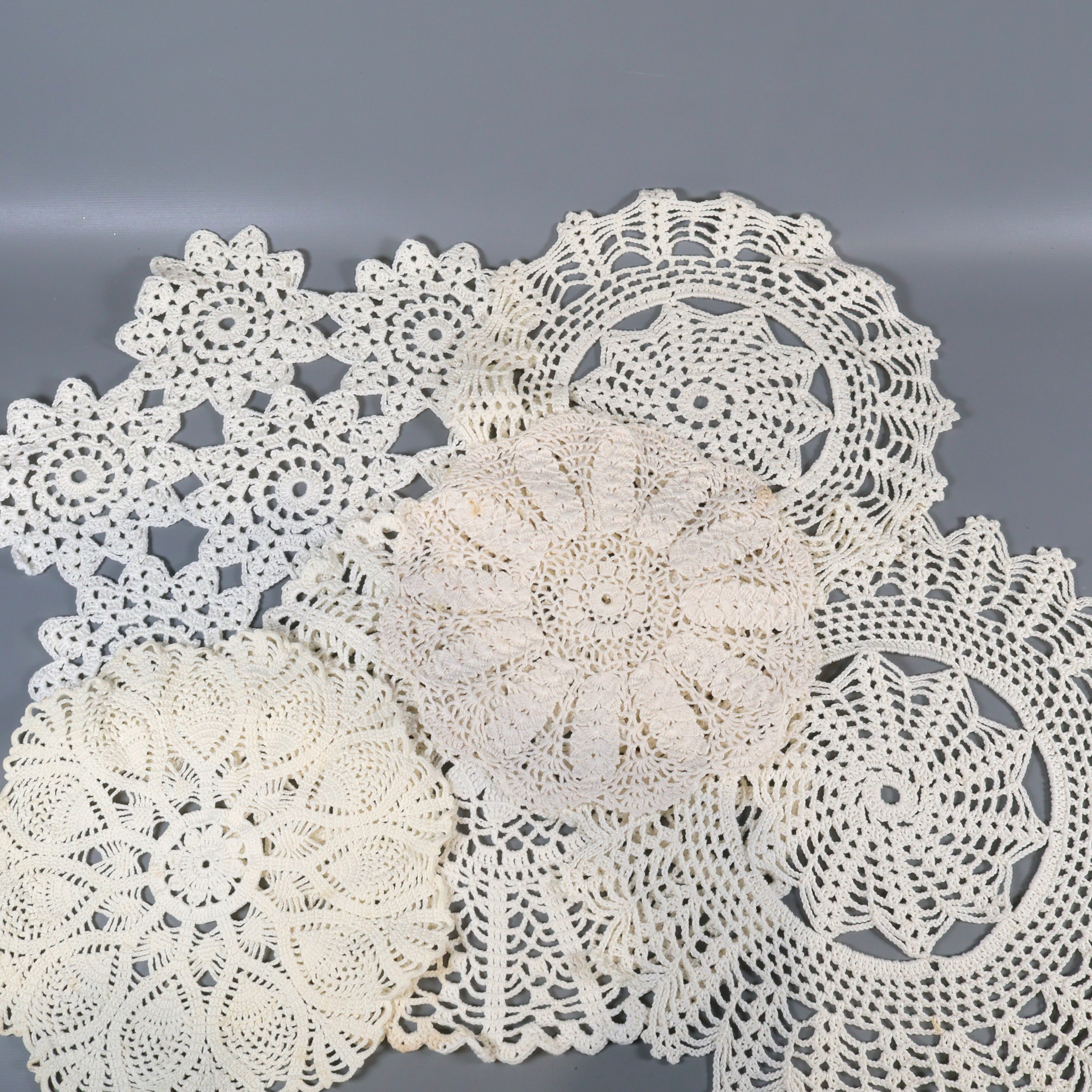 En samling virkade dukar i olika storlekar och mönster, alla i en ljus cremevit ton. Den handgjorda känslan ger ett personligt uttryck och en soft vintage vibe till inredningen.