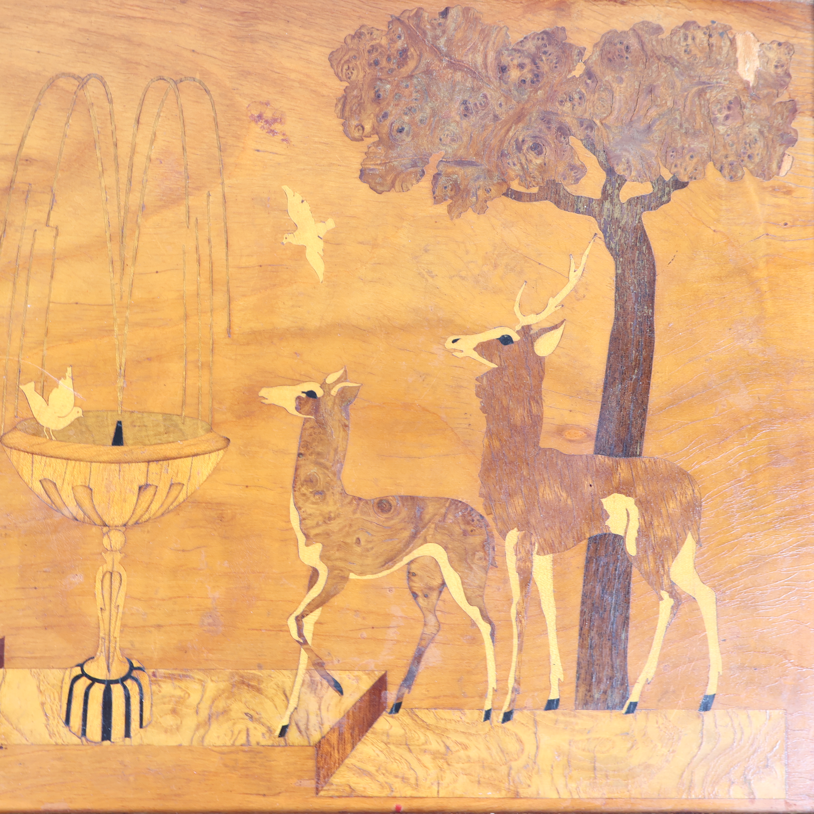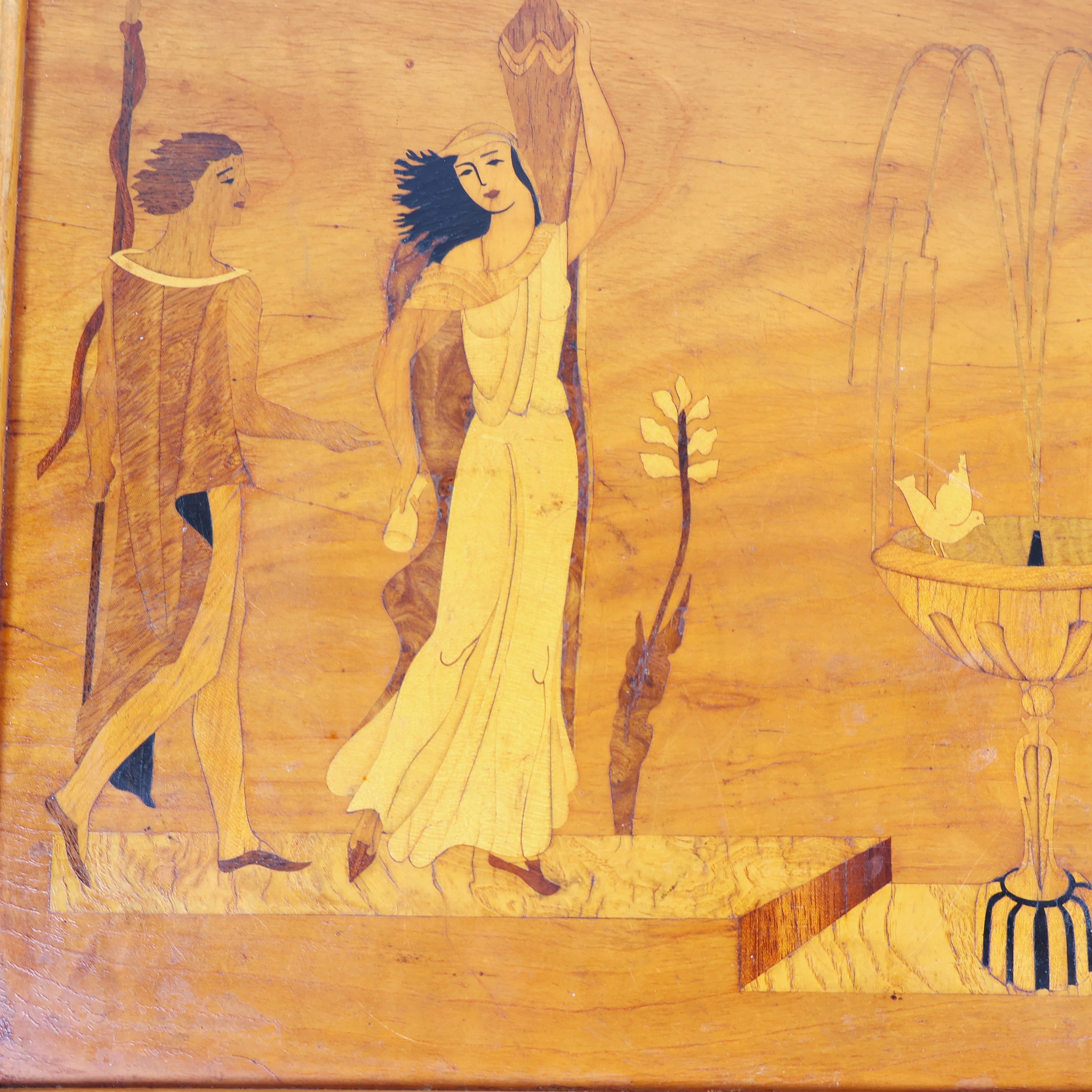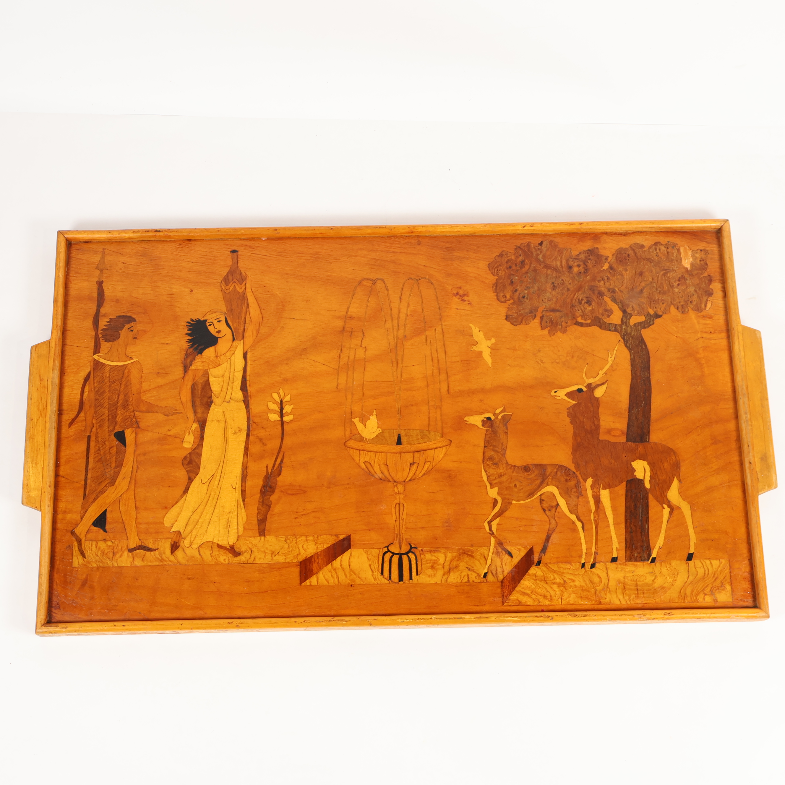 Detaljrik bricka i trä med konstfulla inläggningar av figurer, djur och träd i vackra trätoner. Skapar en nostalgisk känsla och ett unikt blickfång på bordet. Signerad Birger Ekman