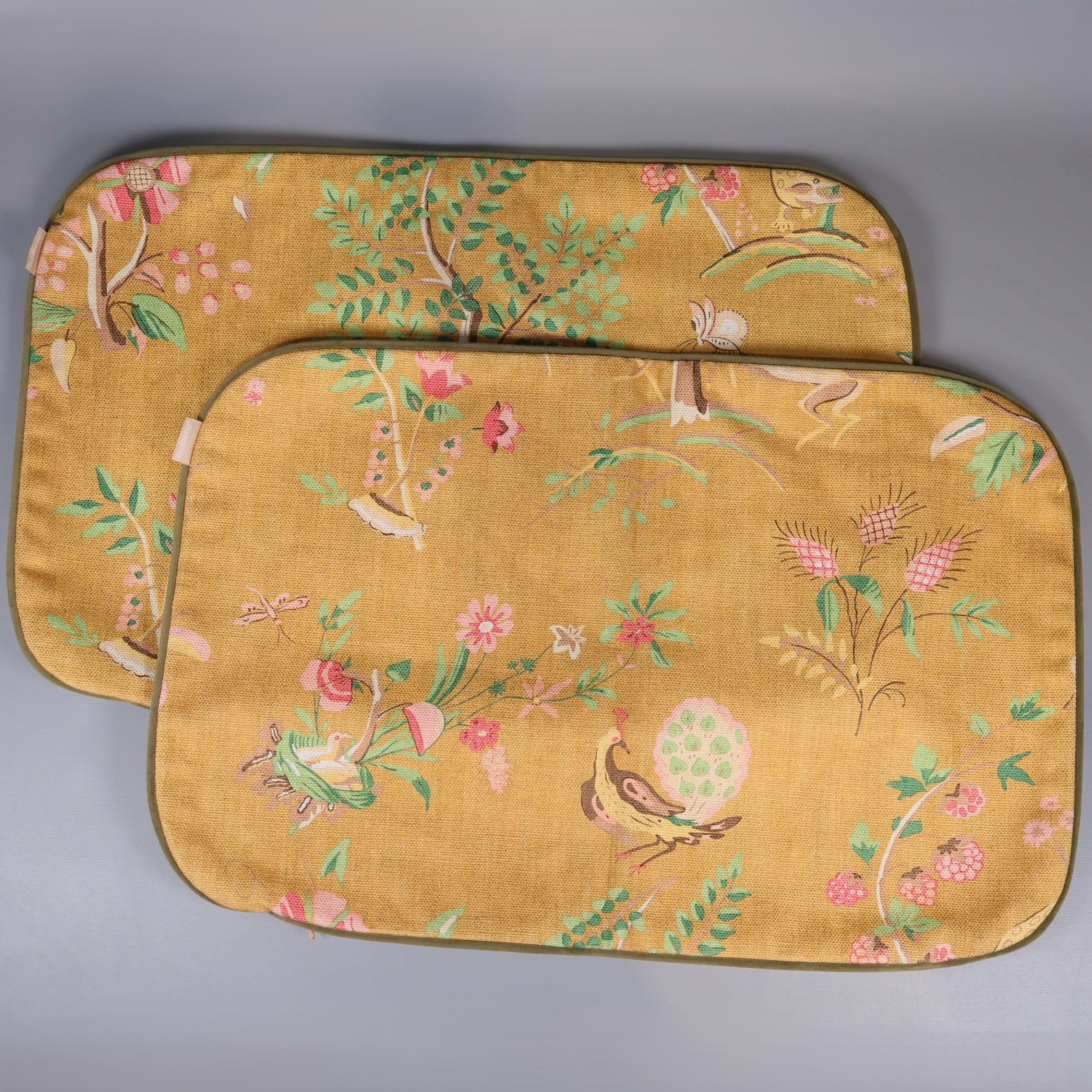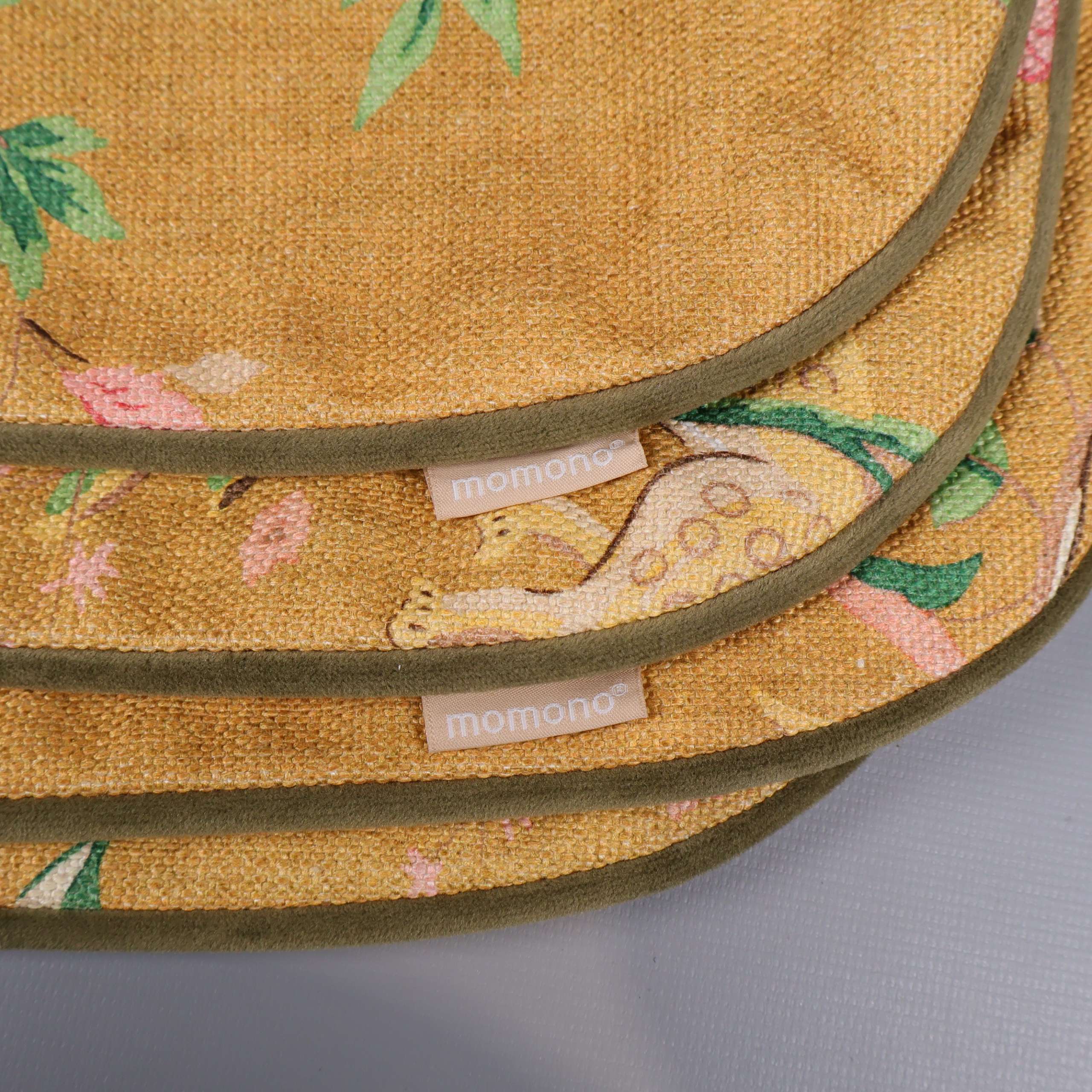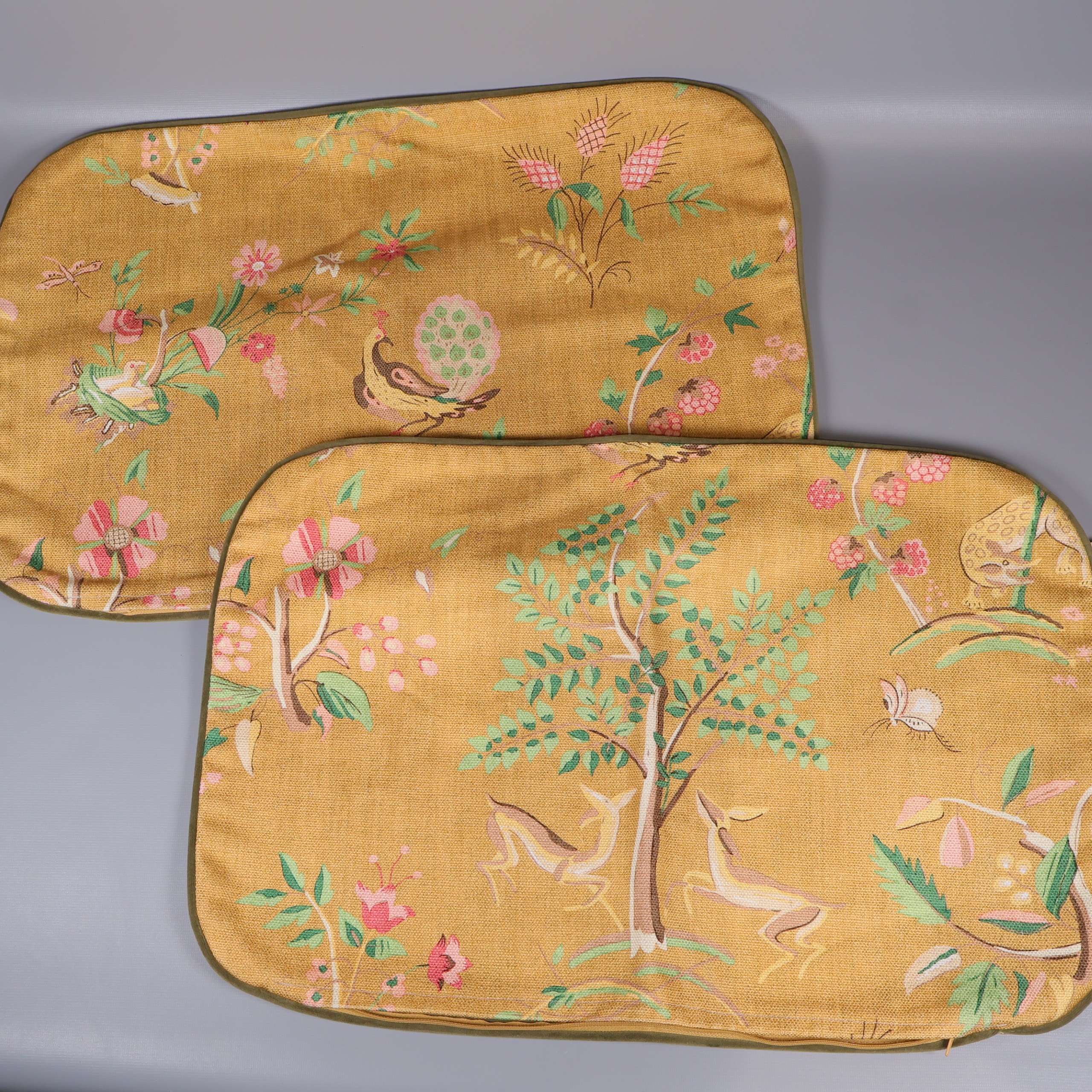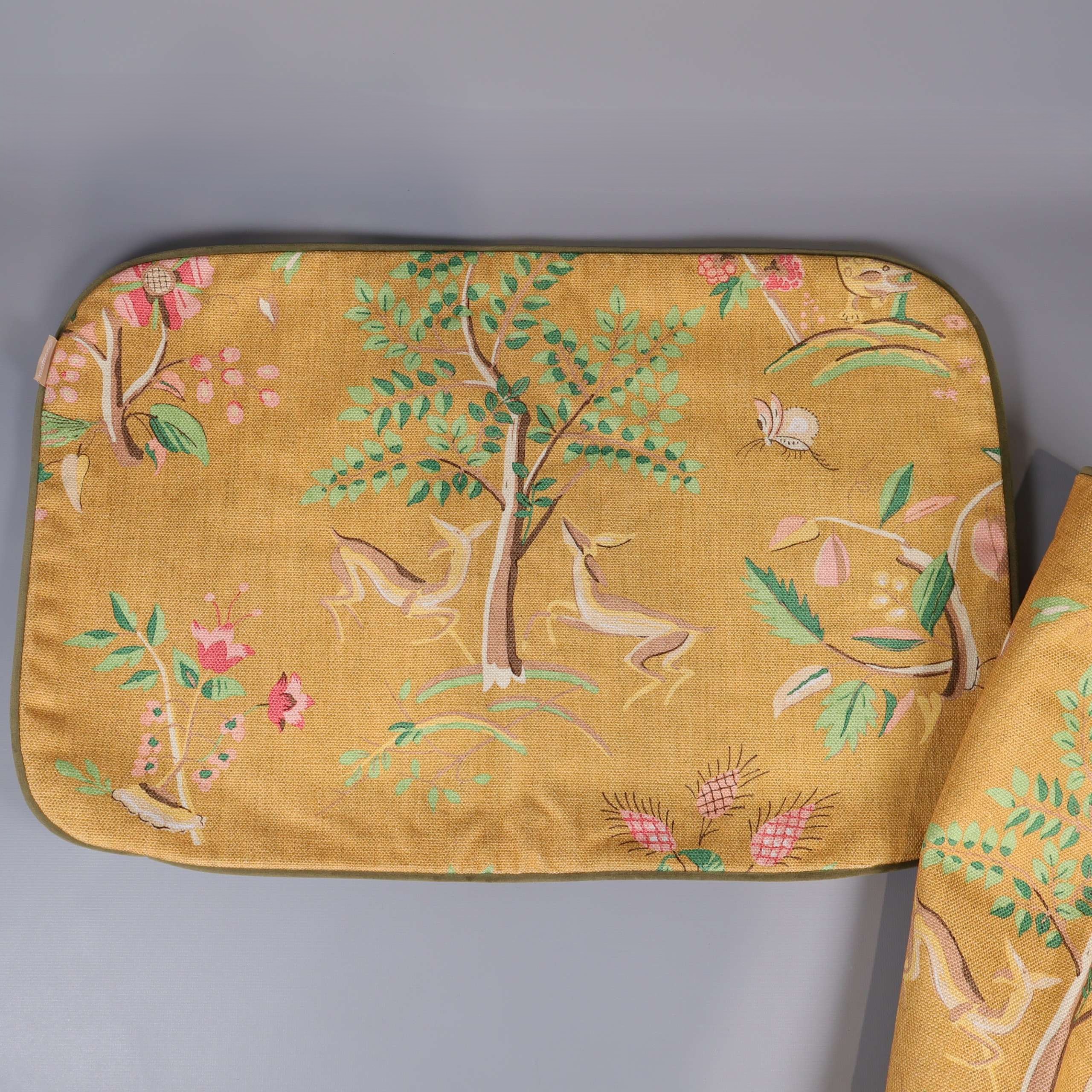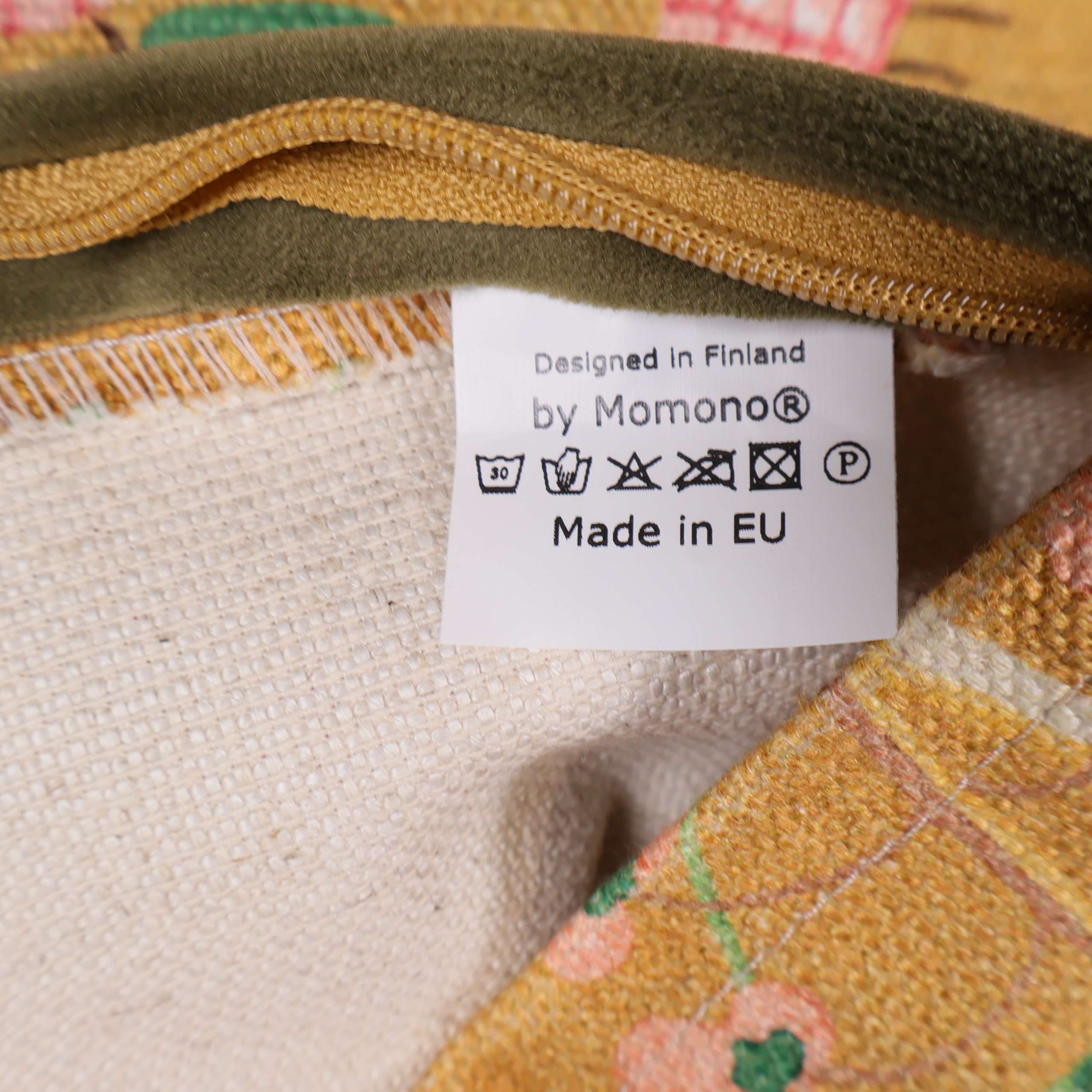 Två kuddfodral 40 x 60 cm med rundade hörn och dekorativt djur- och naturmönster i färgglada toner mot en senapsfärgad botten. Designen 'Deer Dance' ger en livlig, unik känsla och textilkvaliteten känns mjuk men stadig. Diskret dragkedja och märkning från Momono. Matreial: 50% viskos 33% bomull 11% lin 6% polyester