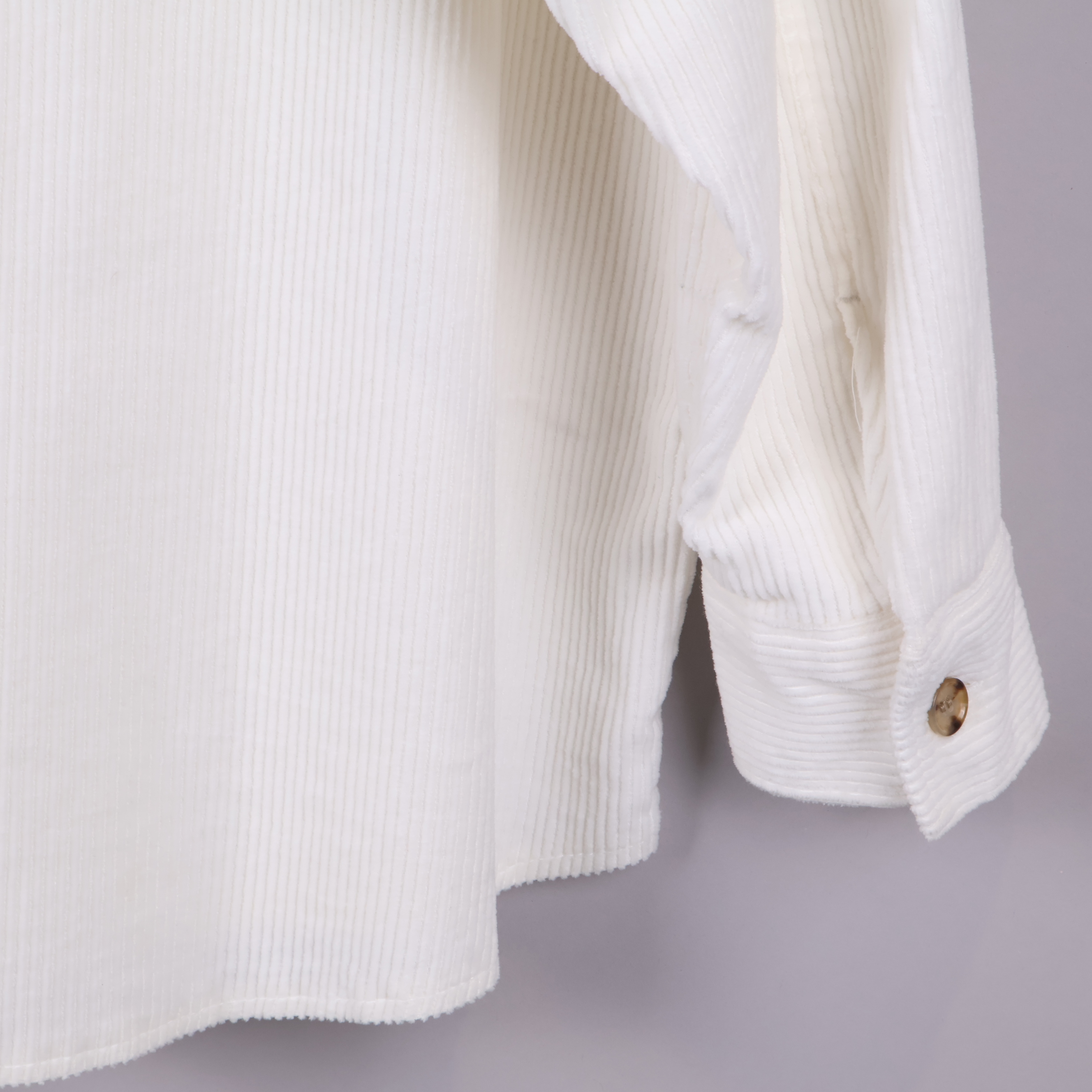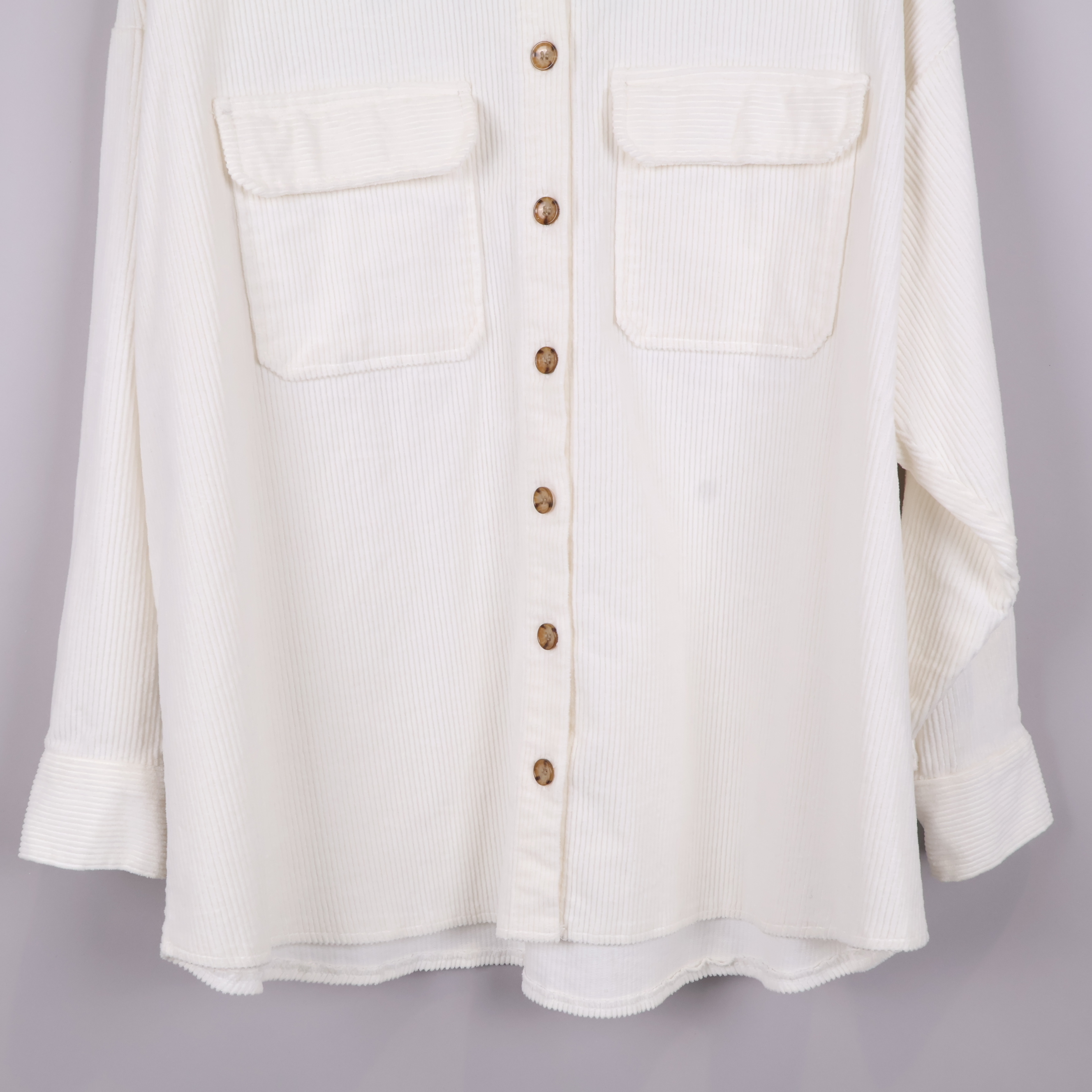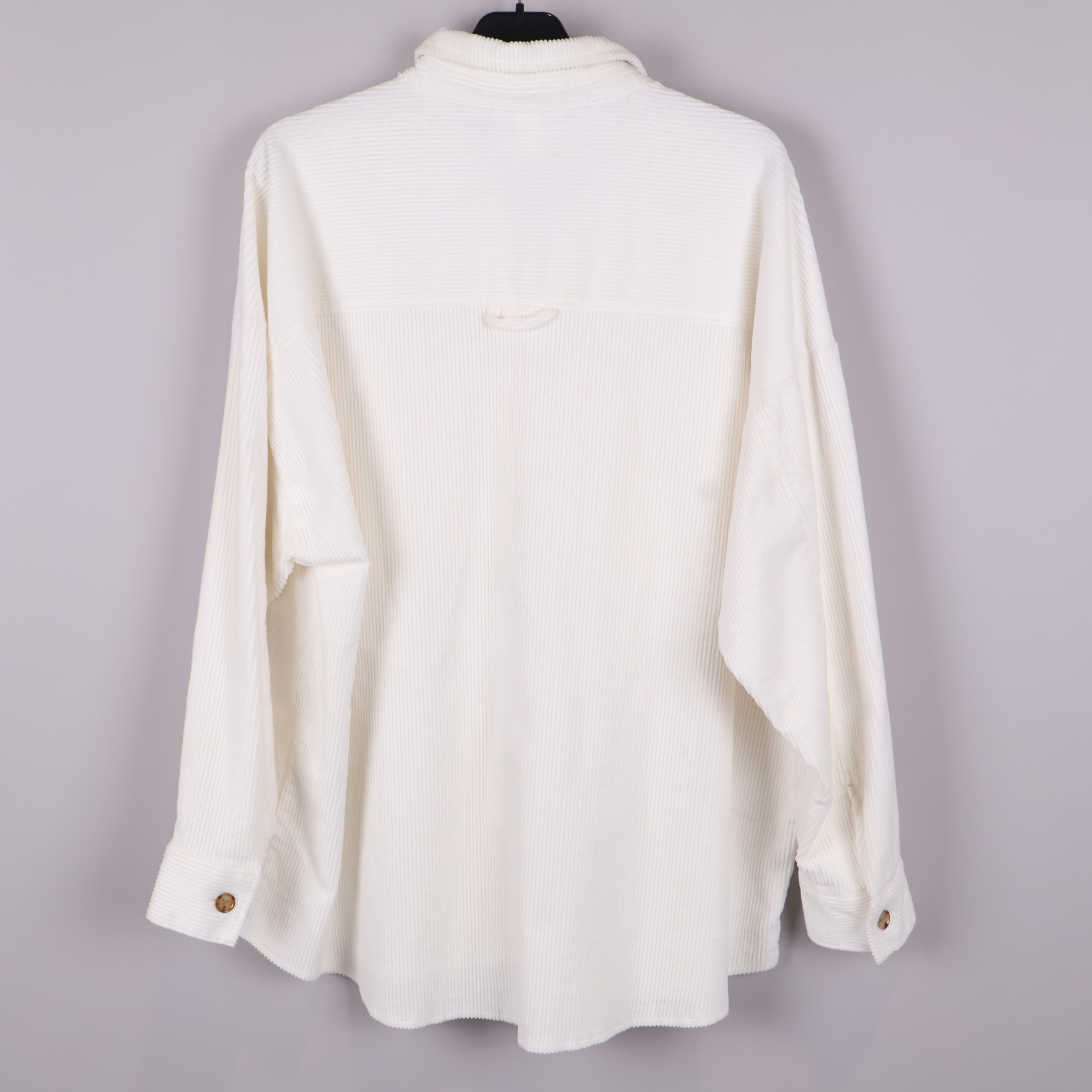 Oversized skjorta i ribbad vit textil med avslappnad passform och klassisk krage. Bröstfickor med lock, raka muddar och kontrasterande knappar ger en stilren look. Materialet känns mjukt mot huden och de breda ribborna ger en modern twist. Passar perfekt för en casual eller dressad stil och gör sig lika bra uppknäppt som stängd.