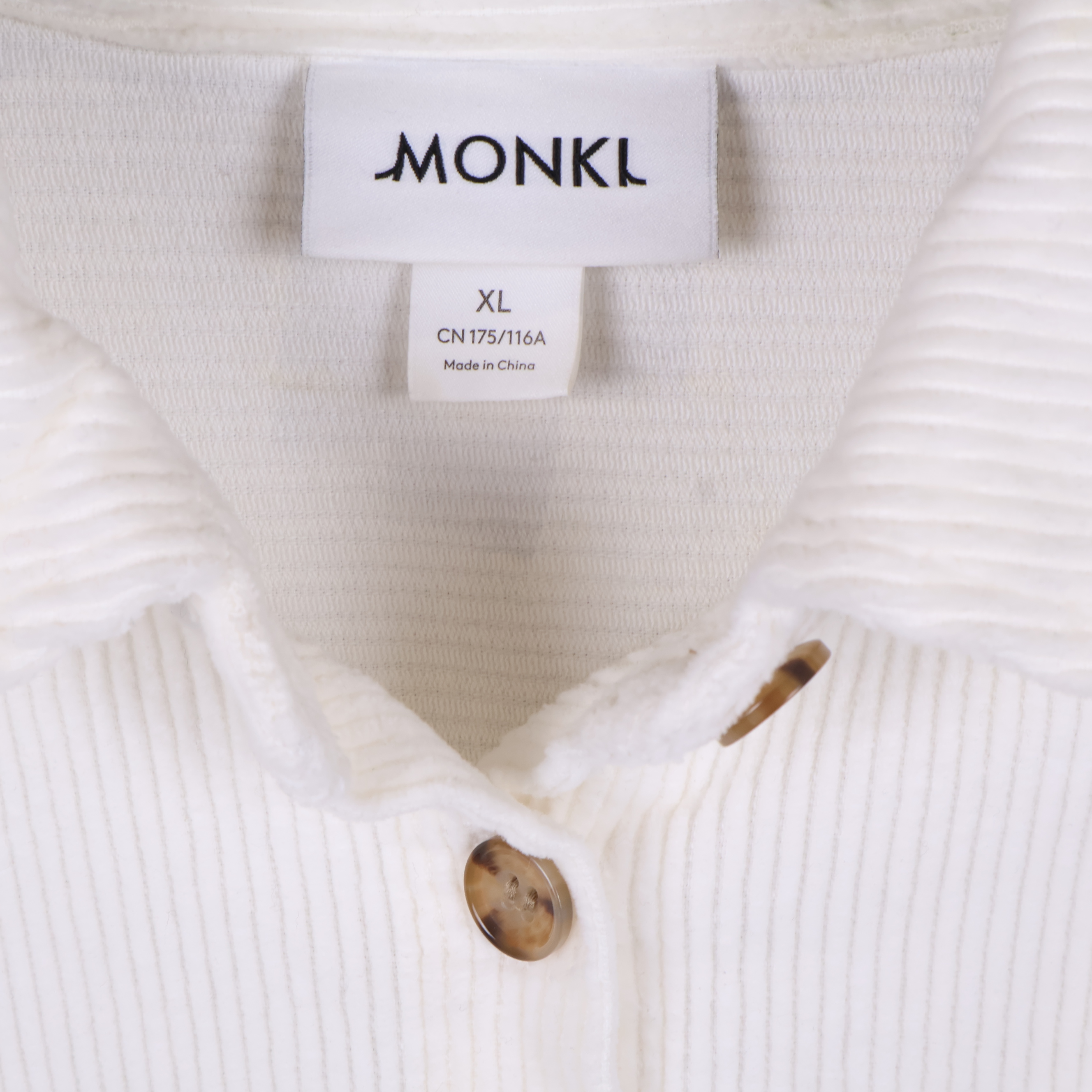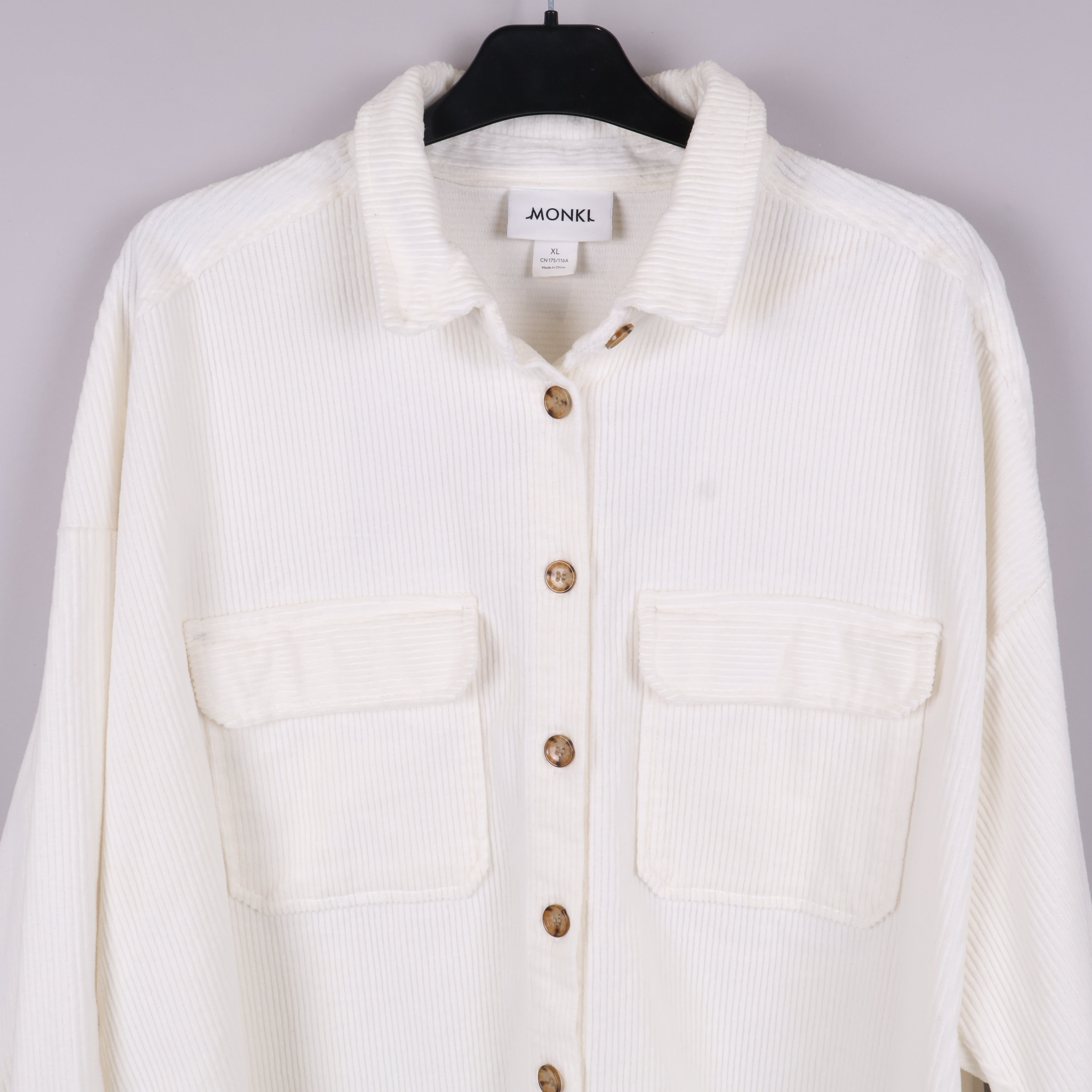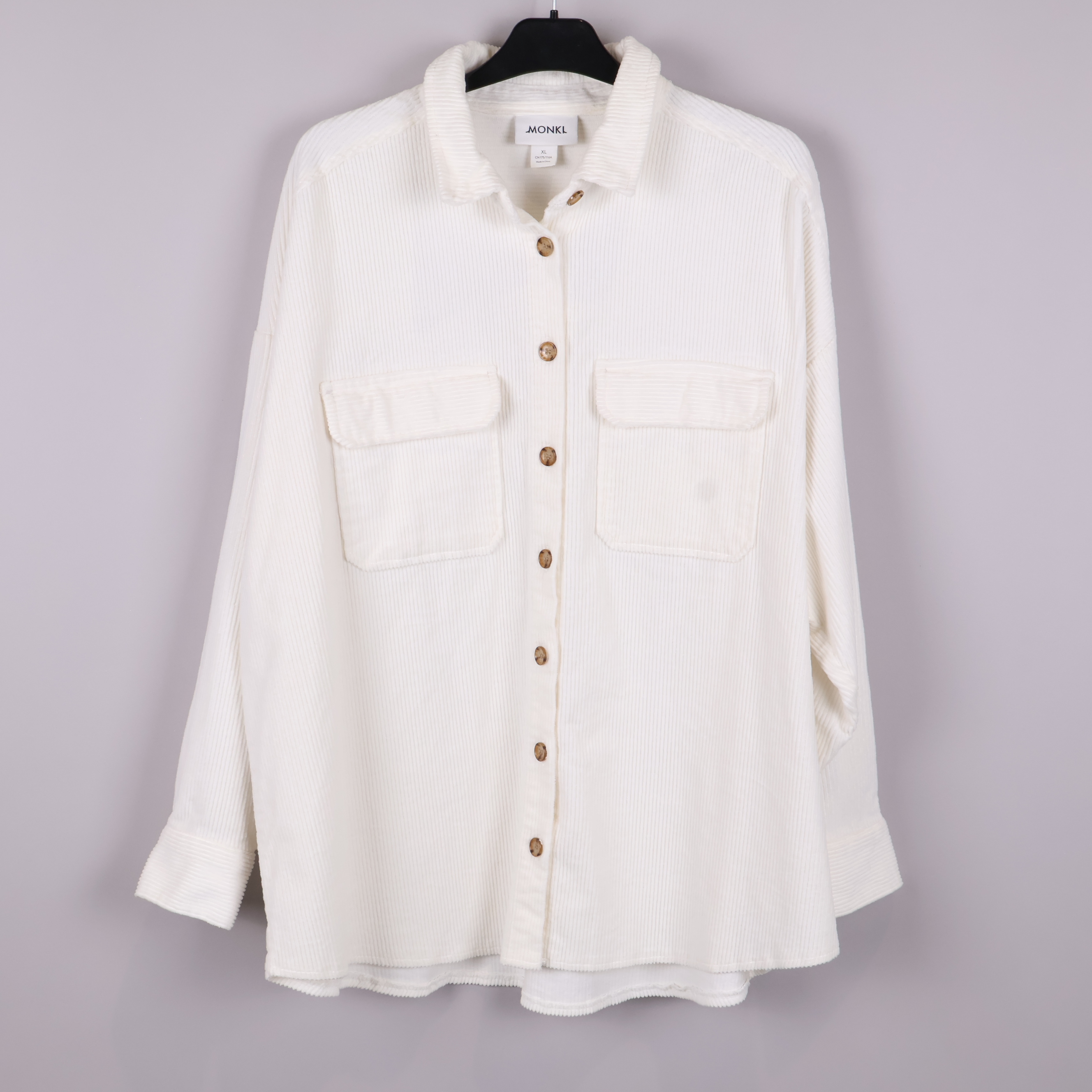 Oversized skjorta i ribbad vit textil med avslappnad passform och klassisk krage. Bröstfickor med lock, raka muddar och kontrasterande knappar ger en stilren look. Materialet känns mjukt mot huden och de breda ribborna ger en modern twist. Passar perfekt för en casual eller dressad stil och gör sig lika bra uppknäppt som stängd.