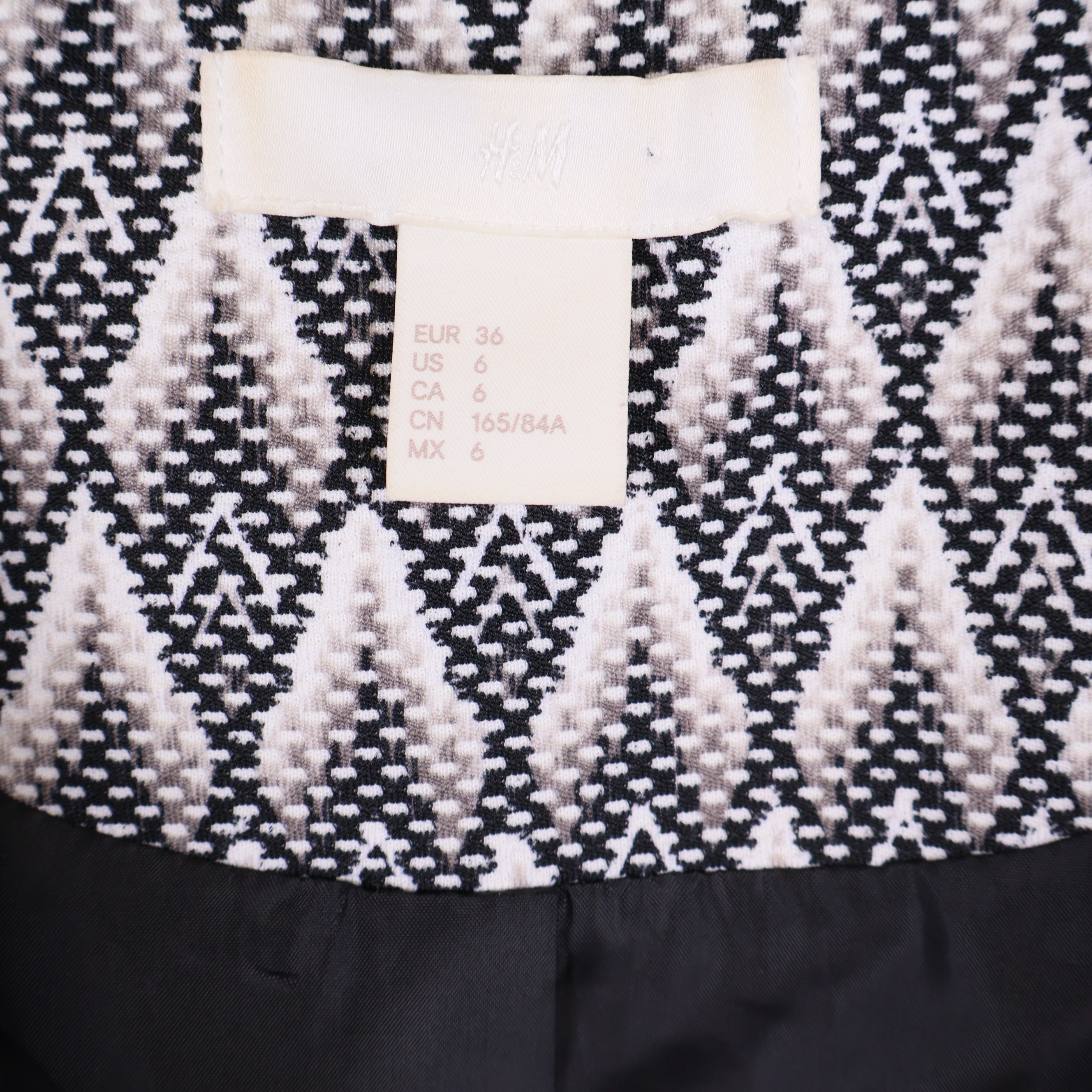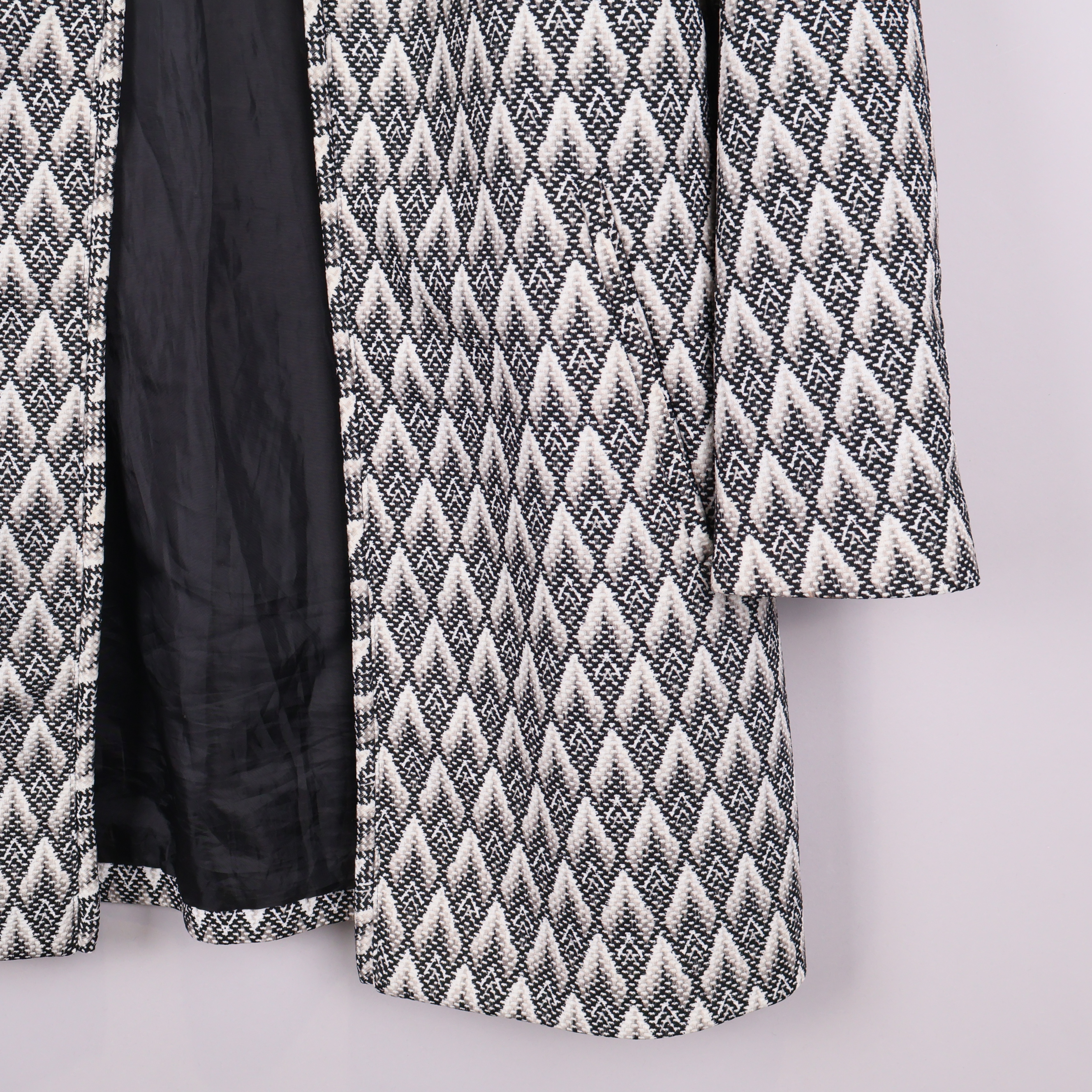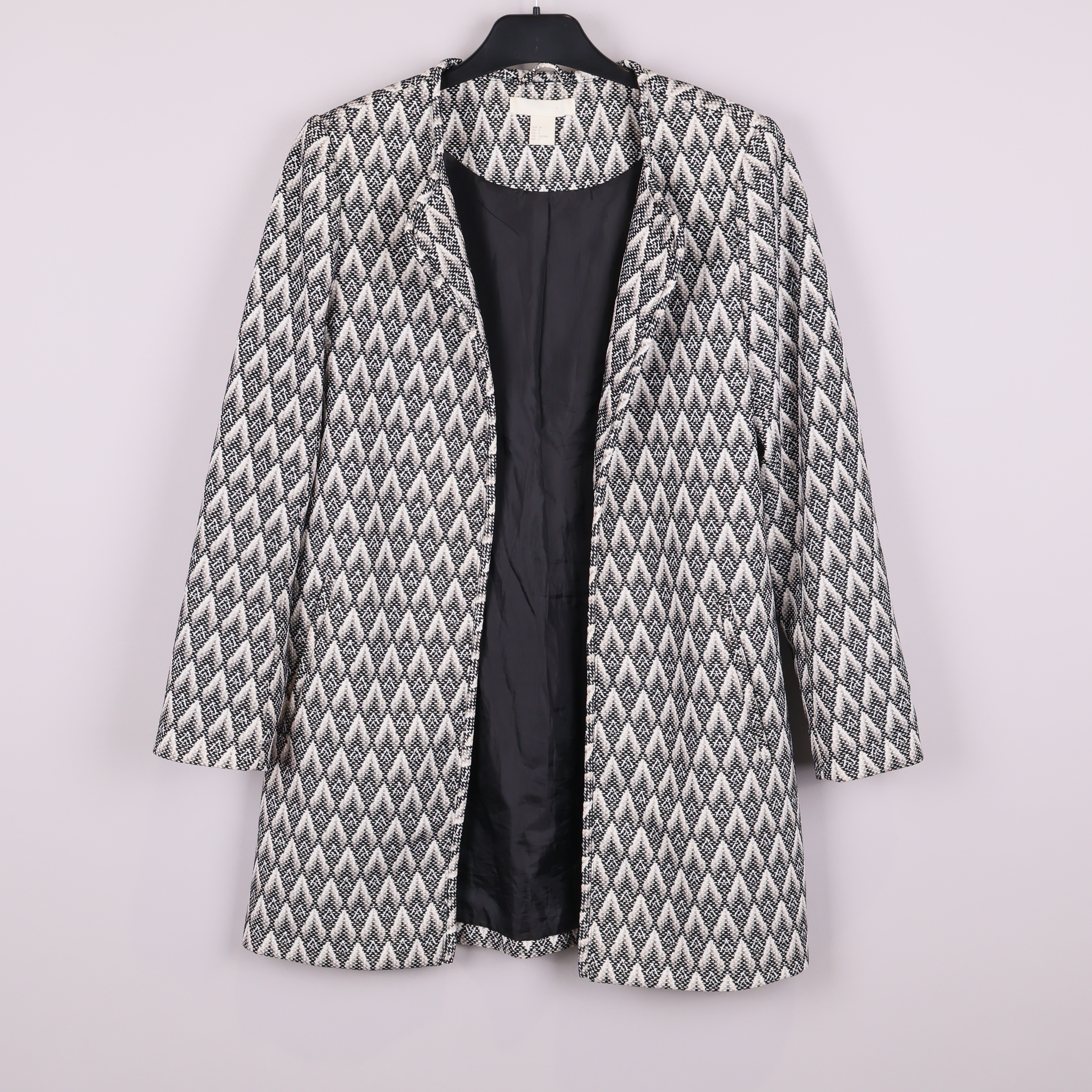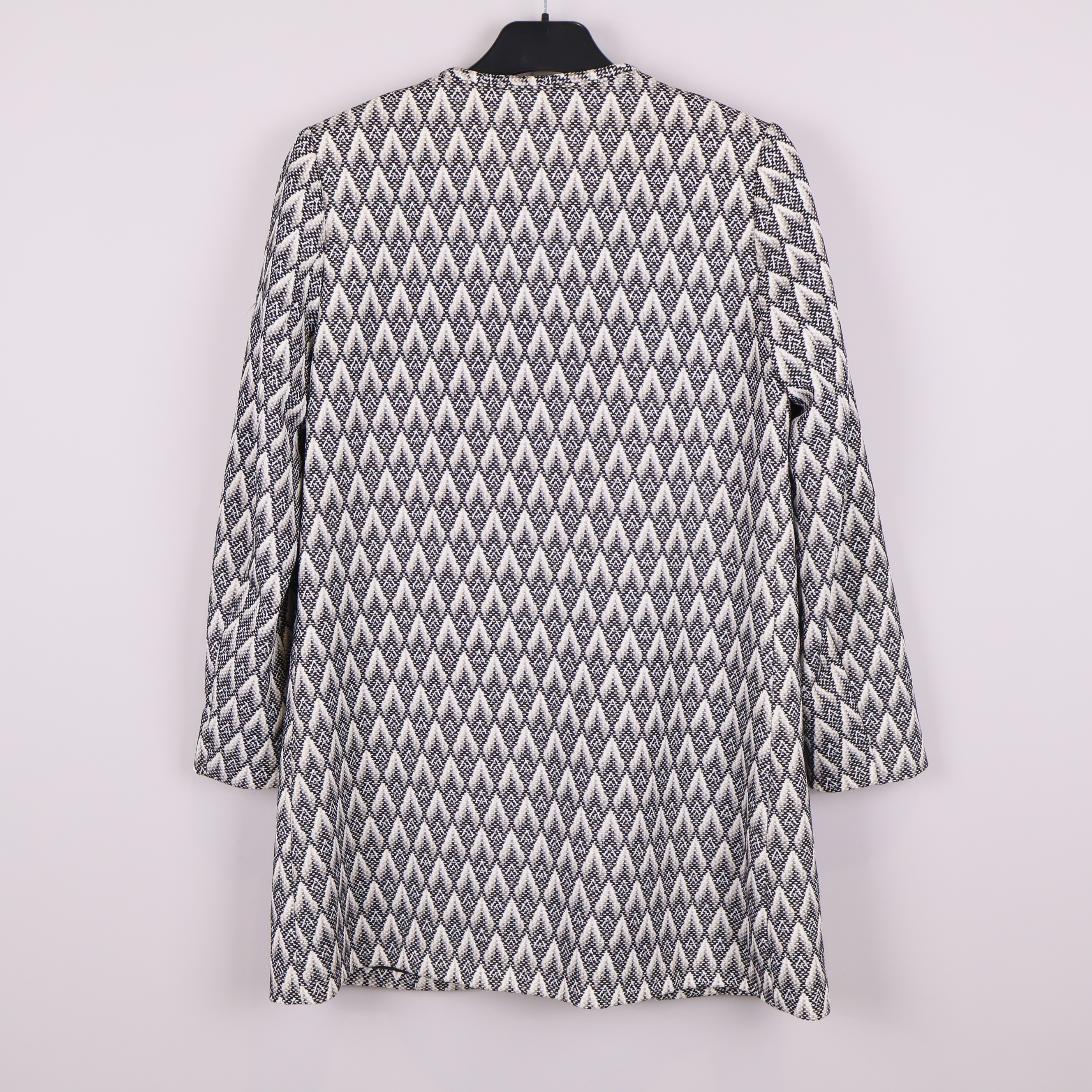 Modern jacka med grafiskt svartvitt mönster och stilren design. Jackan har rak passform med helfodrad insida för en bekväm känsla. Mönstret ger en trendig och uttrycksfull look som sticker ut, perfekt för dig som gillar samtida stil. Stängningen är öppen framtill utan knappar och materialet känns mjukt men ändå struktur-givande.