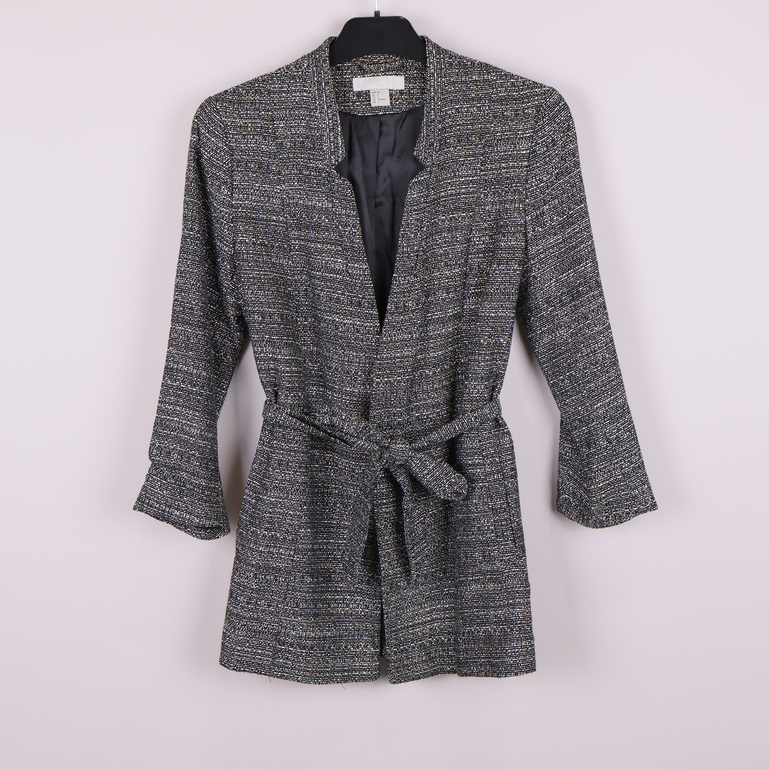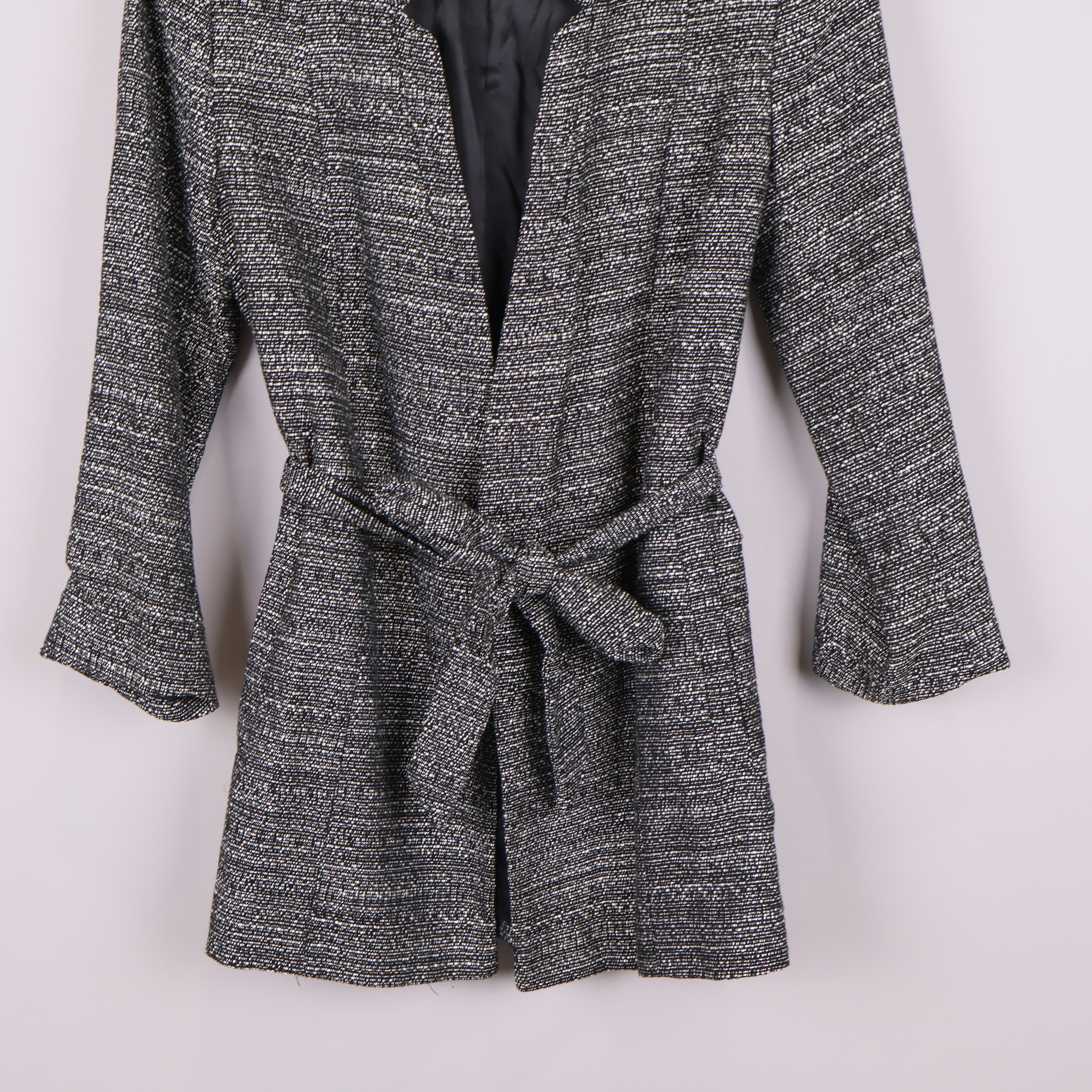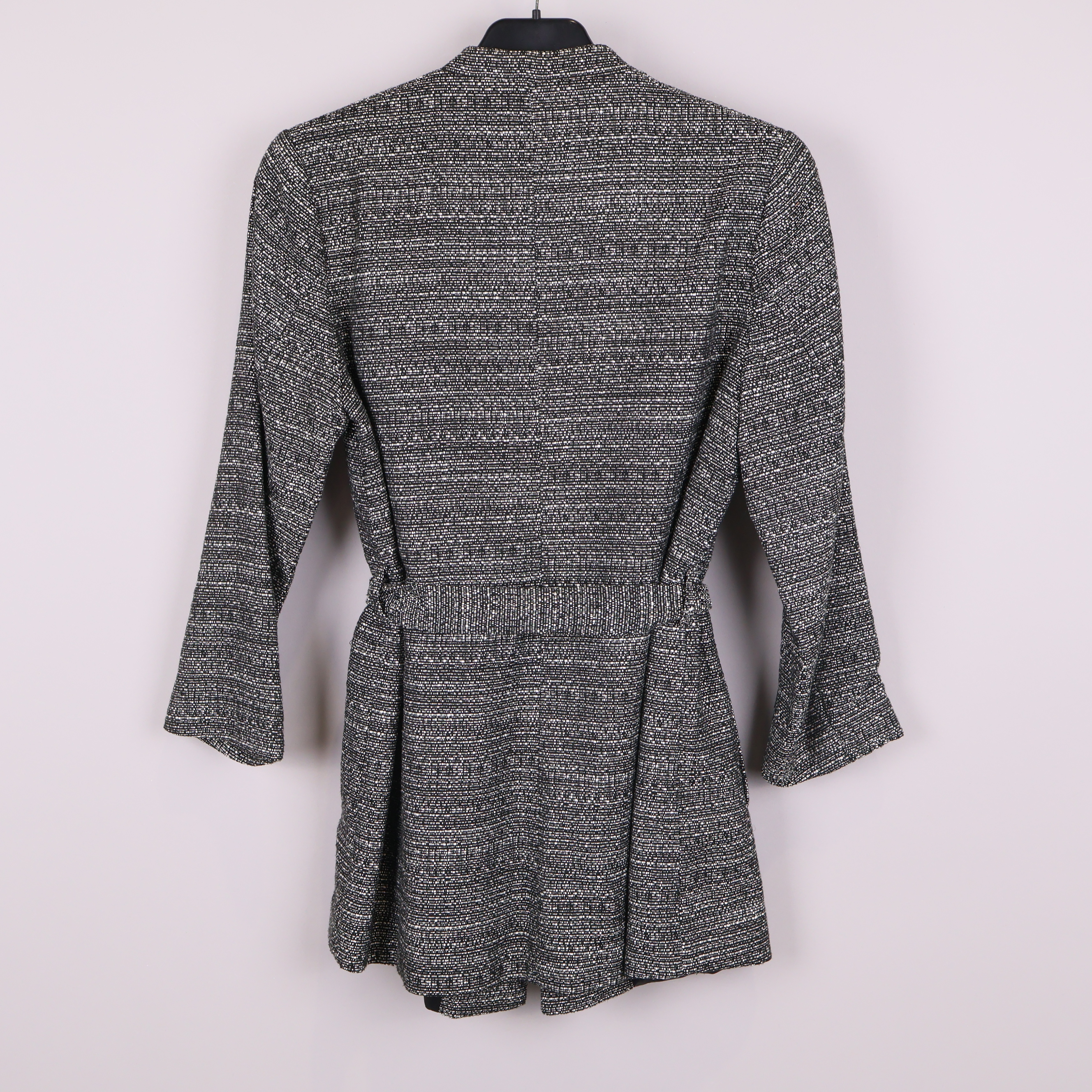 Stilren kavaj med vävt svartvitt mönster och trekvartsärmar, perfekt för en modern och avslappnad look. Modellen har ett knytskärp i midjan som framhäver passformen samt en lätt krage och hel baksida med diskret struktur.
