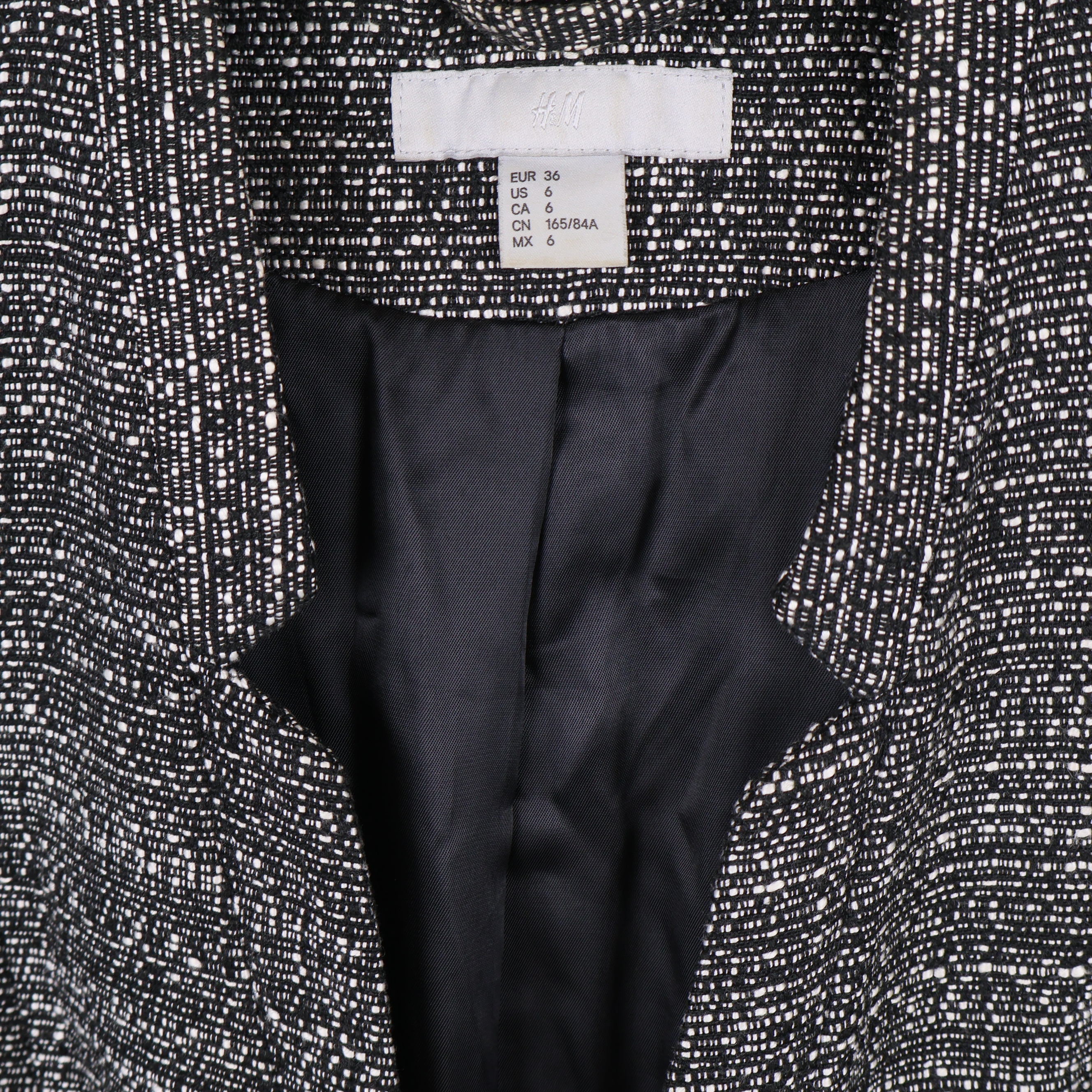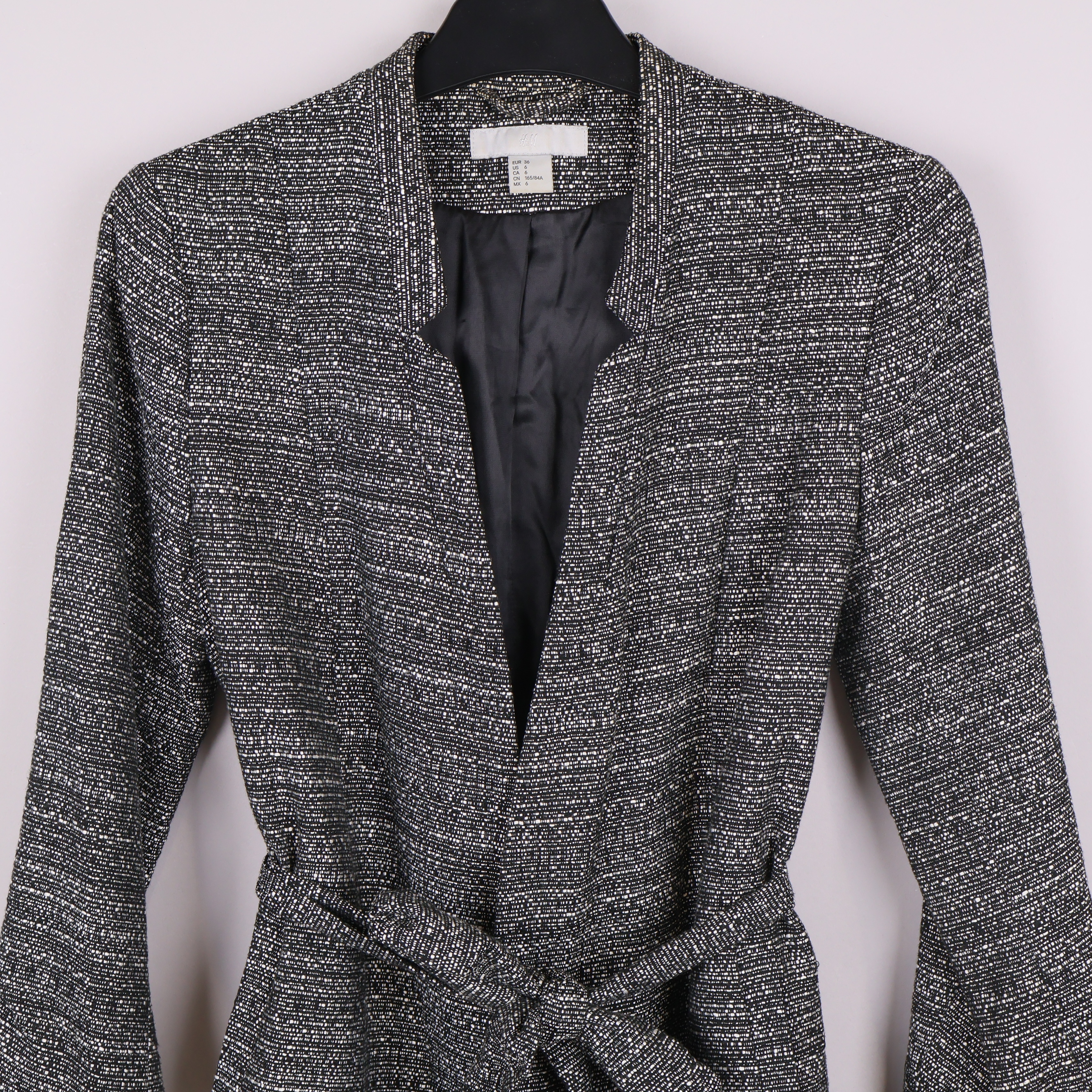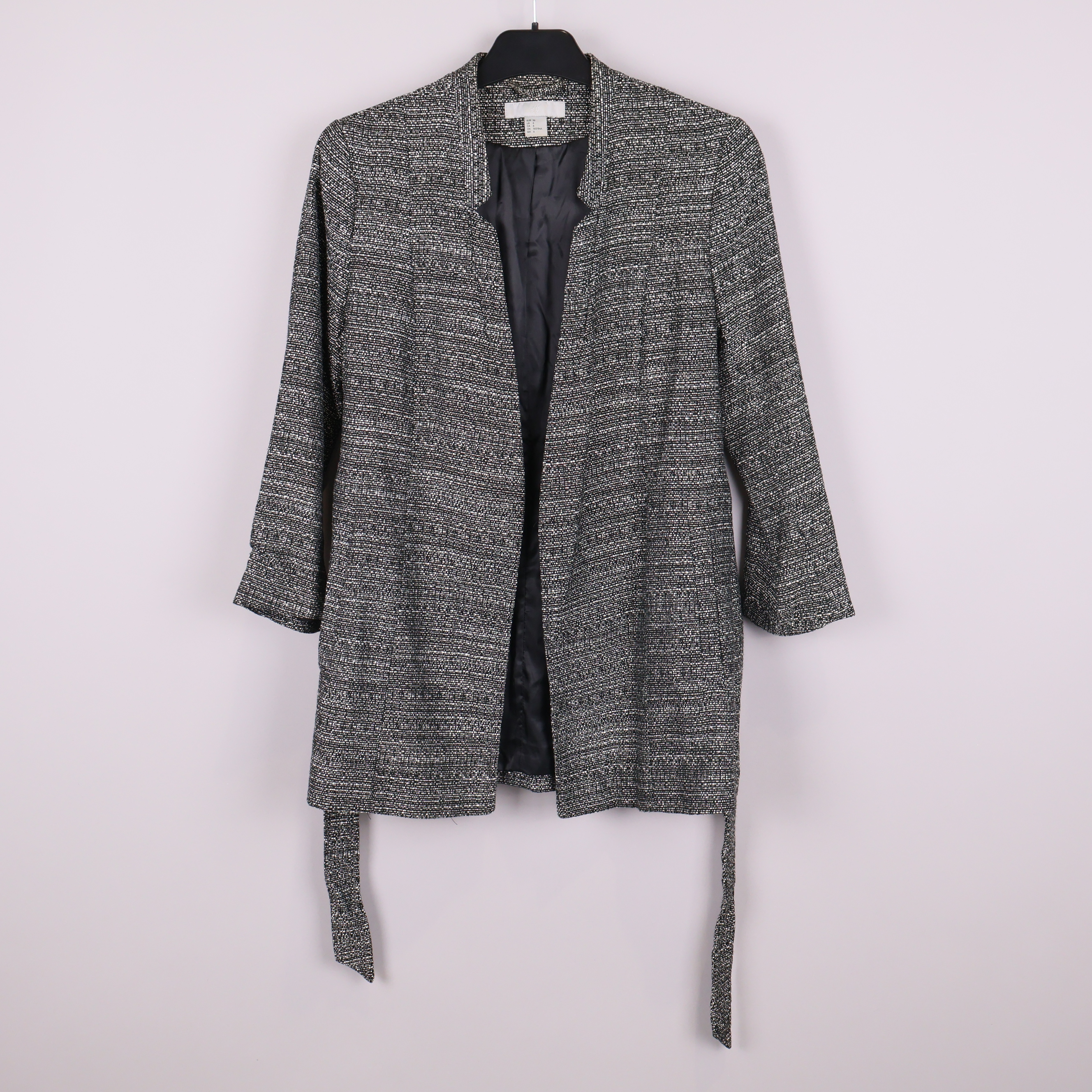 Stilren kavaj med vävt svartvitt mönster och trekvartsärmar, perfekt för en modern och avslappnad look. Modellen har ett knytskärp i midjan som framhäver passformen samt en lätt krage och hel baksida med diskret struktur.