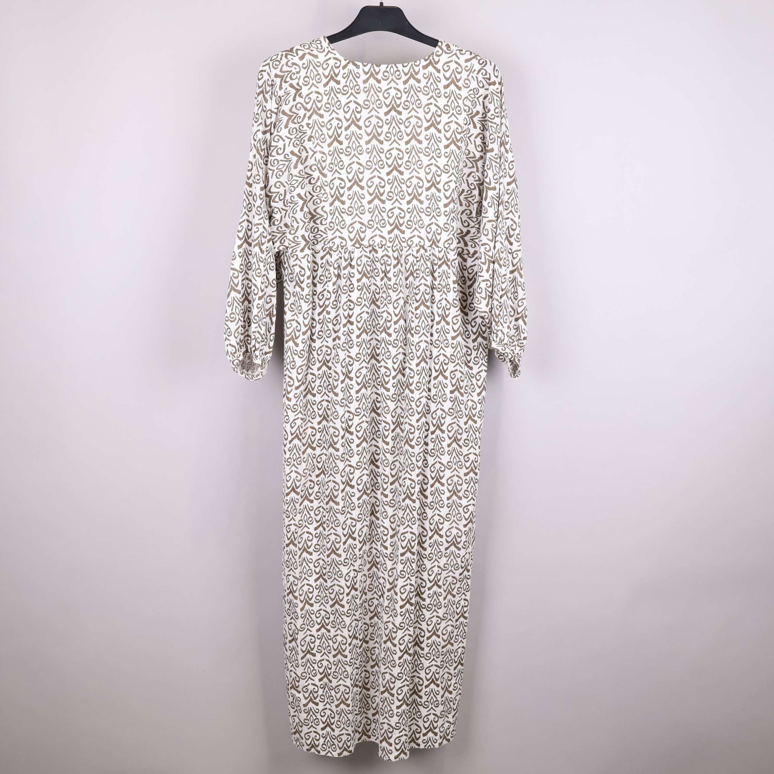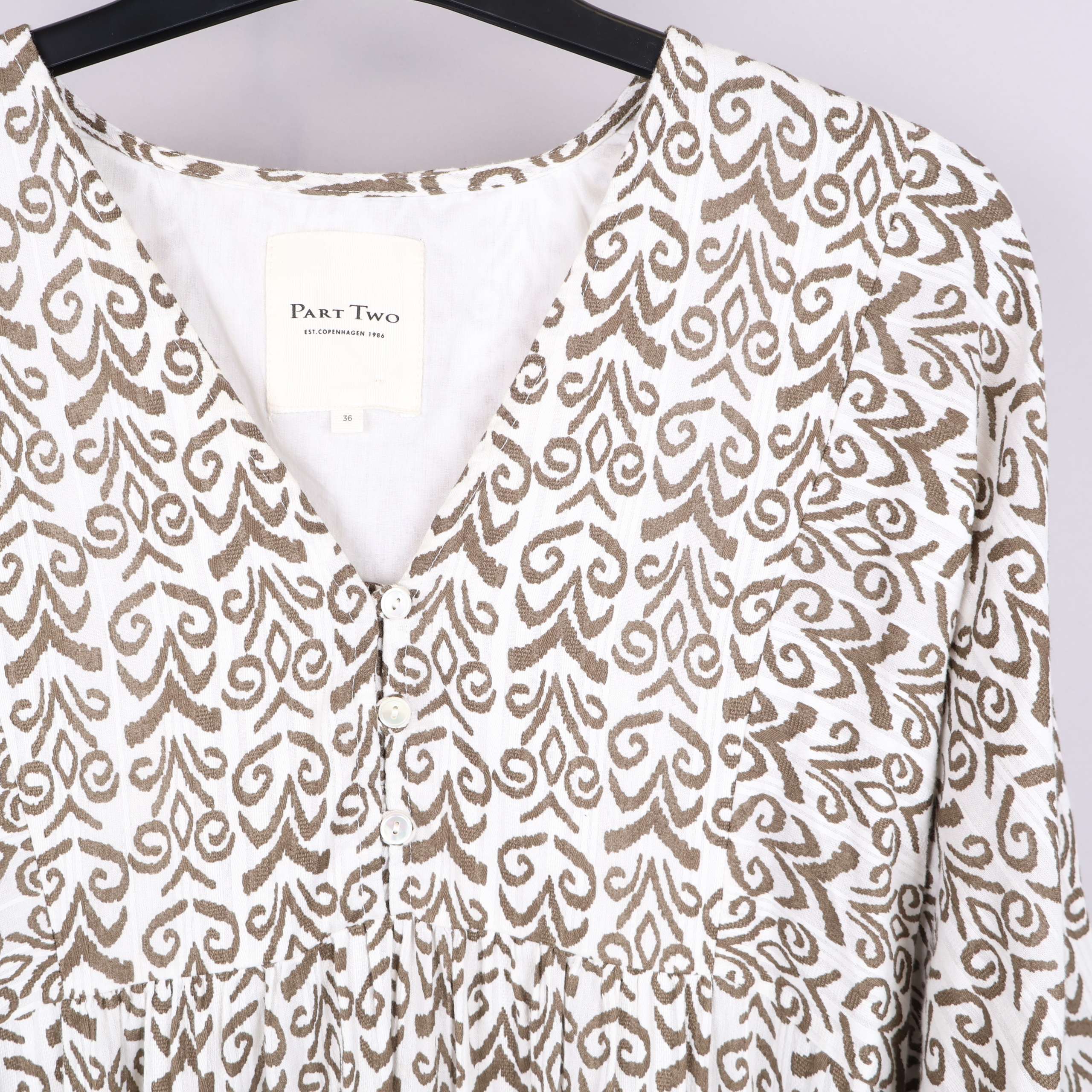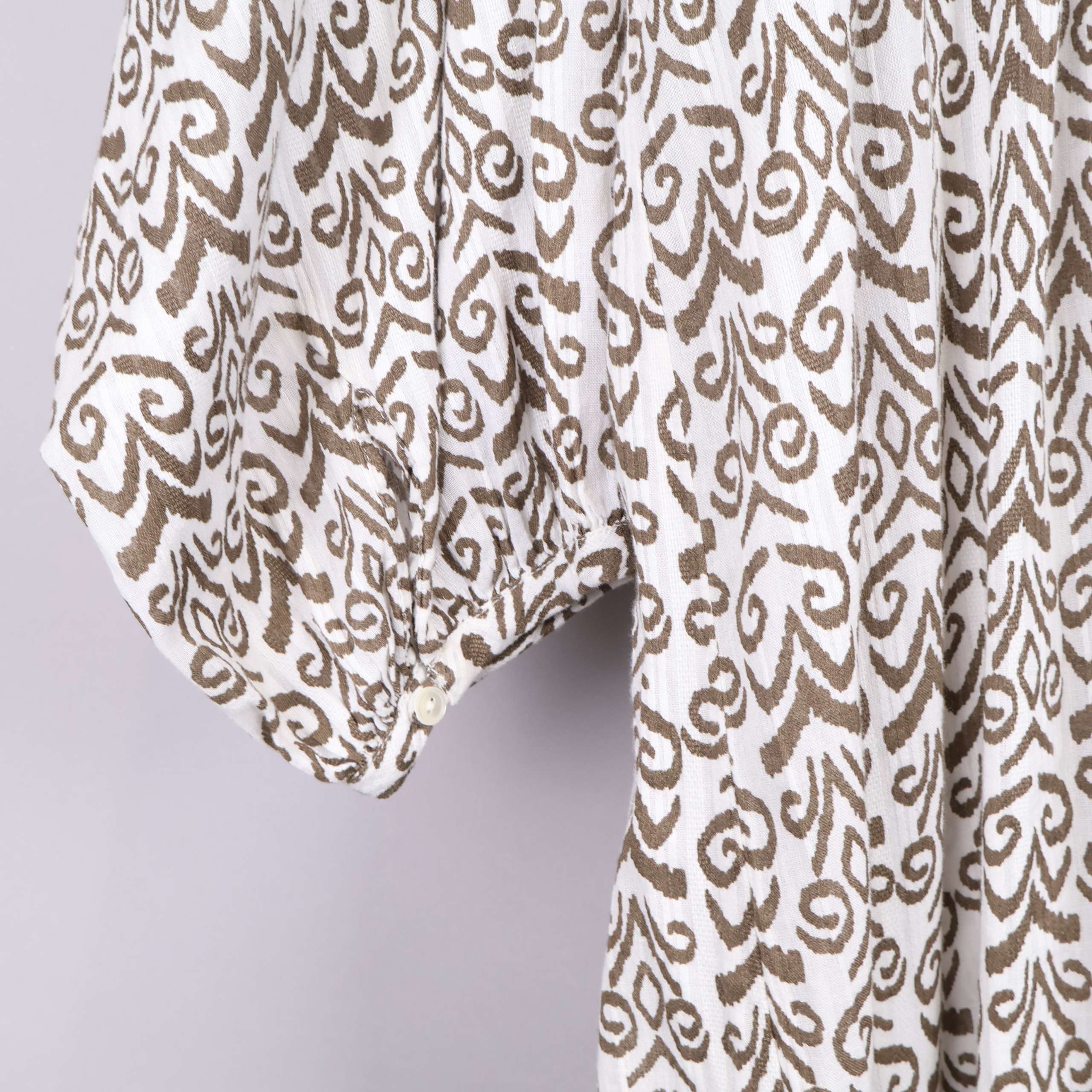 Denna eleganta klänning har ett unikt brunt grafikmönster på en vit bakgrund som ger en stilren look. V-ringningen och de diskreta knapparna ger ett feminint uttryck medan de vida ärmarna bidrar till en avslappnad stil. Tillverkad av mjuk, 100% bomull gör den både bekväm och andas väl. Perfekt för både vardag och festliga tillfällen.