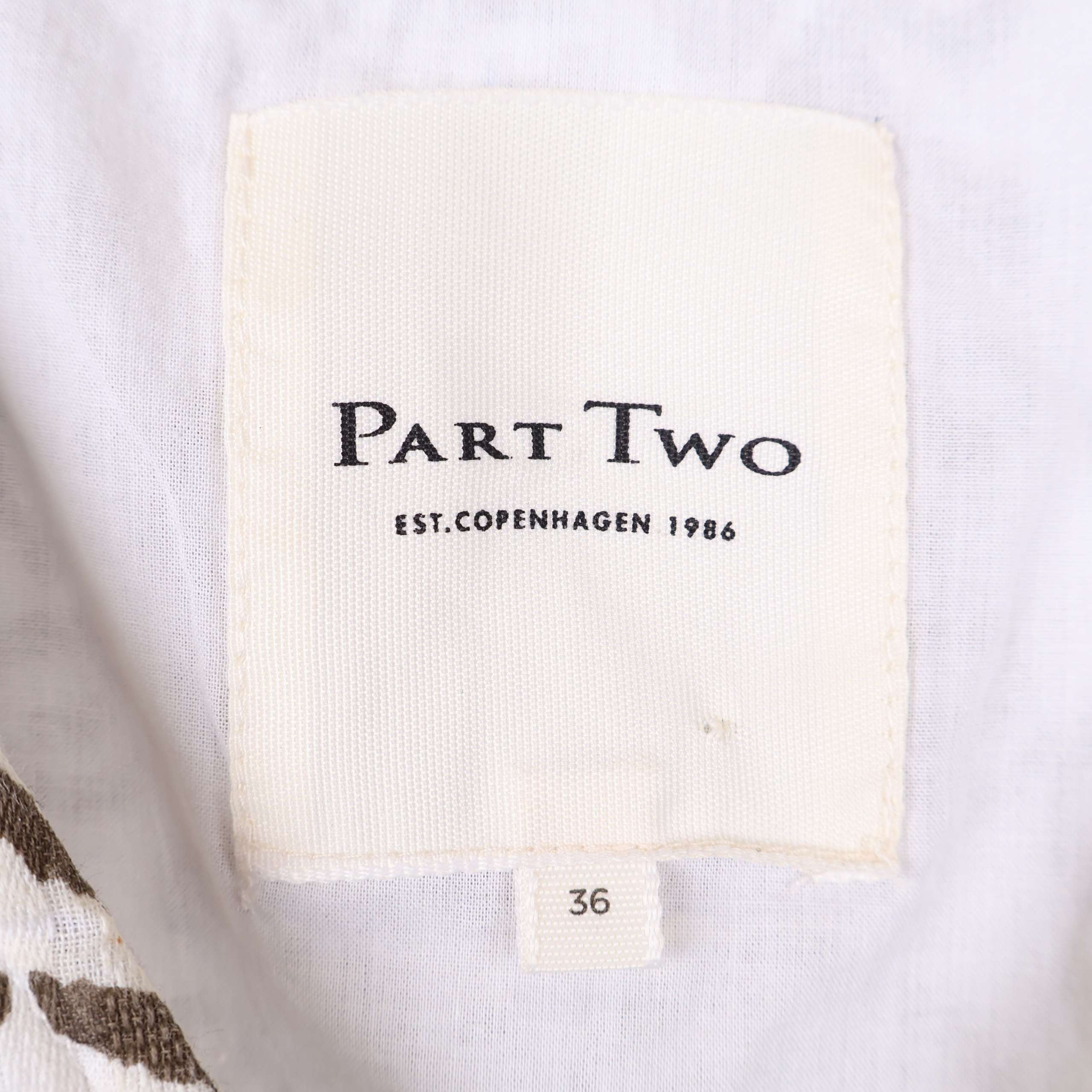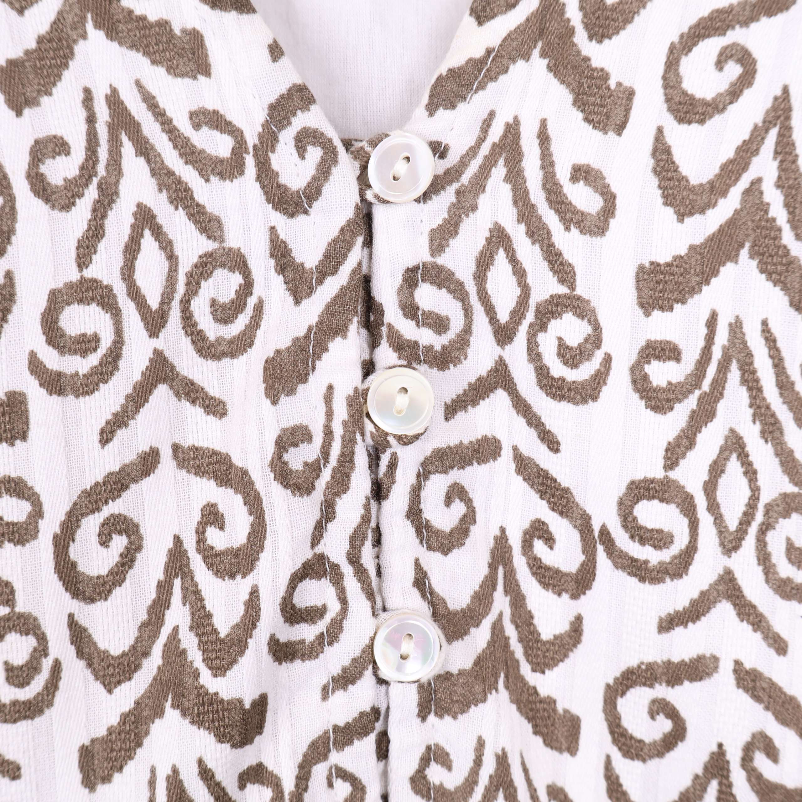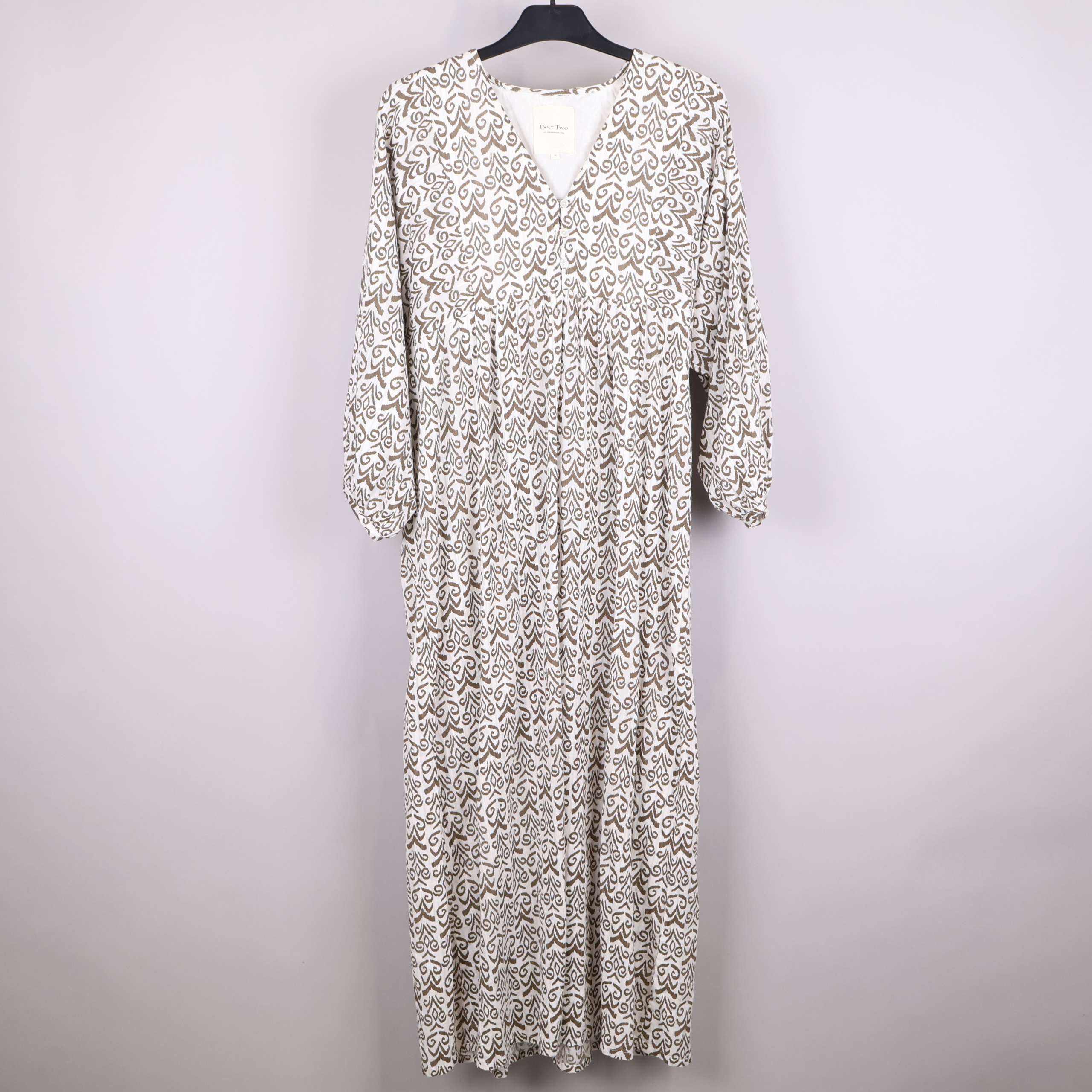 Denna eleganta klänning har ett unikt brunt grafikmönster på en vit bakgrund som ger en stilren look. V-ringningen och de diskreta knapparna ger ett feminint uttryck medan de vida ärmarna bidrar till en avslappnad stil. Tillverkad av mjuk, 100% bomull gör den både bekväm och andas väl. Perfekt för både vardag och festliga tillfällen.
