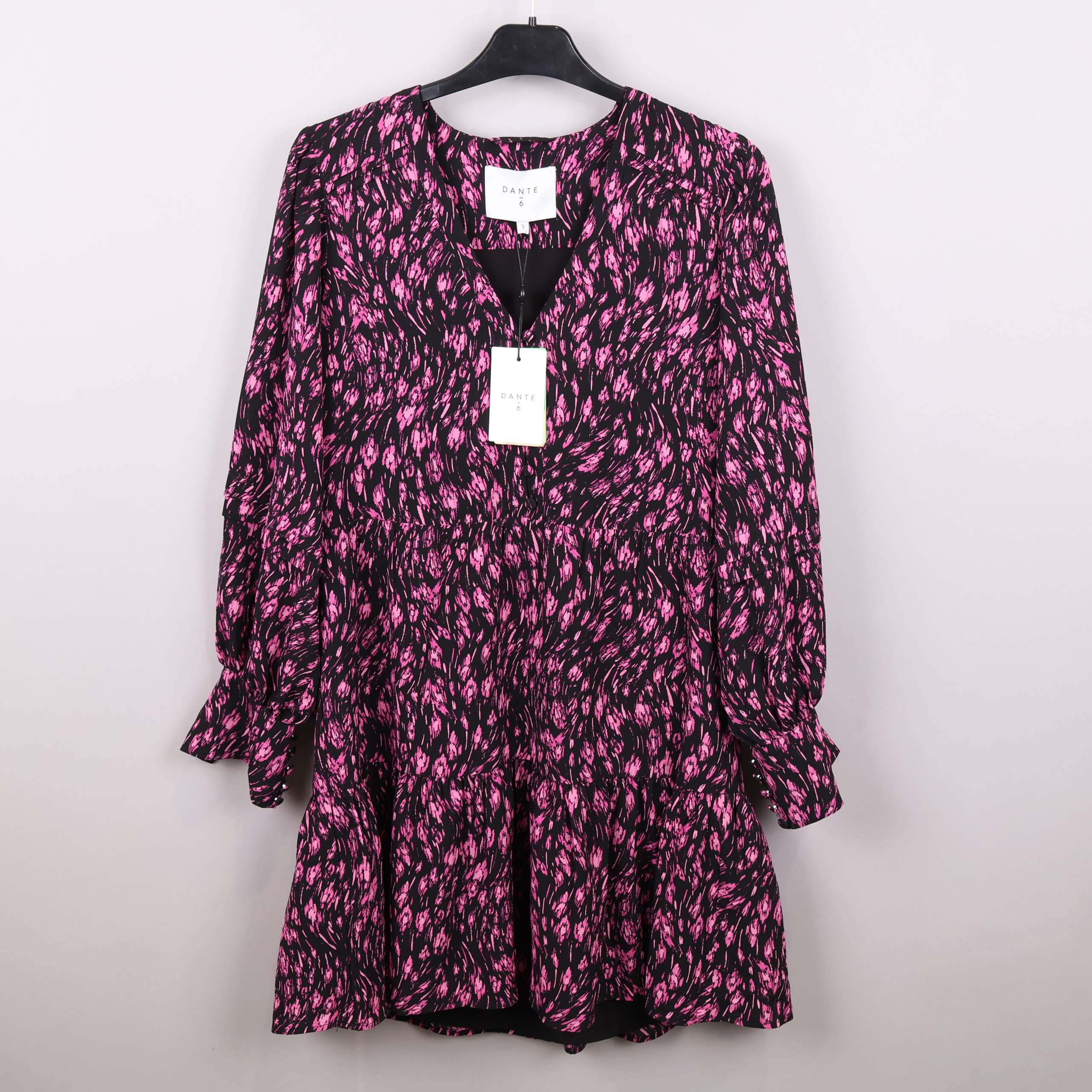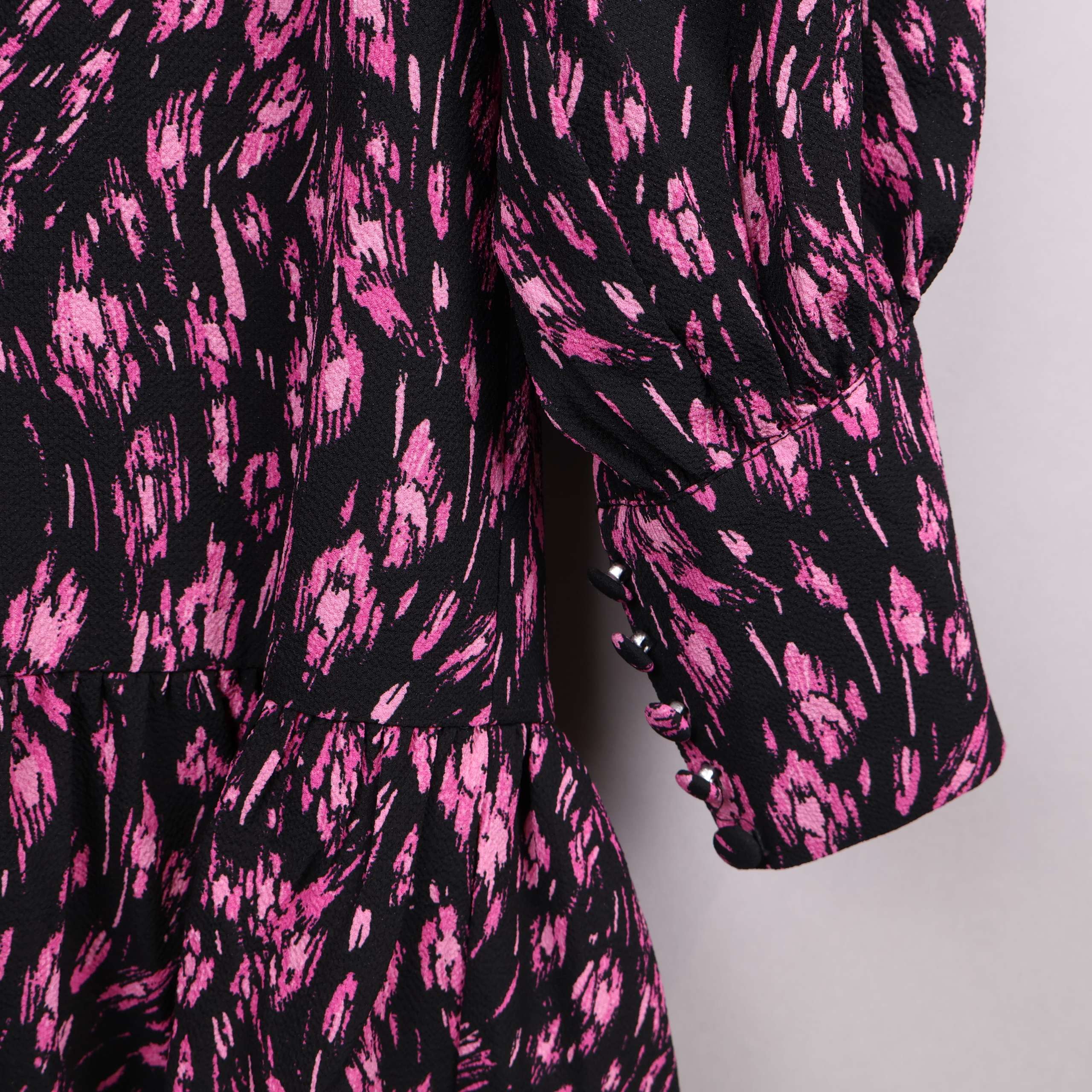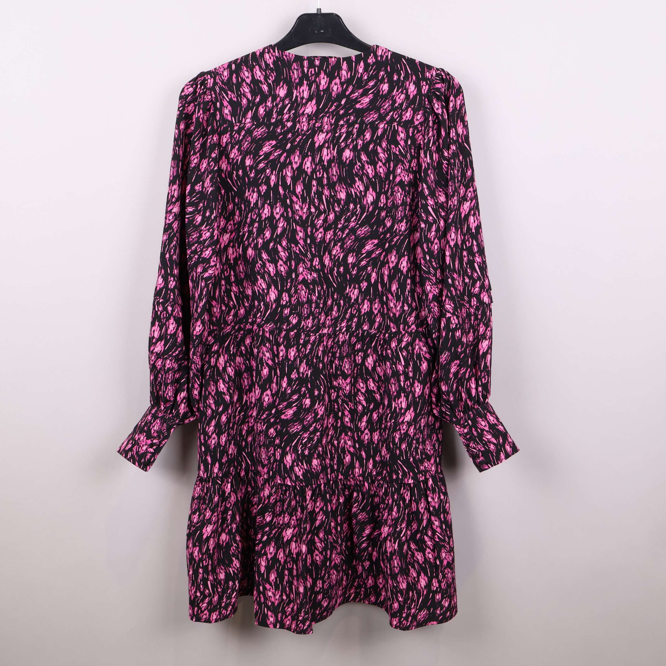 Elegant klänning med unikt mönster i rosa och svart. V-ringad design med dekorativa knappar framtill. Volangdetaljer i fåll och långa ärmar med manschetter.