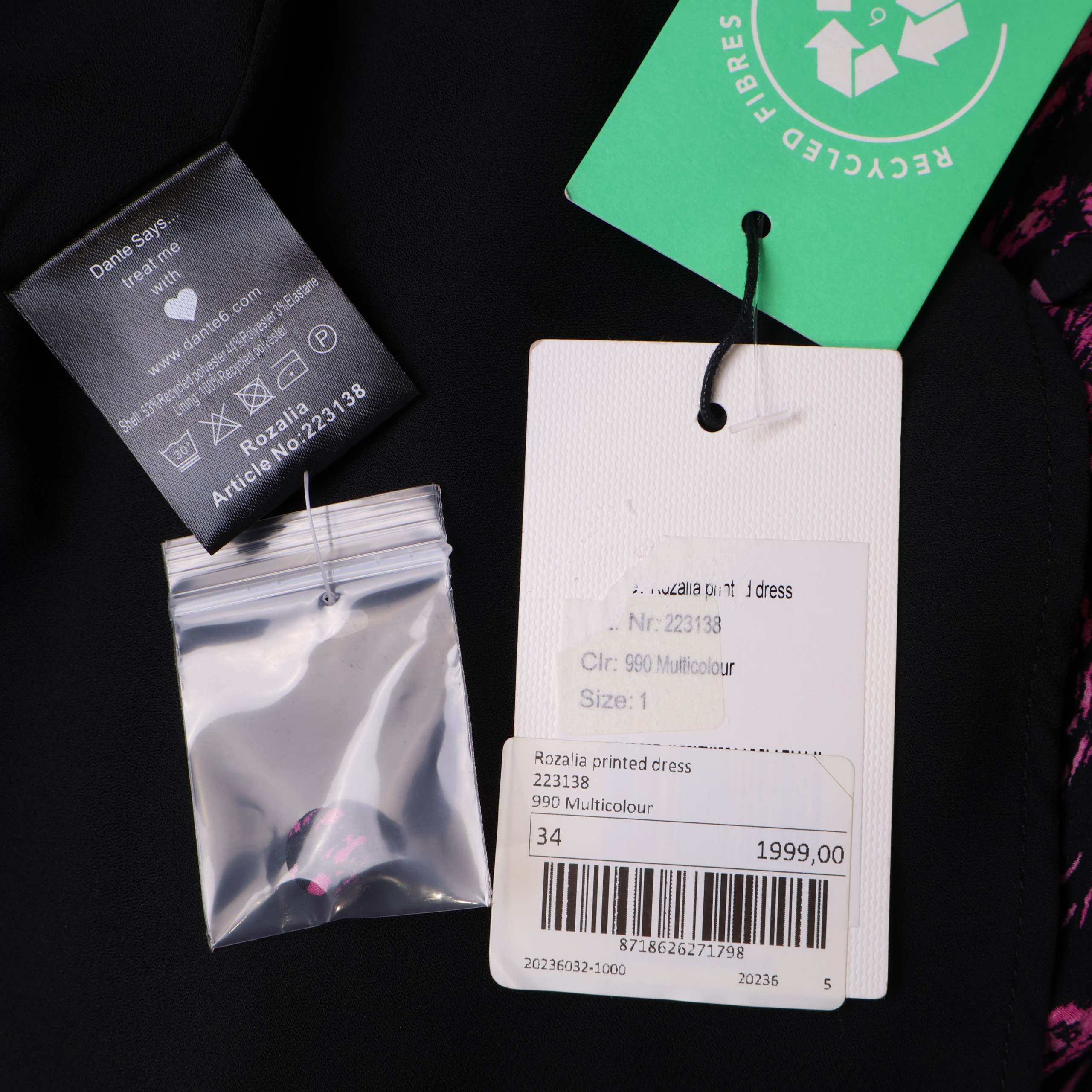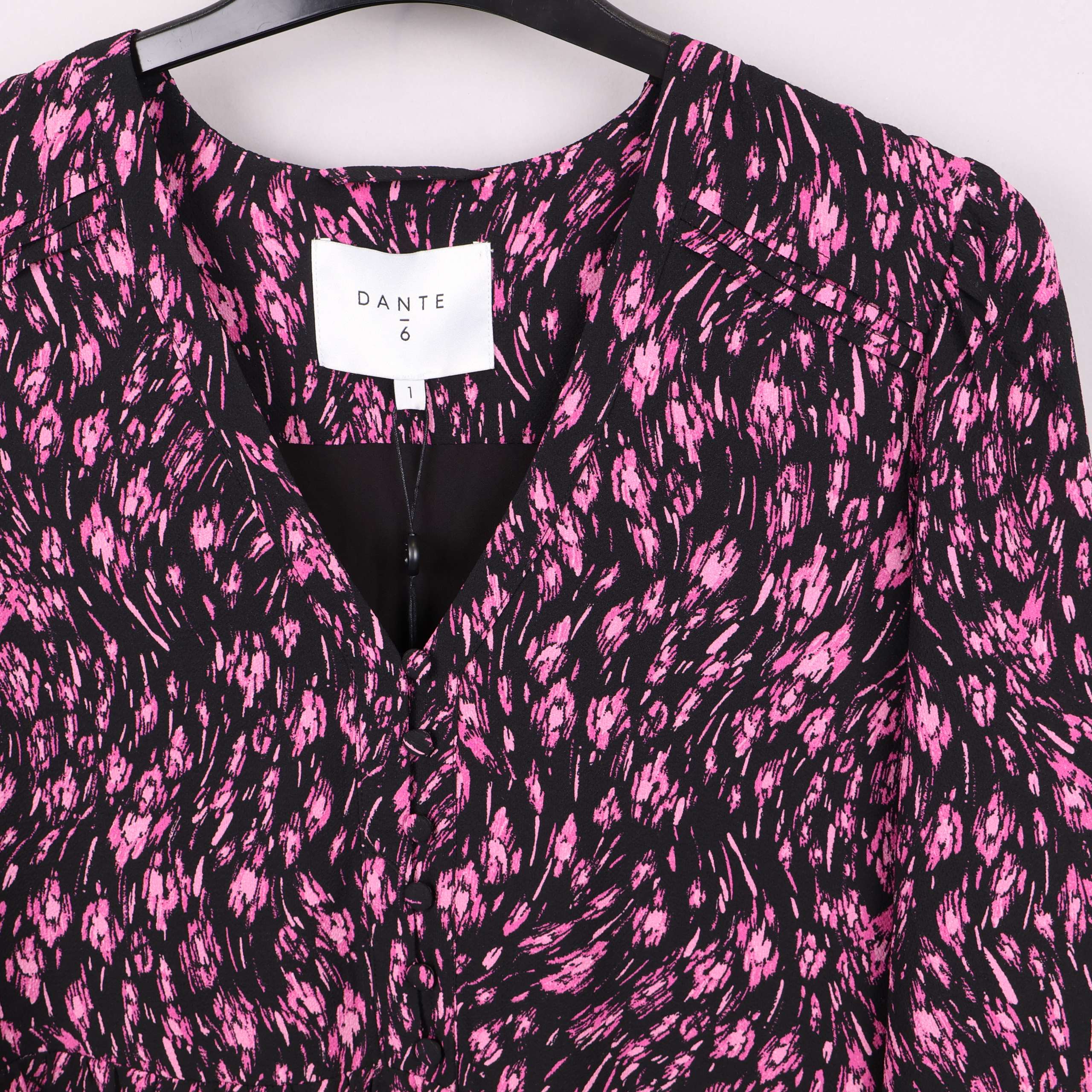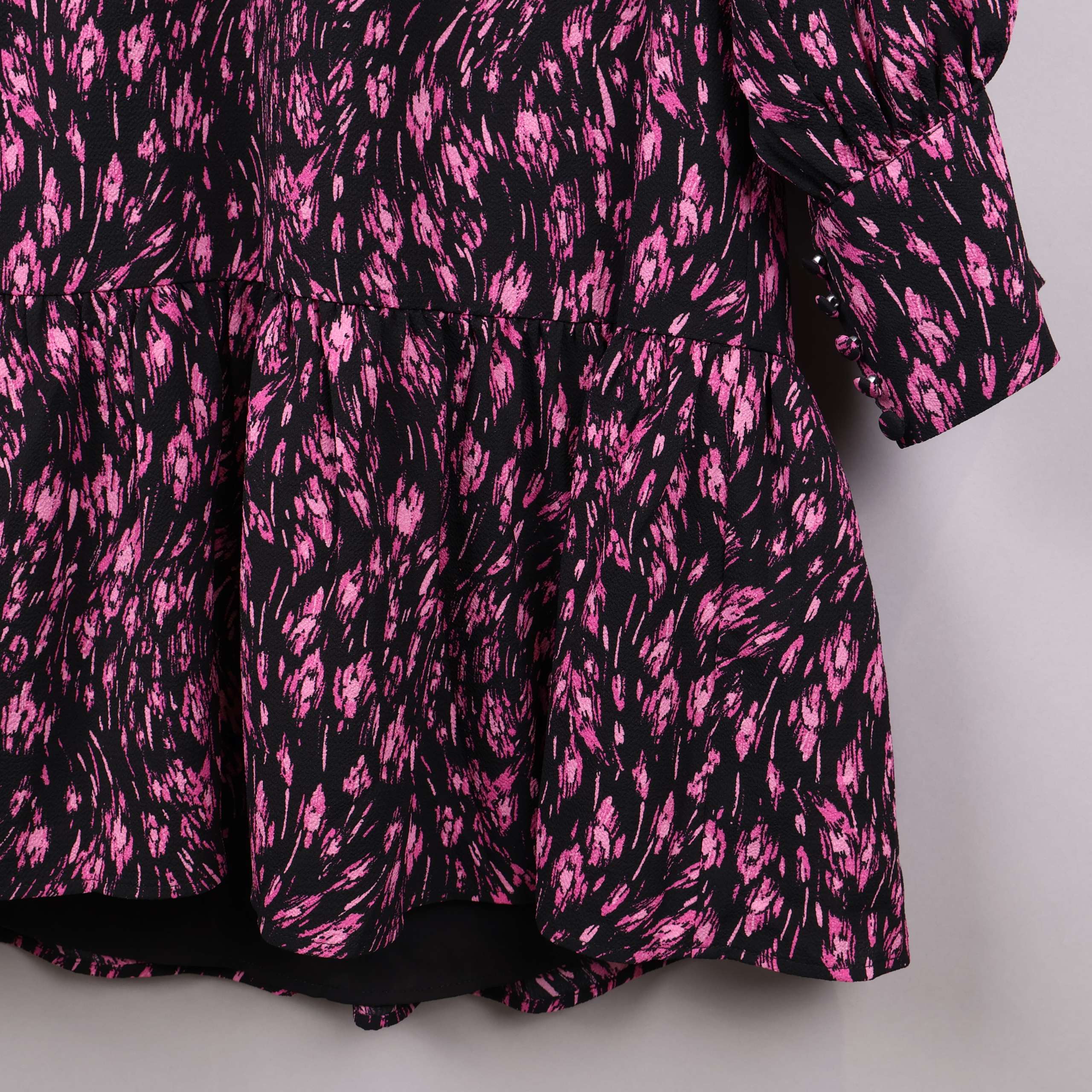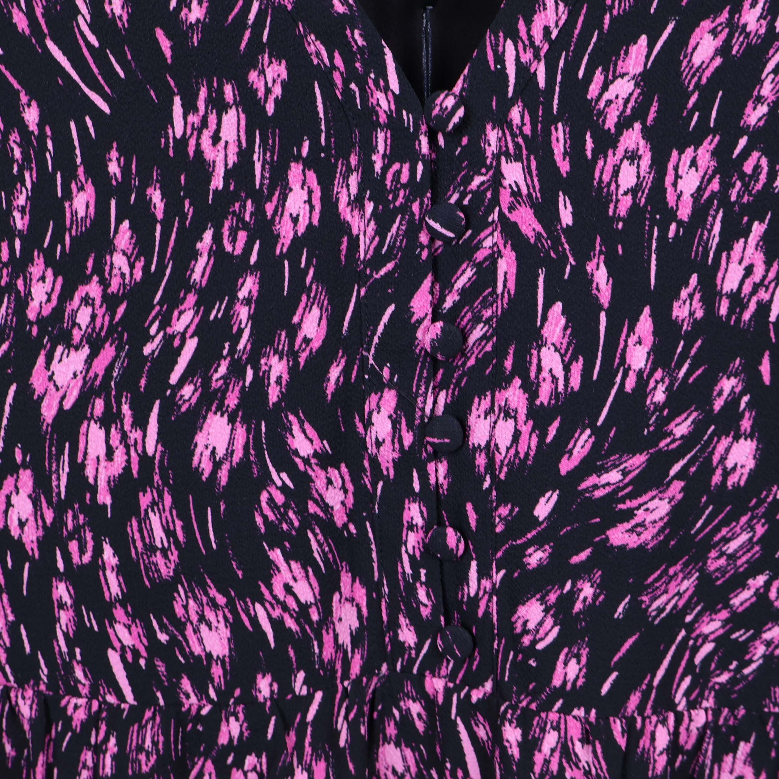 Elegant klänning med unikt mönster i rosa och svart. V-ringad design med dekorativa knappar framtill. Volangdetaljer i fåll och långa ärmar med manschetter.