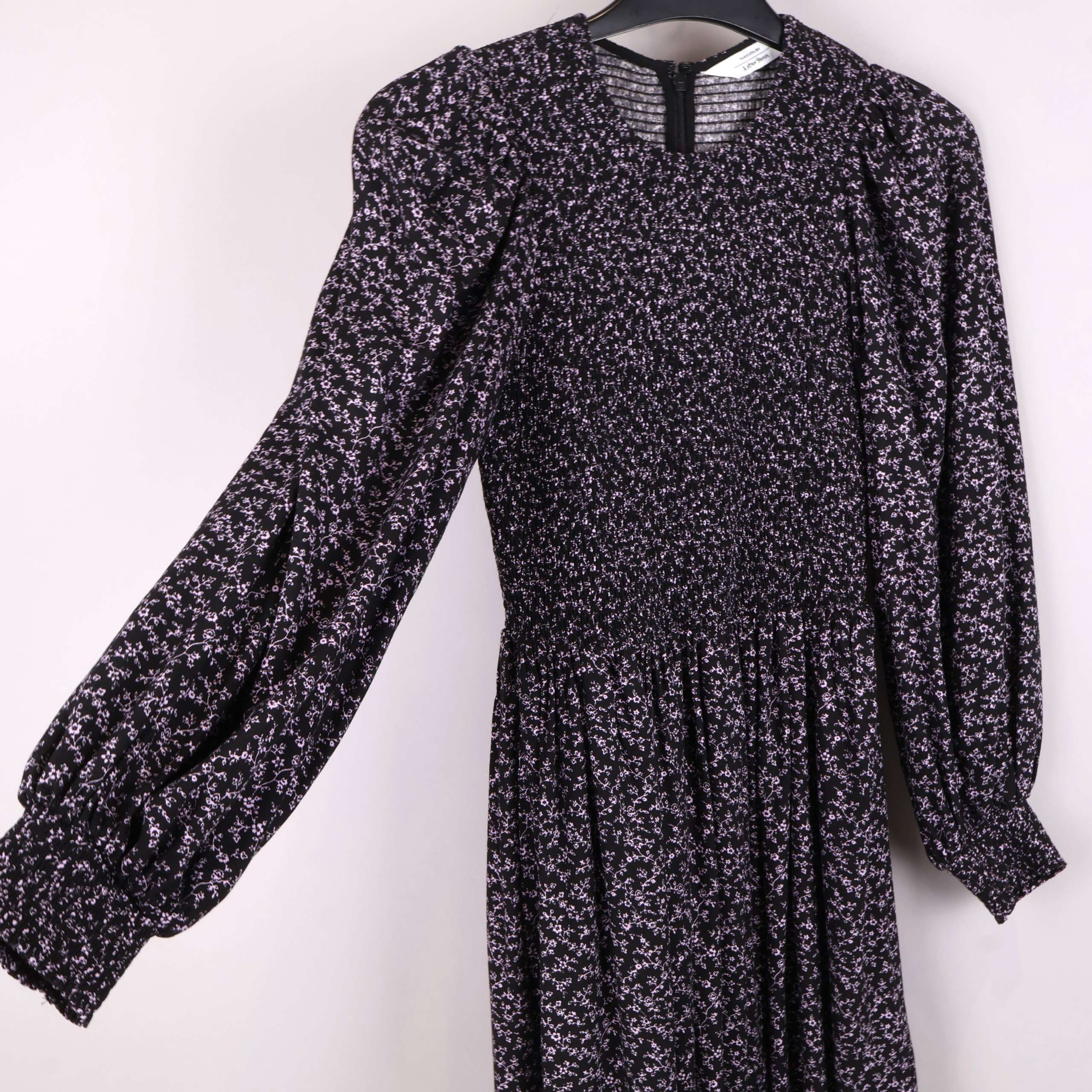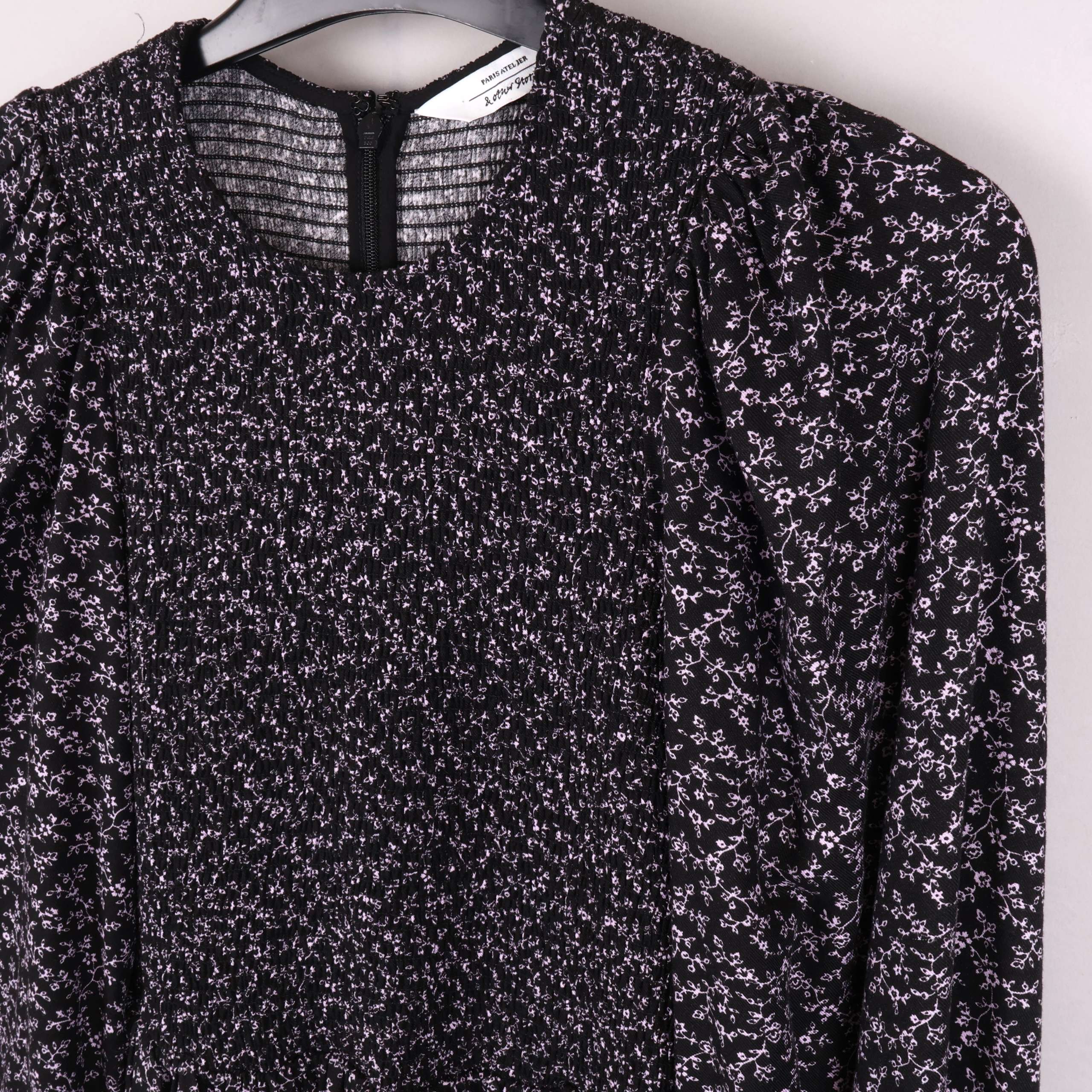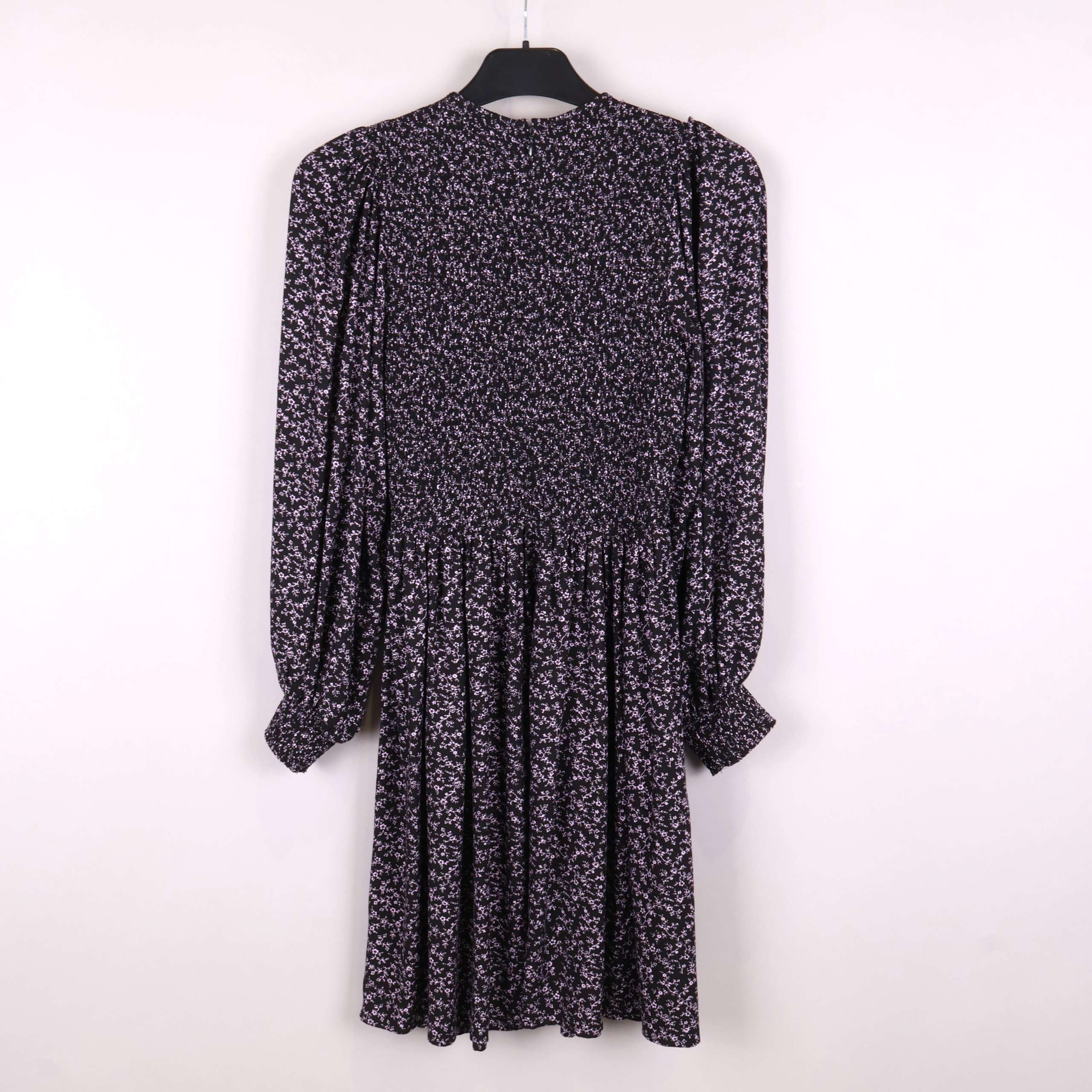 Elegant klänning med ett subtilt blommigt mönster i svart och vitt. Puffiga långa ärmar och resår i midjan med mjukt fall.