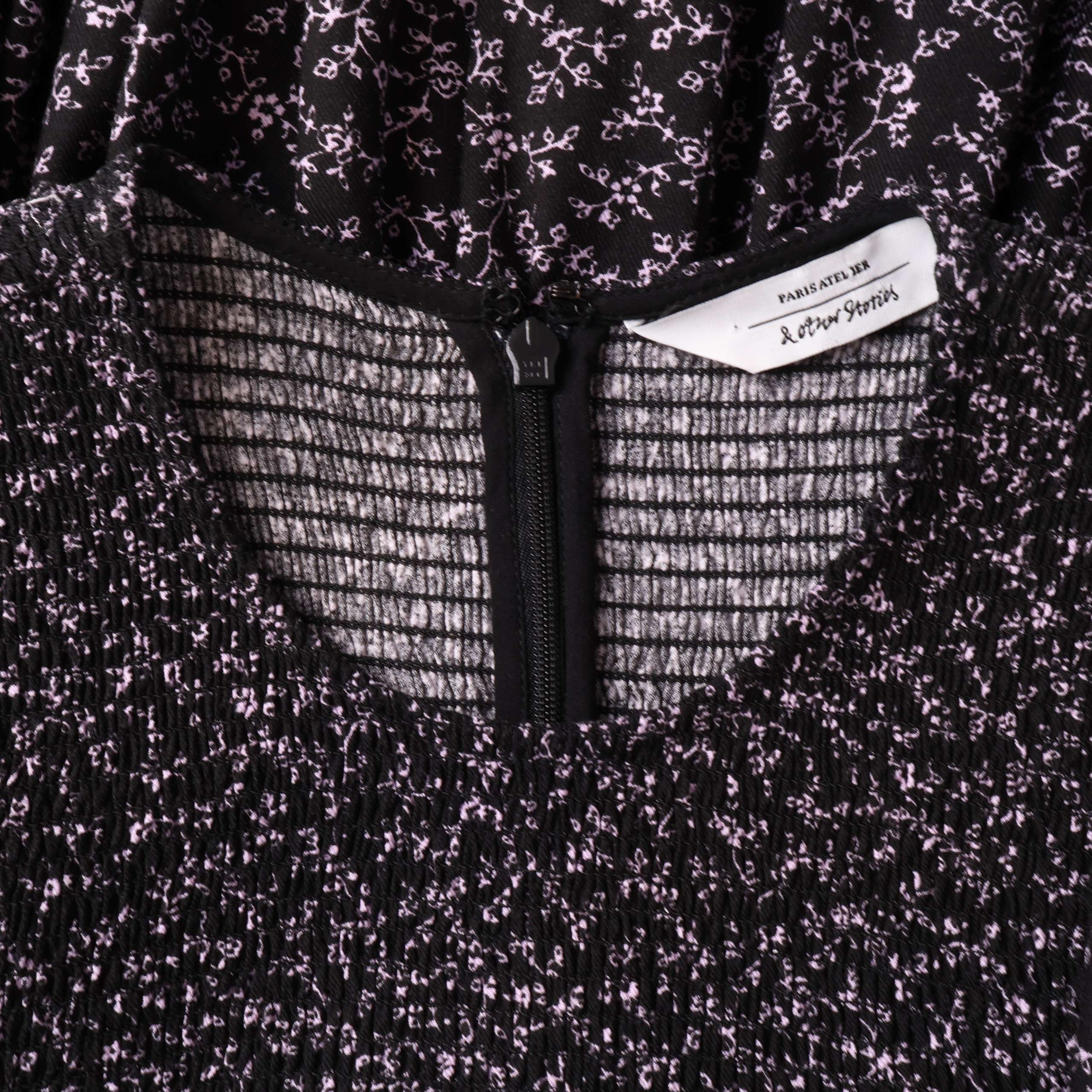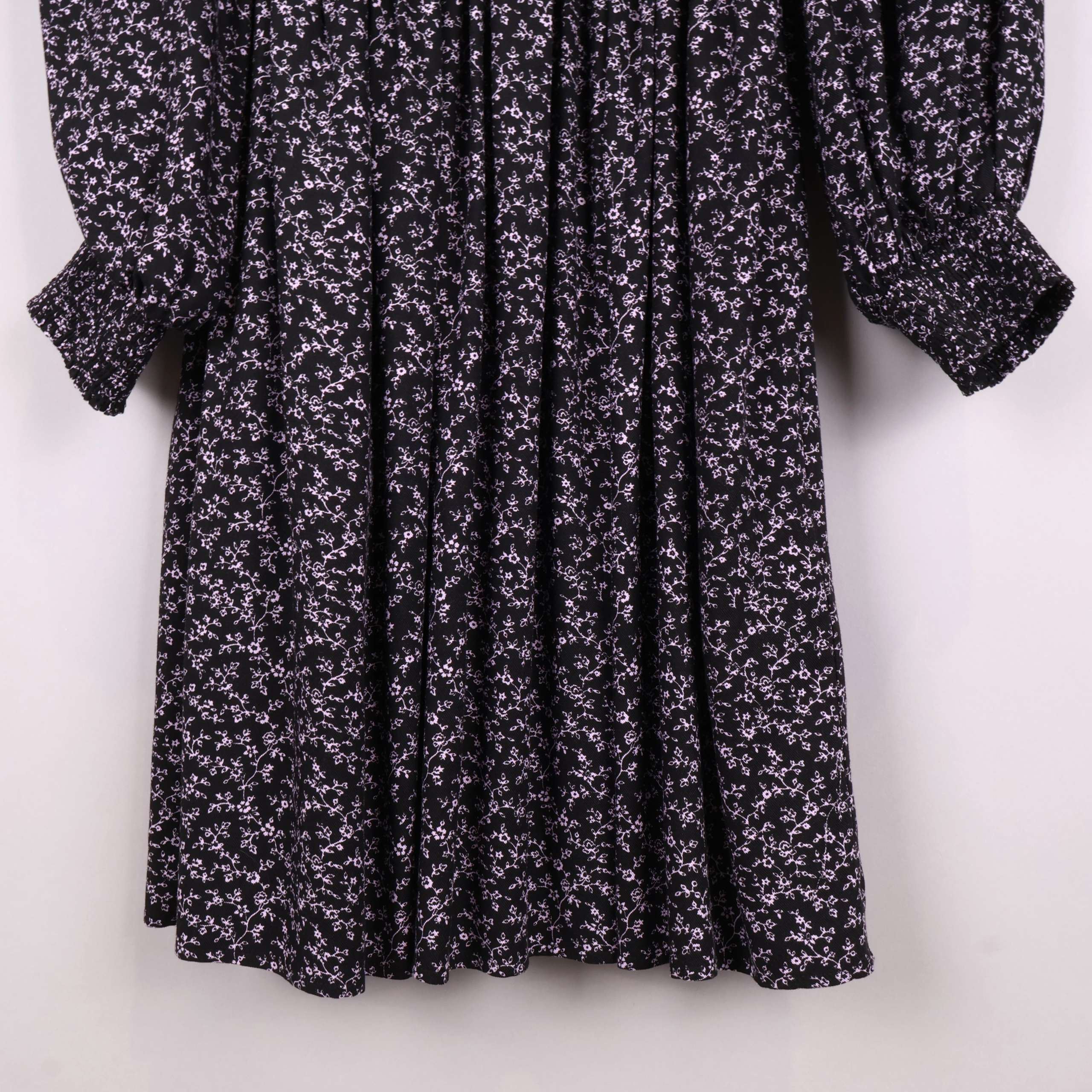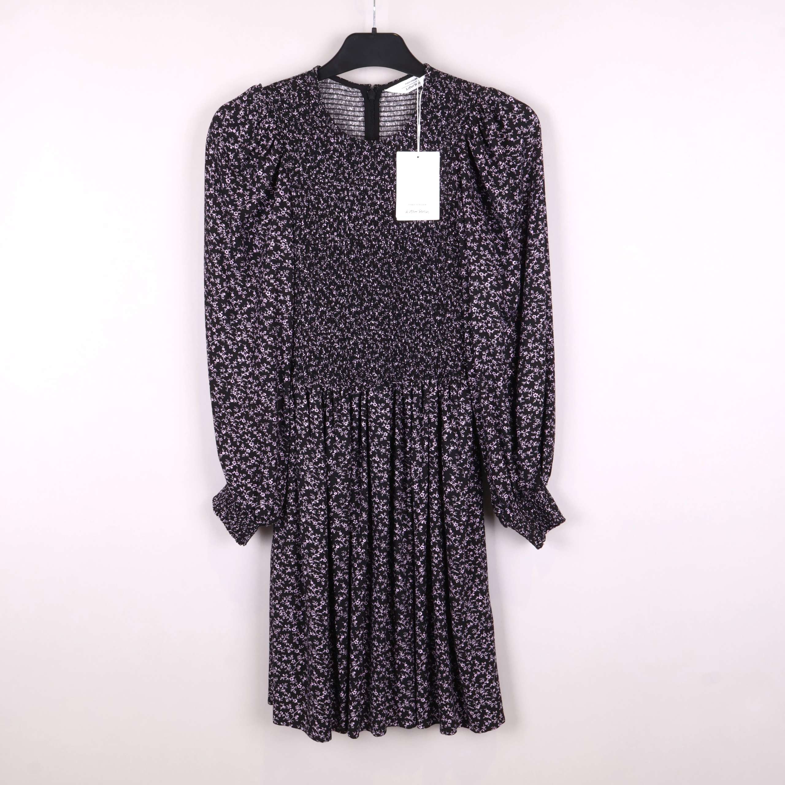 Elegant klänning med ett subtilt blommigt mönster i svart och vitt. Puffiga långa ärmar och resår i midjan med mjukt fall.