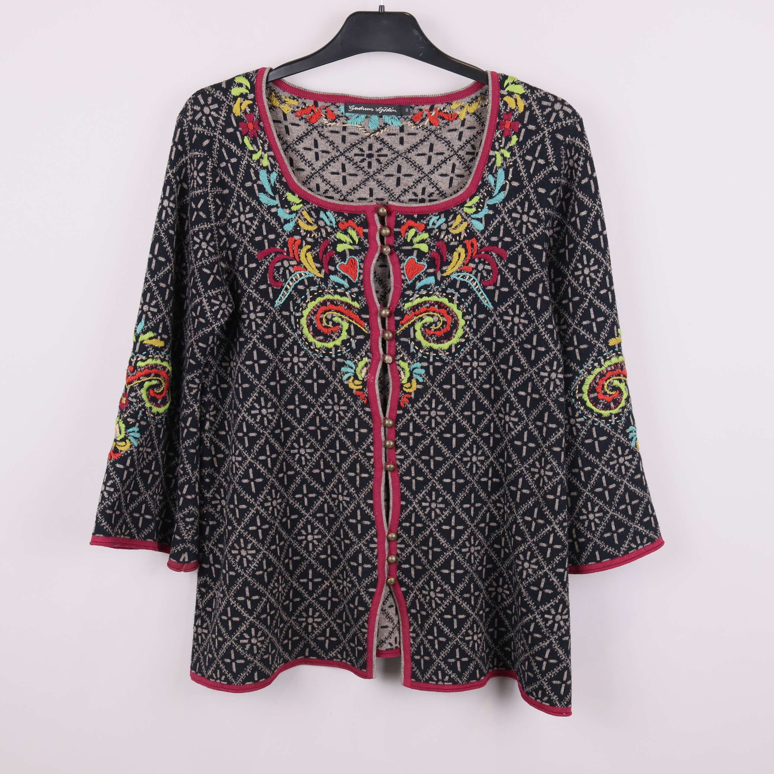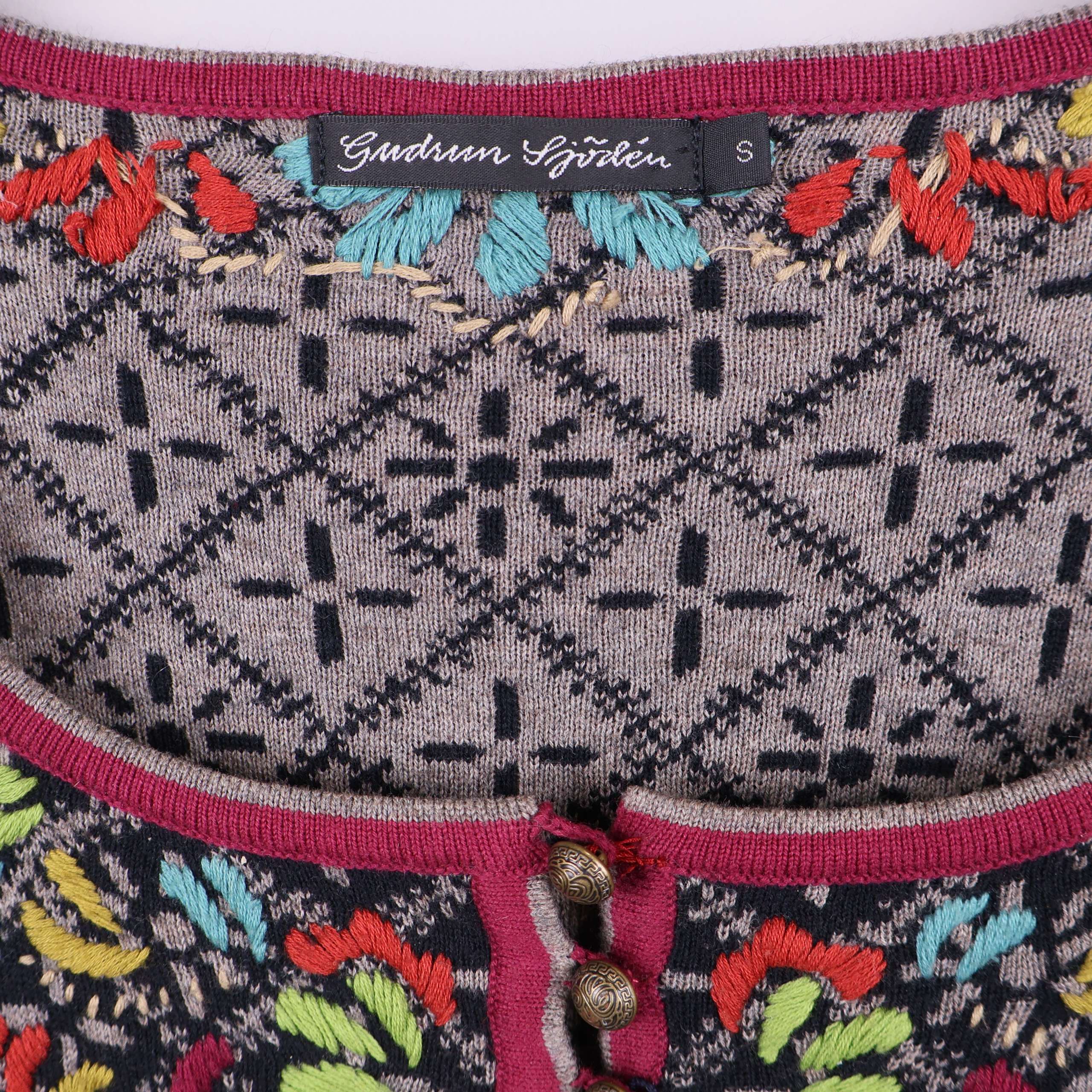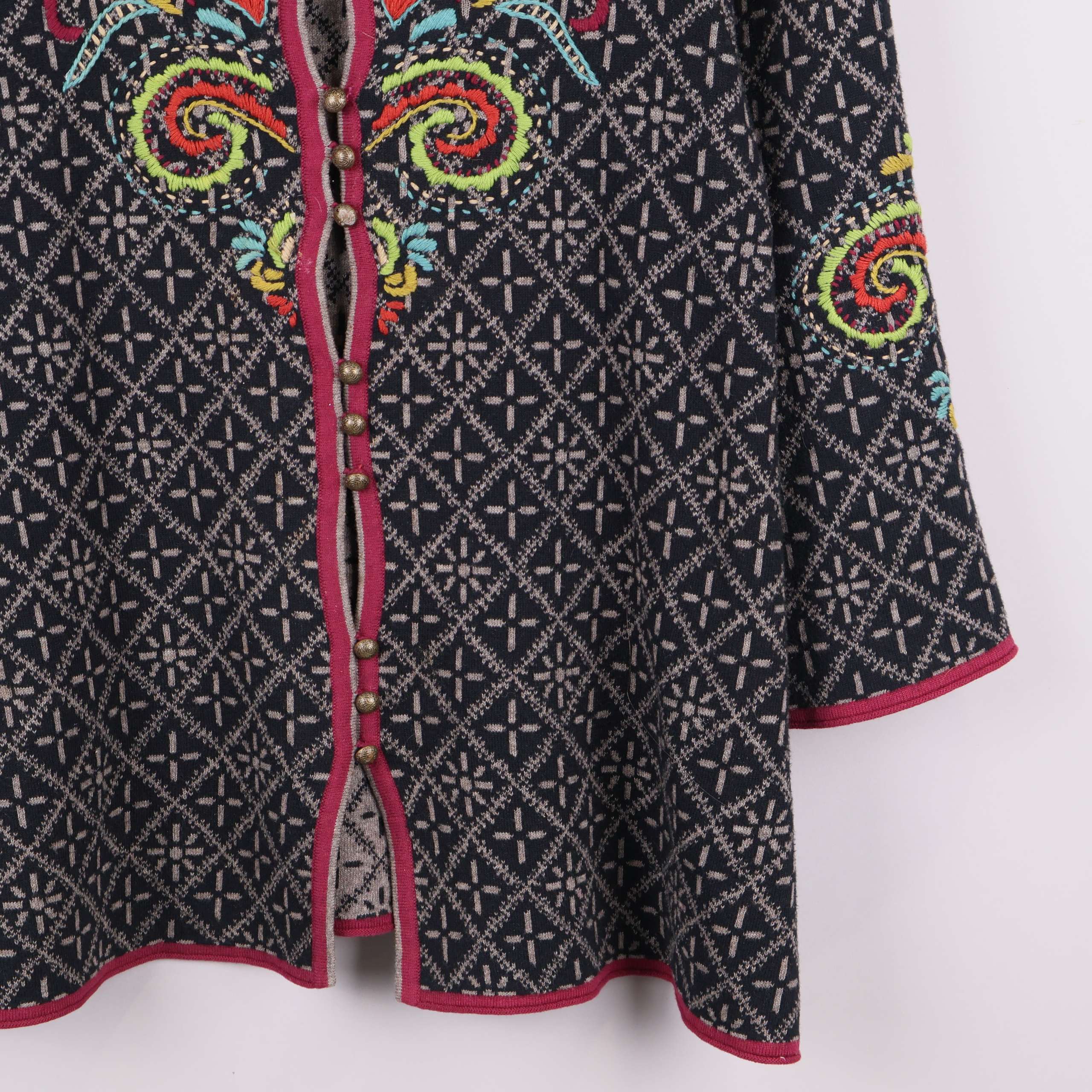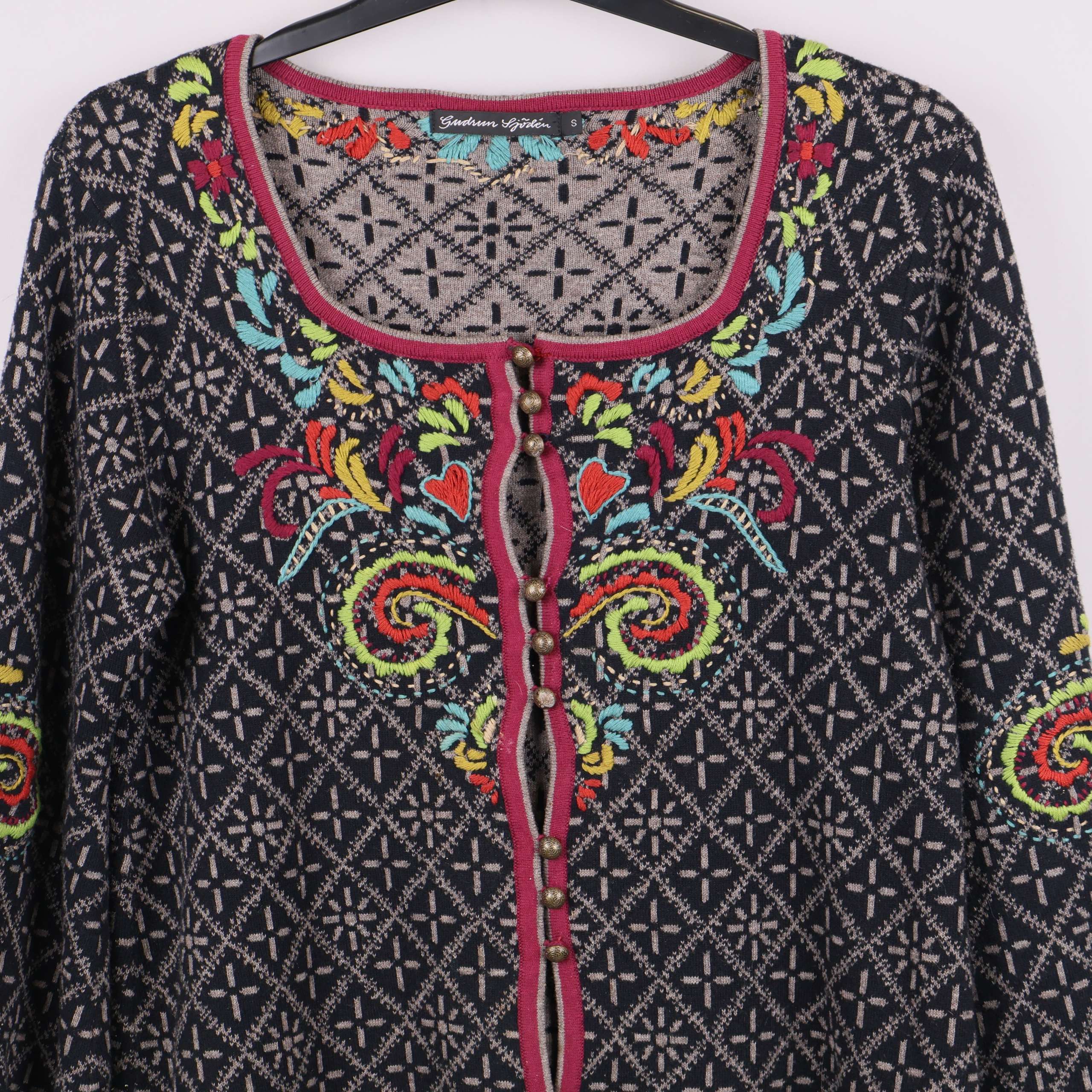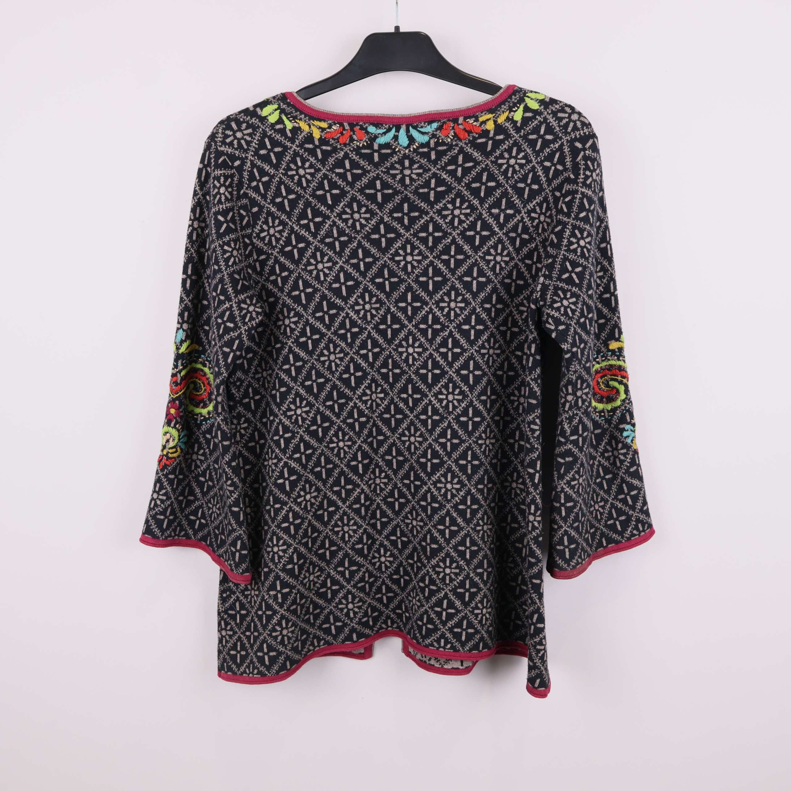Unik kofta med grafiskt mönster och färgstark brodyr på bröst och ärmar. Designen har dekorativa knappar framtill och kontrastfärgade kanter för en riktigt personlig touch. Breda, något utsvängda ärmar ger en skön känsla. Kombinationen av bomull och ull skapar en mjuk och behaglig känsla mot huden.