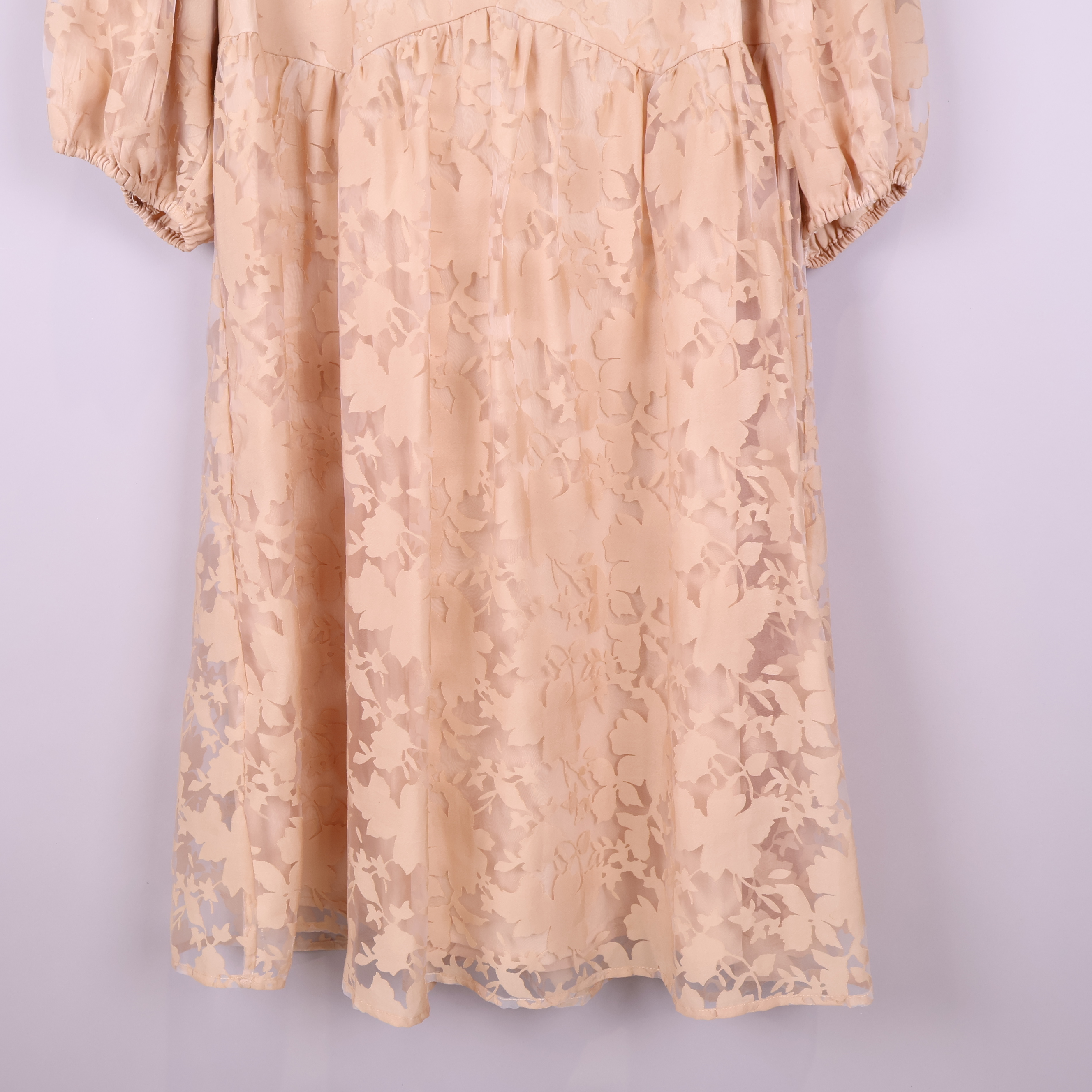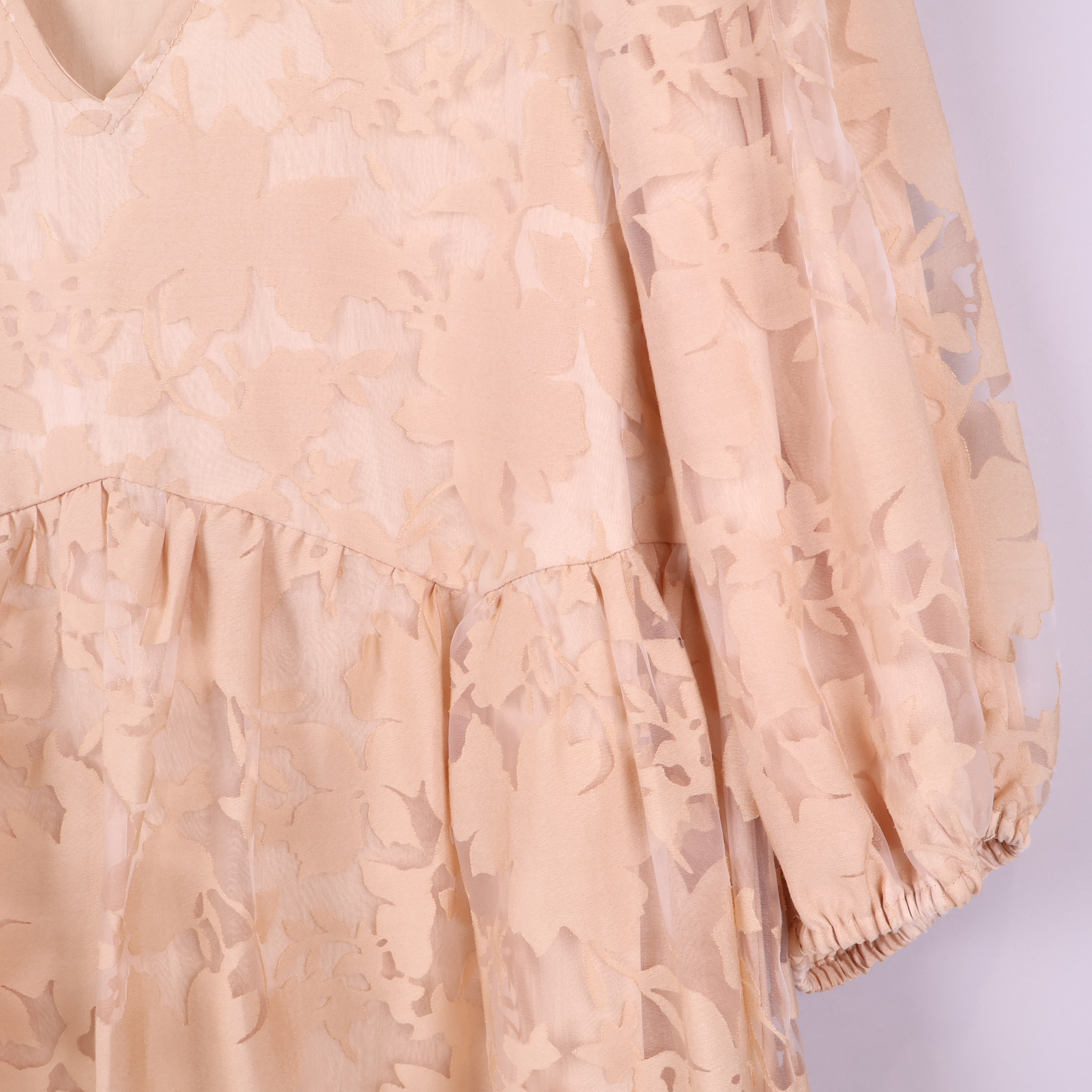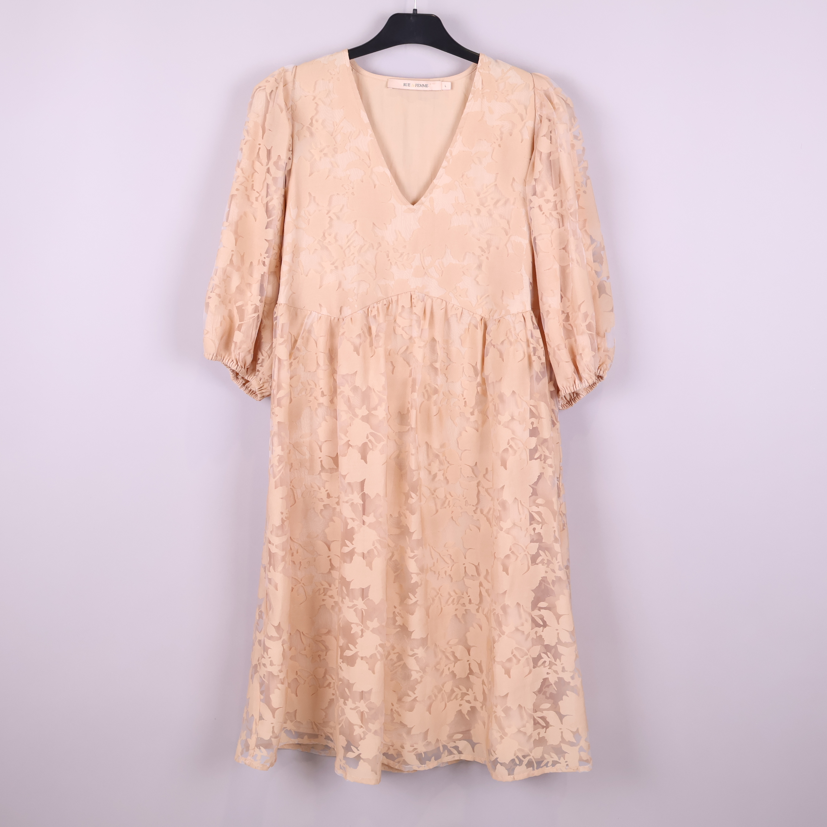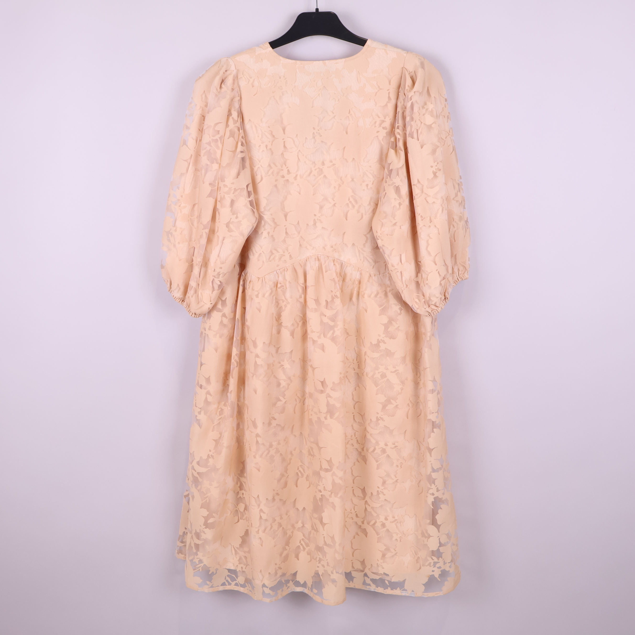 Den här klänningen har en mjuk beige grundton med vackert blommigt mönster och en följsam passform med v-ringning. Vida, trekvarts puffärmar ger plagget en luftig känsla och resår vid ärmslutet skapar en relaxed touch. Tyget är semitransparent med ett lätt fall, medan kjolen har fina volanger och klänningen är helfodrad för komfort.