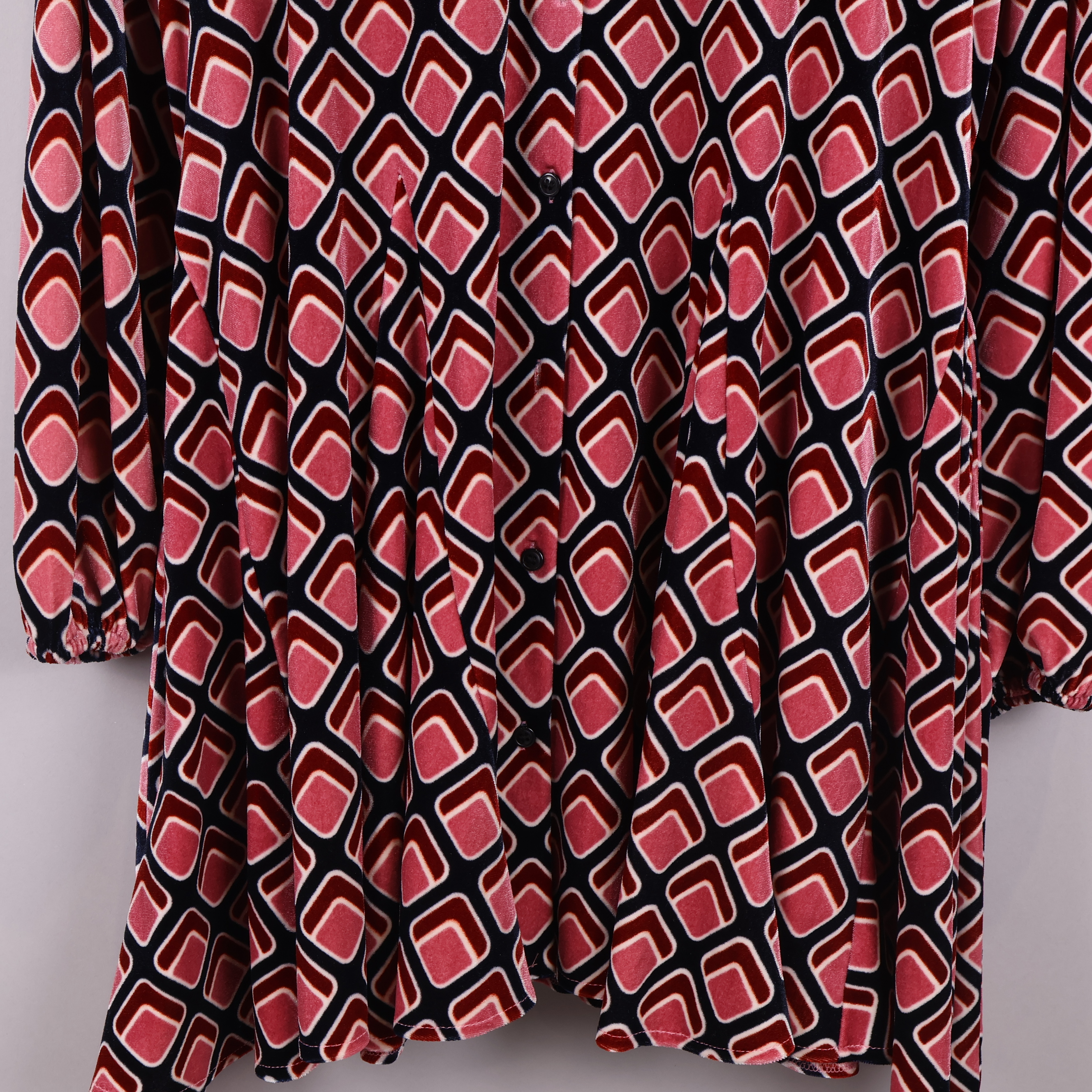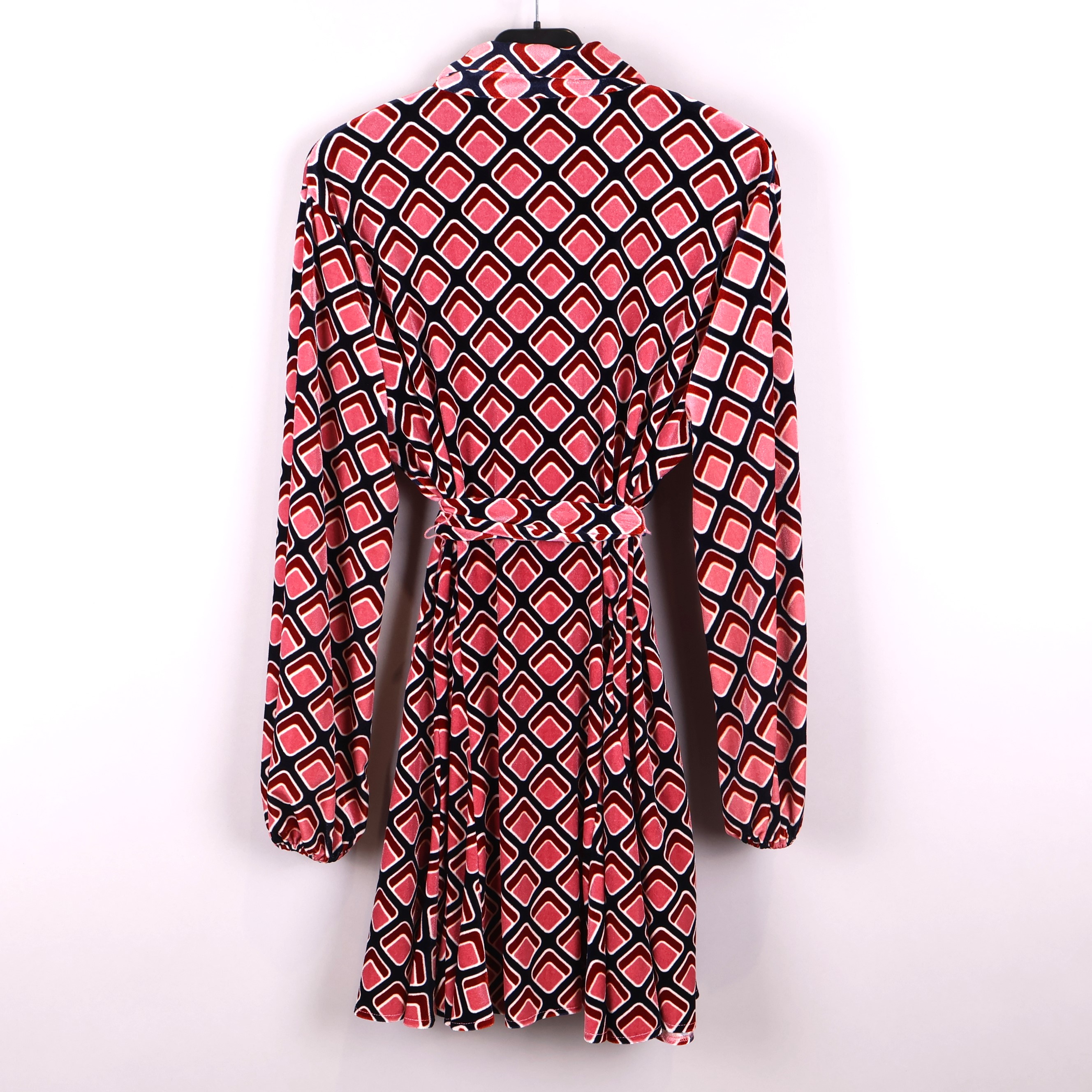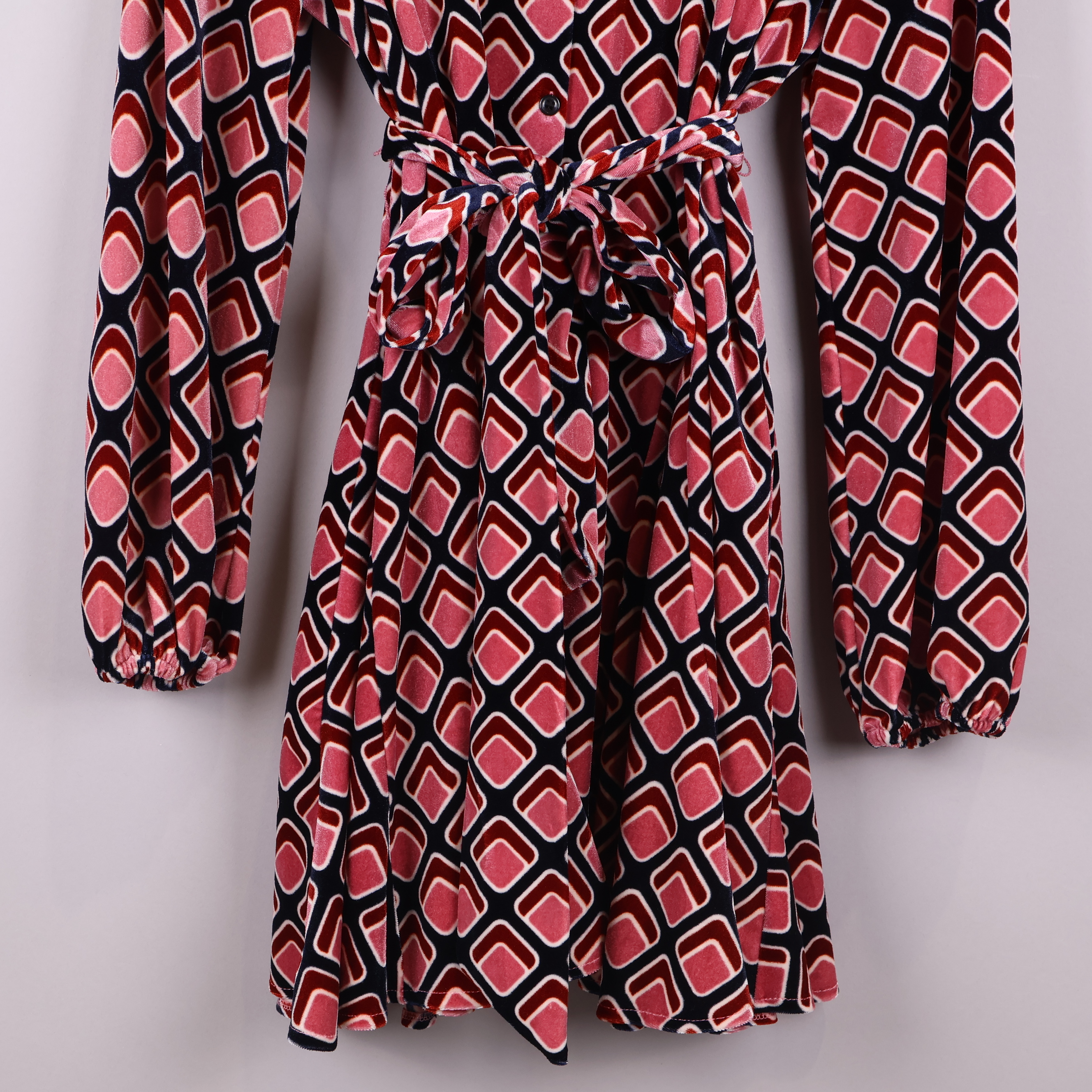 Klänning med ett grafiskt mönster i färgerna vinröd, rosa och marinblå. Har långa ärmar och ett knytskärp i midjan, vilket ger en justerbar och bekväm passform.