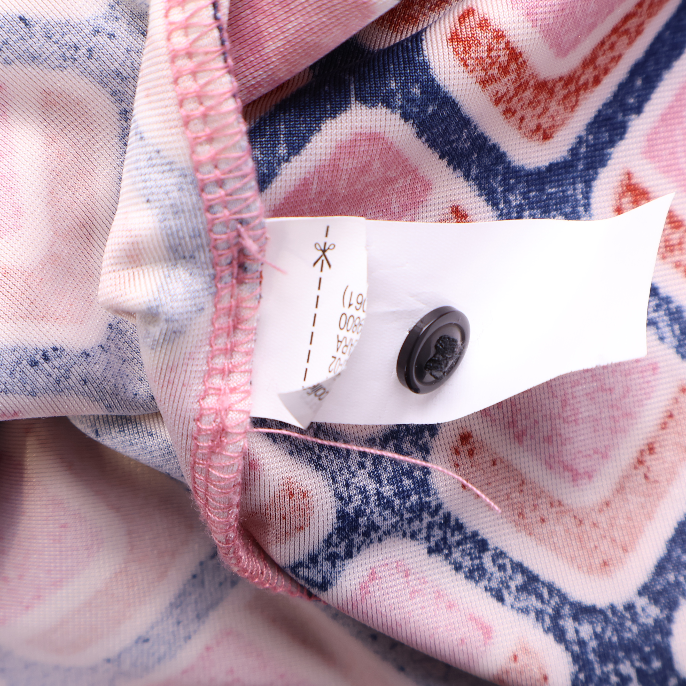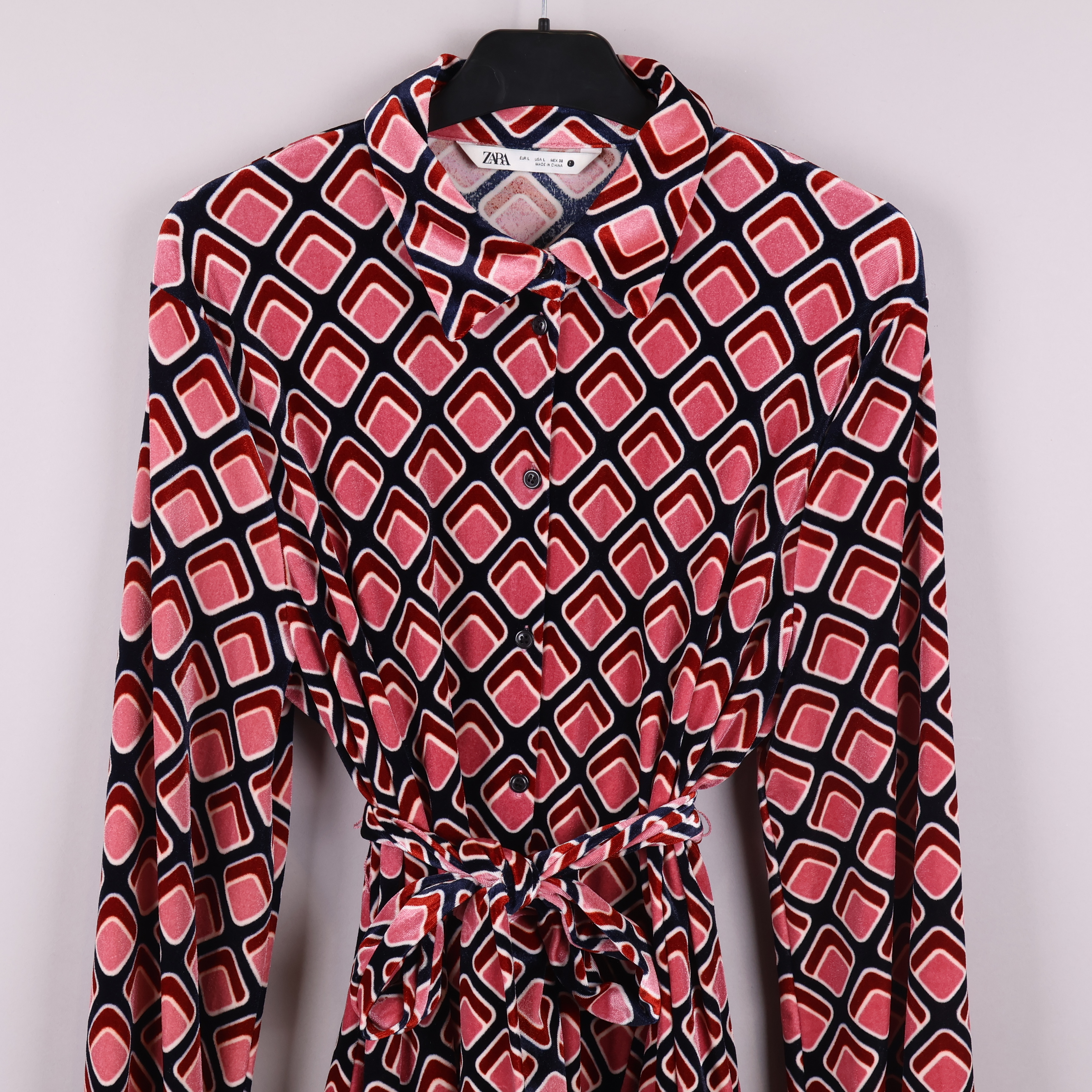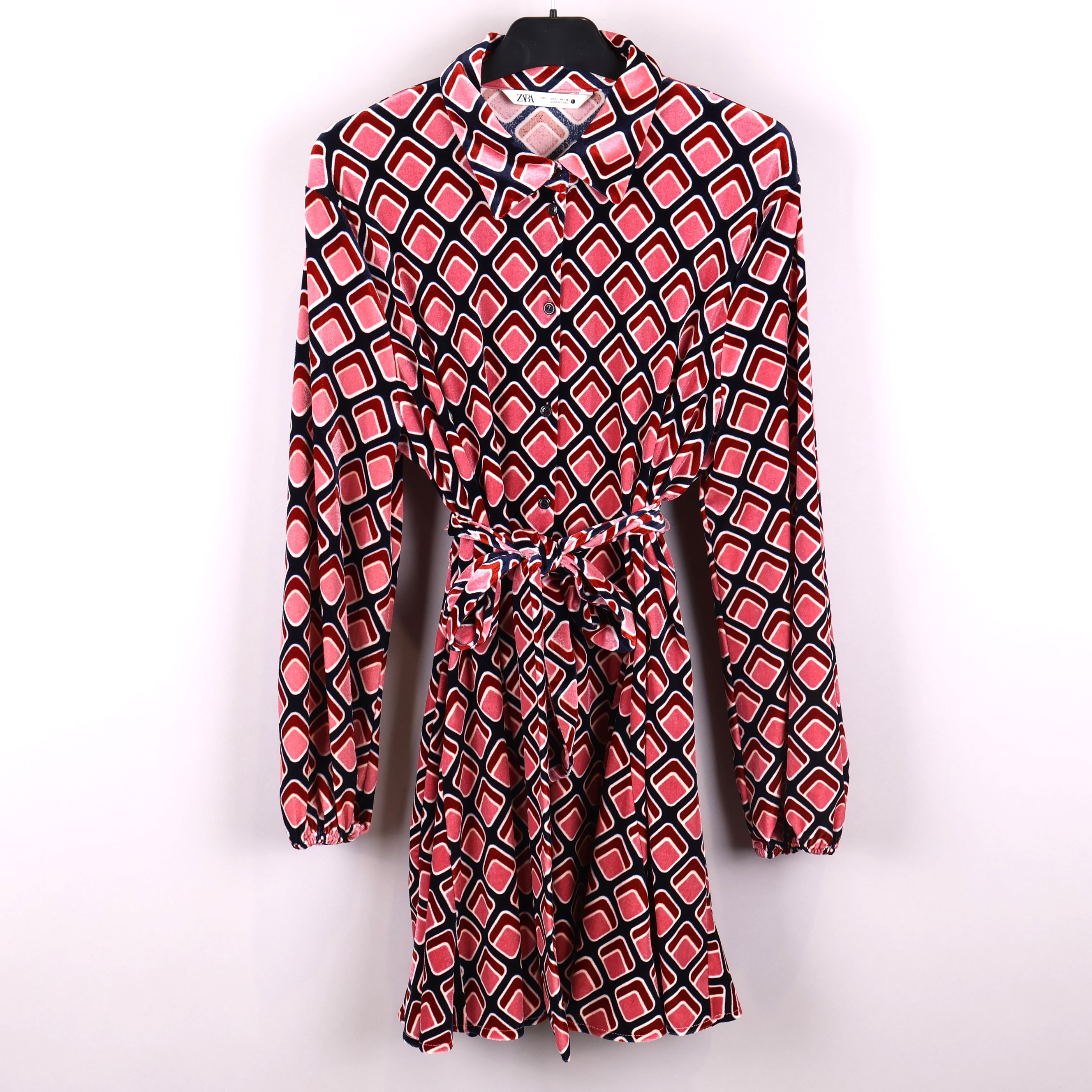 Klänning med ett grafiskt mönster i färgerna vinröd, rosa och marinblå. Har långa ärmar och ett knytskärp i midjan, vilket ger en justerbar och bekväm passform.