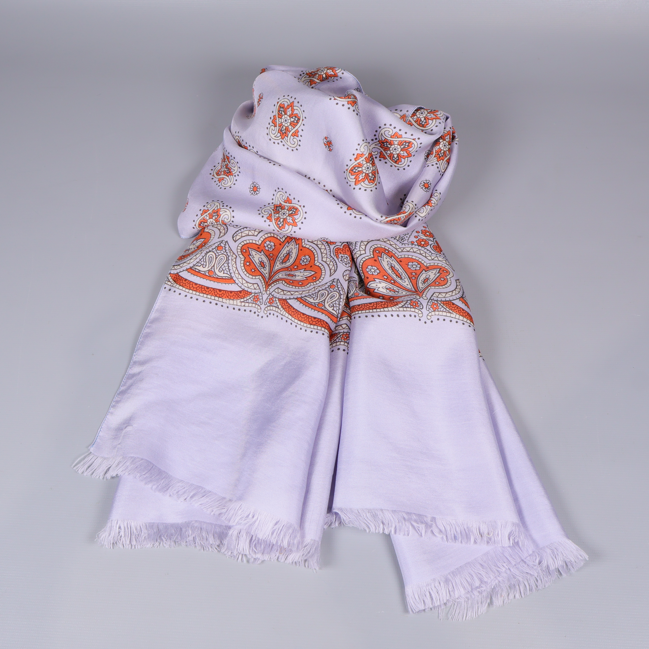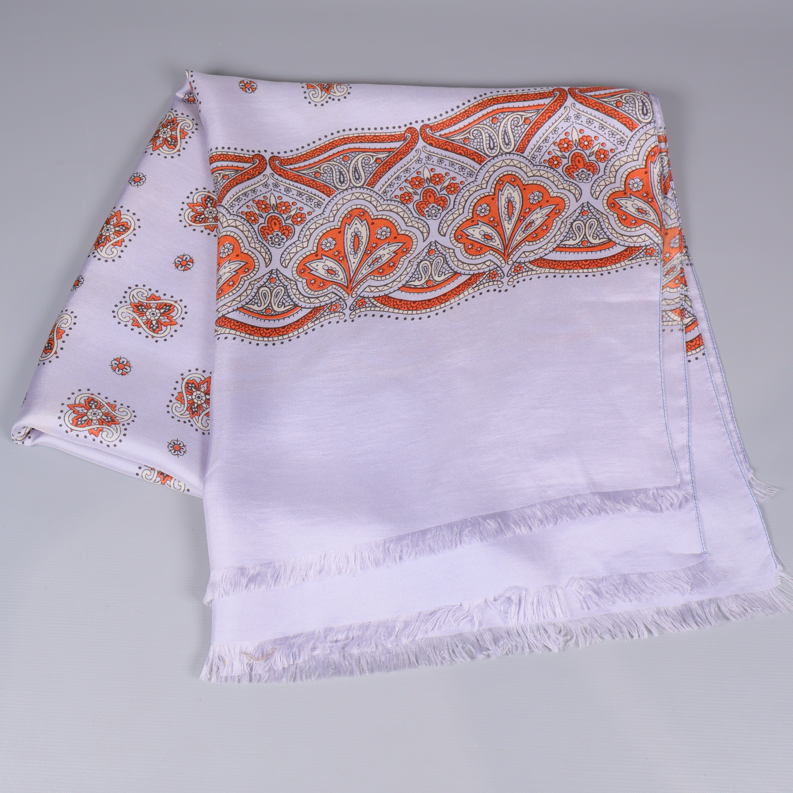 Ljus sjal med dekorativt blommönster och detaljerad bård i orange och beige toner. Avslutas med korta fransar i kanterna som ger en ledig och elegant känsla. Den tunna och mjuka strukturen ger ett luftigt intryck och passar till många olika stilar.