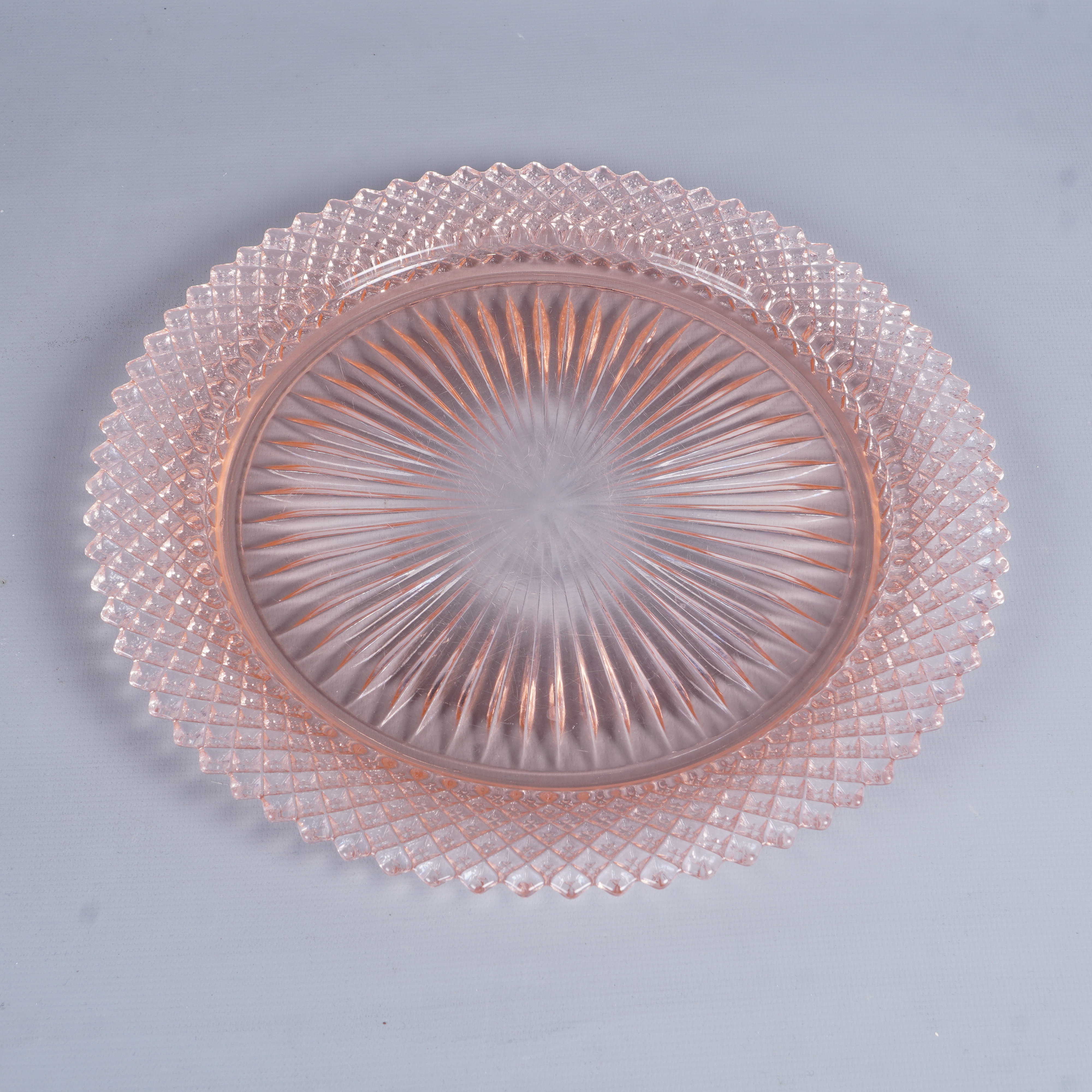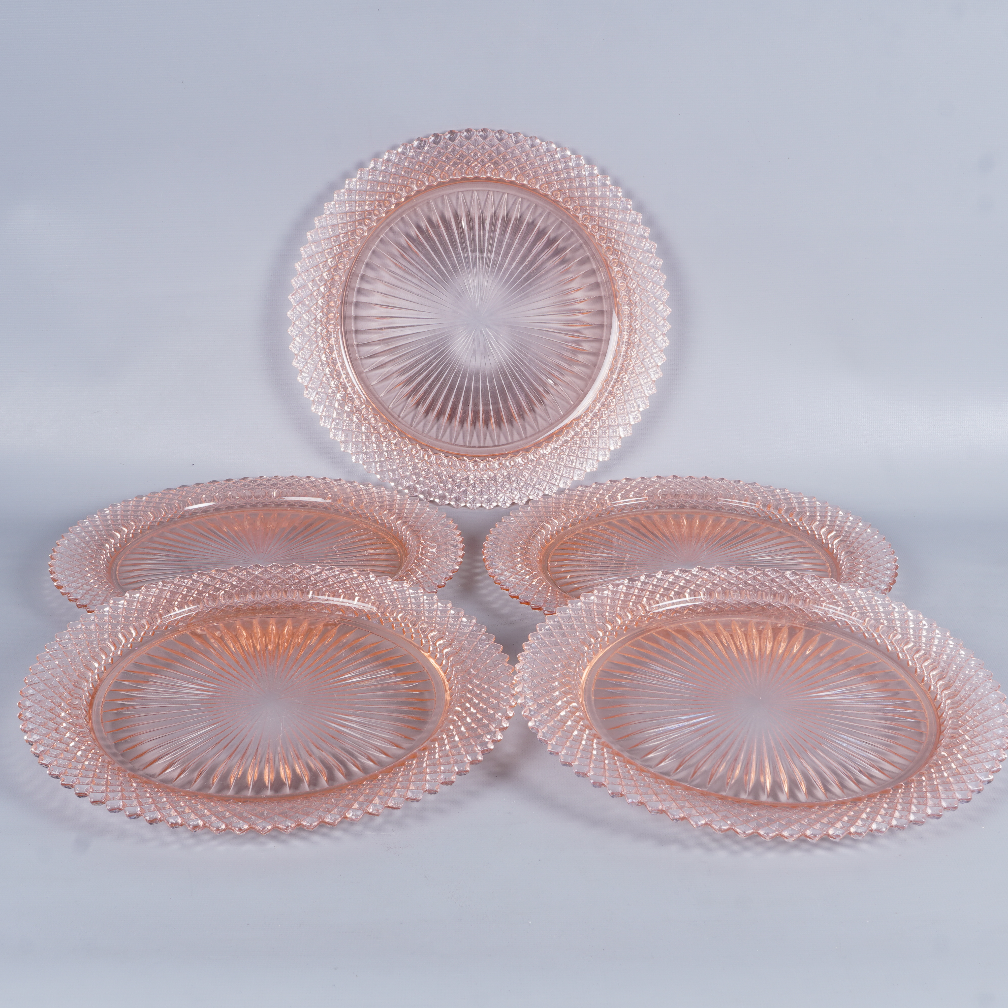 Set med fem stilrena tallrikar i strukturerat, ljusrosa glas. Den räfflade kanten och solstråleliknande designen ger en modern vintage vibe till dukningen. Tallrikarna har elegant genomskinlighet och ger en sofistikerad känsla till både vardag och fest.