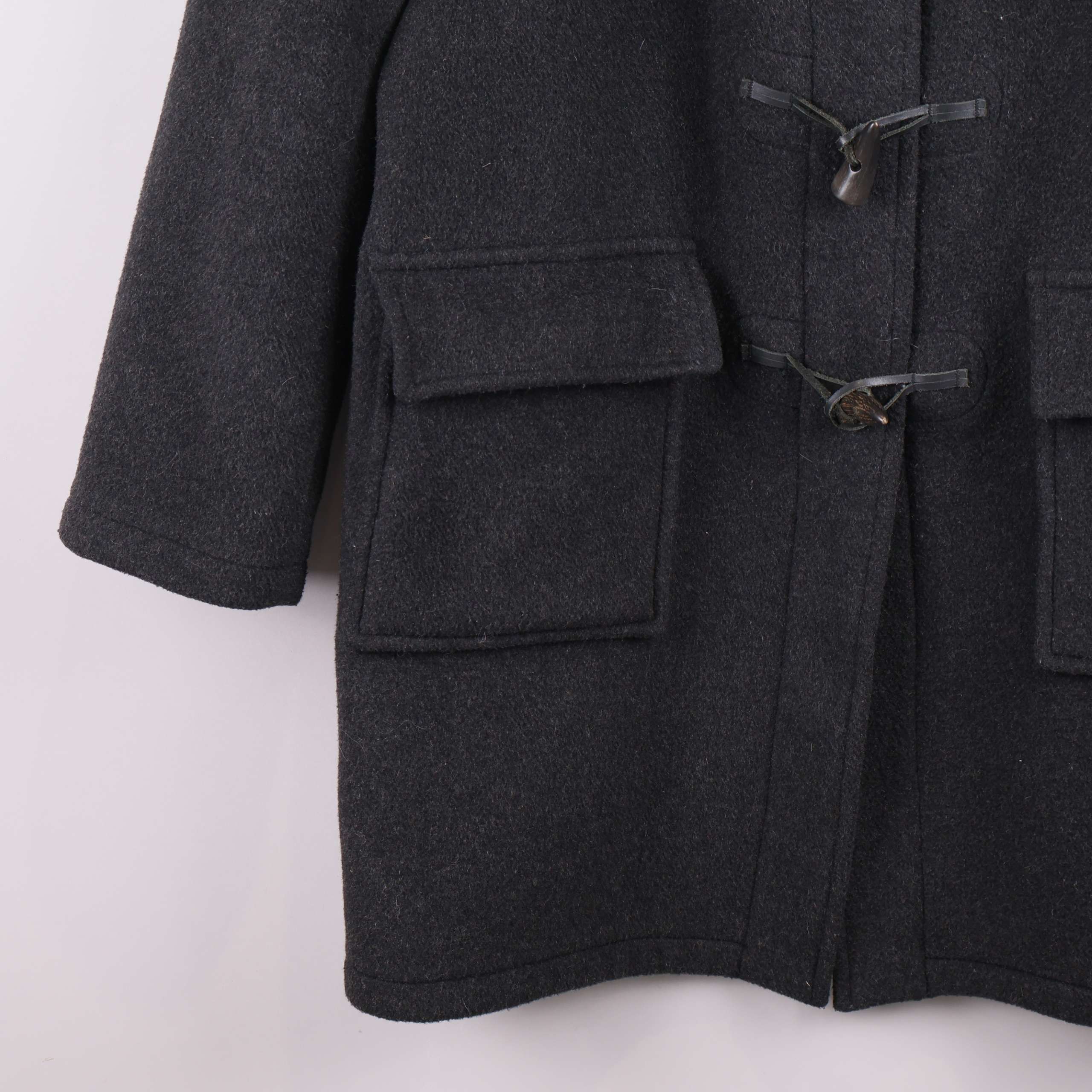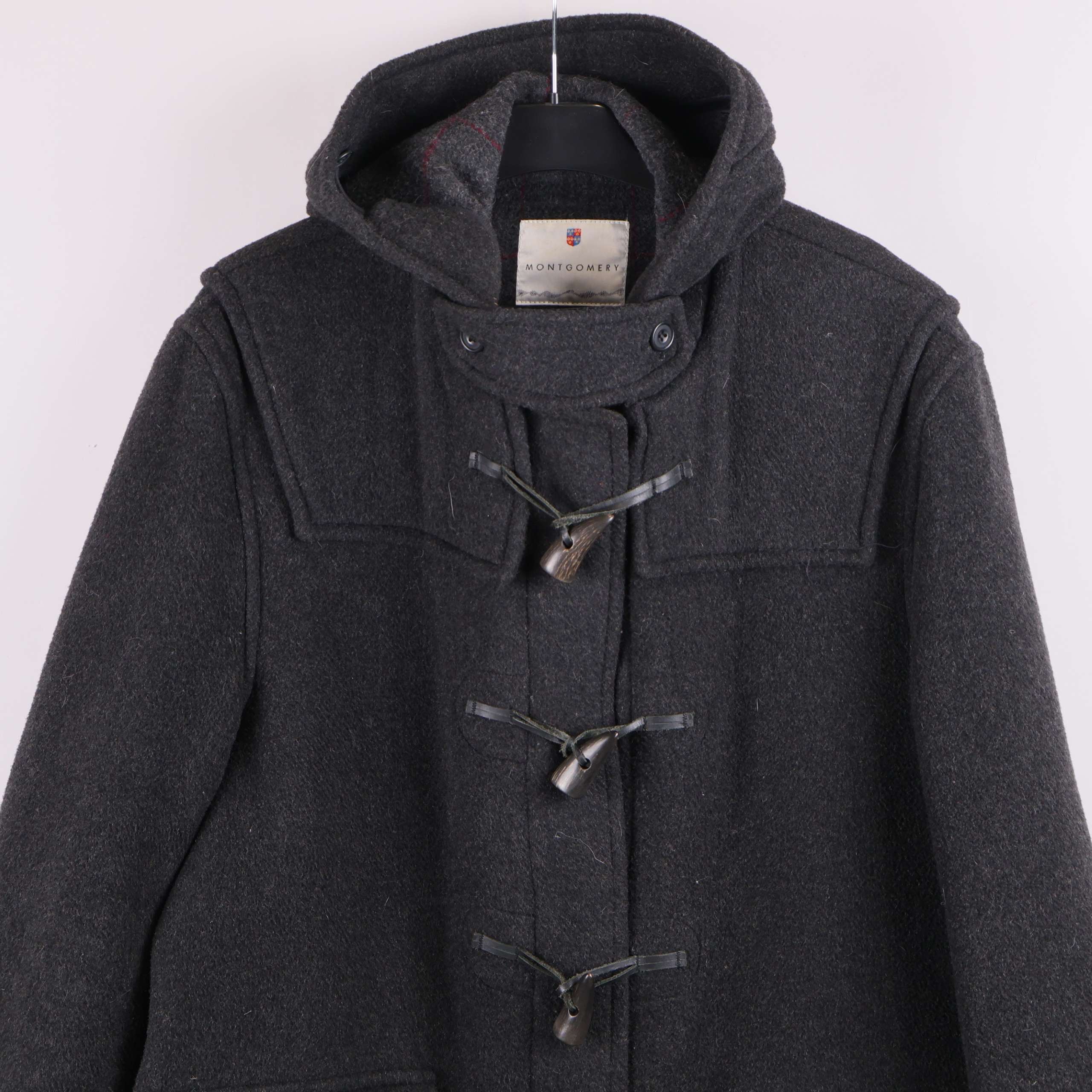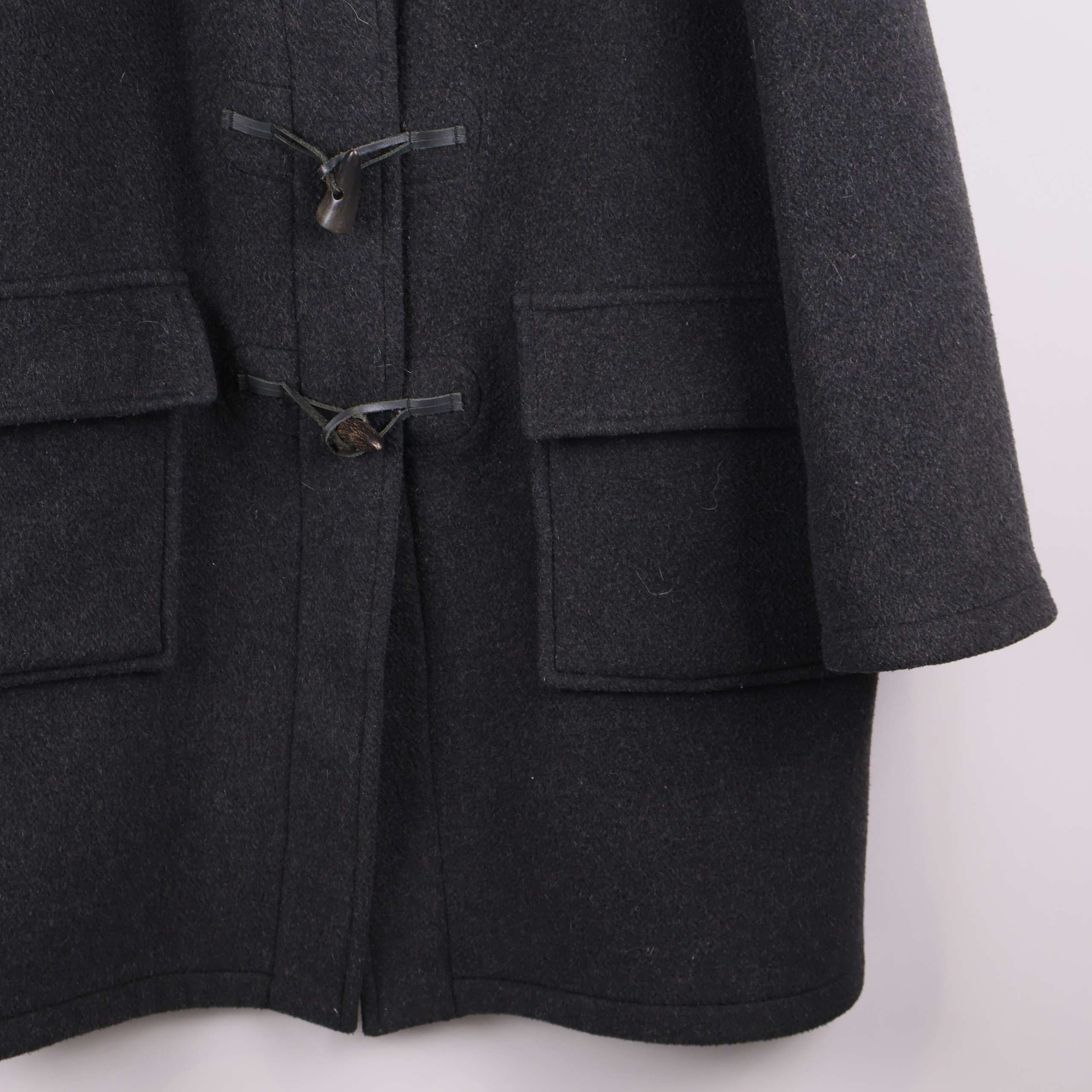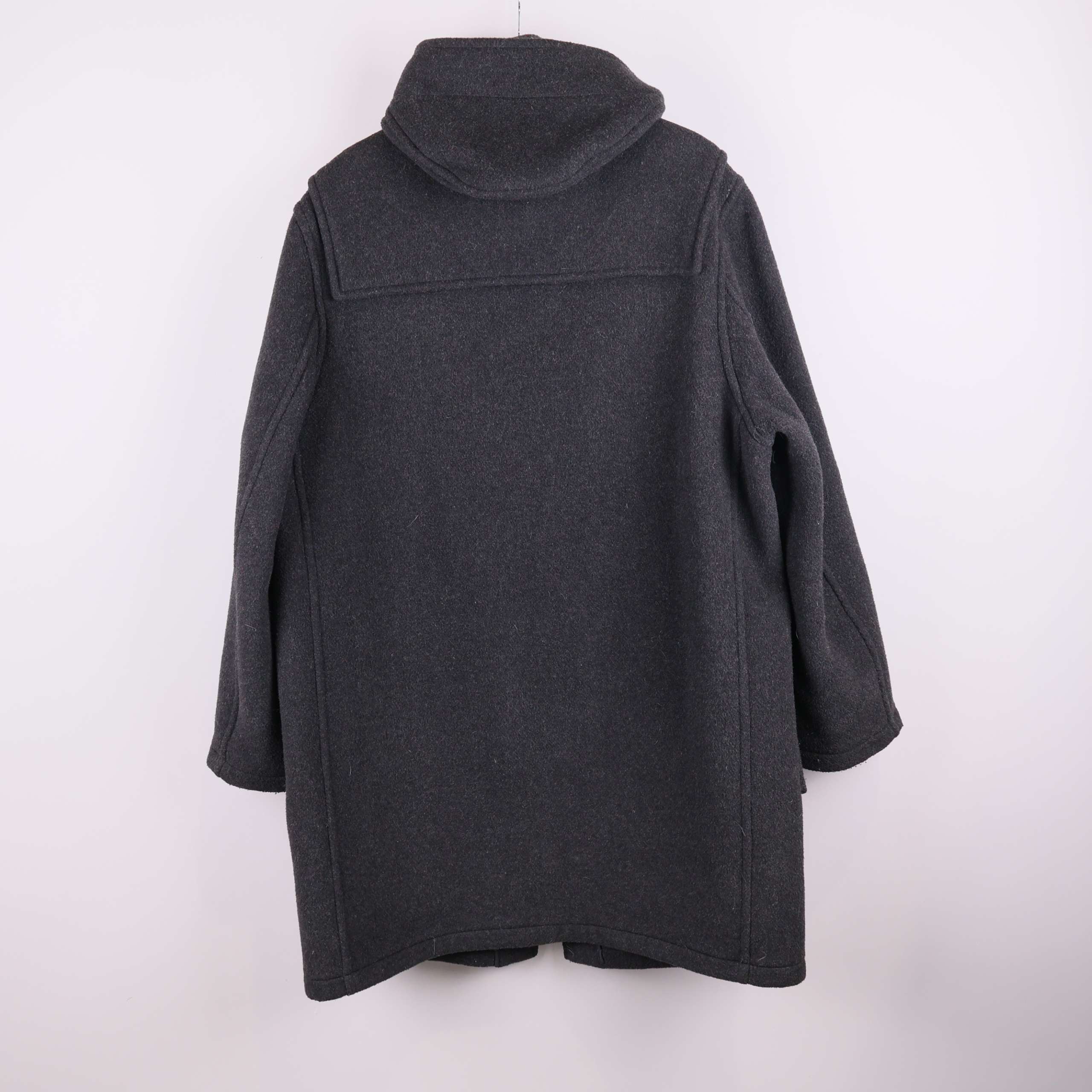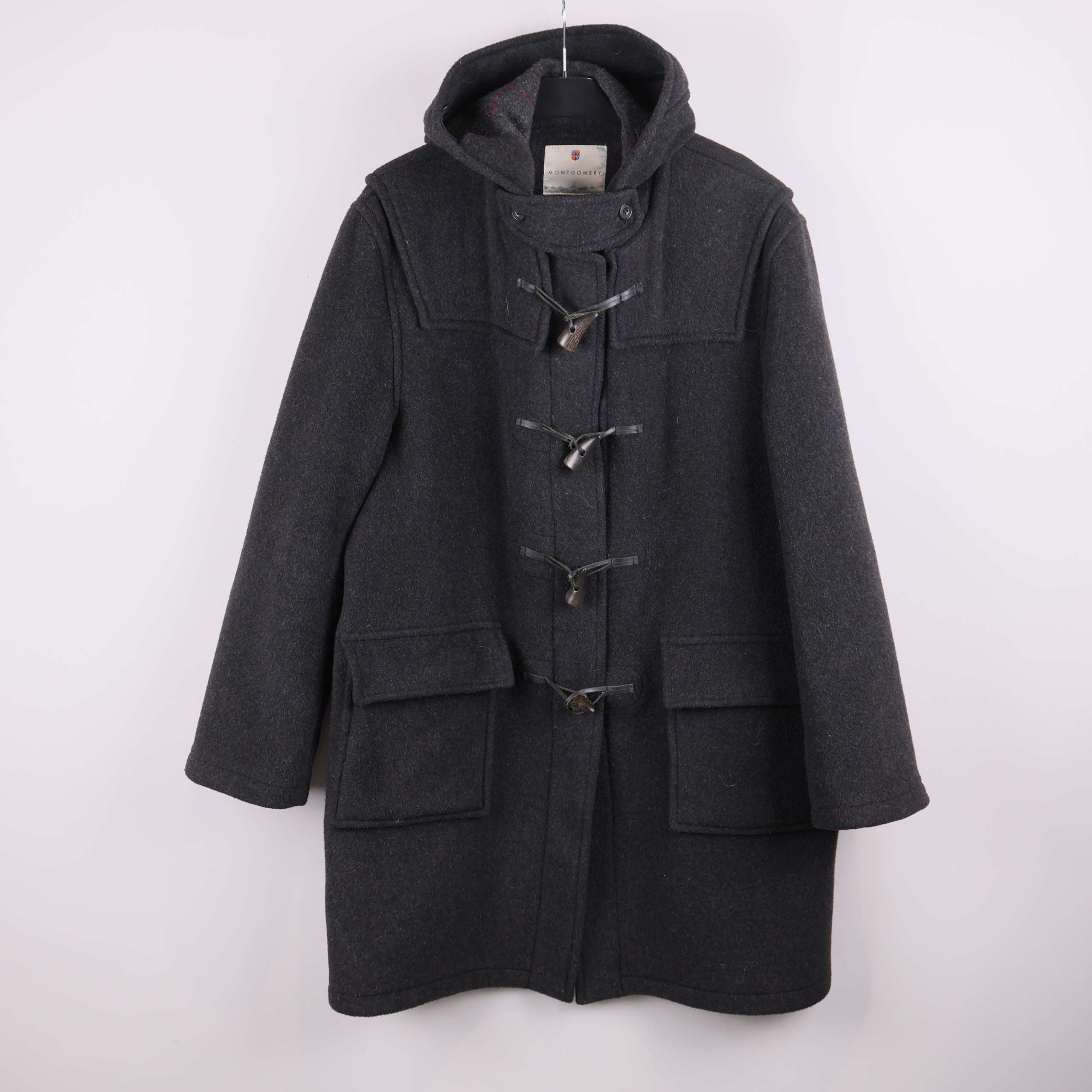 Klassisk duffeljacka i mörkgrått tyg med distinkta knäppningar och rymliga framfickor. Jackan har huva samt förstärkt axelparti för tidlös look och extra komfort.