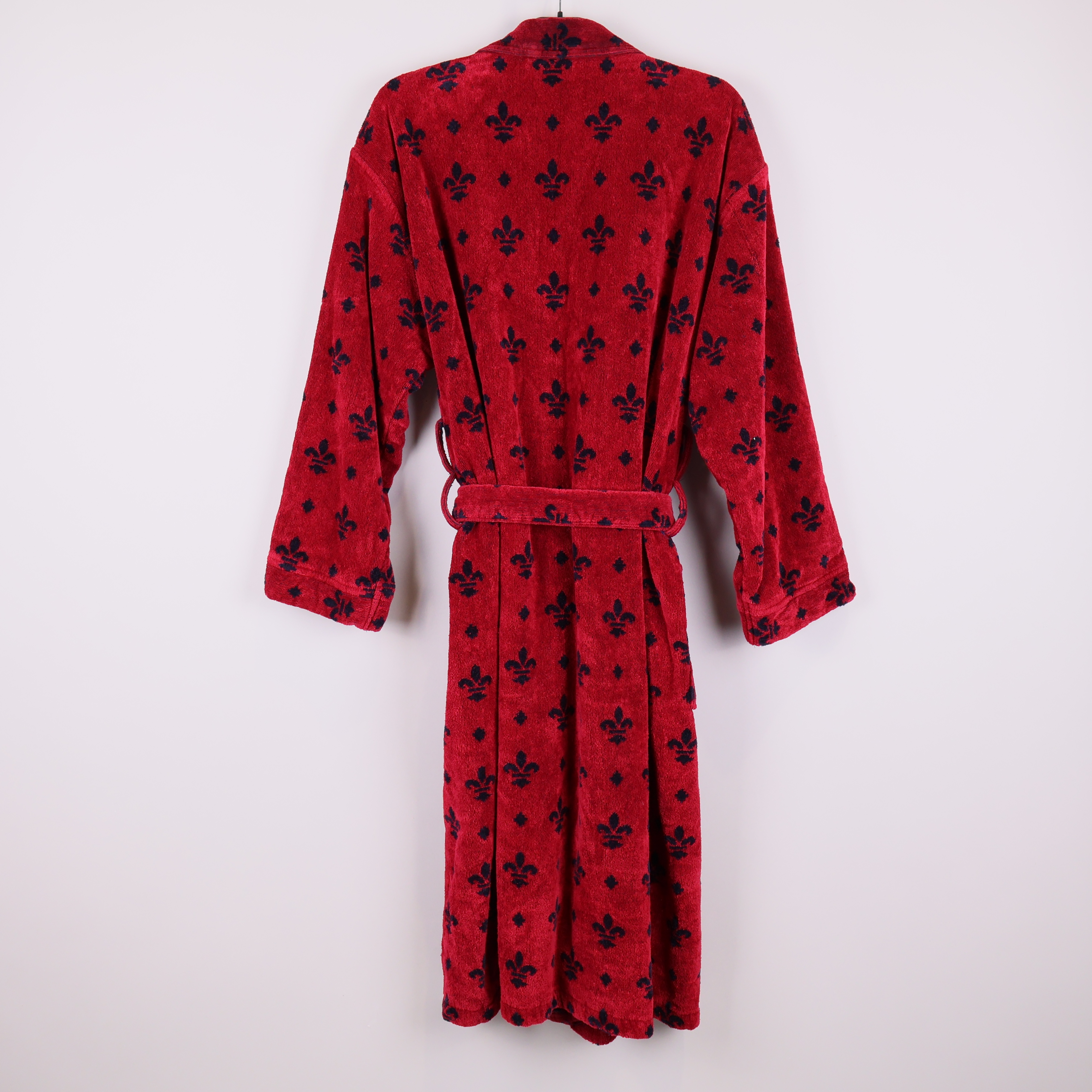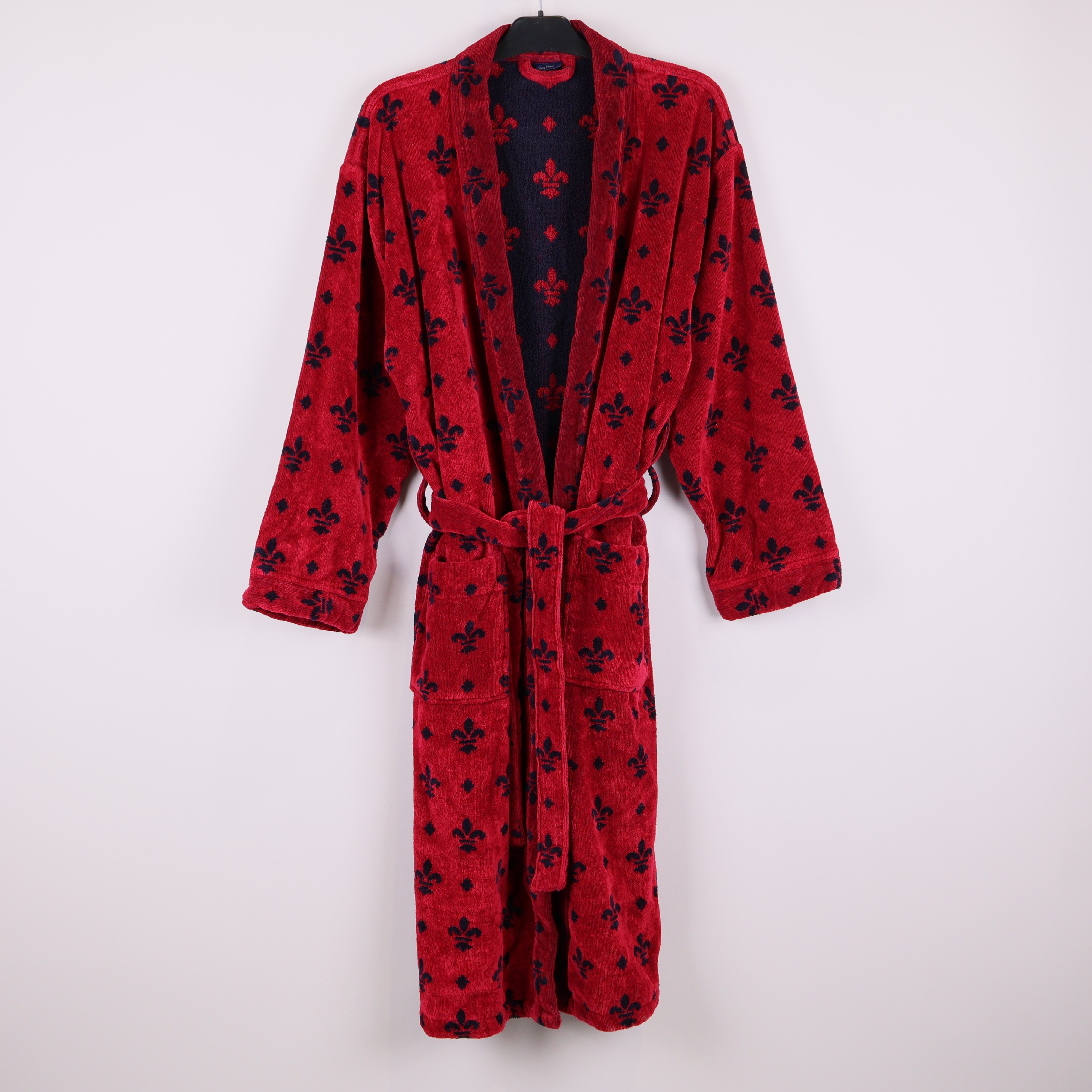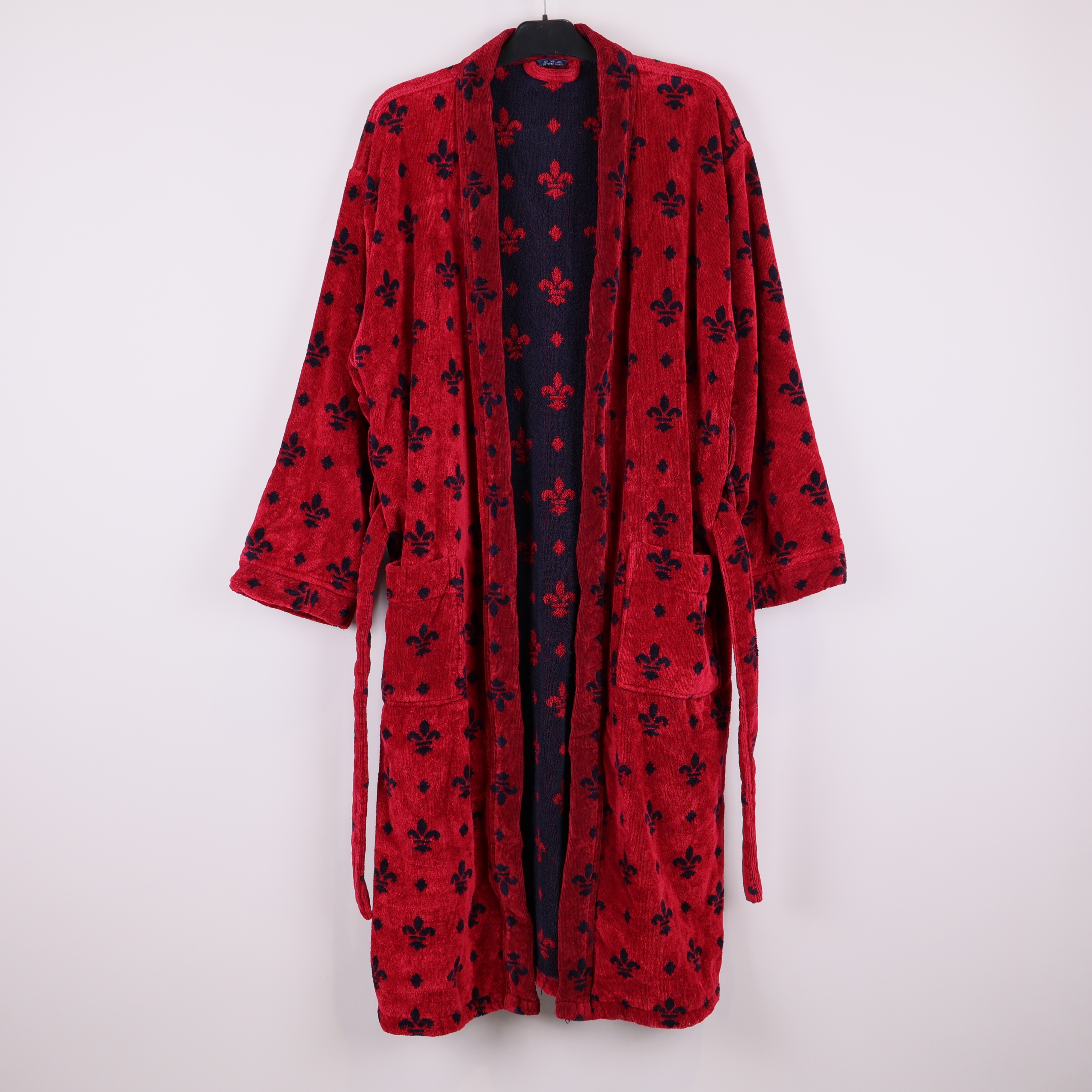 Mjuk och skön morgonrock i en tydlig röd färg med kontrasterande mörka dekorativa mönster. Rocken har lång ärm, knytskärp i midjan och två rymliga framfickor. Plagget är tillverkat i en frottéliknande kvalitet, vilket ger extra komfort och en cozy känsla för lugna stunder hemma.