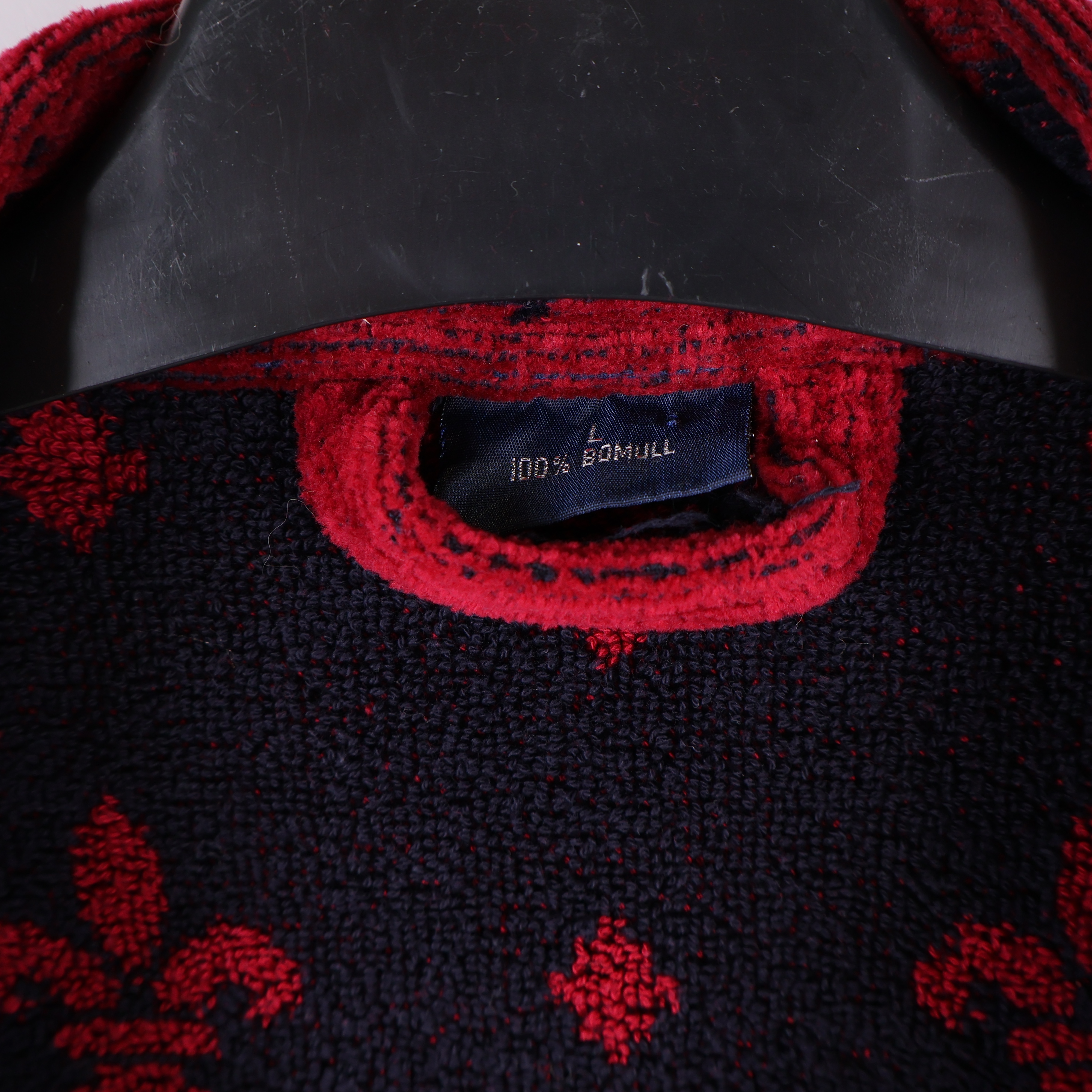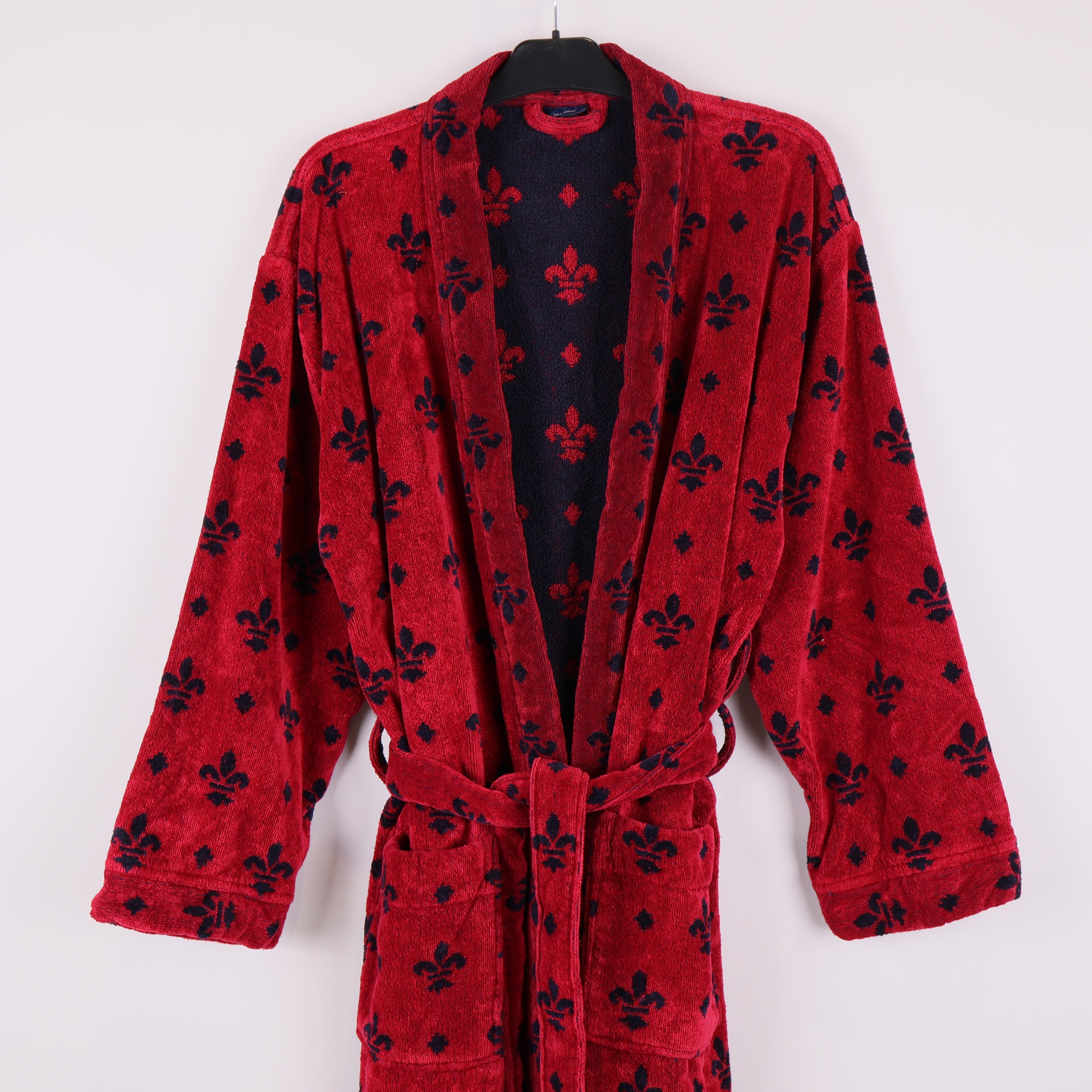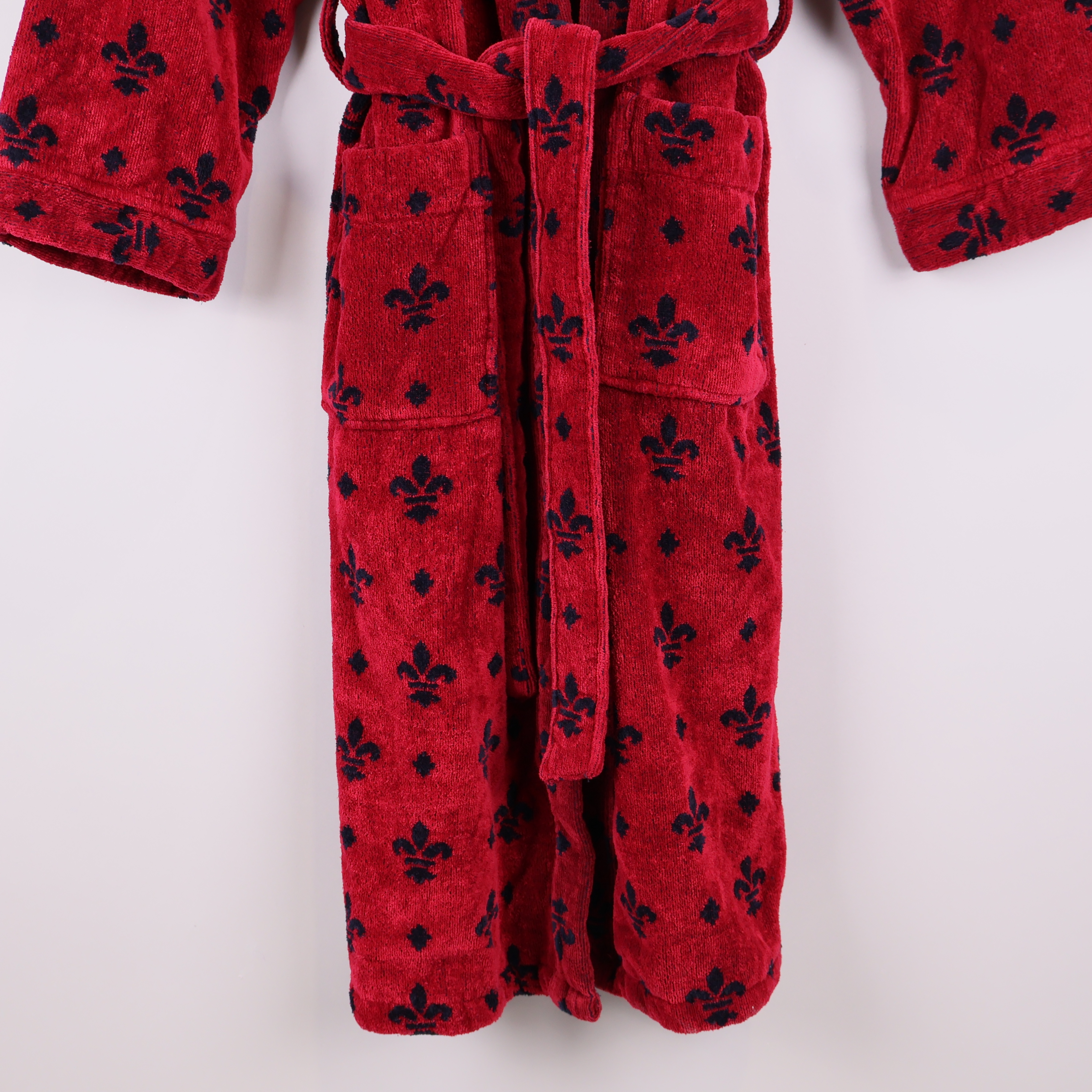 Mjuk och skön morgonrock i en tydlig röd färg med kontrasterande mörka dekorativa mönster. Rocken har lång ärm, knytskärp i midjan och två rymliga framfickor. Plagget är tillverkat i en frottéliknande kvalitet, vilket ger extra komfort och en cozy känsla för lugna stunder hemma.