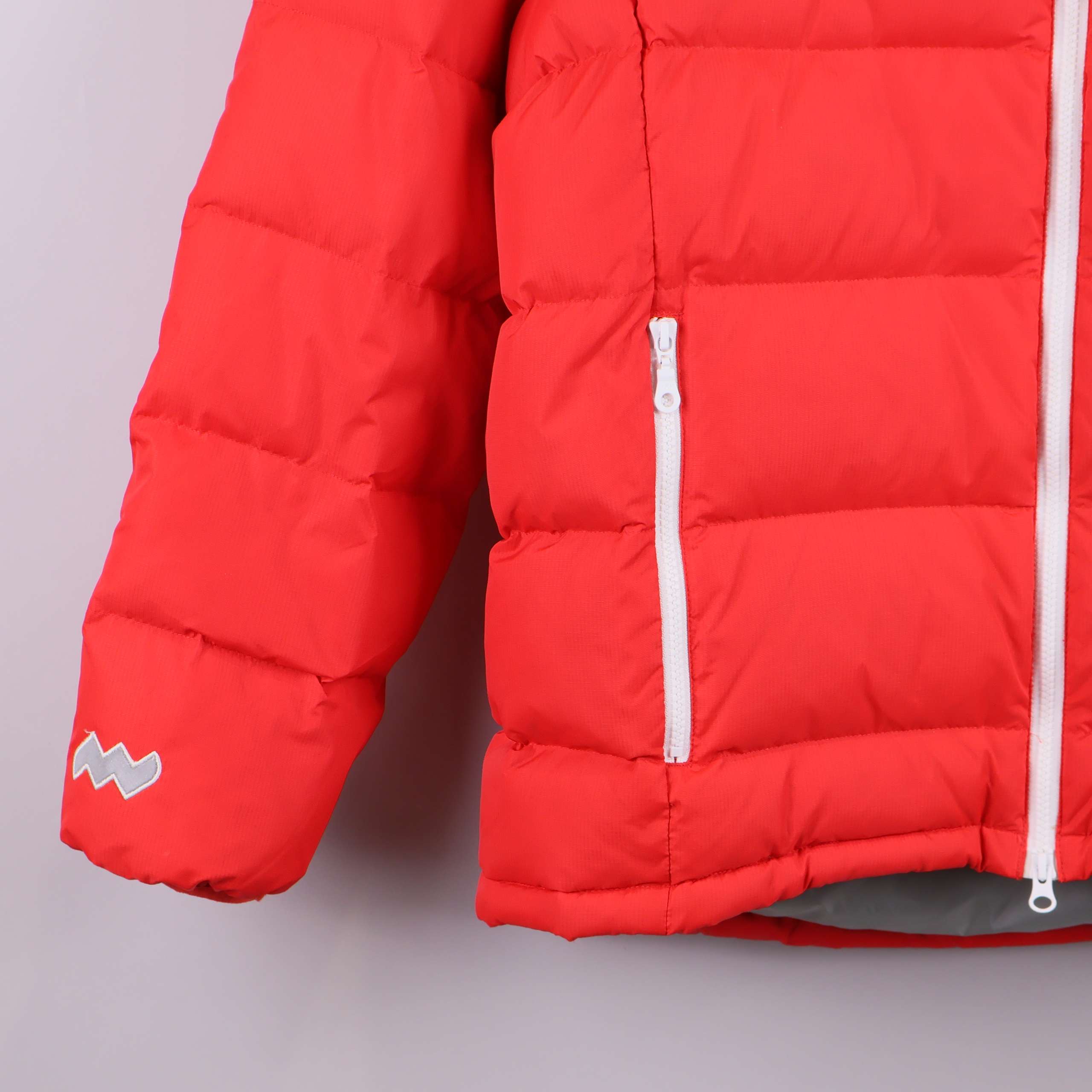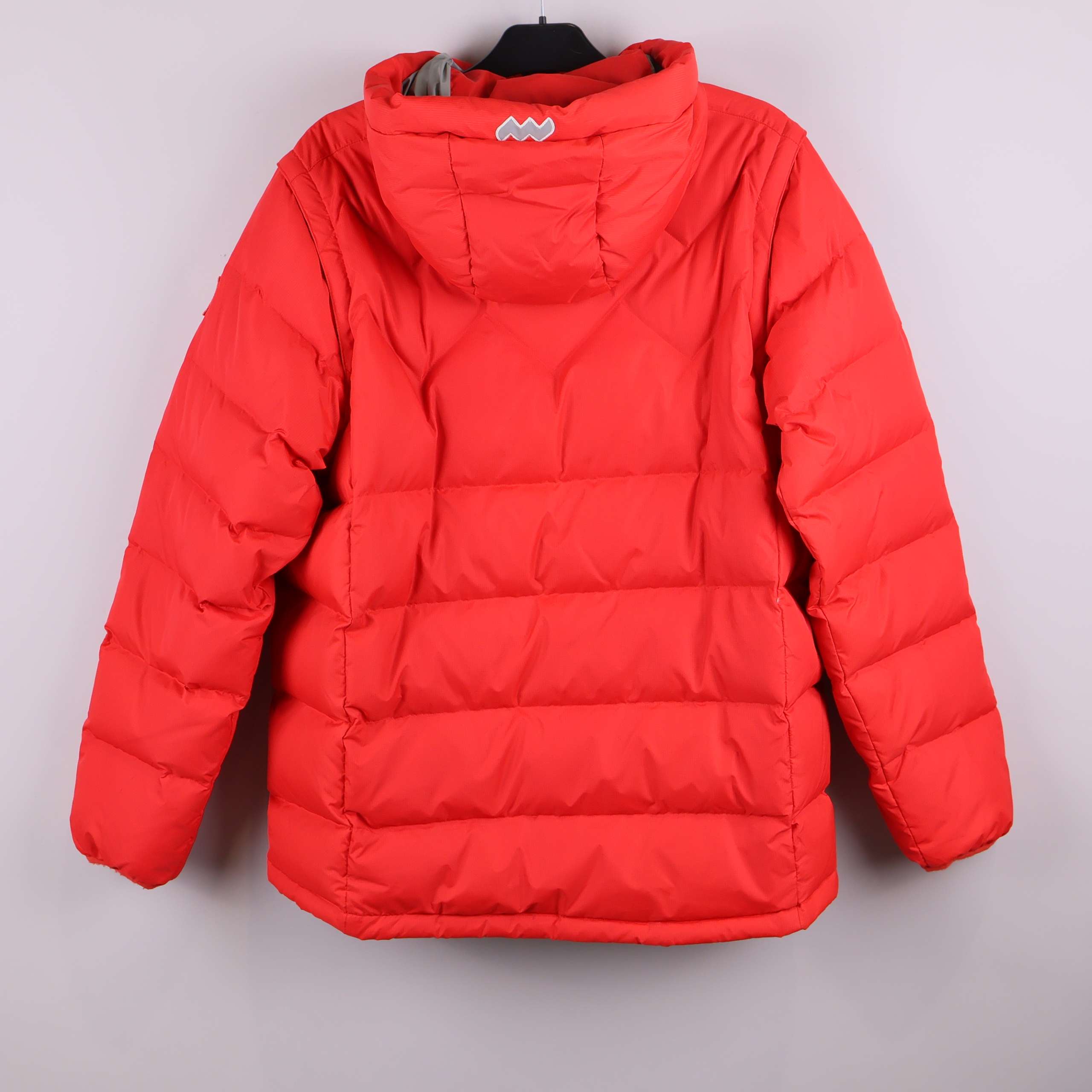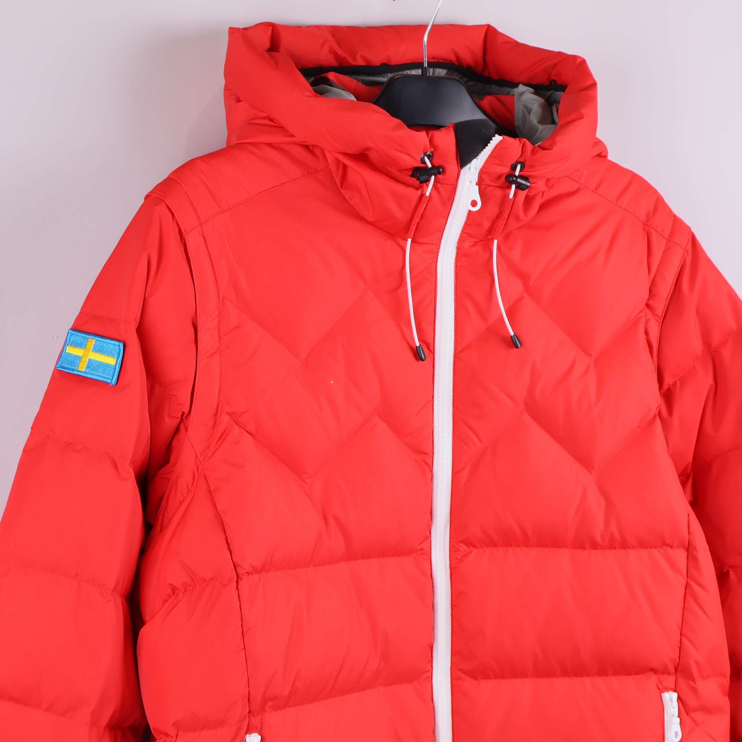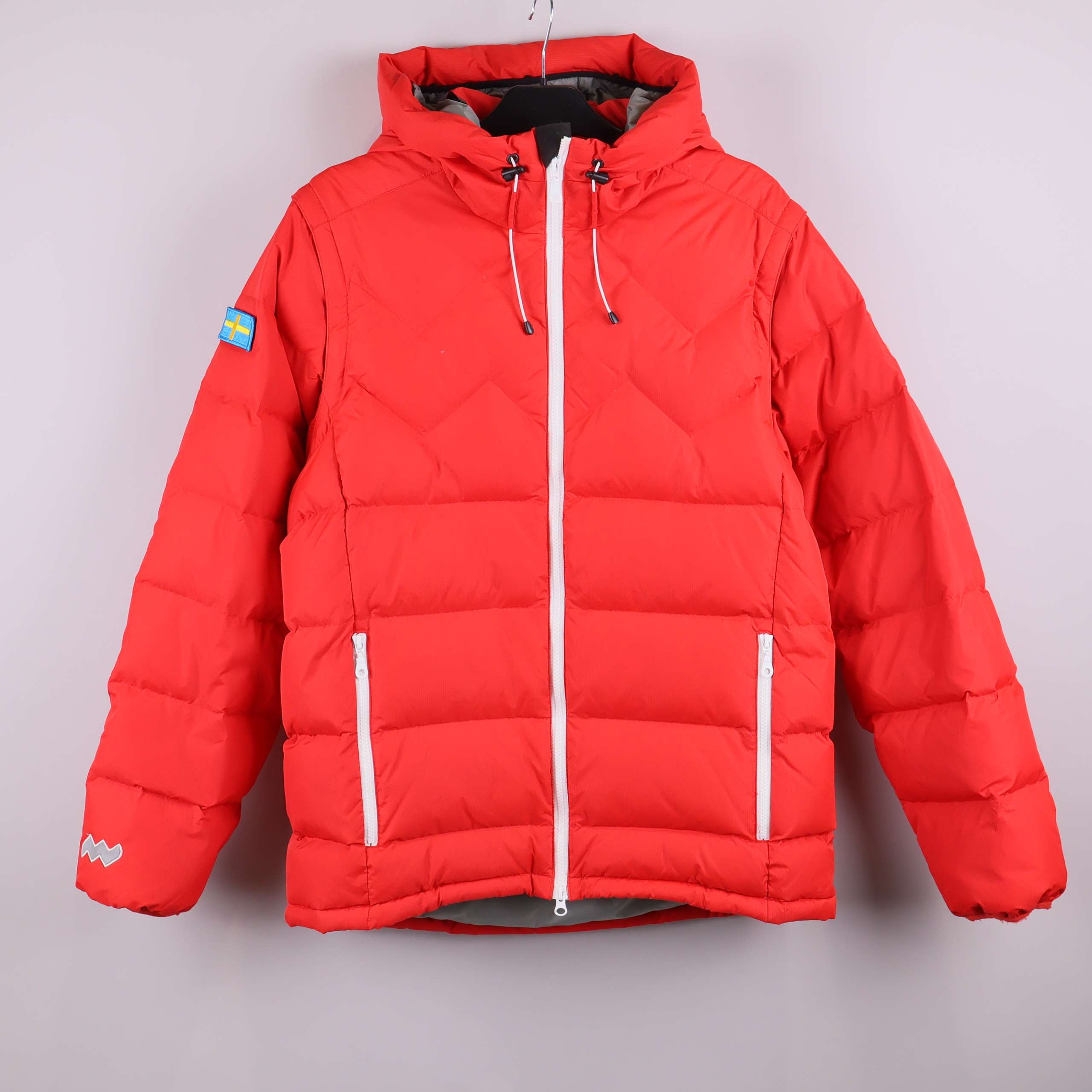 Vadderad jacka i klar röd färg med praktisk huva och vita kontrastdragkedjor. Jackan har två fickor framtill, quiltad design och dragsko vid huvan för extra komfort. Den har en patch med svensk flagga på ärmen och broderad logotyp på manschetten.