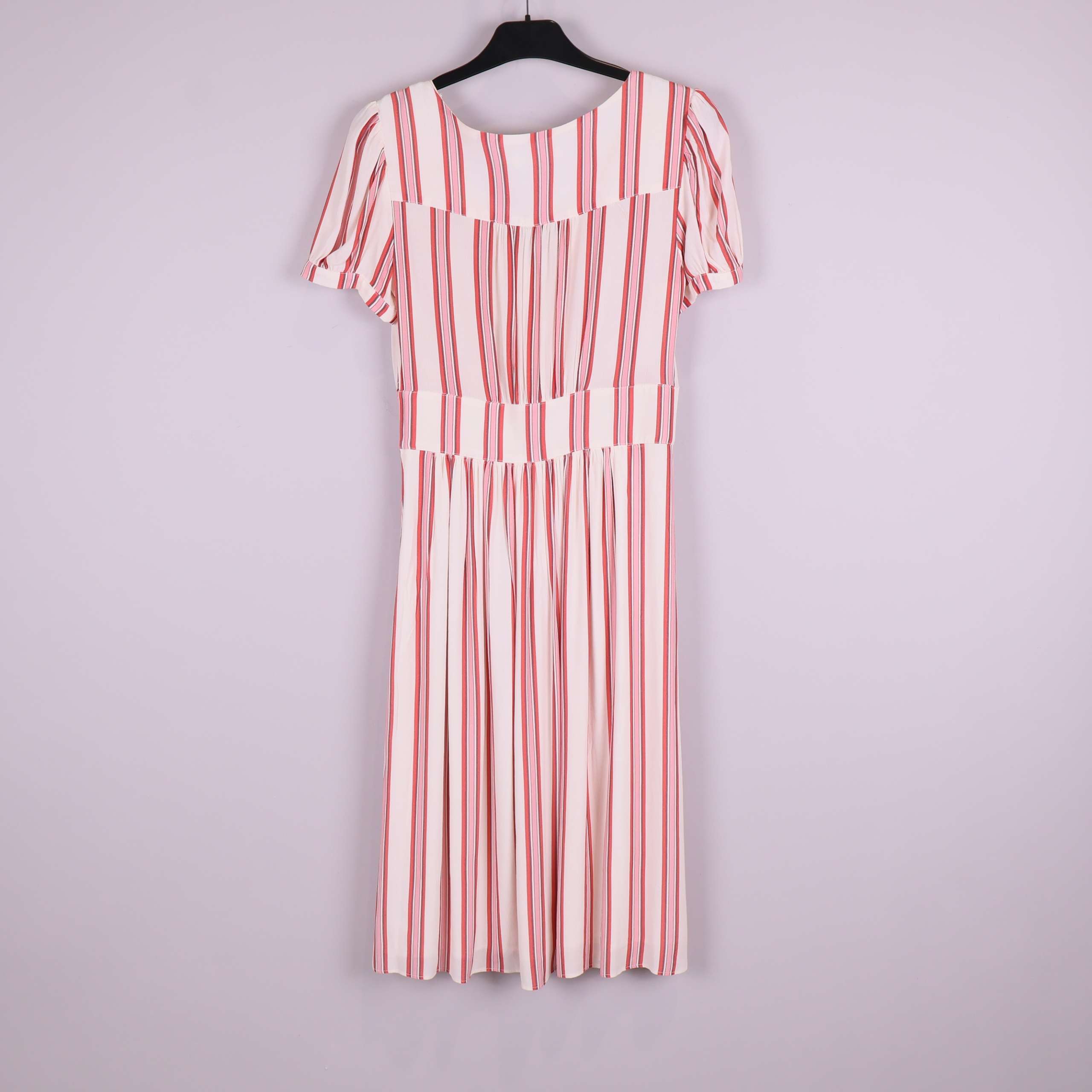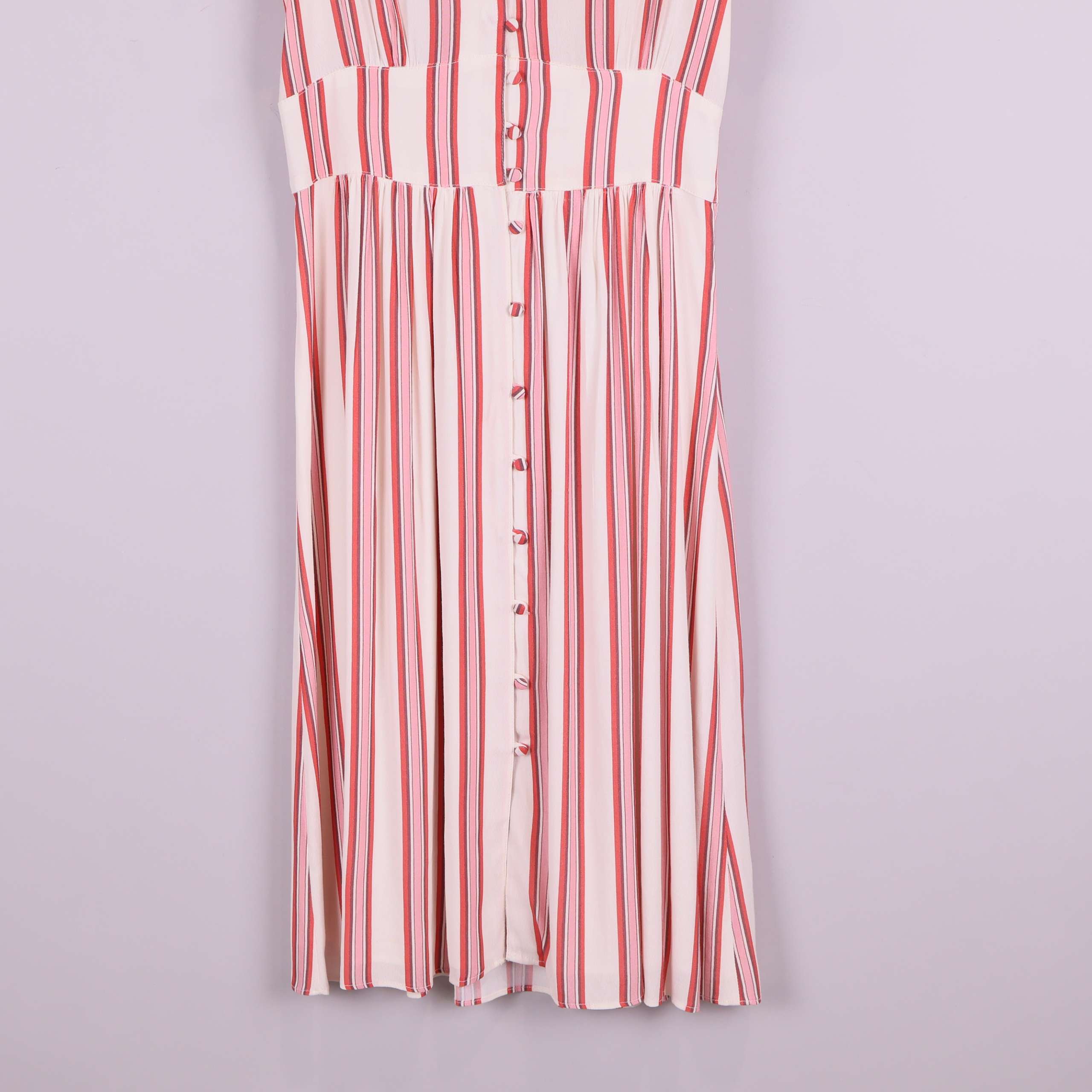Denna randiga knappklänning i midi-längd har en fräsch, lekfull look med vertikala ränder i röda och vita toner. Modellen har korta ärmar, v-ringning och en rad med knappar framtill som ger ett modernt och avslappnat uttryck. Perfekt för dig som gillar en lättburen och trendig stil med lite vintage vibe.