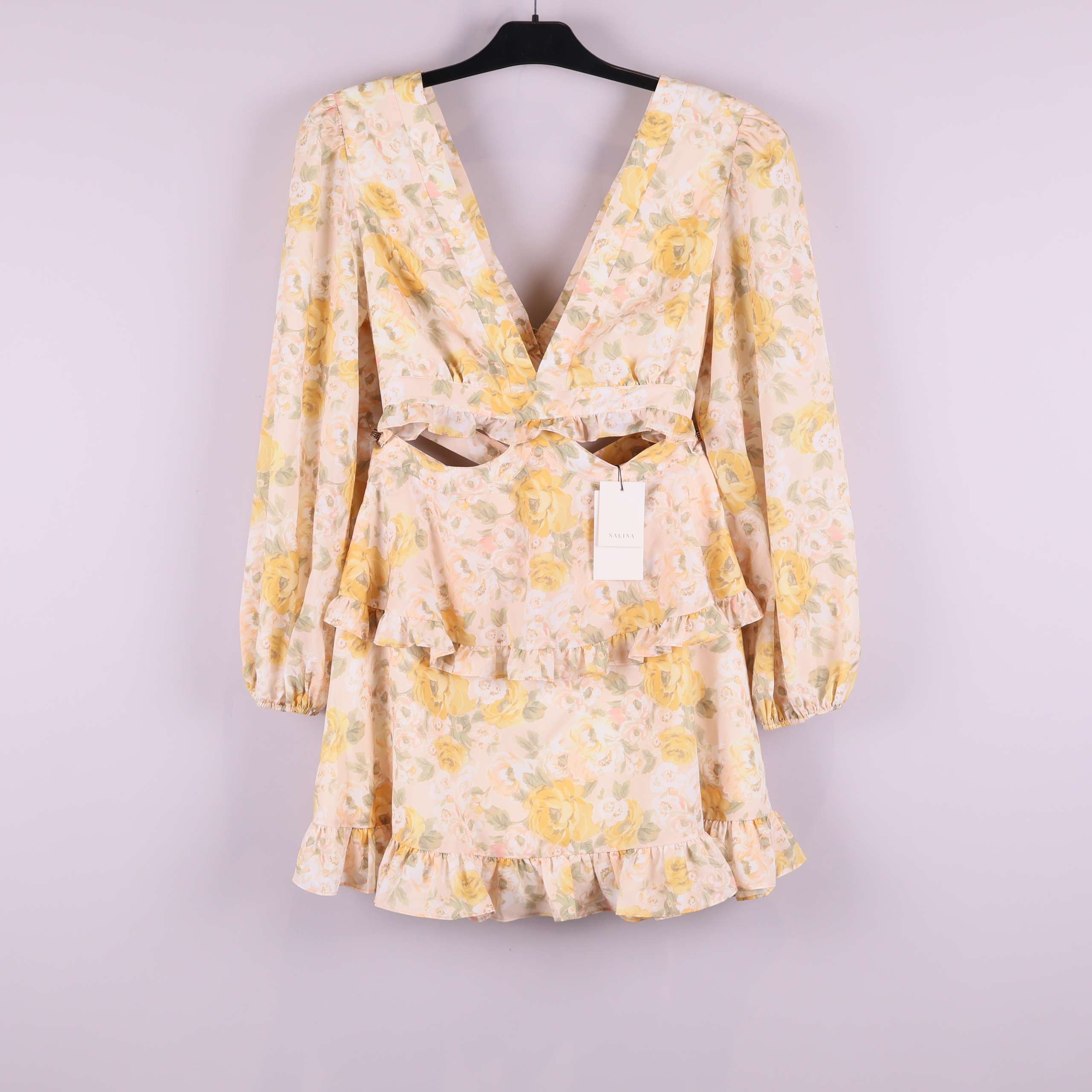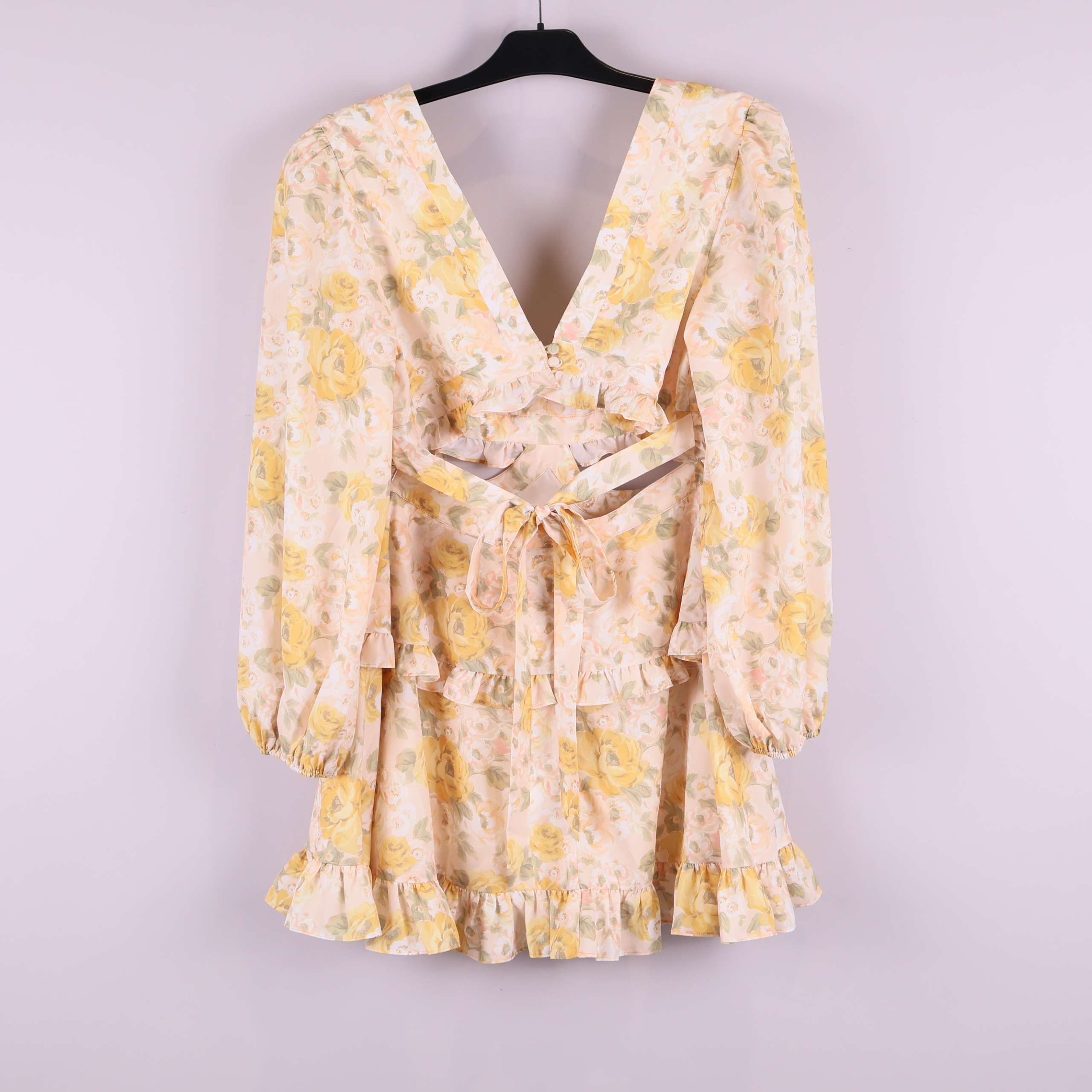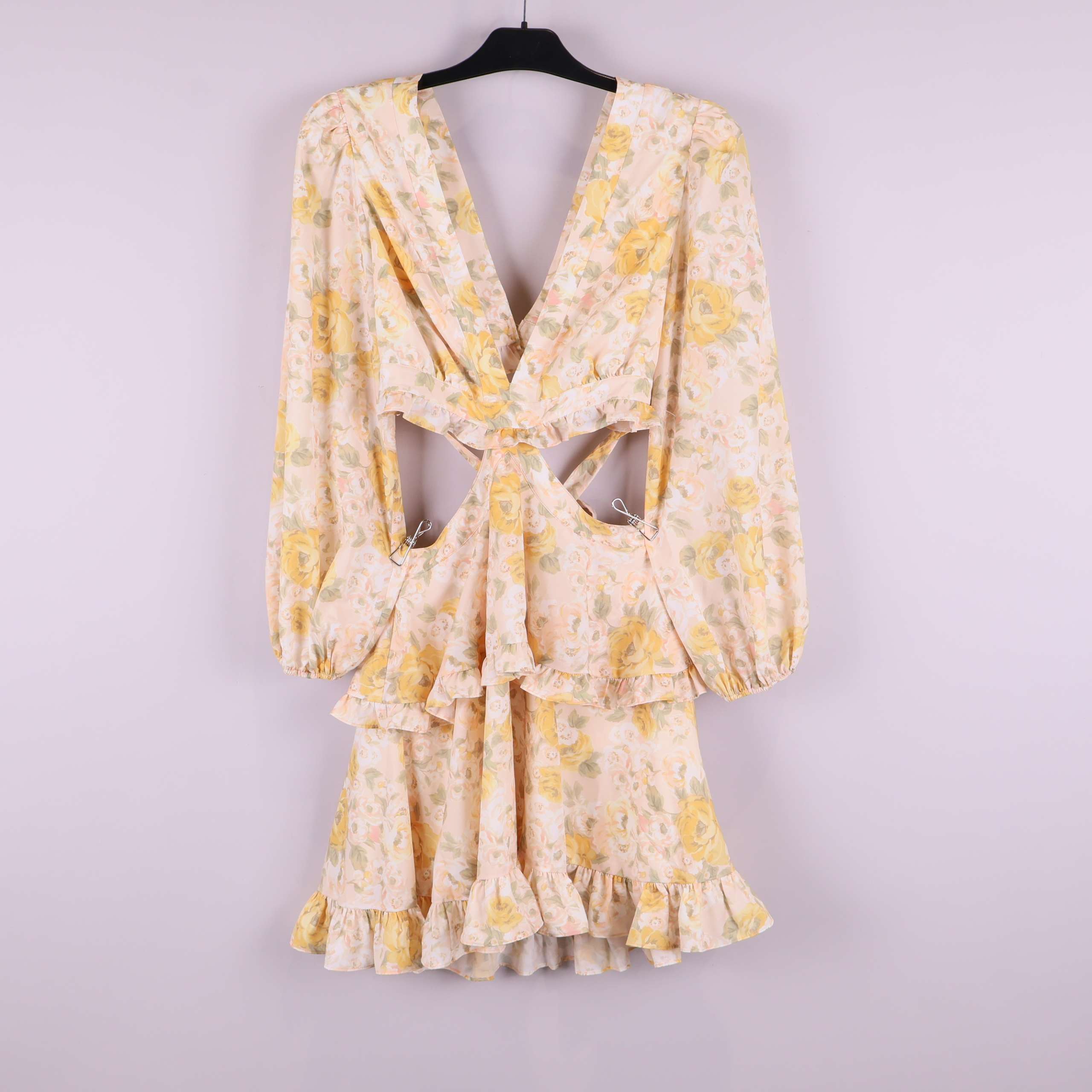 Charmig blommig klänning med romantisk volangkant, djup v-ringning och subtila cut-out-detaljer vid midjan. Långa ärmar med resår vid handlederna ger en lätt puffeffekt. Tygets blommiga mönster går i mjuka toner av gula och beige nyanser för en fräsch, somrig känsla. Knälång och figurnära i modellen – perfekt för dig som gillar en modern, playful look.
