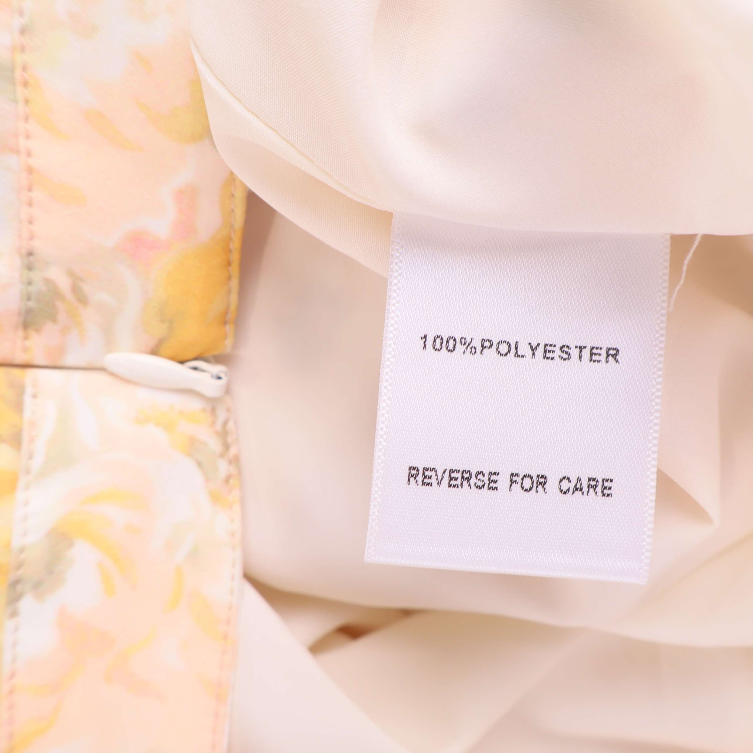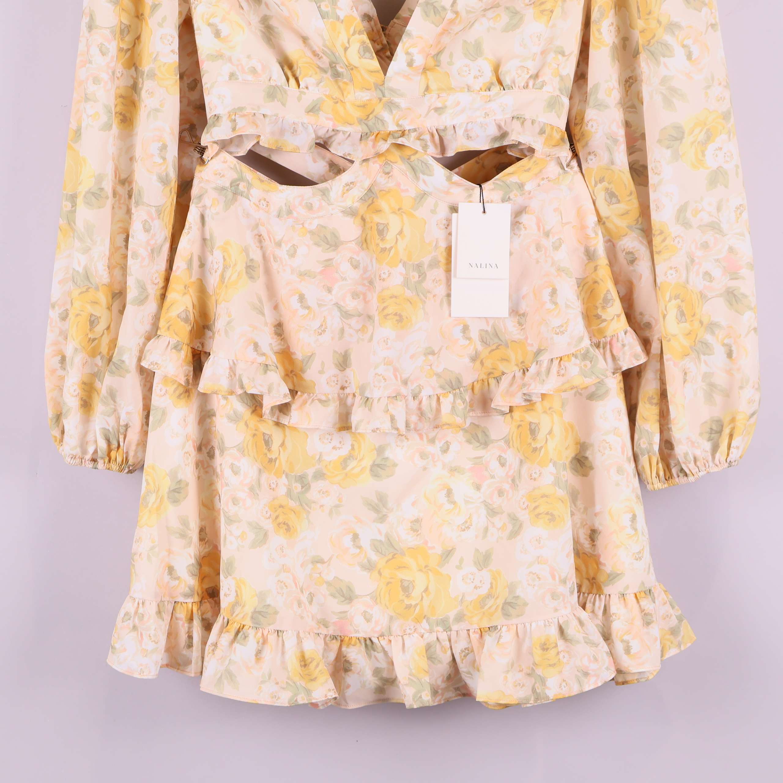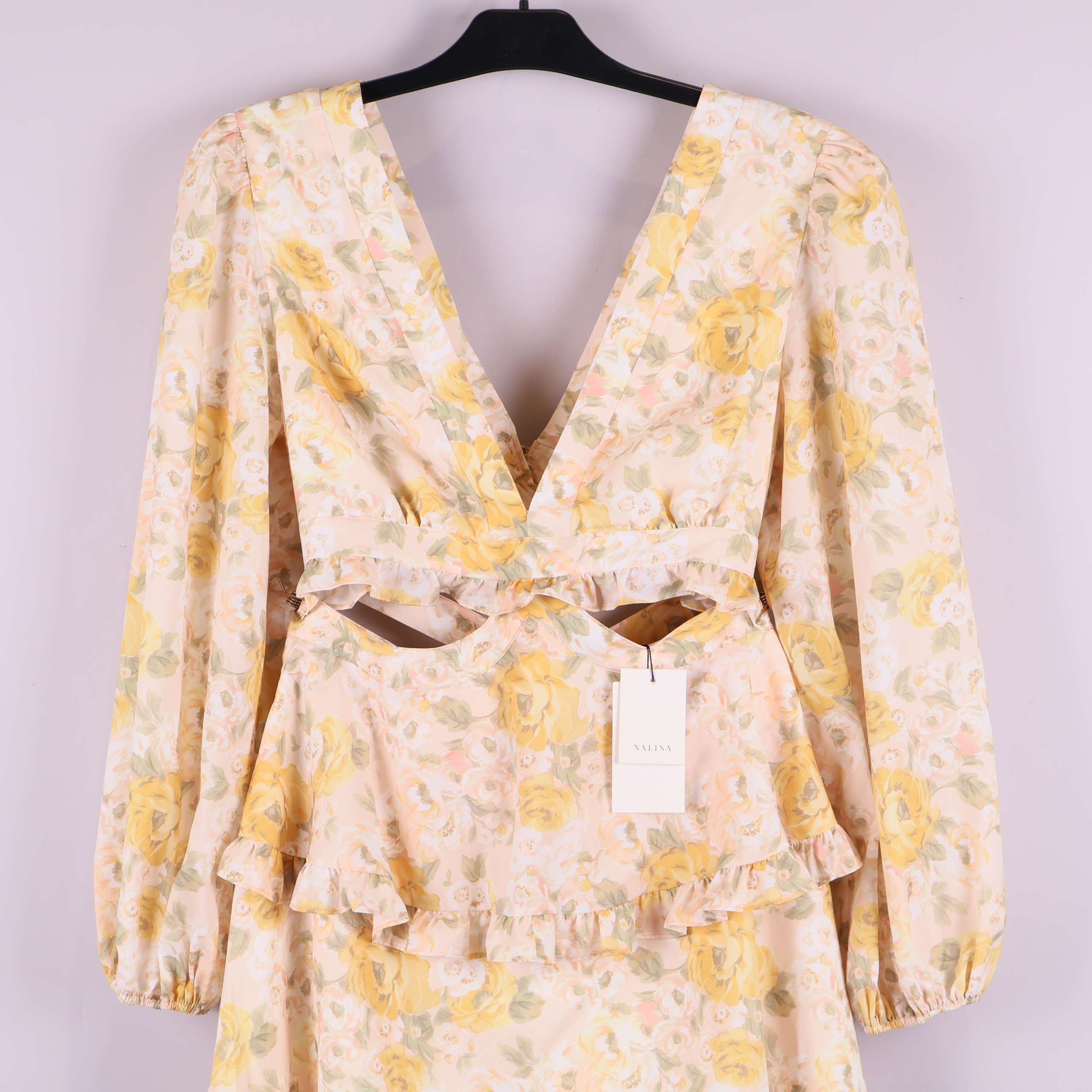 Charmig blommig klänning med romantisk volangkant, djup v-ringning och subtila cut-out-detaljer vid midjan. Långa ärmar med resår vid handlederna ger en lätt puffeffekt. Tygets blommiga mönster går i mjuka toner av gula och beige nyanser för en fräsch, somrig känsla. Knälång och figurnära i modellen – perfekt för dig som gillar en modern, playful look.