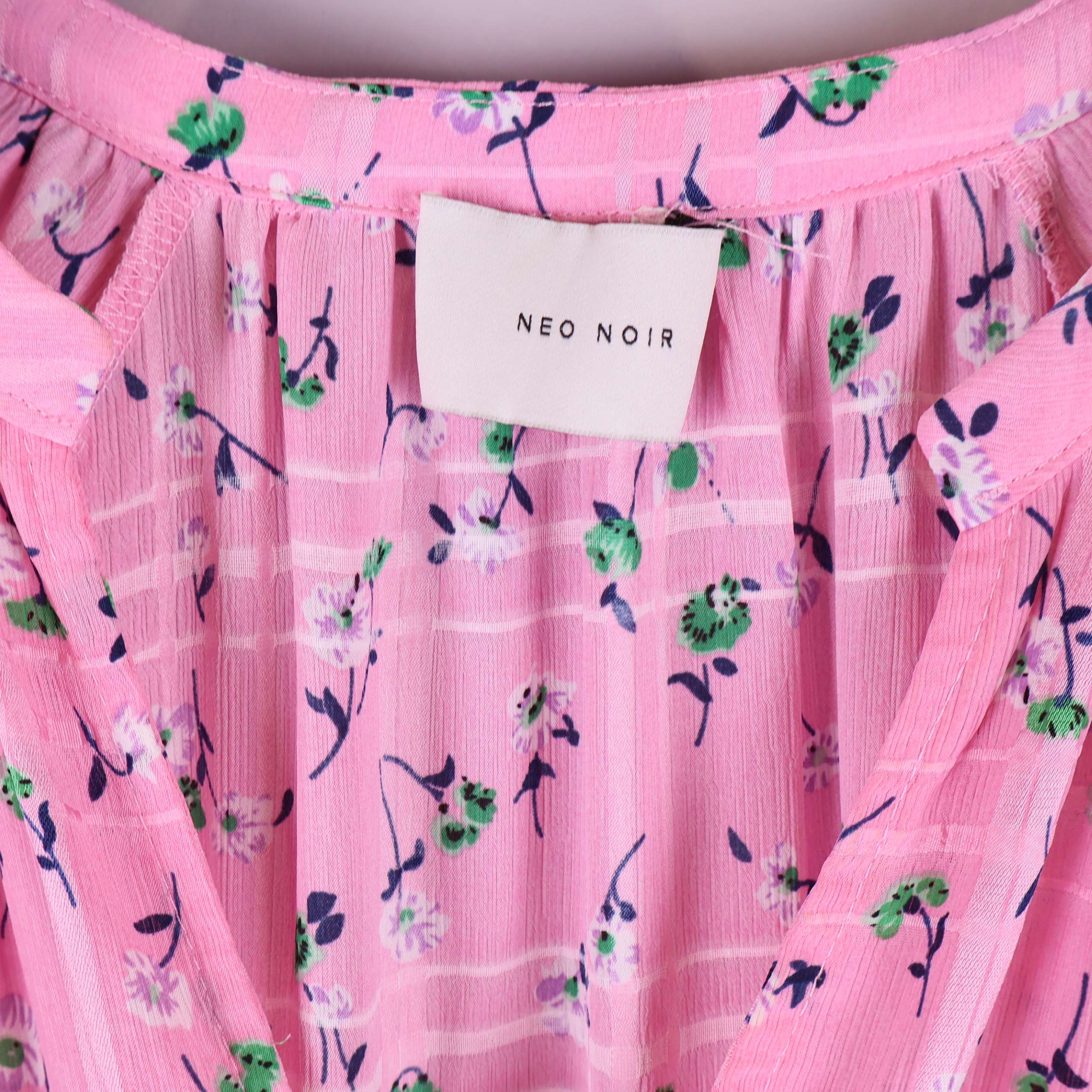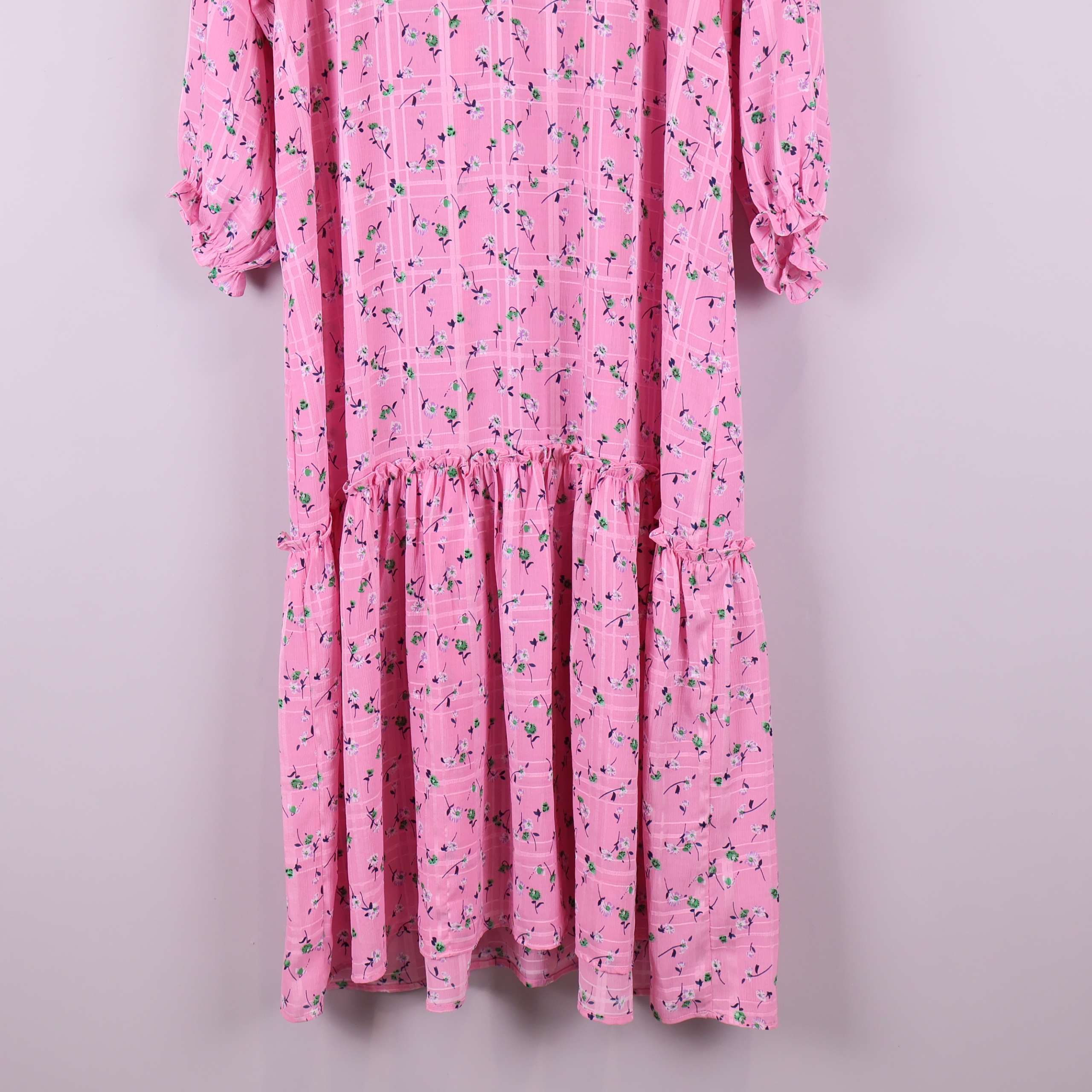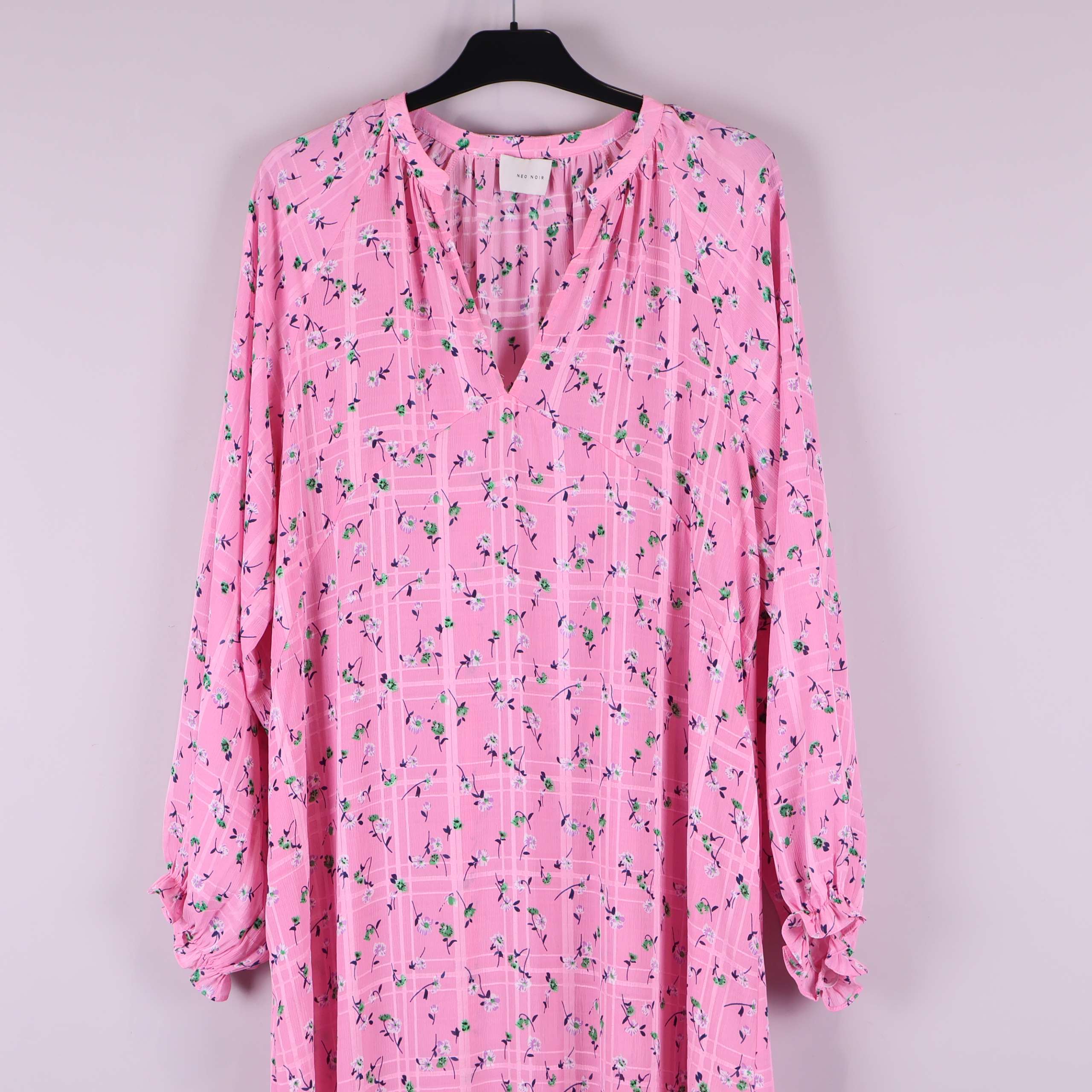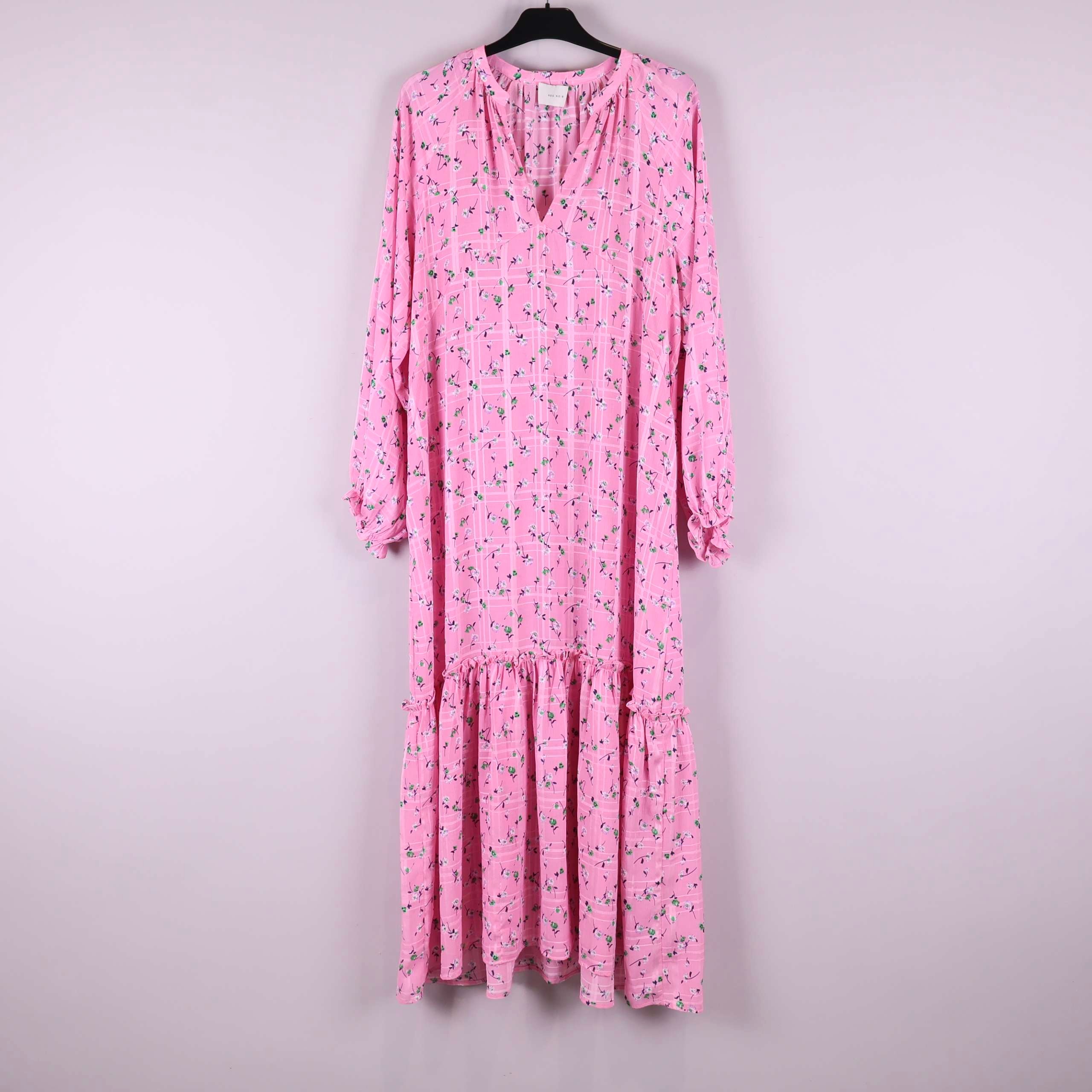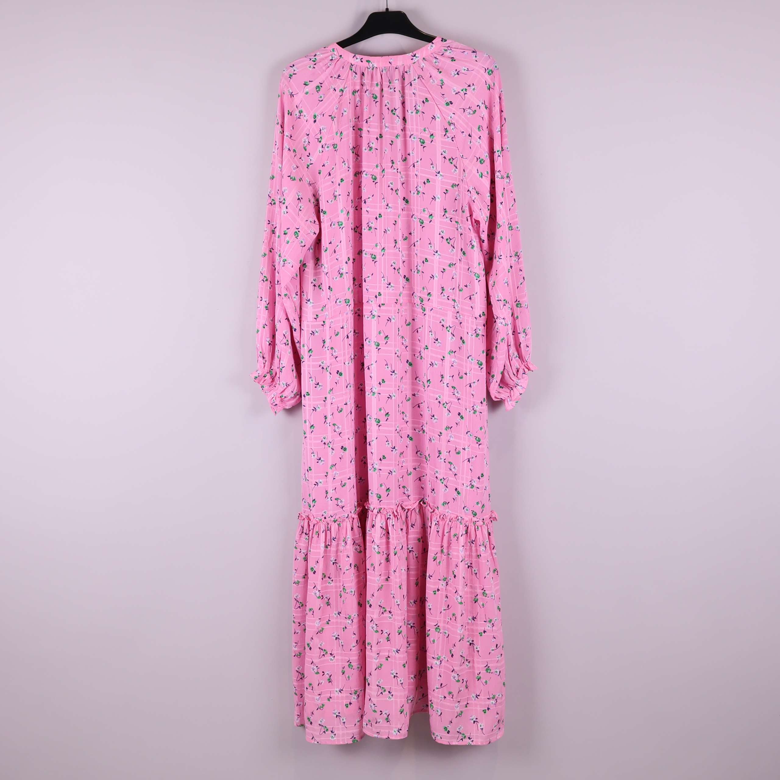 Långklänning i ljusrosa ton med blommigt mönster och diskret rutstruktur. Klänningen har en avslappnad passform med rynkad volang nedtill samt långa ärmar med breda muddar. Tunn och mjuk kvalitet i 100% polyester ger ett luftigt fall och enkel komfort. Halsringning med liten öppning framtill för en modern touch.
