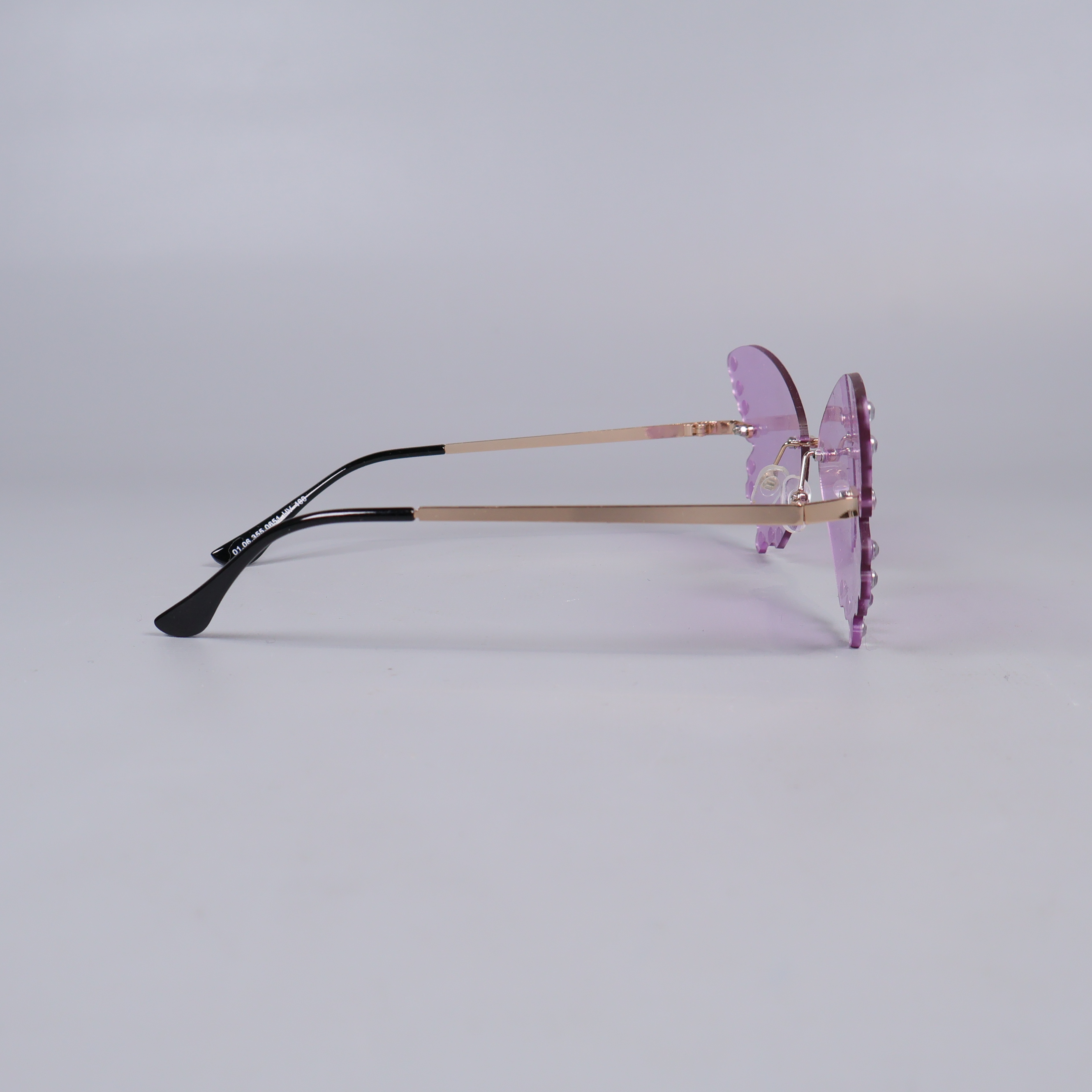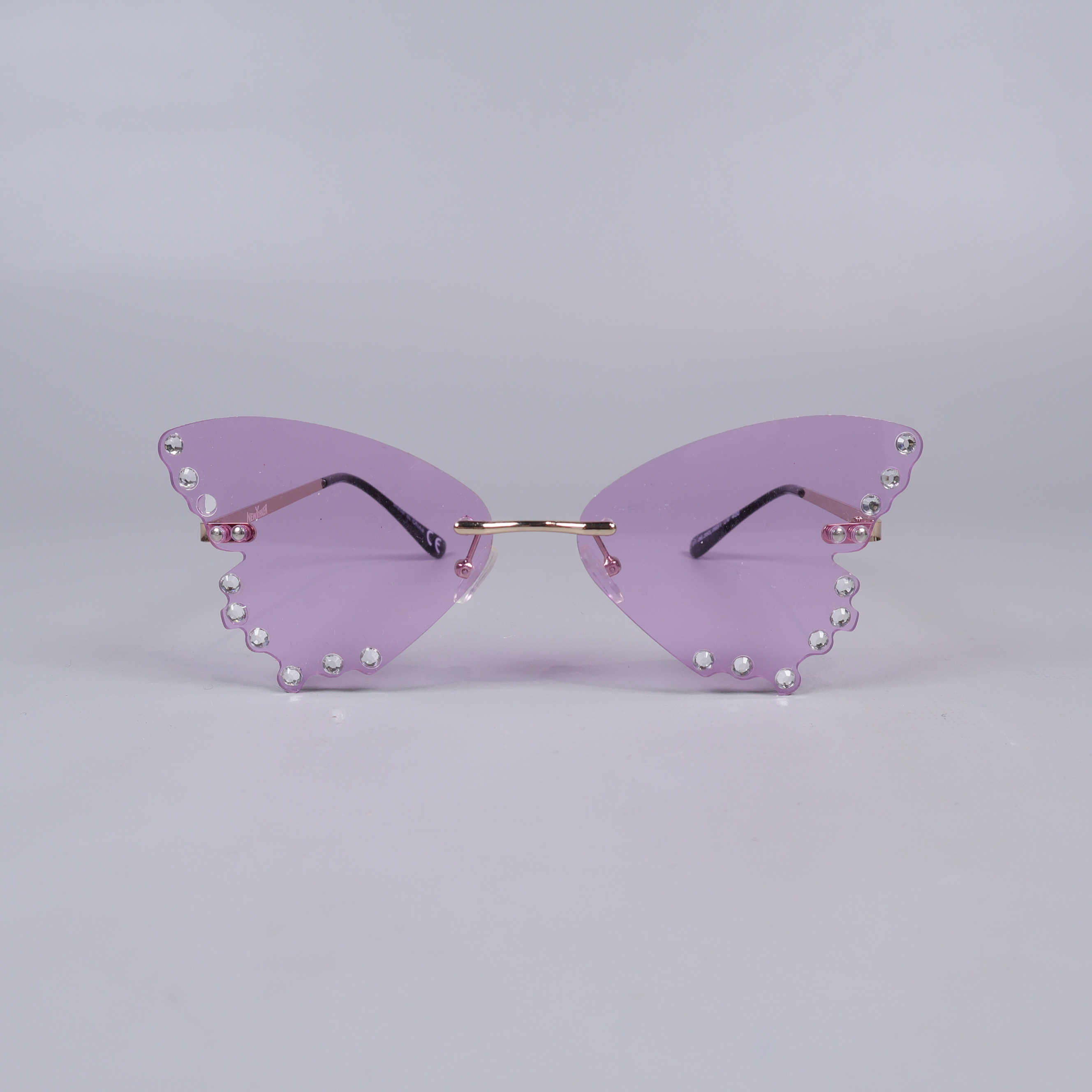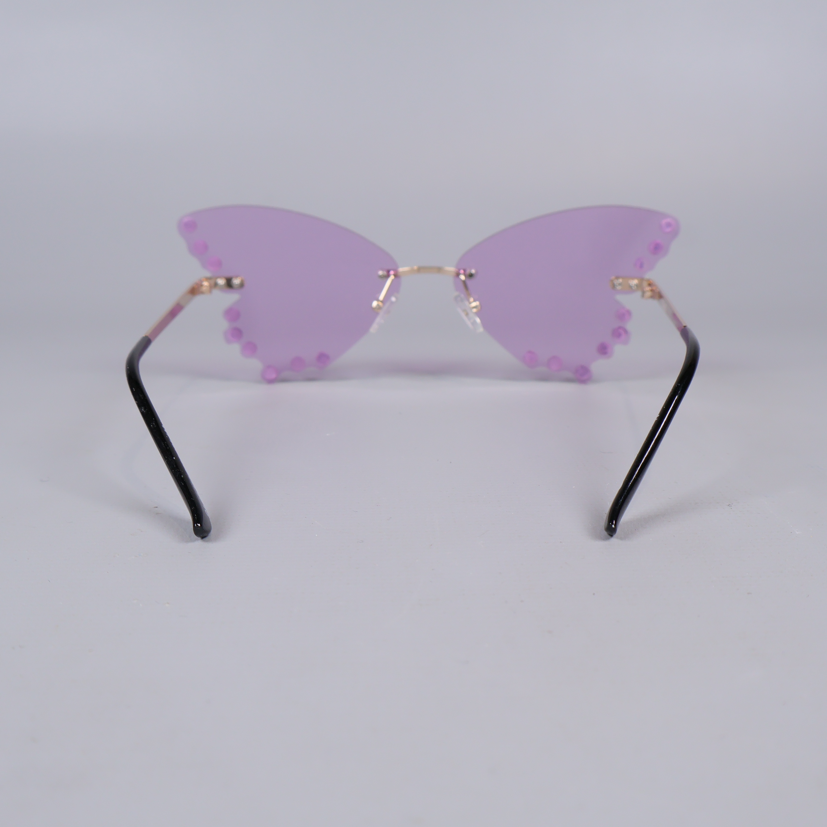 Unika solglasögon med utpräglad fjärilsform och lila tonade linser. Kanterna är dekorerade med glimmande strasstenar som adderar en extra touch av glamour. Tunna metallbågar och svarta skalmar ger en lätt och trendig känsla. Perfekt för dig som gillar statement accessoarer och att lyfta din look med färg och lekfull design.