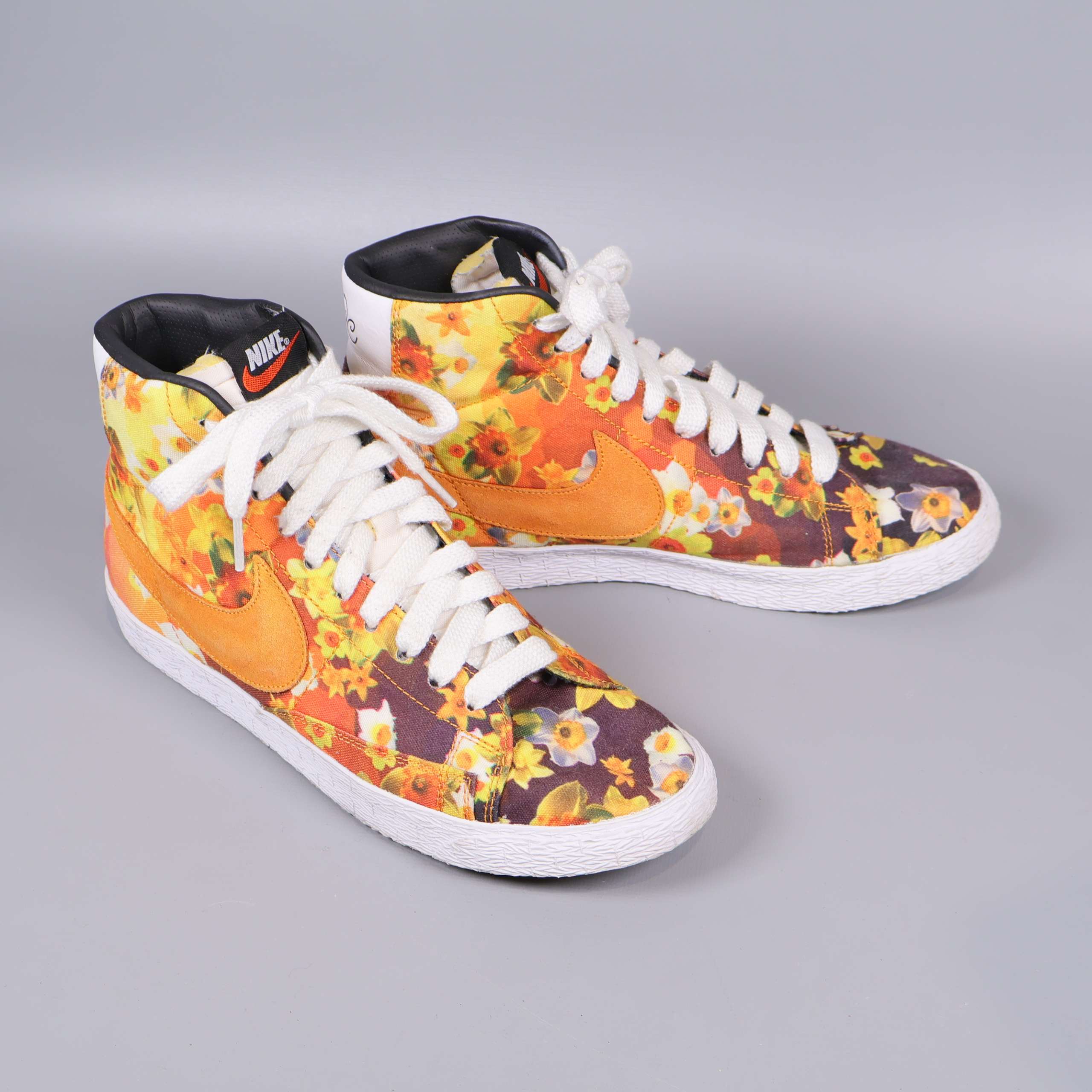 Storlek: 40 Innermått: 25 cm. Nike sneakers med högt skaft och färgglatt blommönster i gult, orange och vitt. Synligt stort swoosh-märke på sidan i orange och klassiska vita snören. Gummisula och bekvämt vadderat foder. Modellen ger en livlig, playful känsla och sticker ut i mängden med sin unika design.