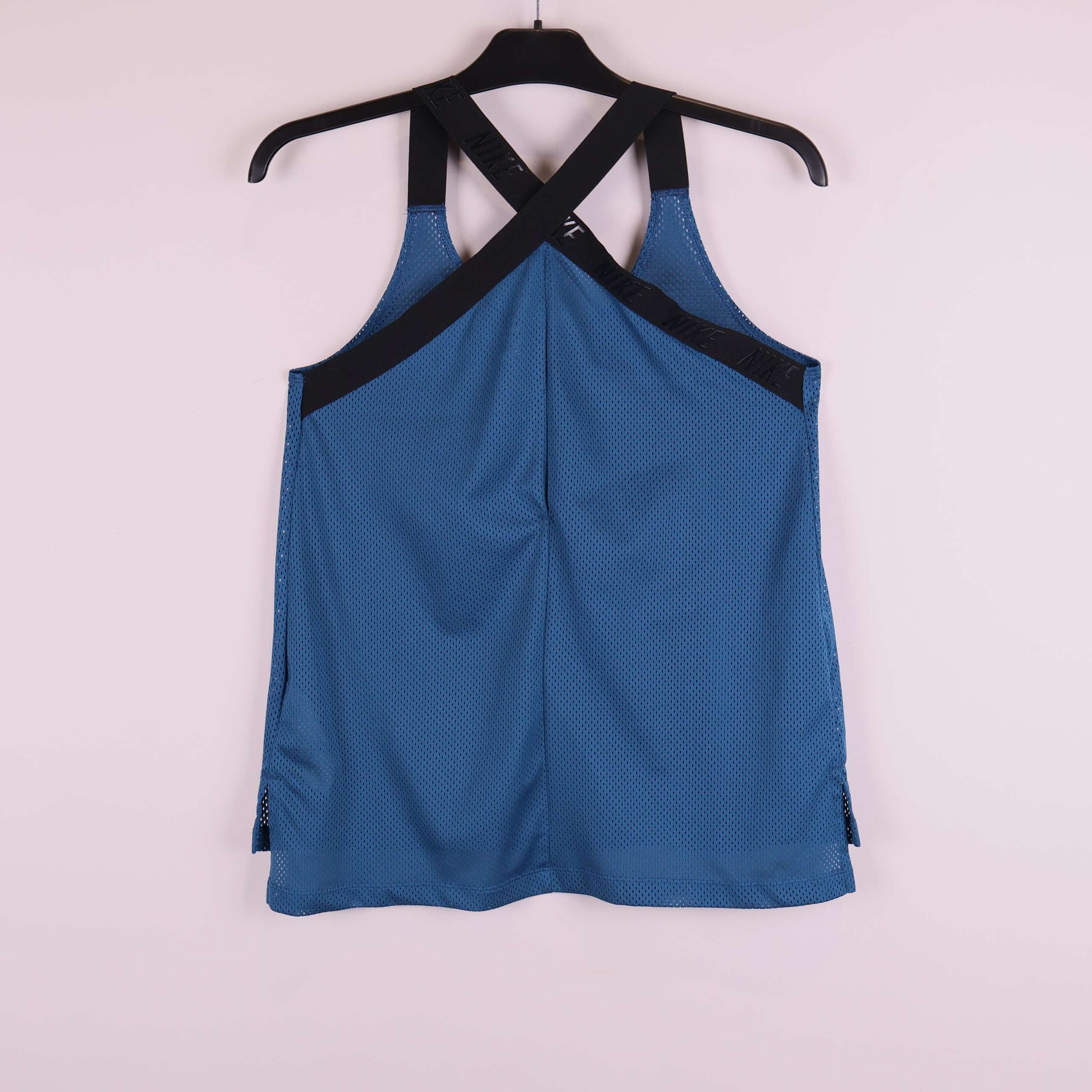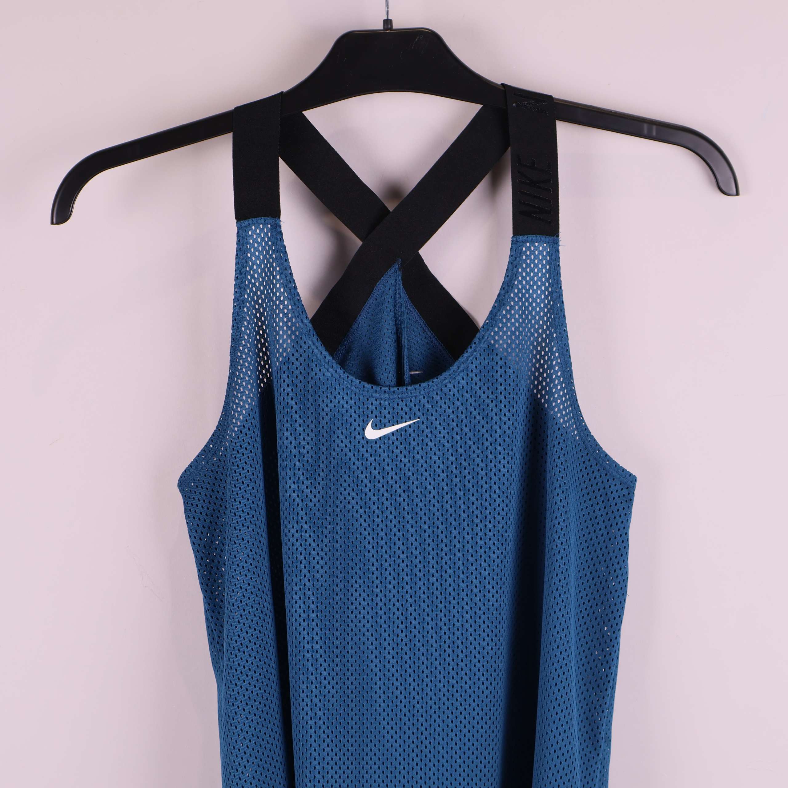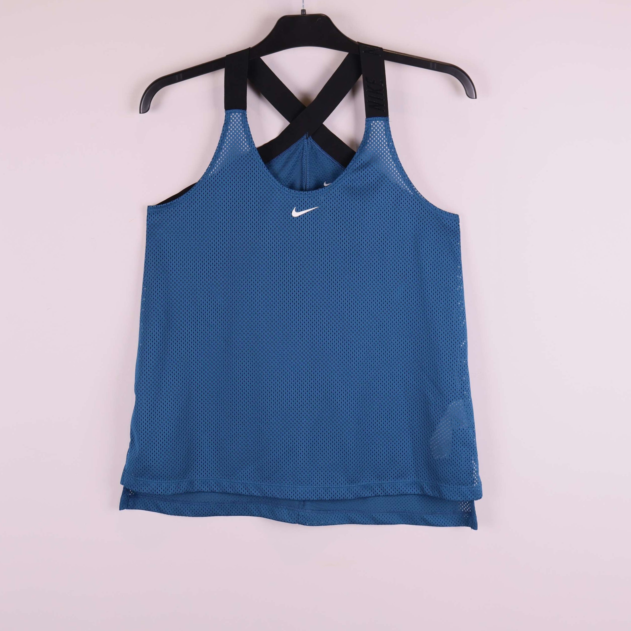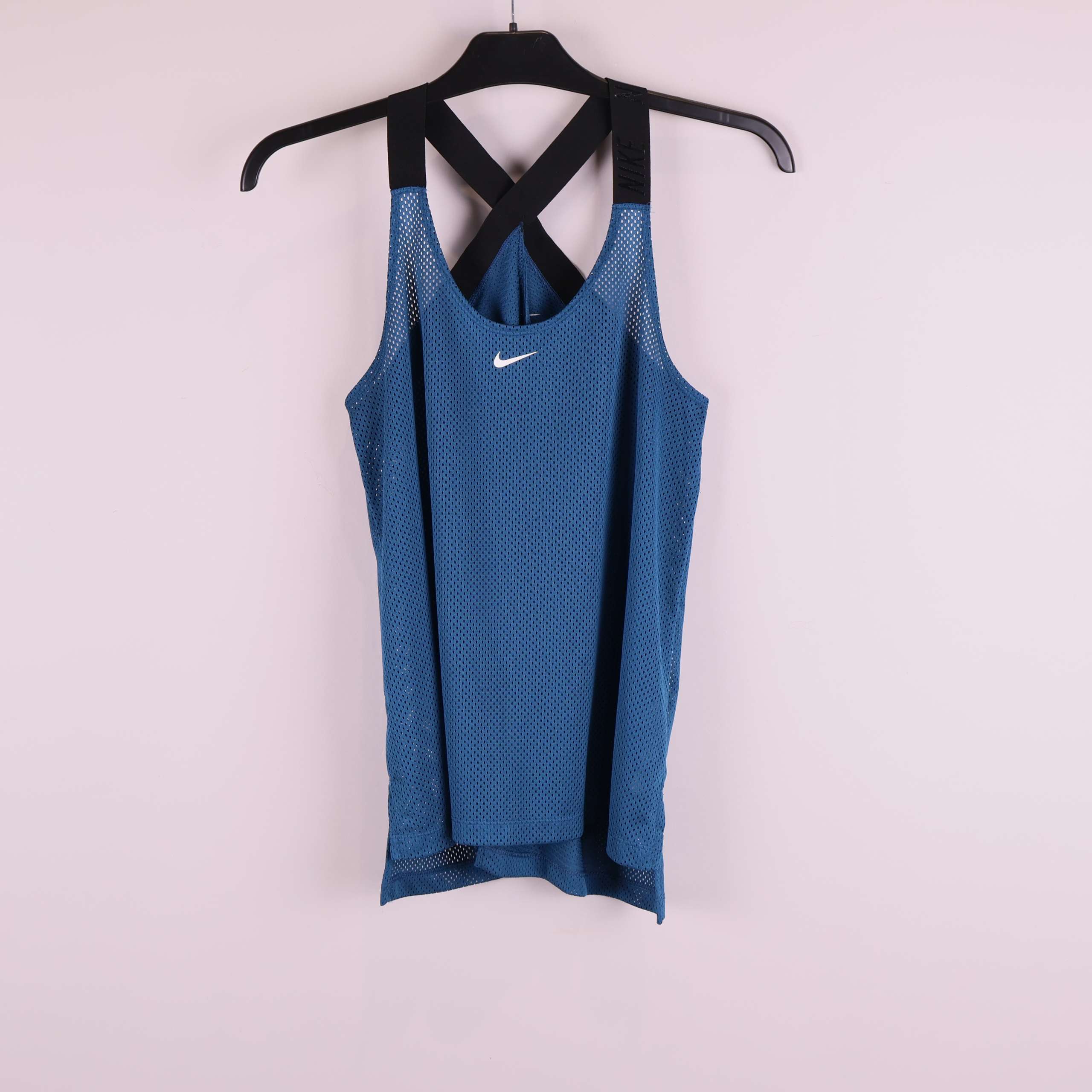 Sportigt träningslinne med ventilerande meshmaterial och stilrena svarta korsade axelband för extra stöd. Linnet har en något längre baksida och en liten logga framtill. Den blå färgen och tekniska Dri-FIT-materialet ger ett modernt och sportigt uttryck. Perfekt för dig som vill ha ett lätt och ledigt plagg med skön andasfunktion och smidig passform.