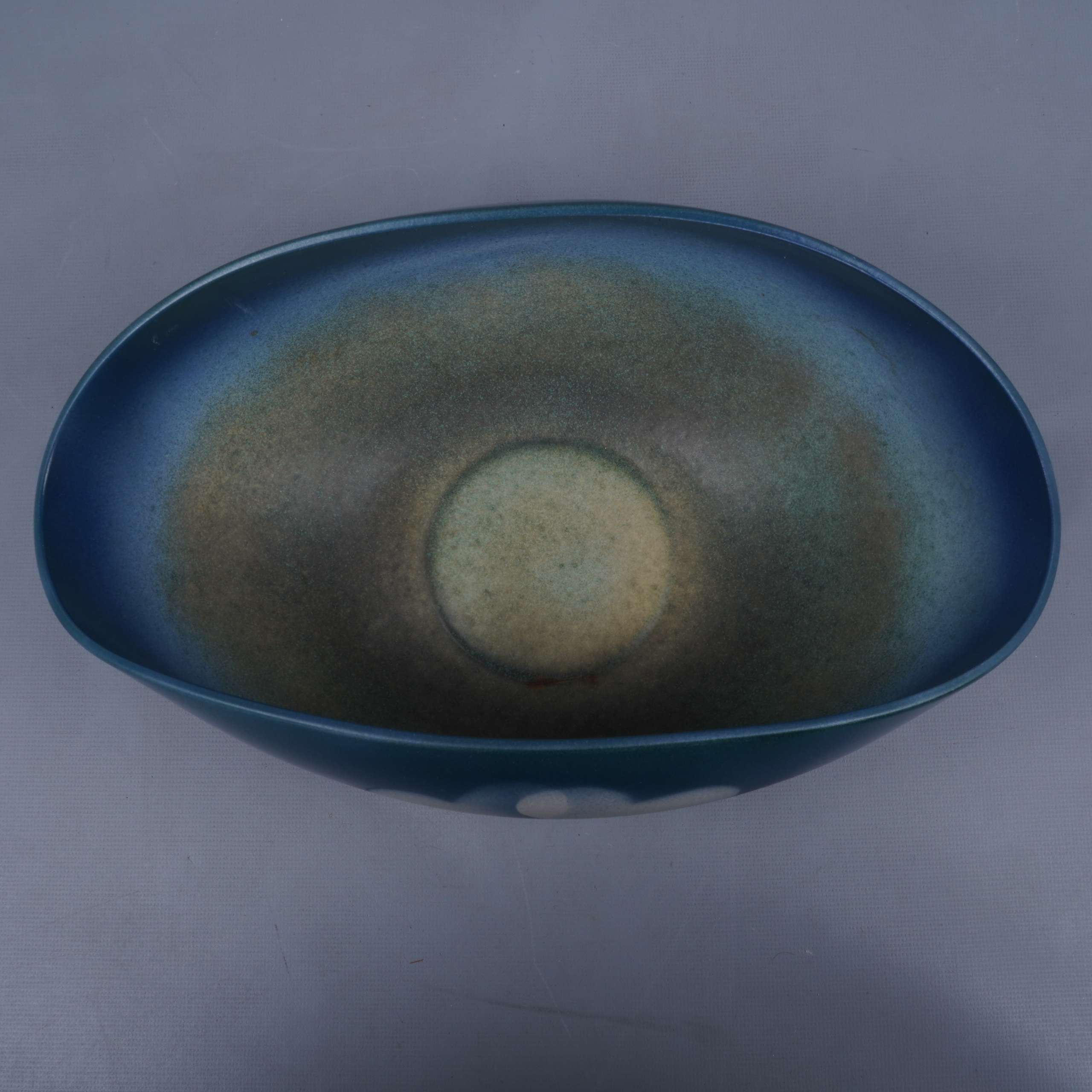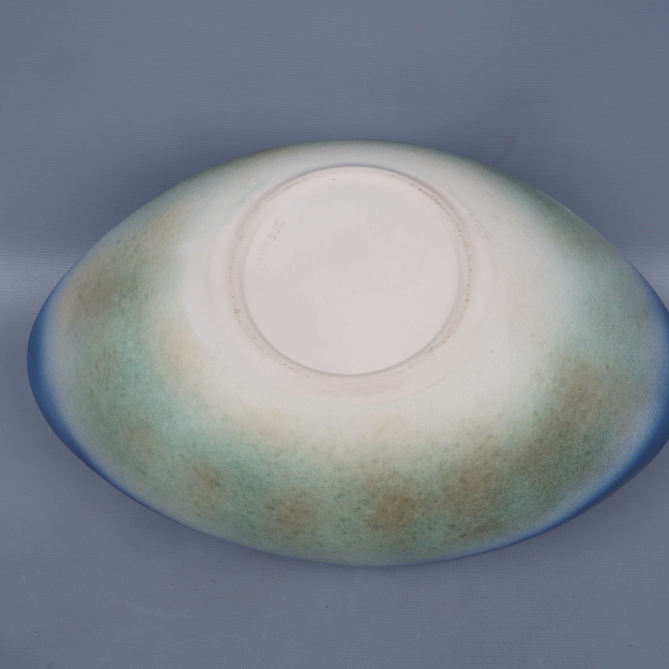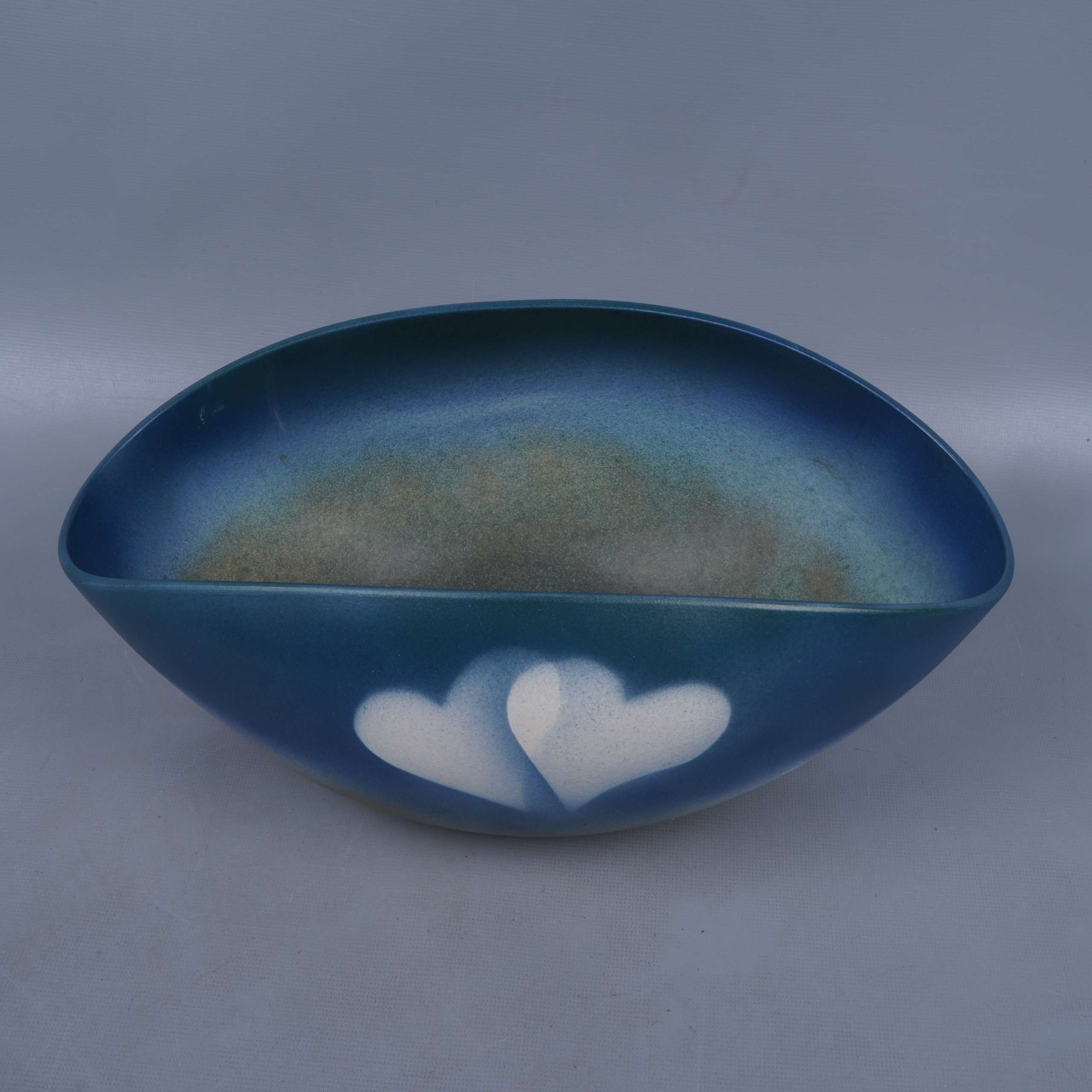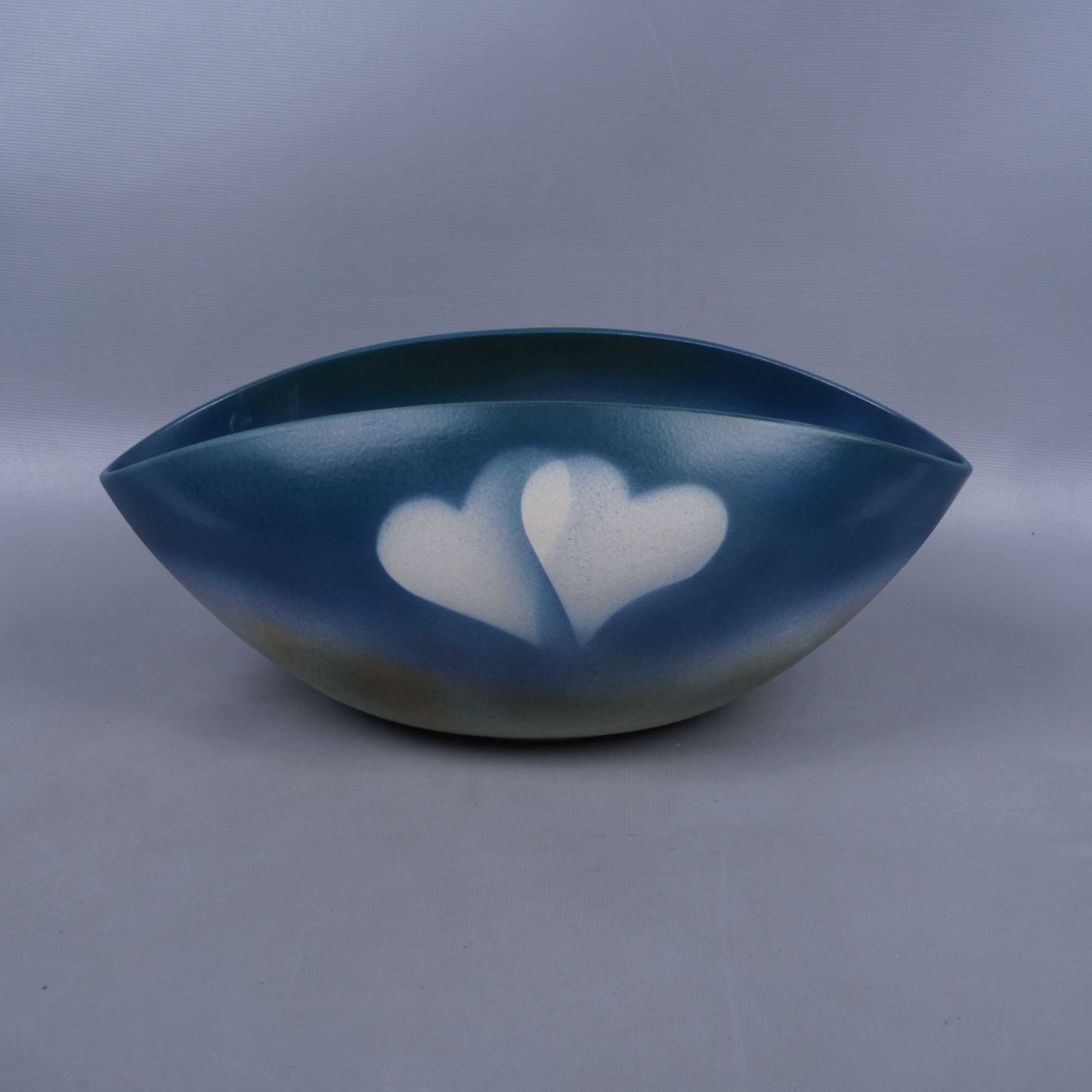 Ovalformad skål med mjukt blå och gröna toner samt kreativ vit hjärtdetalj på framsidan. Ytan har en harmonisk matt finish med inslag av vintage vibe. Ger ett vänligt och modernt intryck för köket eller vardagsrummet.