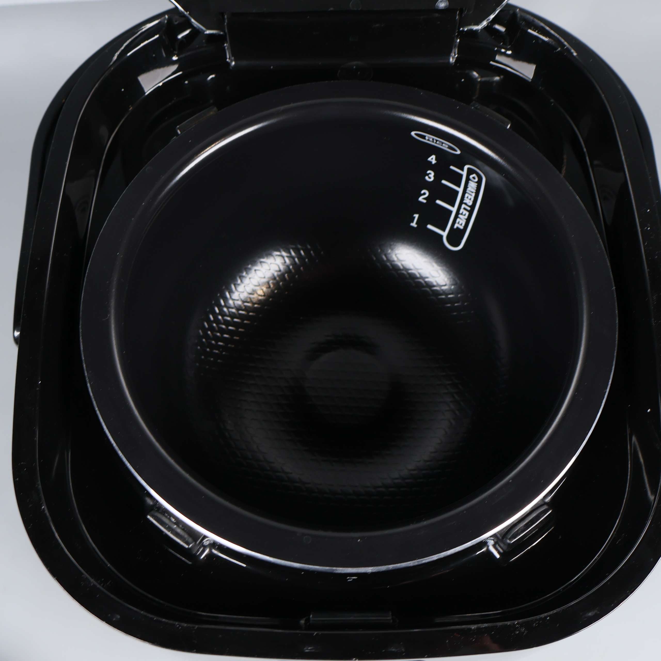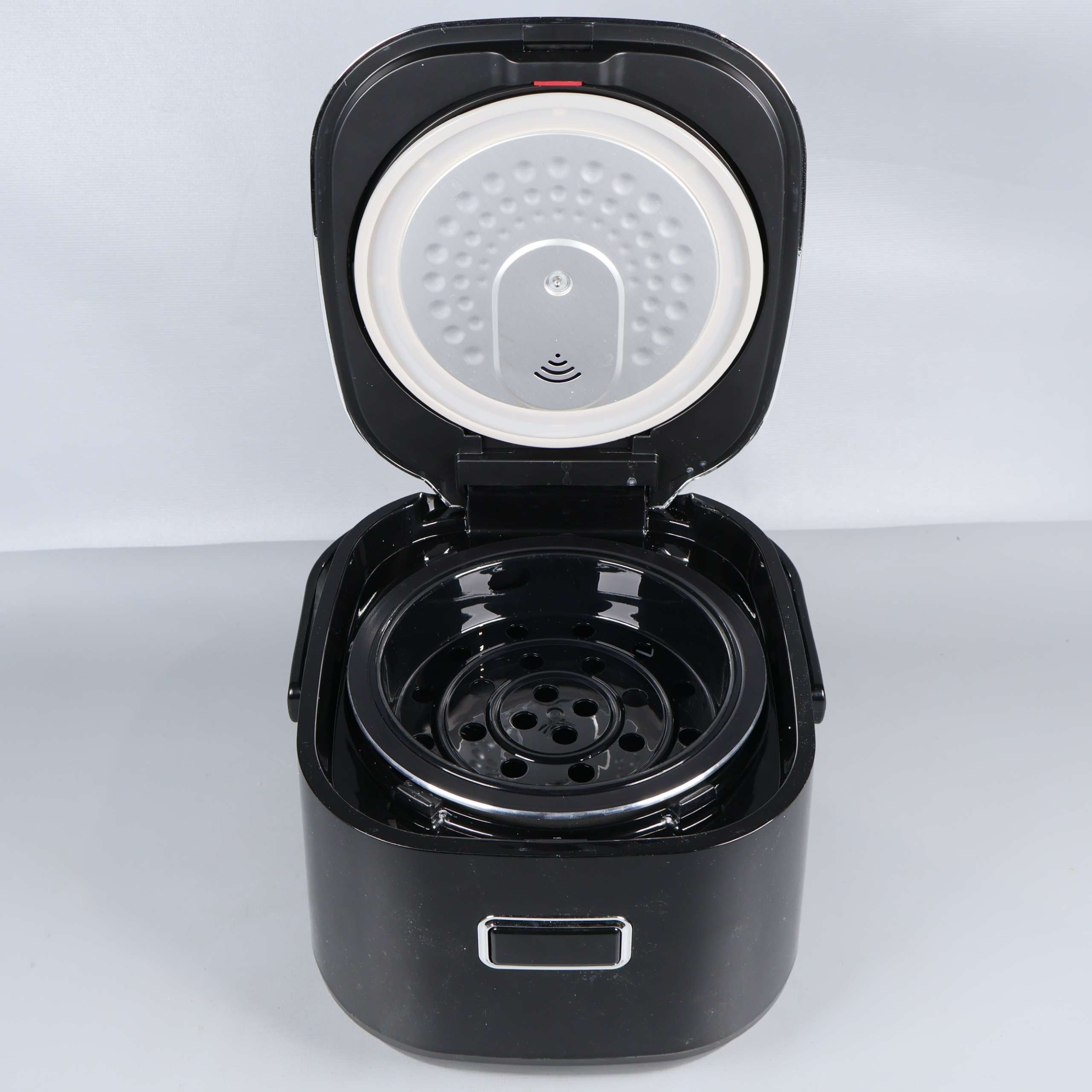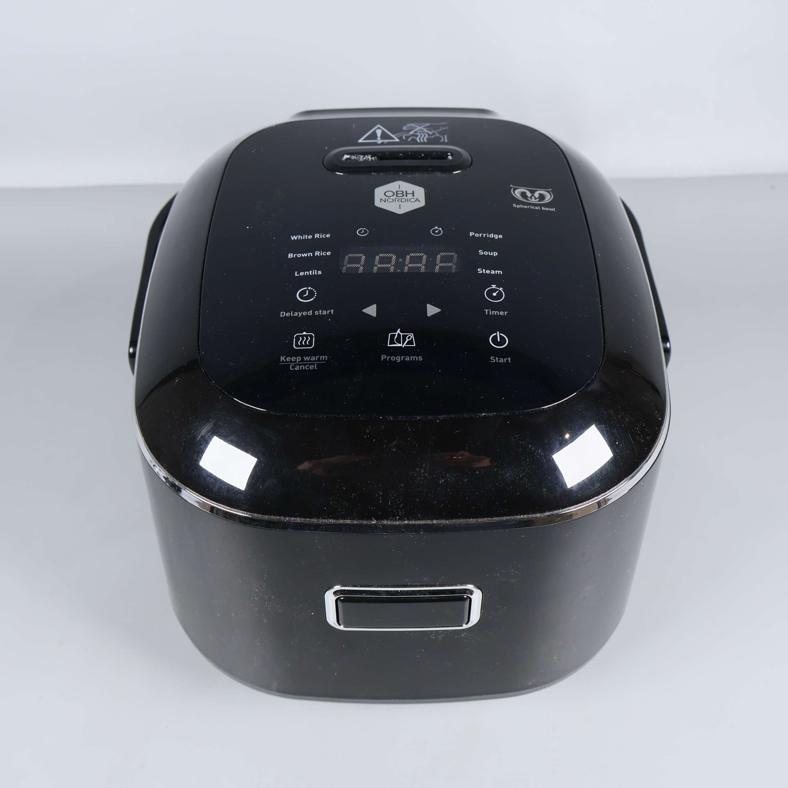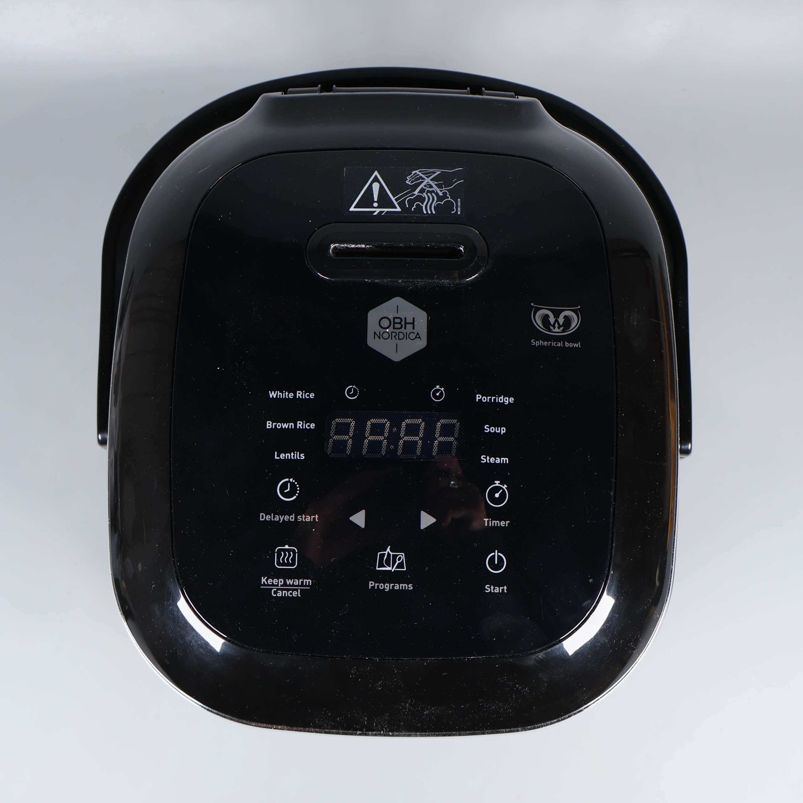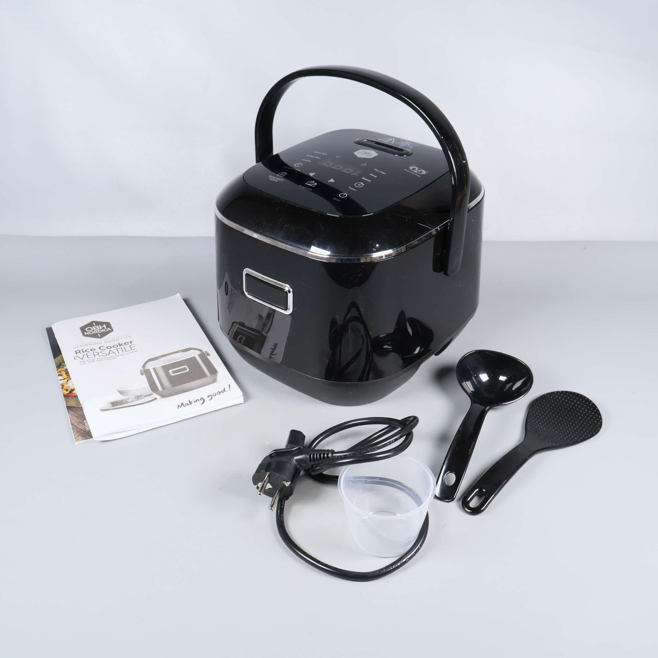 Modern digital riskokare med stilren svart finish och tydlig displaypanel. Levereras med sked, slev, måttbägare samt elsladd och instruktionshäfte. Innerbehållaren har märkning för enkel dosering och non-stick-yta för smidig rengöring. Perfekt för dig som gillar funktionell köksdesign.
